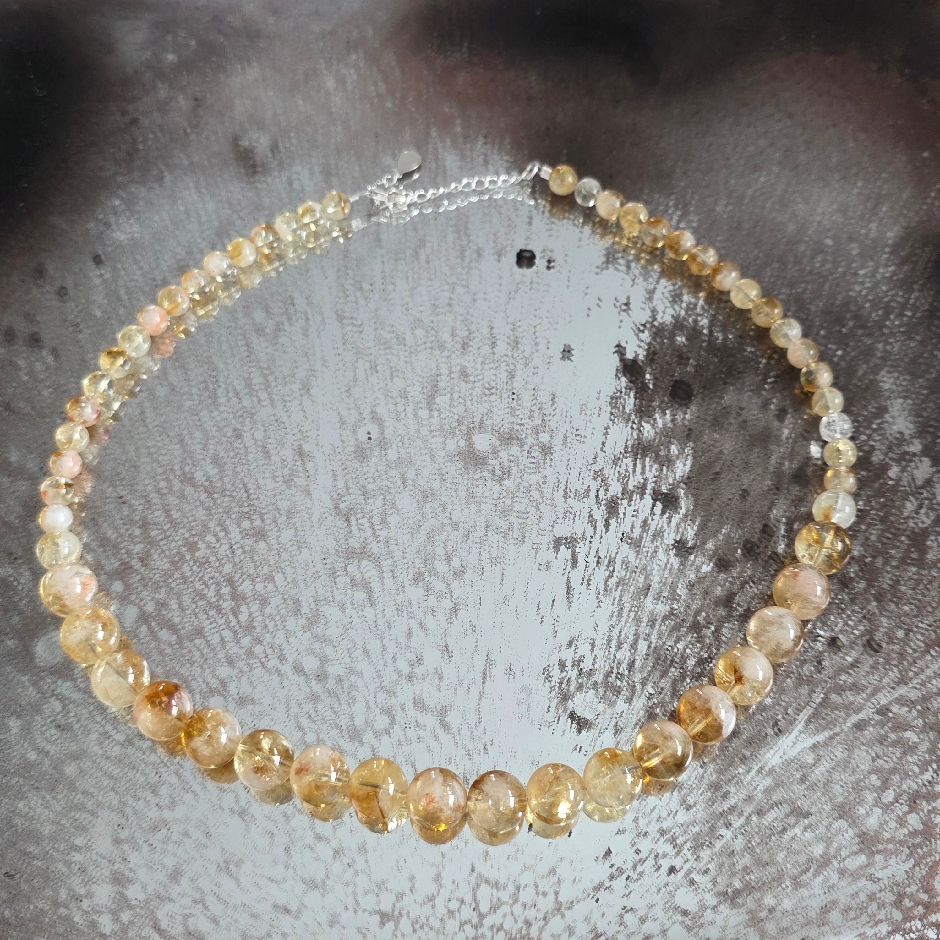 Un collar que capta la luz — simplemente. Hecho de citrino natural, este collar irradia calidez, alegría y claridad. No es solo una joya, sino un recordatorio constante del optimismo y la fuerza interior.