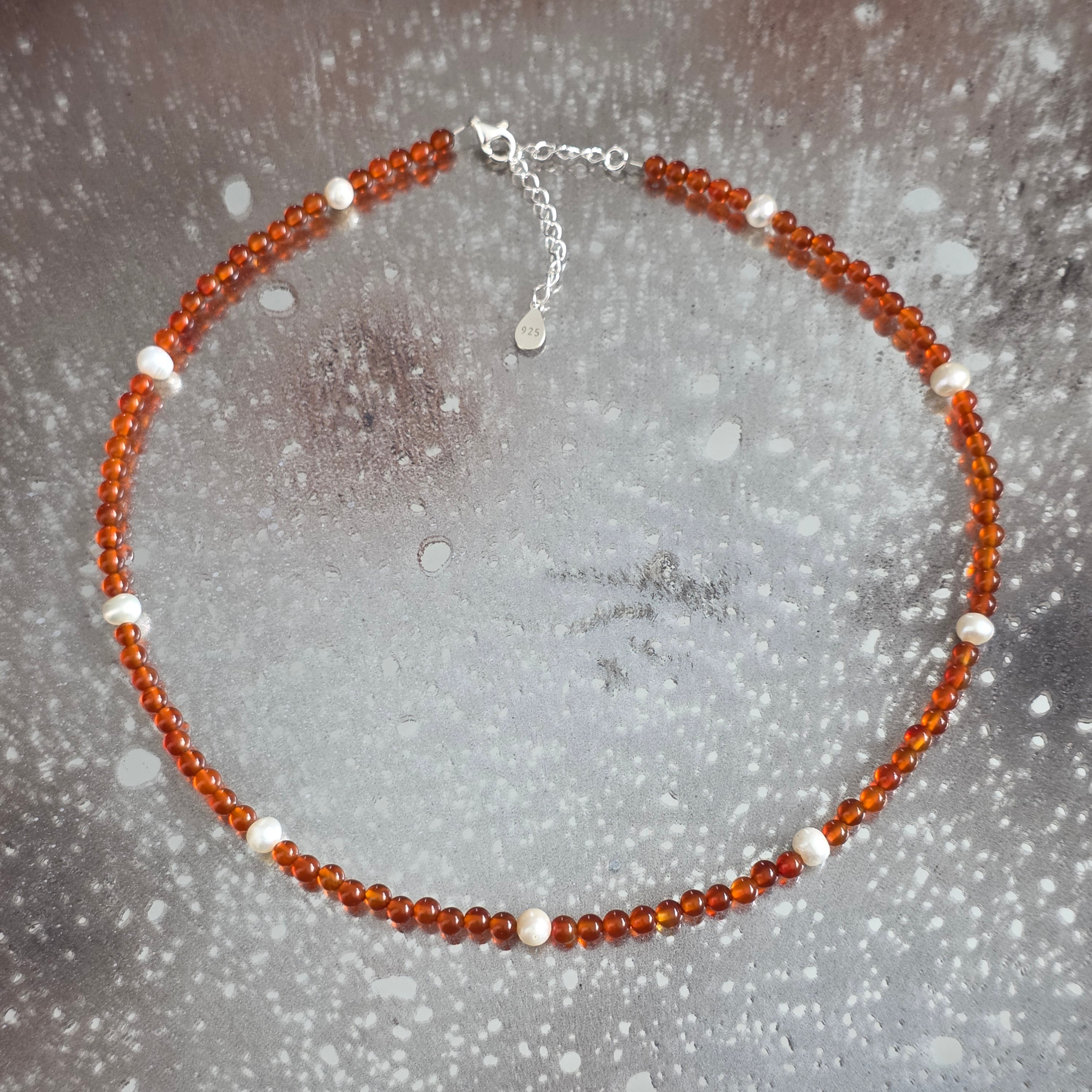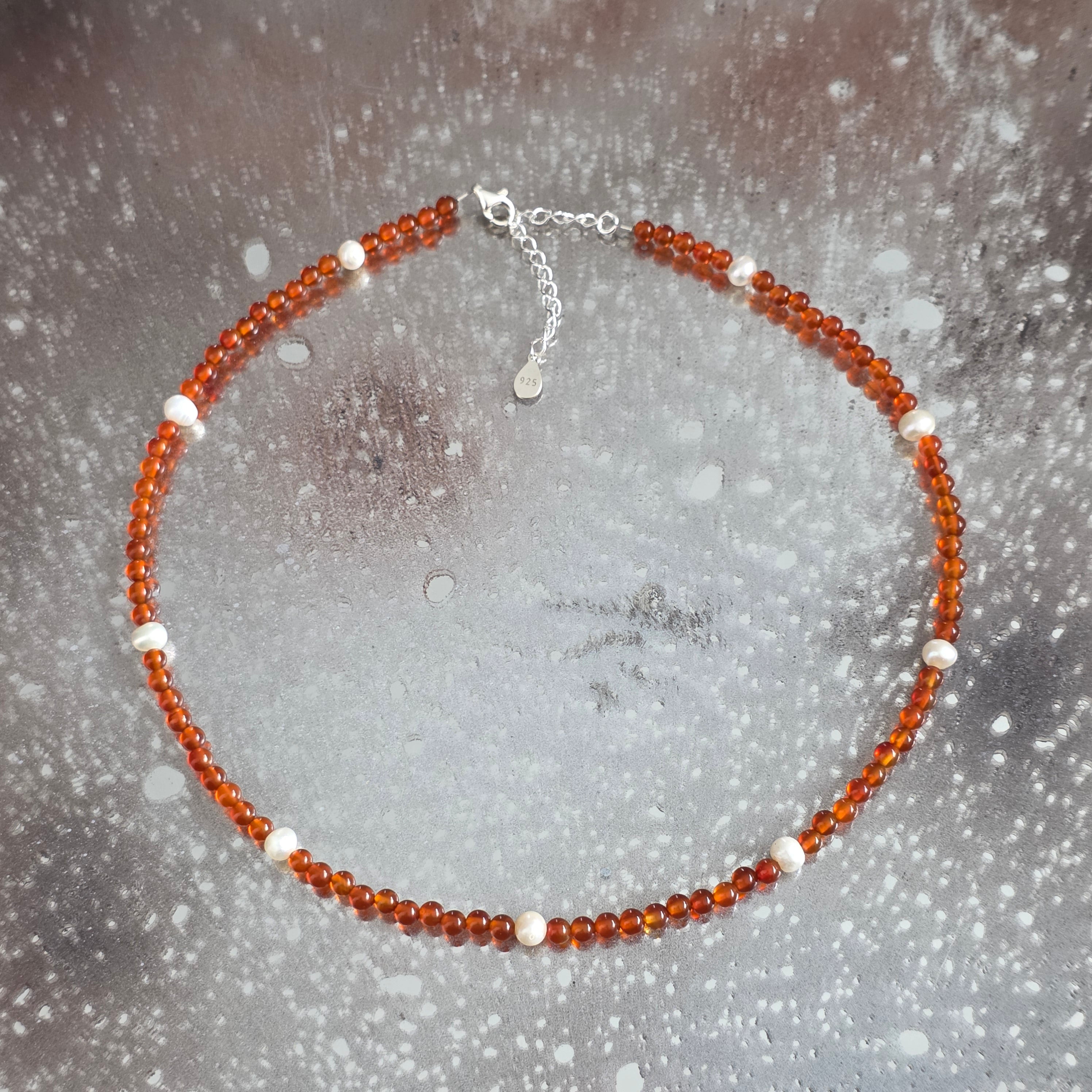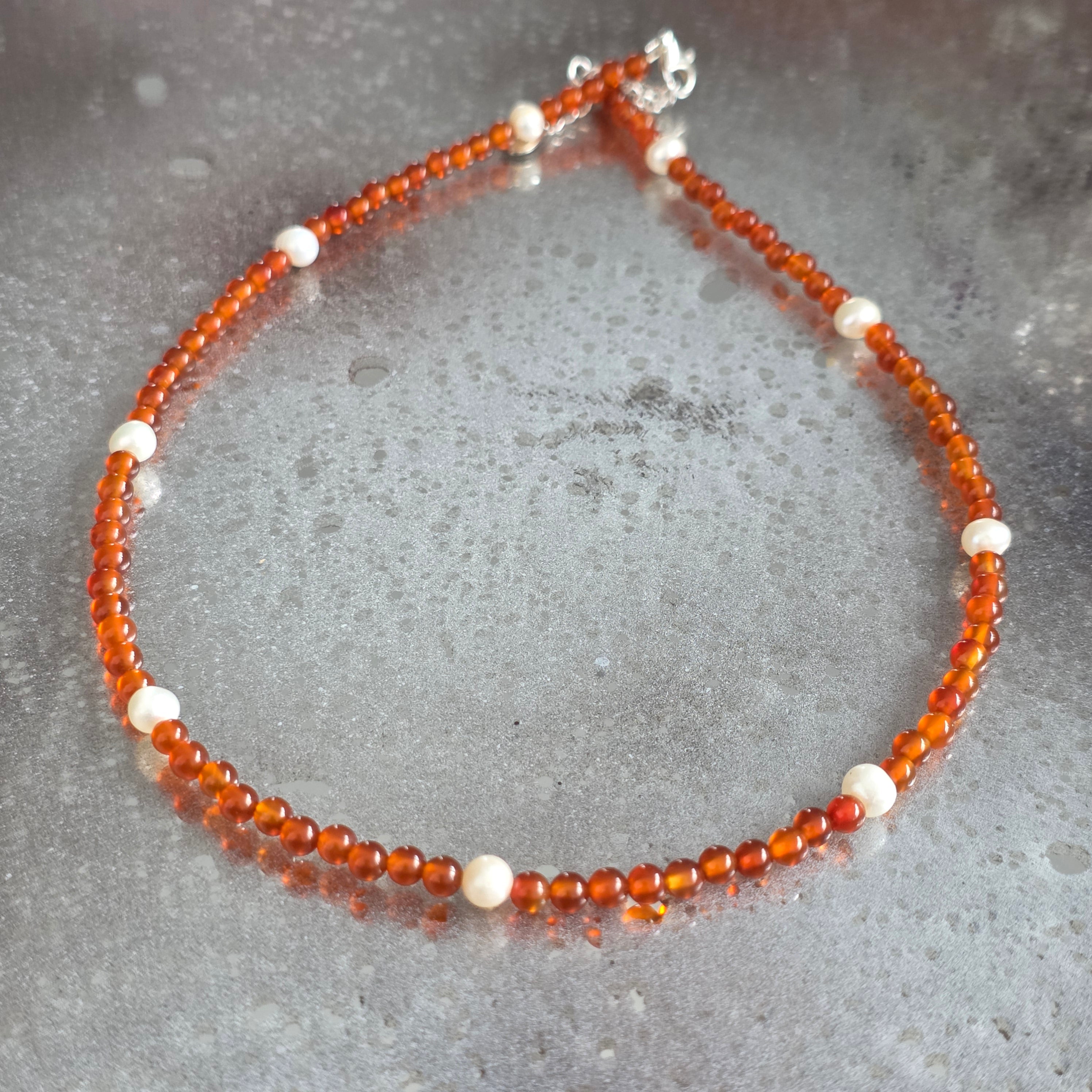 El collar Ember Grace #128 es una celebración del fuego interior transformado en arte. La cornalina, con sus tonos cálidos de naranja y rojo dorado, se entrelaza delicadamente con el blanco nacarado de las perlas, creando una armonía entre la pasión y la gracia.
