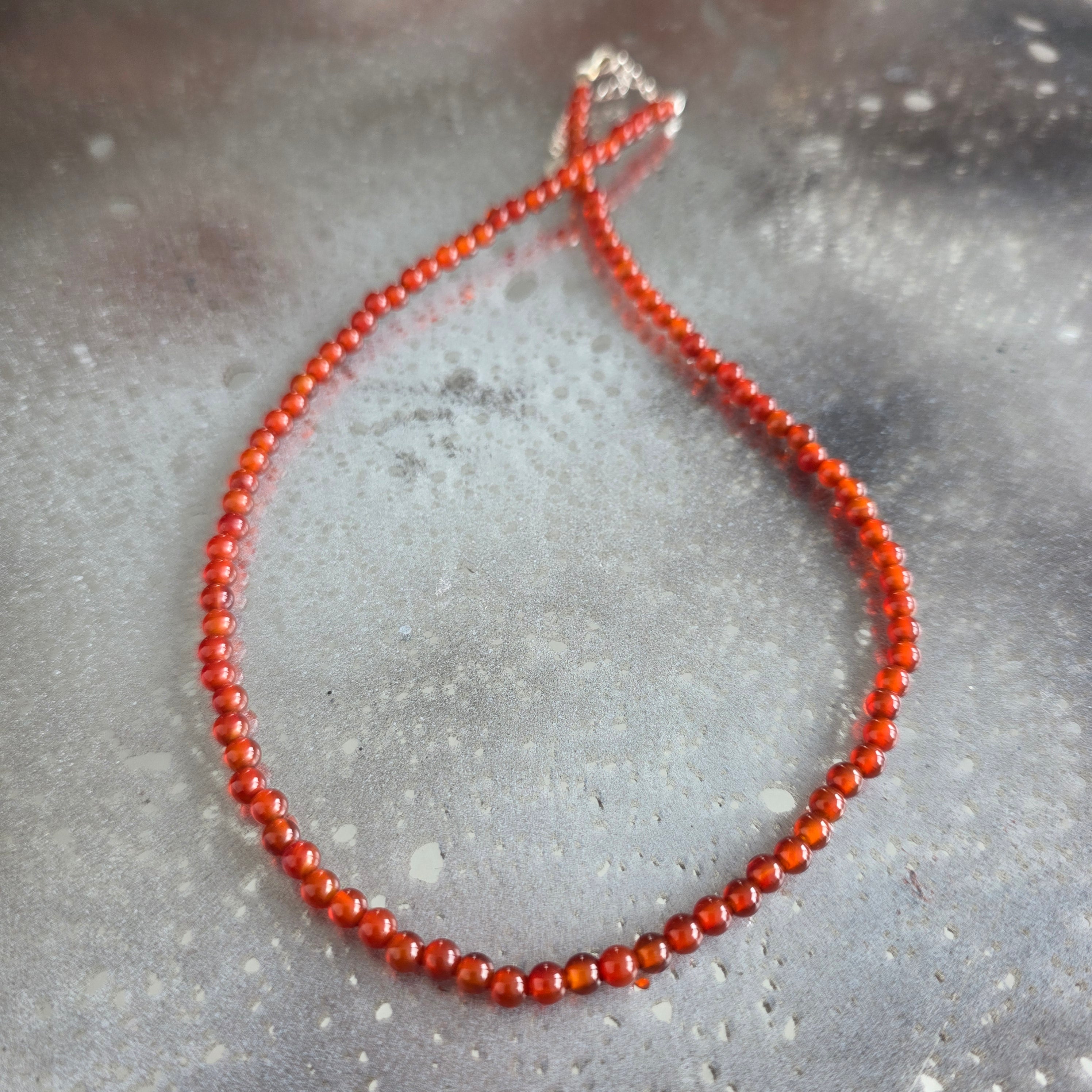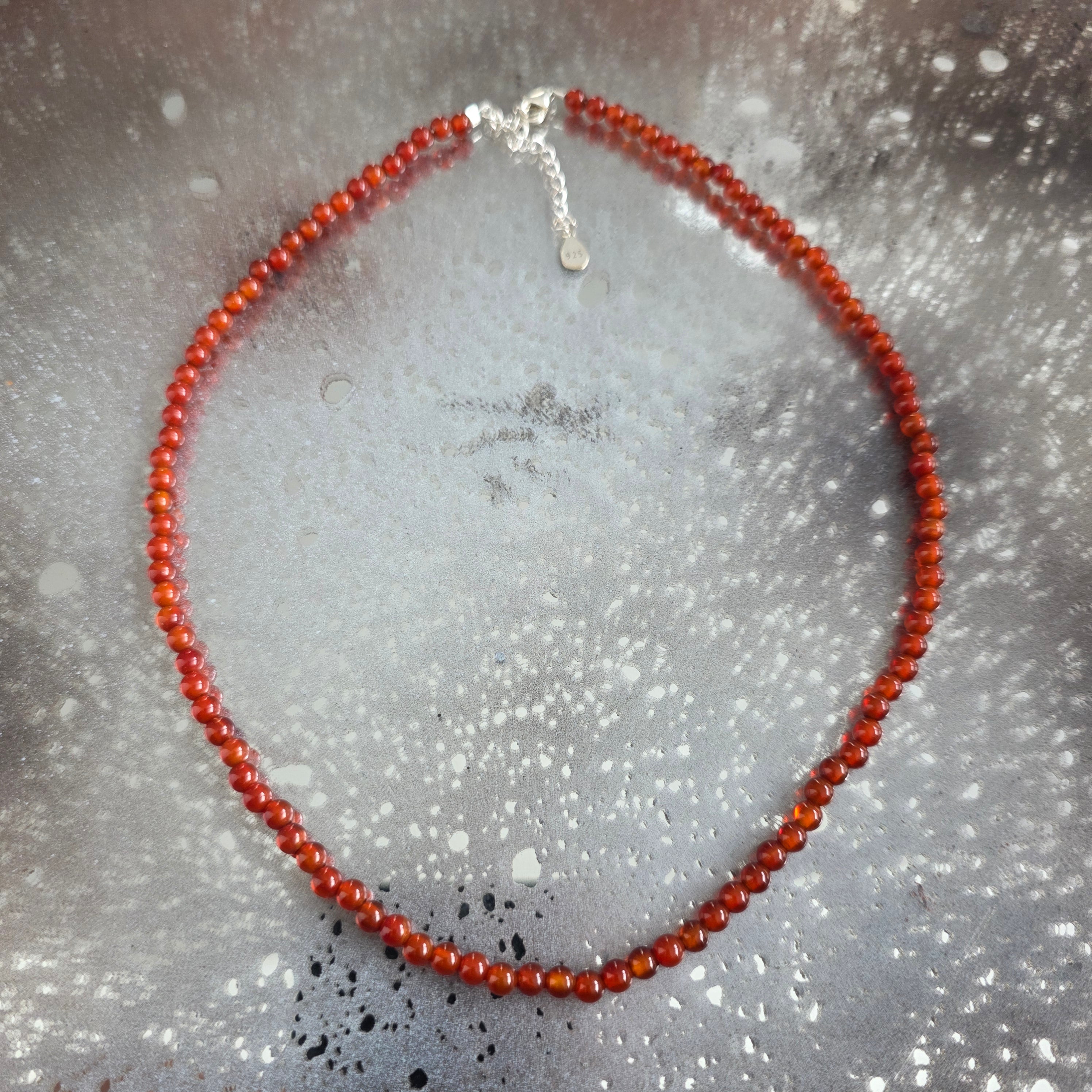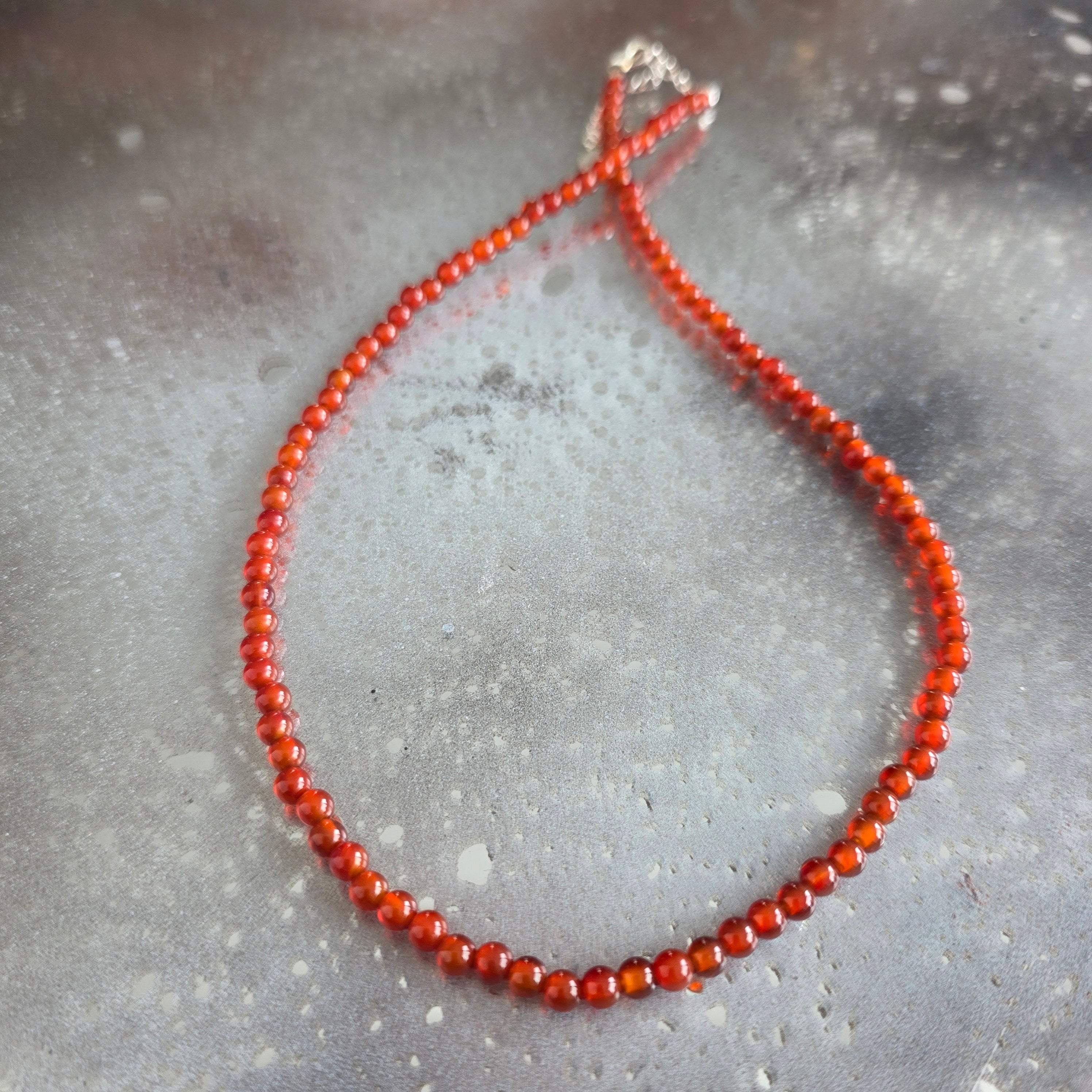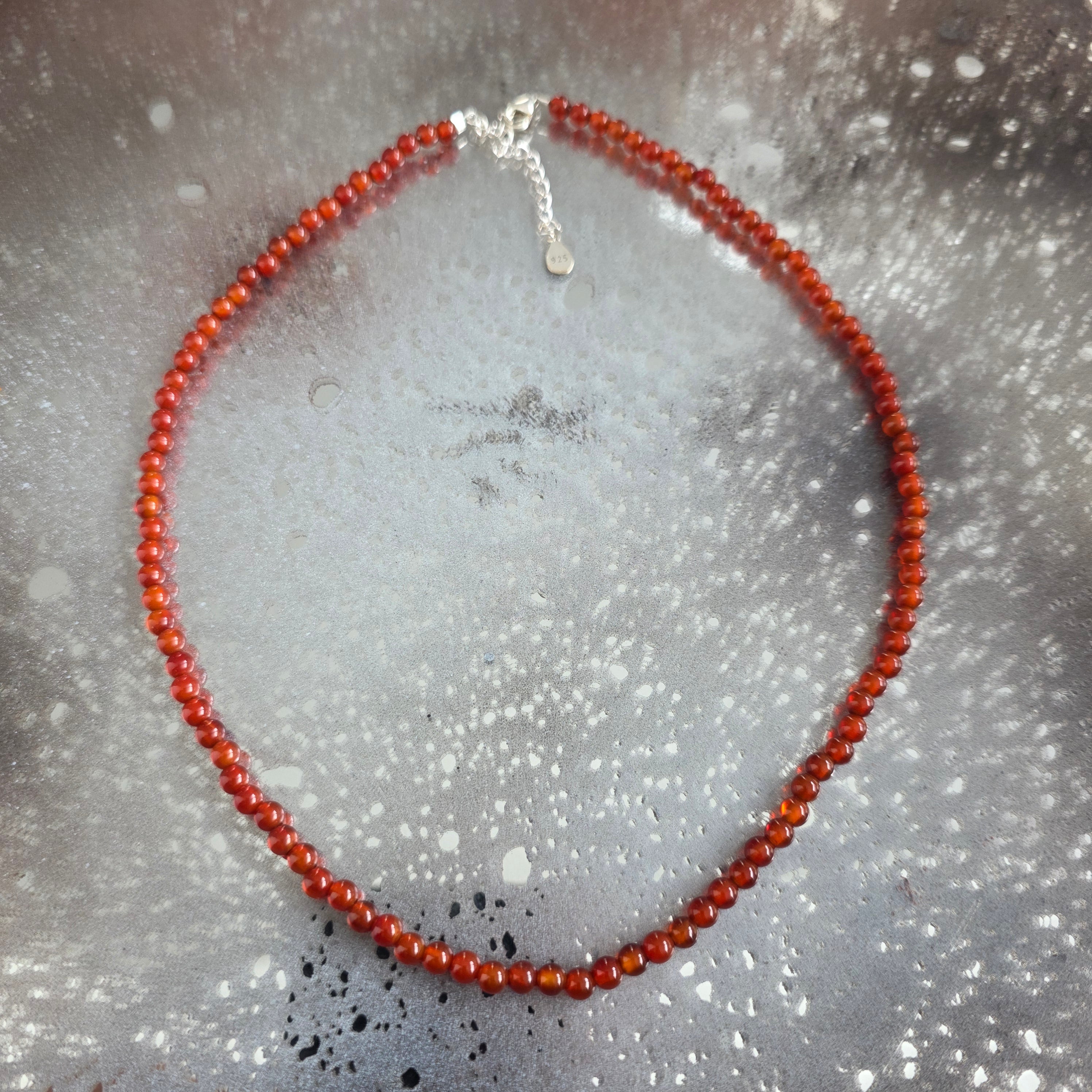 Un collar delicado, pero con un corazón ardiente: compuesto por pequeñas esferas de cornalina roja, perfectamente redondeadas, de 4 mm, como chispas minerales que envuelven tu cuello con discreción y fuerza silenciosa.