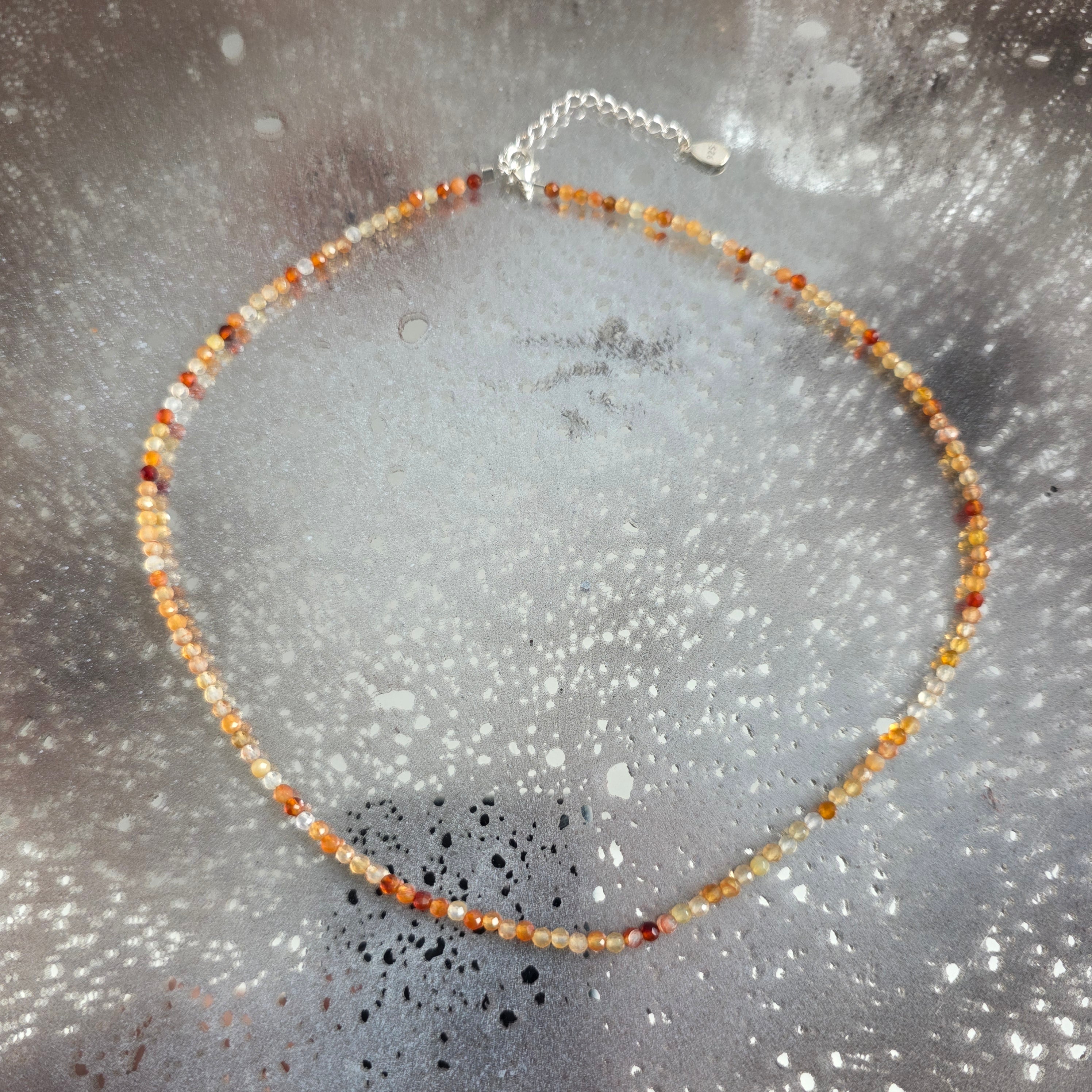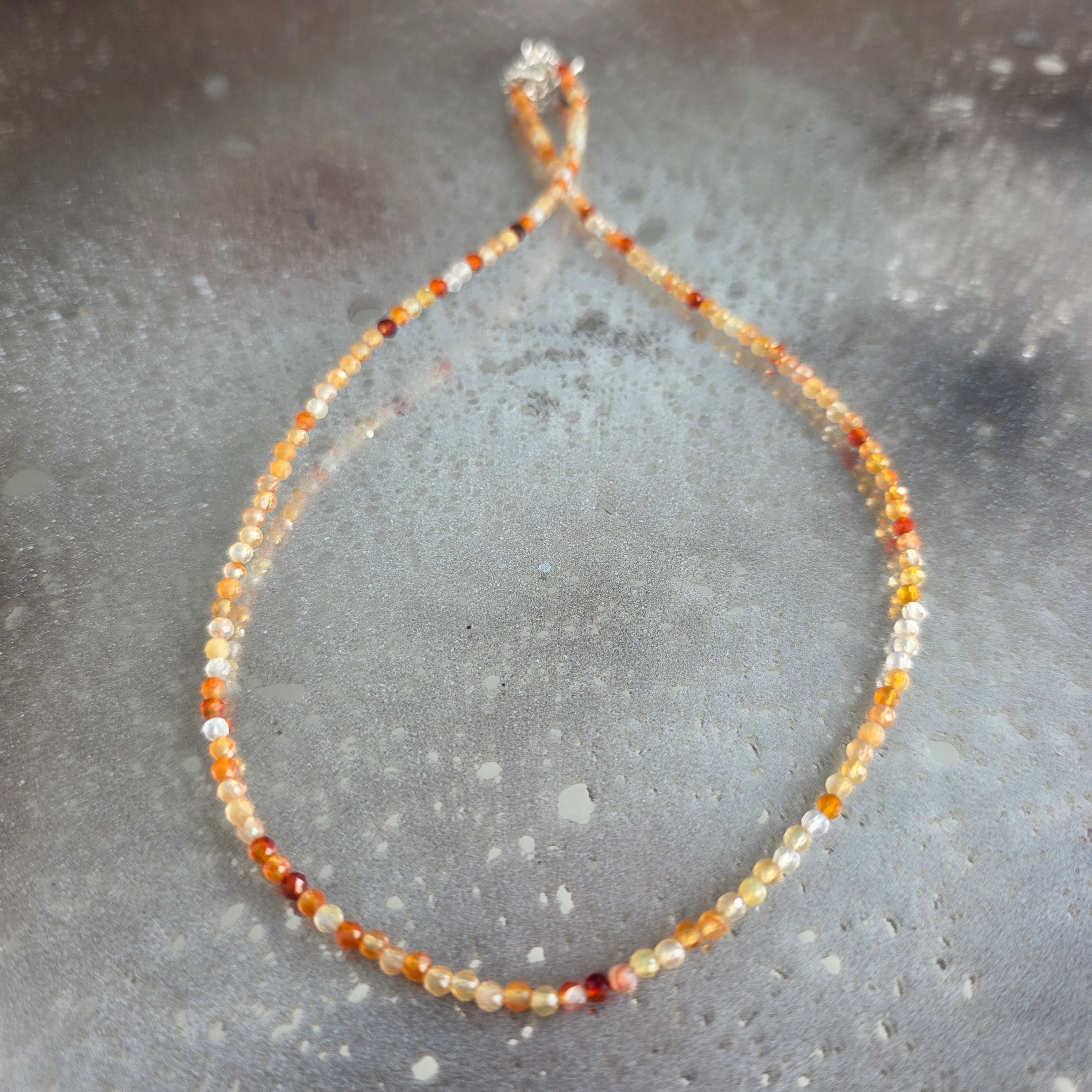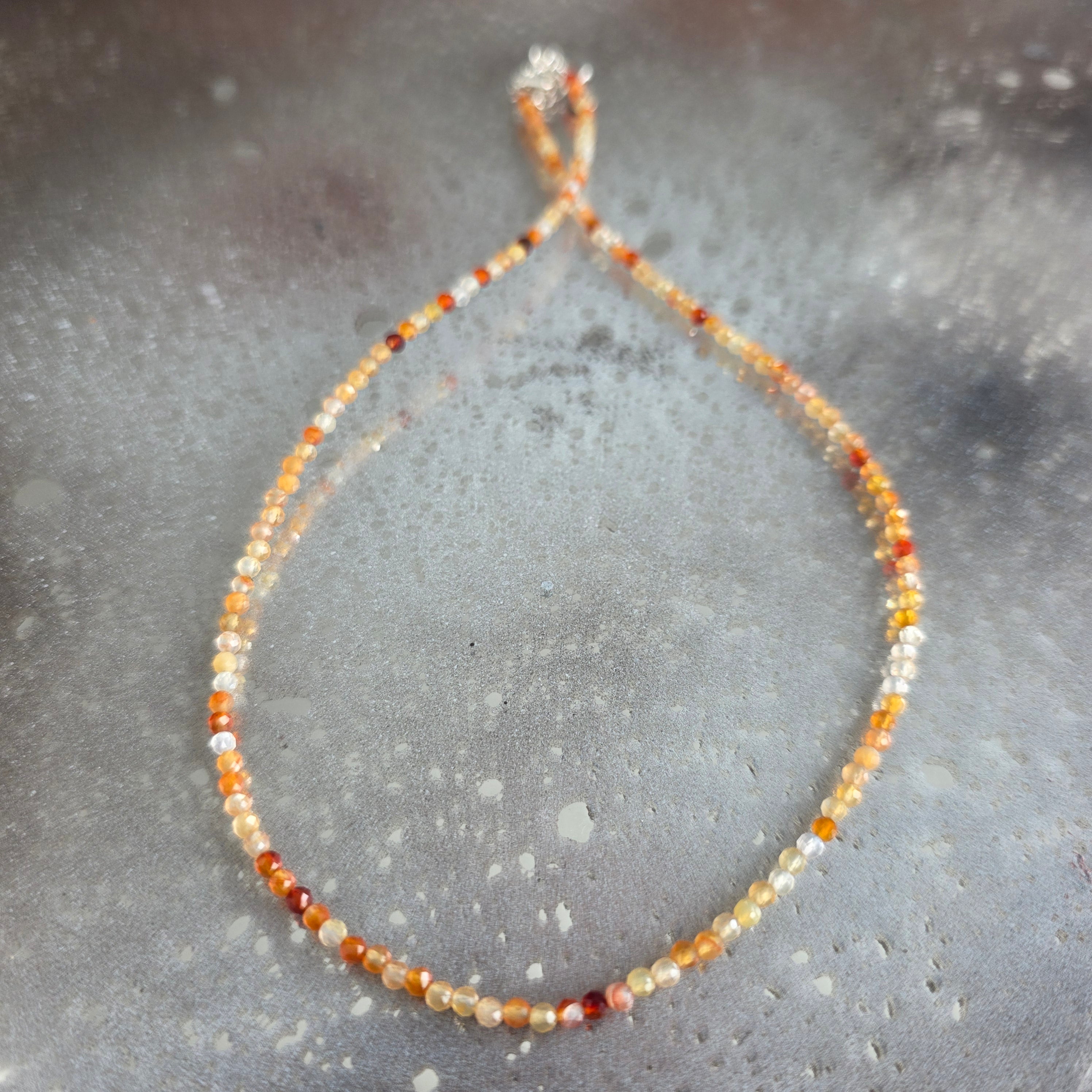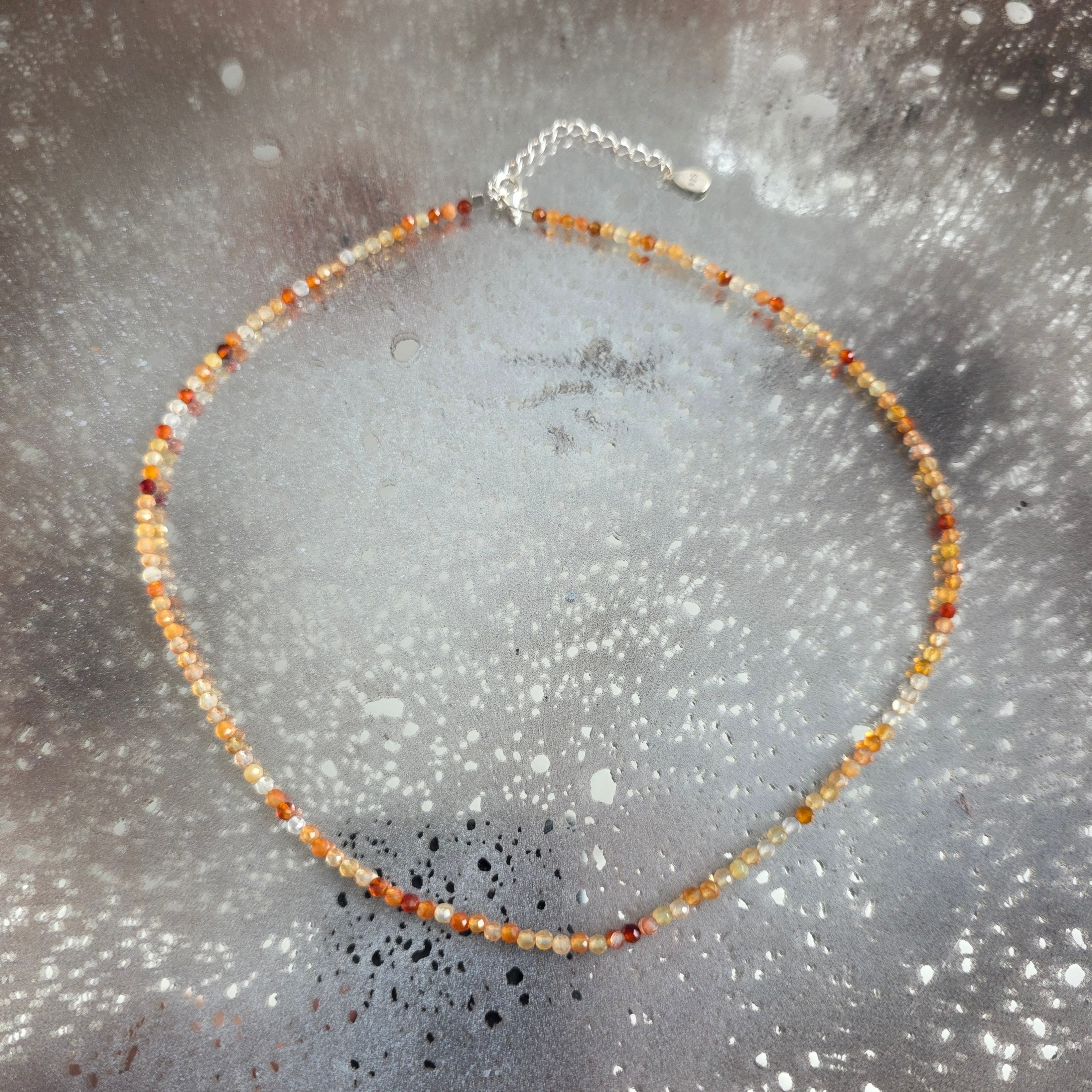 Un collar delicado, pero vivo, como una línea de fuego dibujada con precisión. Las cuentas facetadas de cornalina, de solo 3 mm, brillan sutilmente en variados tonos de naranja y rojo, como gotas de luz cálida reunidas de un atardecer tropical.
