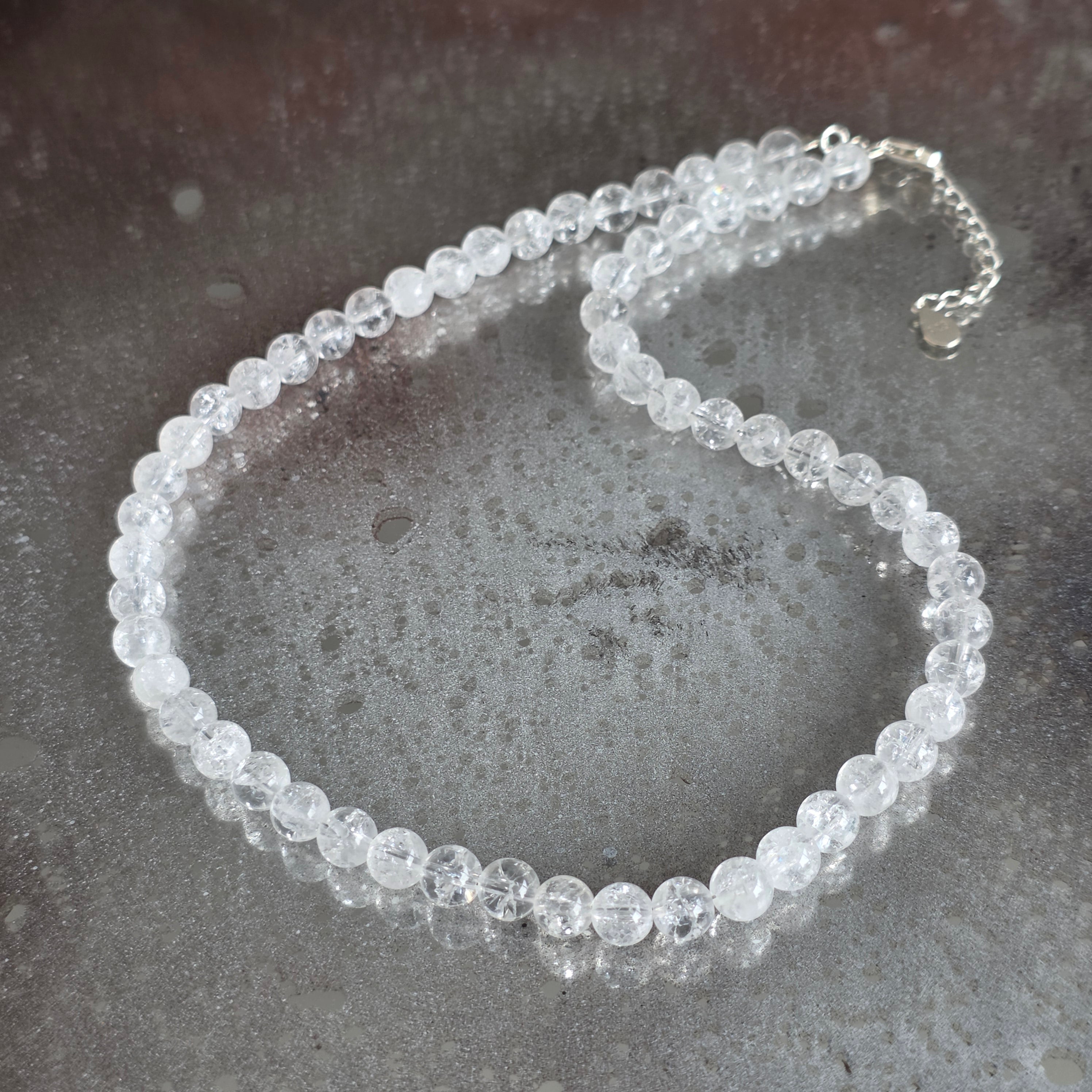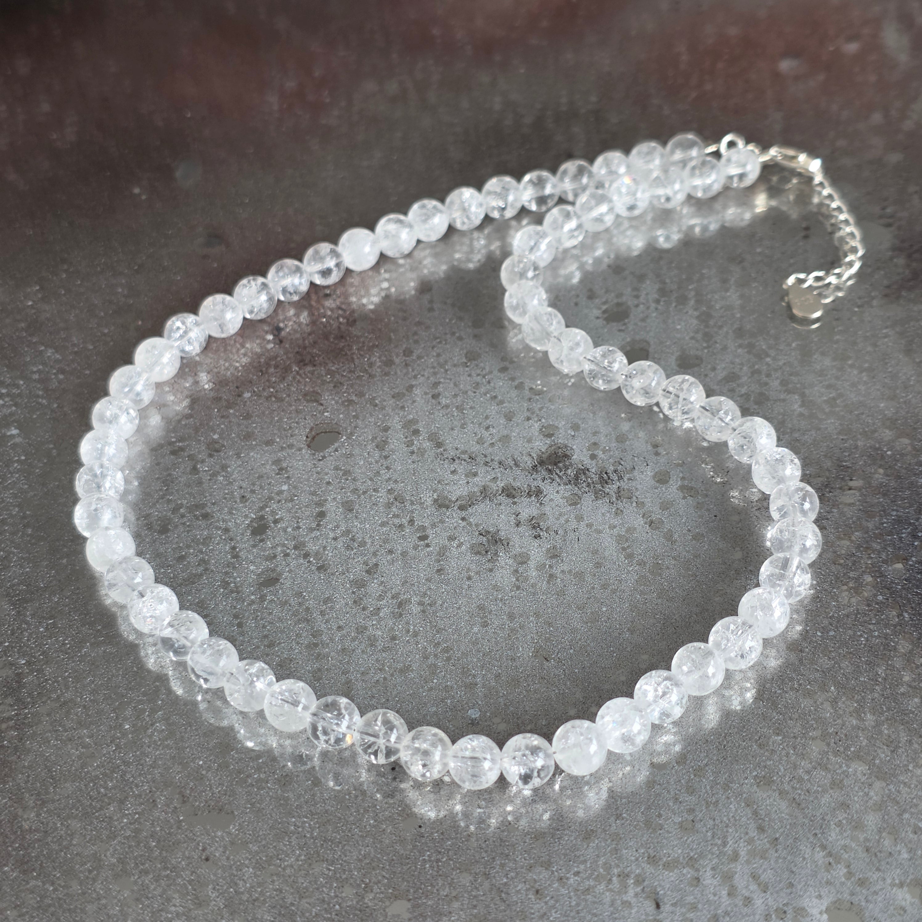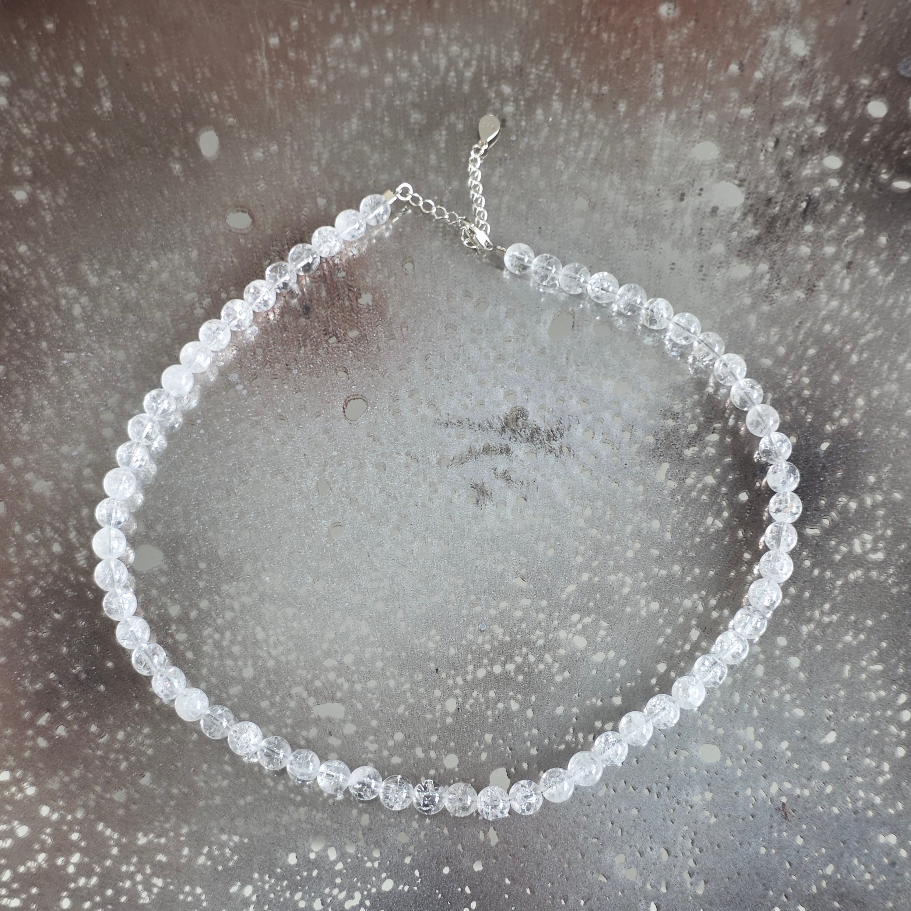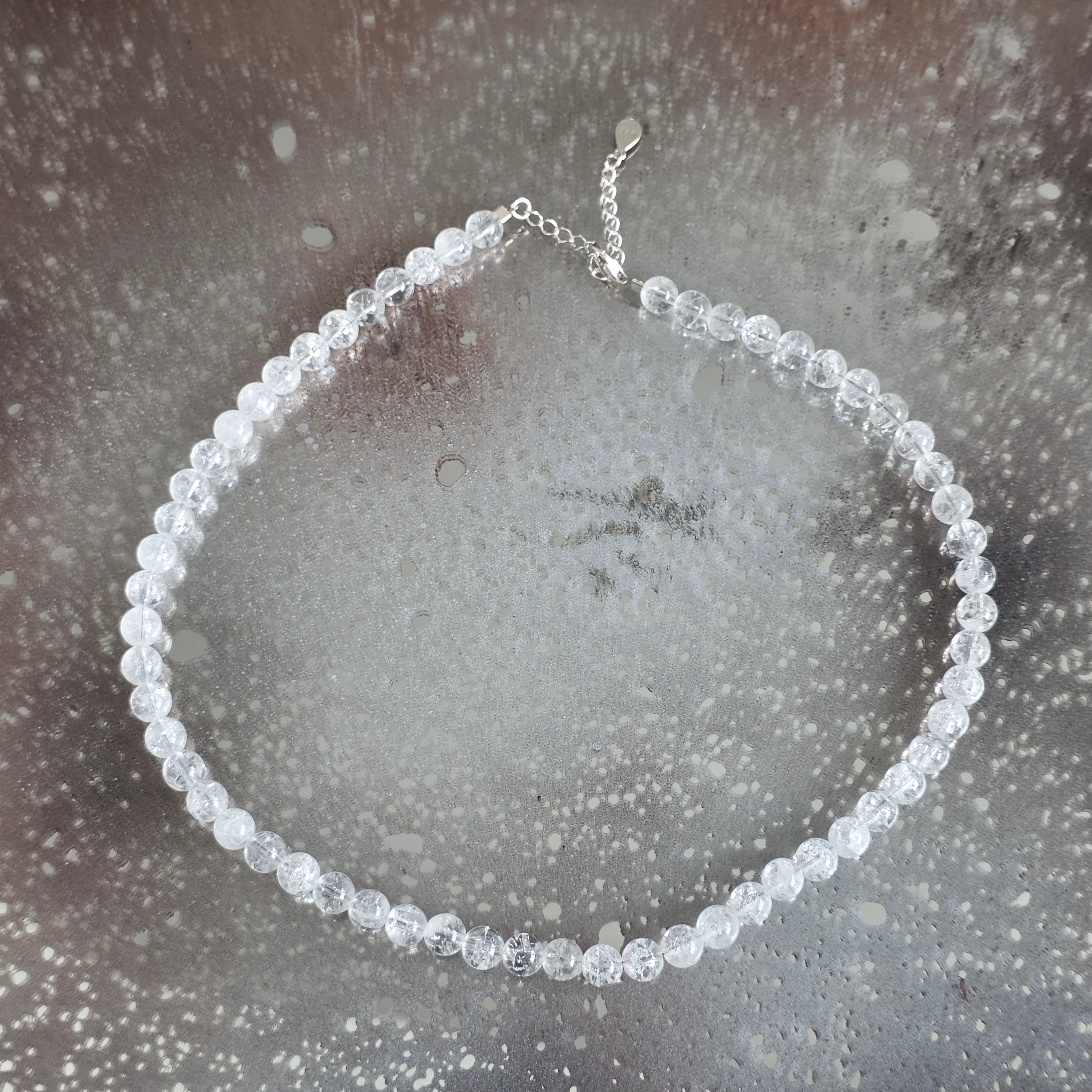 Un collar que captura la esencia de la calma cristalina: un equilibrio entre fragilidad y fuerza. El cuarzo incoloro “crashed”, con sus texturas internas únicas, parece un universo atrapado en vidrio, en el que la luz se multiplica y se transforma. Cada esfera de 6 mm es un pequeño milagro de transparencia, que lleva una belleza serena, fría y clara.