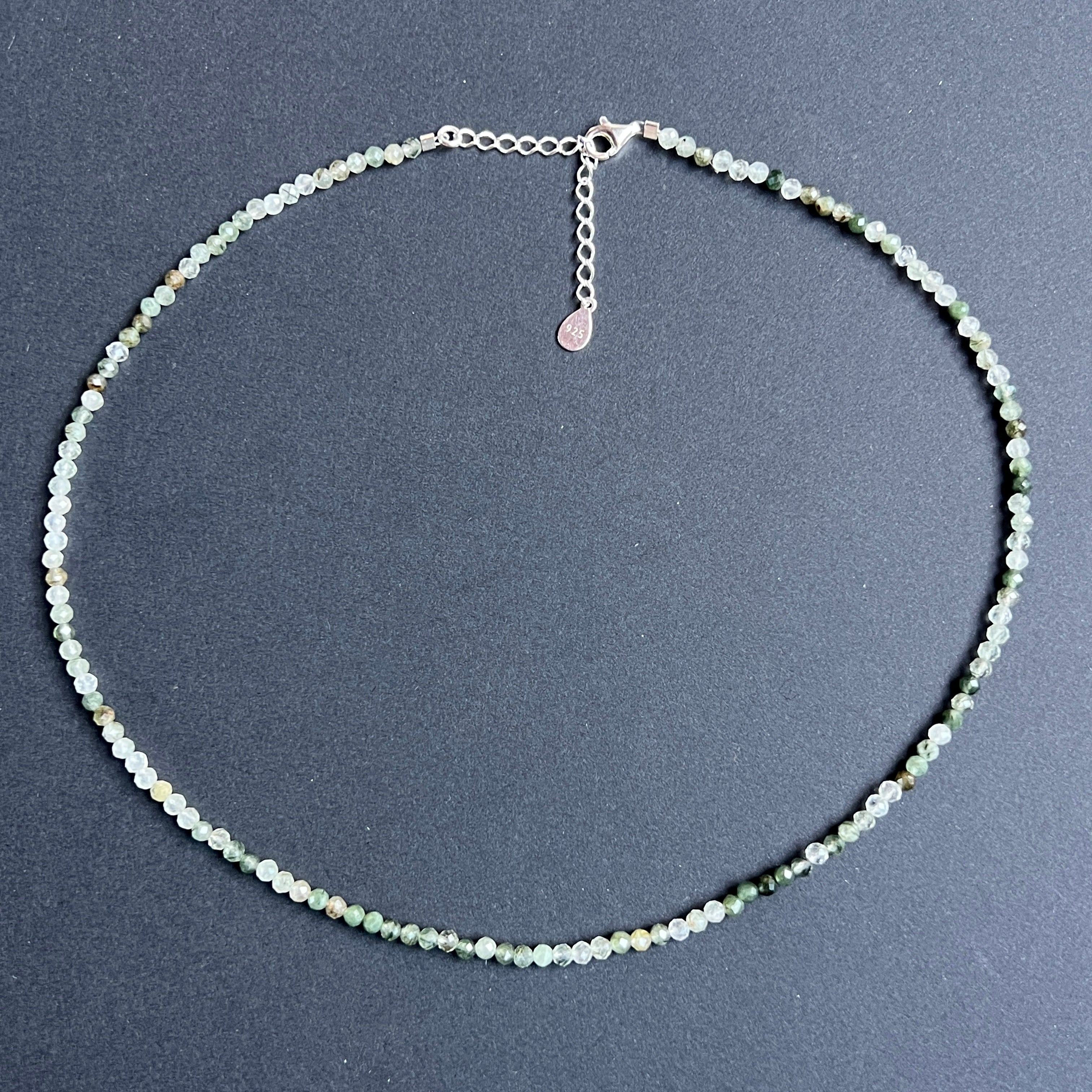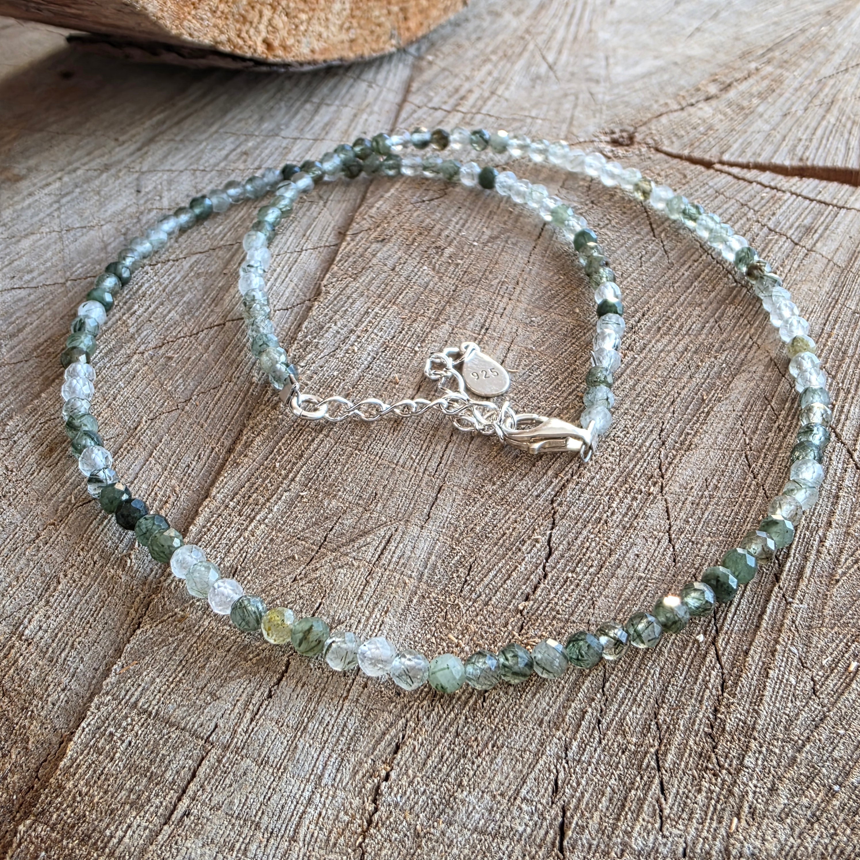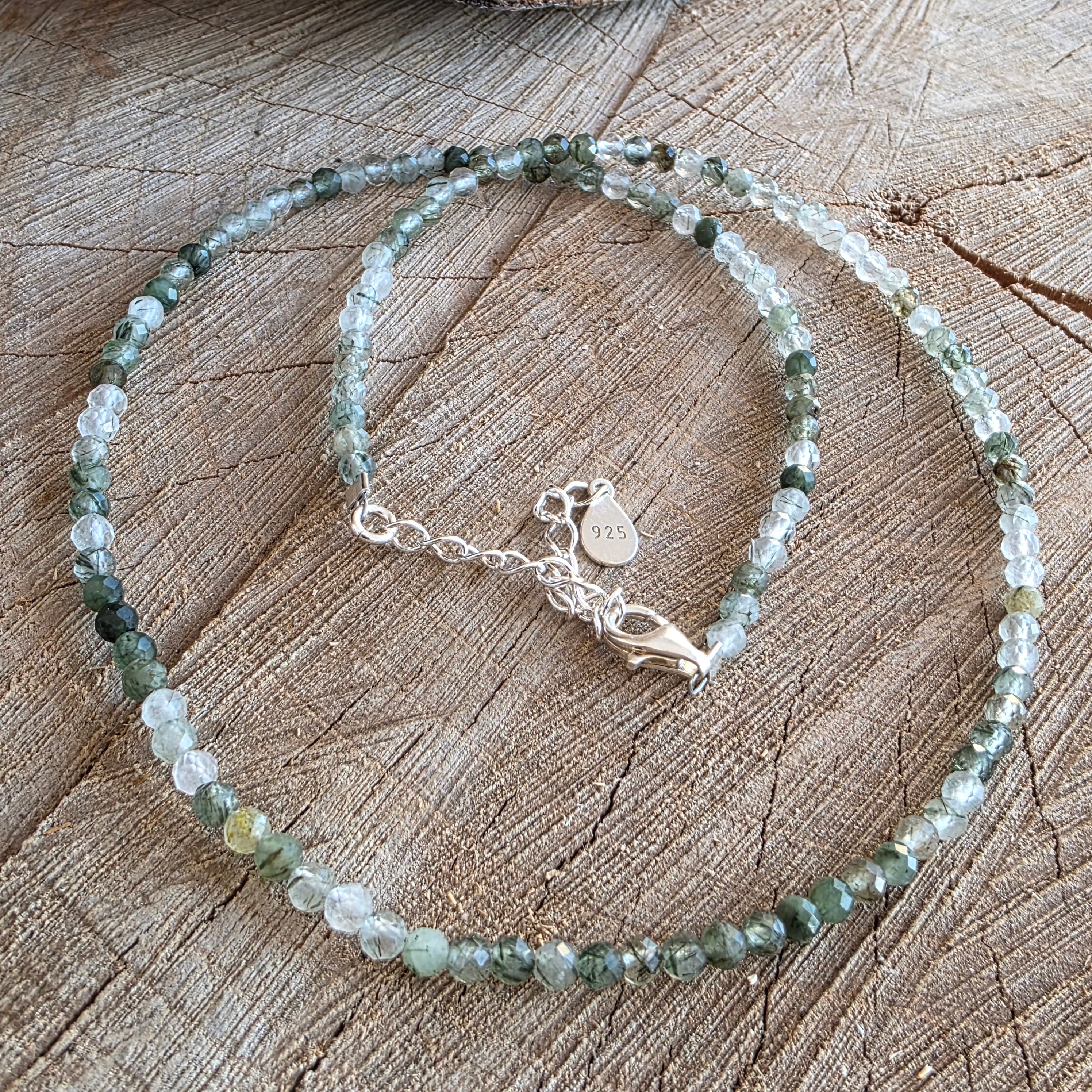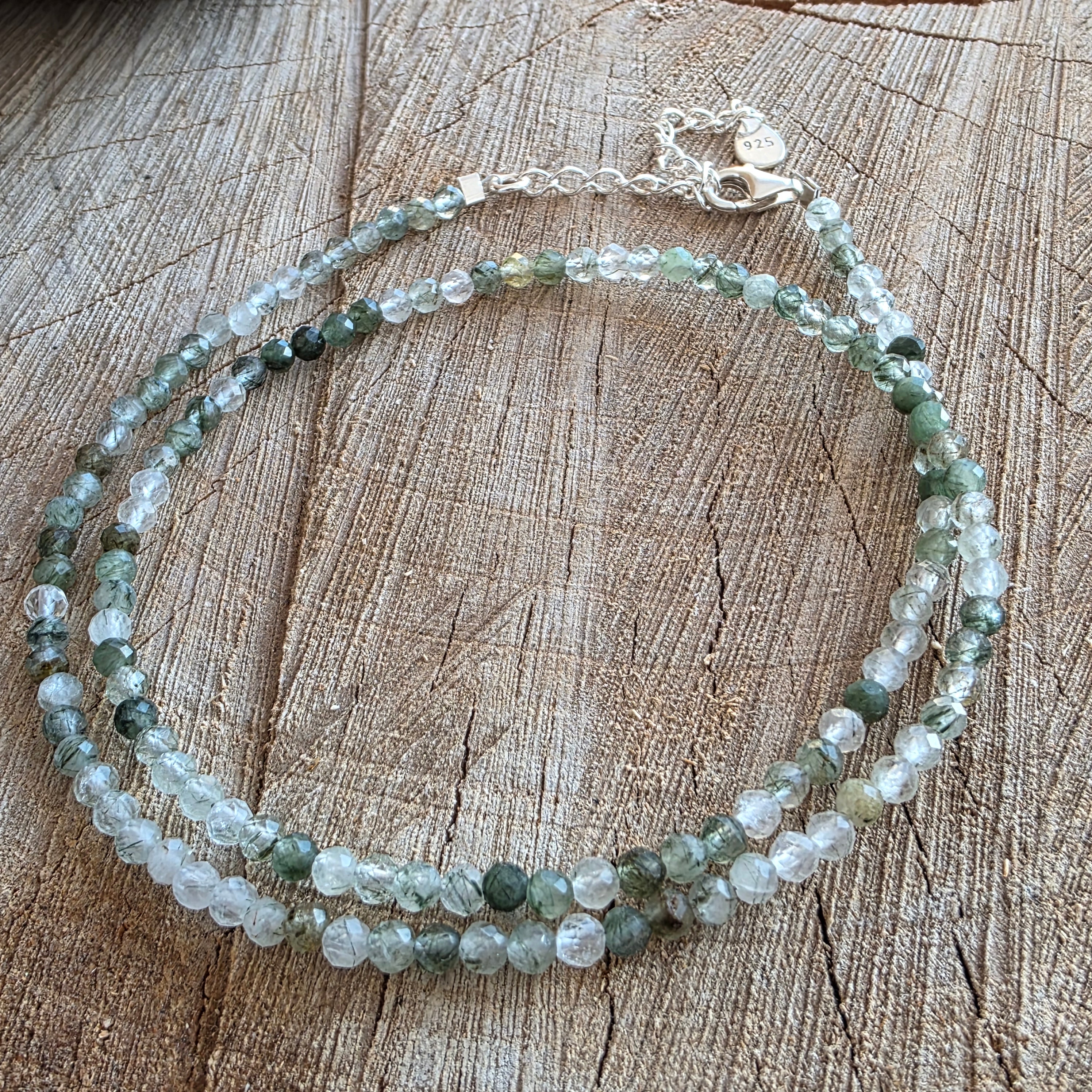 El hilo está compuesto por cuentas facetadas de cuarzo verde rutilado de 3 mm, cada cuenta es un pequeño mundo en sí misma: cristales transparentes atravesados por finas inclusiones verdes, semejantes a hilos de musgo o raíces suspendidas en agua clara. El juego entre claridad y densidad crea una textura visual sutil, orgánica, en la que el verde no es un color, sino una pulsación.