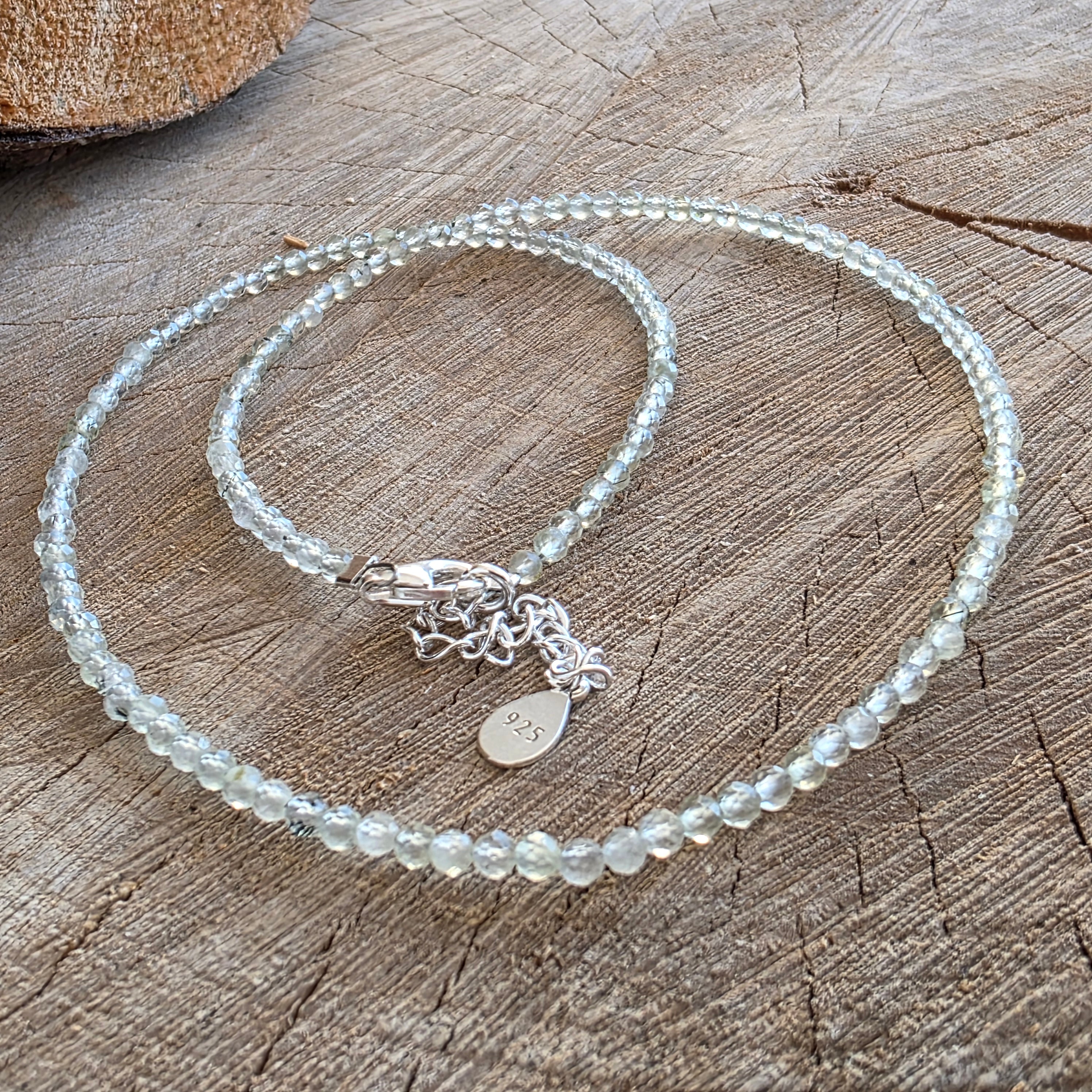 Un collar como una ventana abierta a la luz: vivo, claro, juguetón y profundo al mismo tiempo. Las cuentas facetadas de fluorita verde de 3 mm brillan en tonos verdes, como un puente entre la emoción y la razón, entre el sueño y la lucidez.
