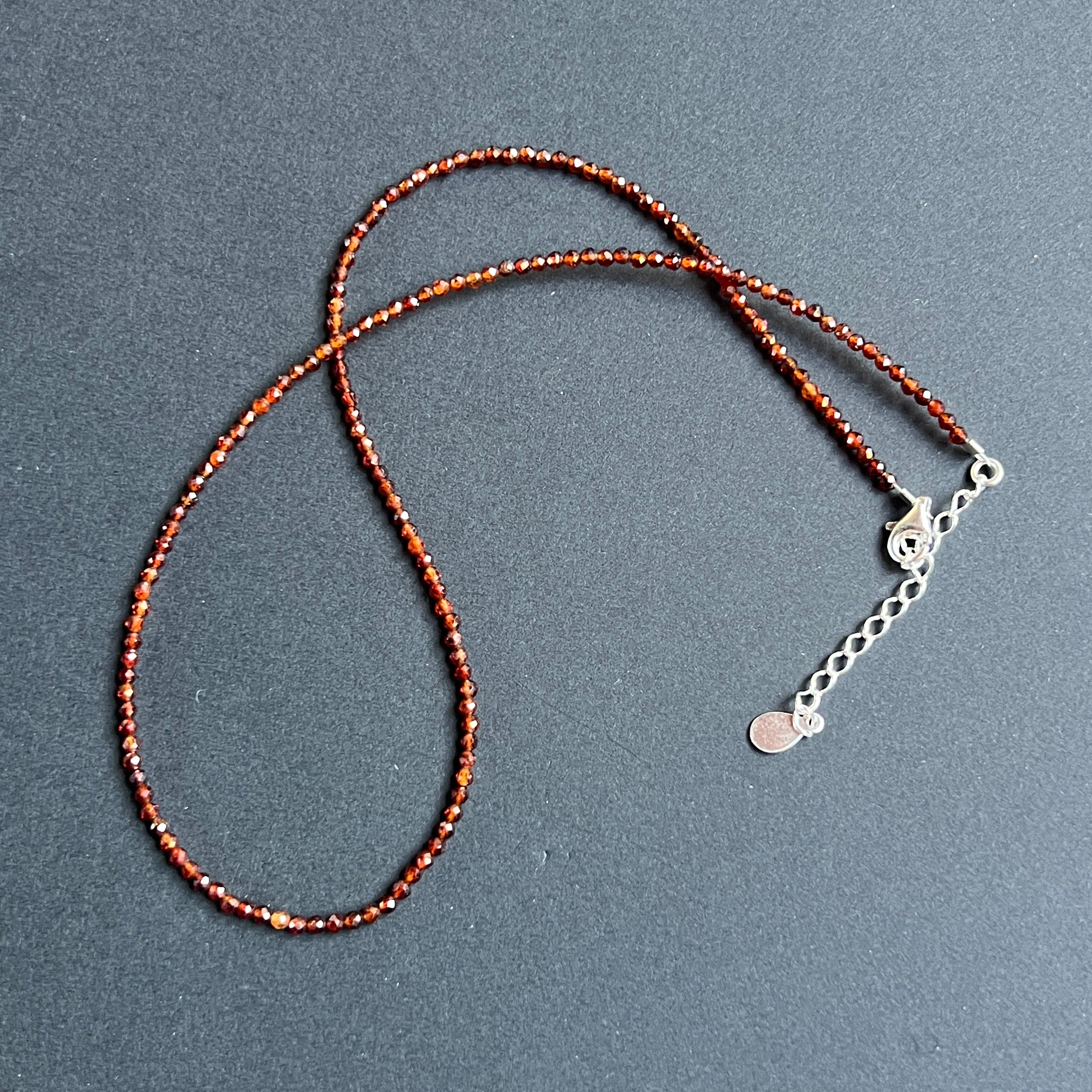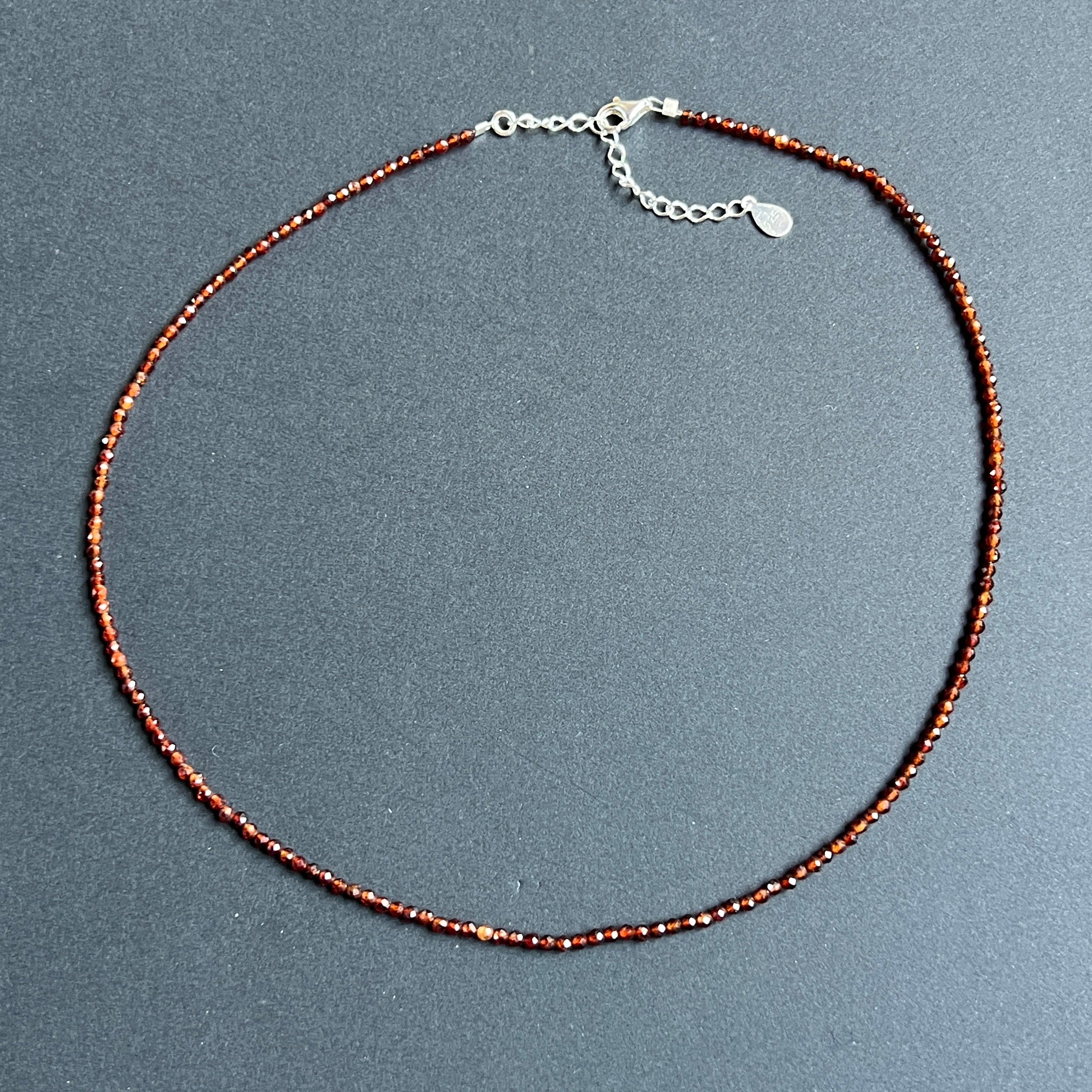 El hilo está compuesto por esferas facetadas de granate natural de 2,5 mm, en un tono raro de naranja-cereza. Cada cuenta parece esculpida de brasas apagadas, con reflejos entre vino tinto especiado, canela y brasa dorada. Las facetas finas captan la luz en ángulos discretos, creando un juego sutil entre calidez y profundidad.