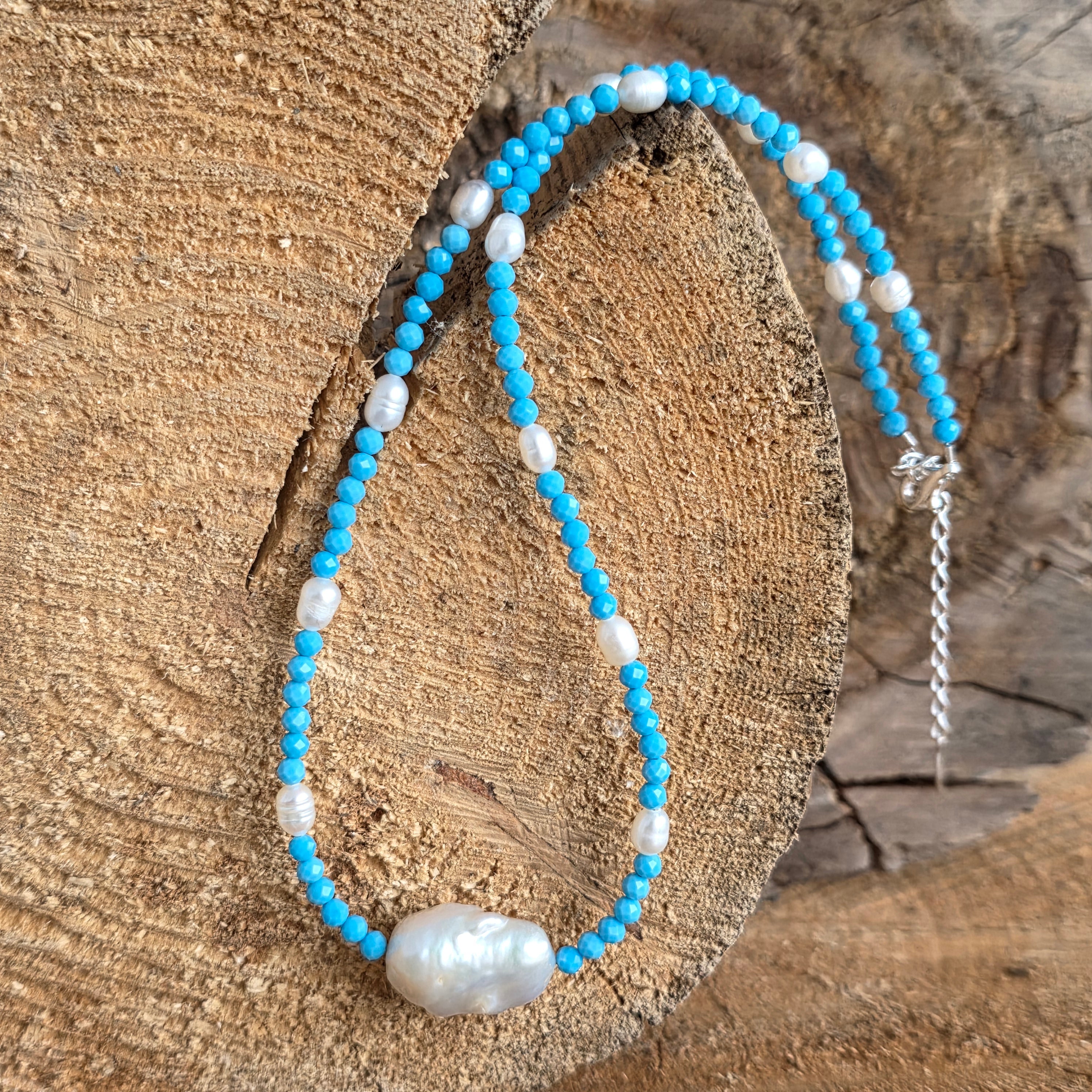 Materiales: howlita azul facetada 2,5–3 mm, perlas irregulares ~4 mm, perla rectangular central ~2 cm, plata 925