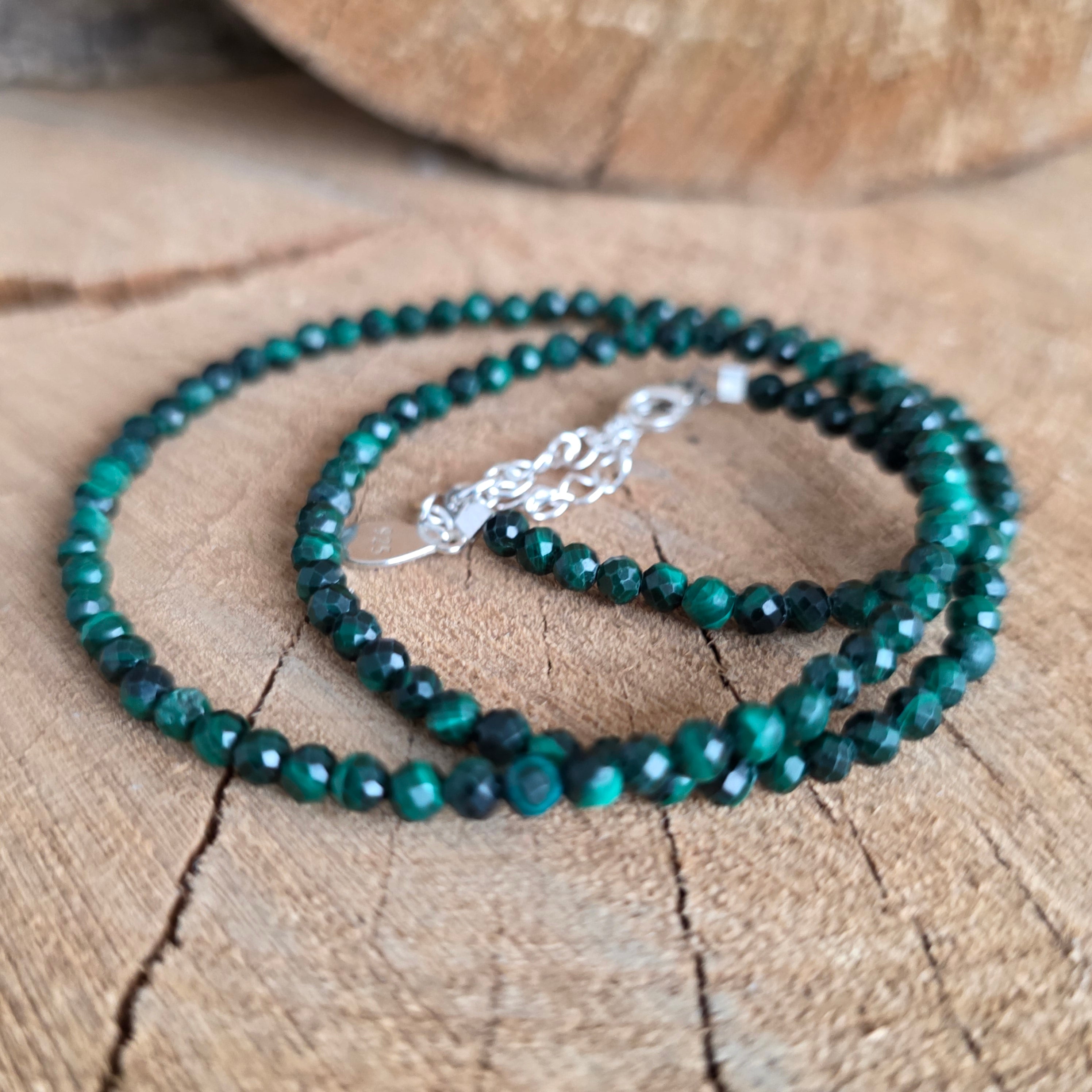 Un collar que lleva la canción profunda de la tierra, un eco de la fuerza y la regeneración. La malaquita, con sus tonos de verde intenso y franjas fluidas, es una piedra viva —expresión de transformación, protección y renacimiento interior. Cada cuenta facetada de 3 mm es un mundo en sí mismo, un baile entre la luz del esmeralda y la sombra del bosque.