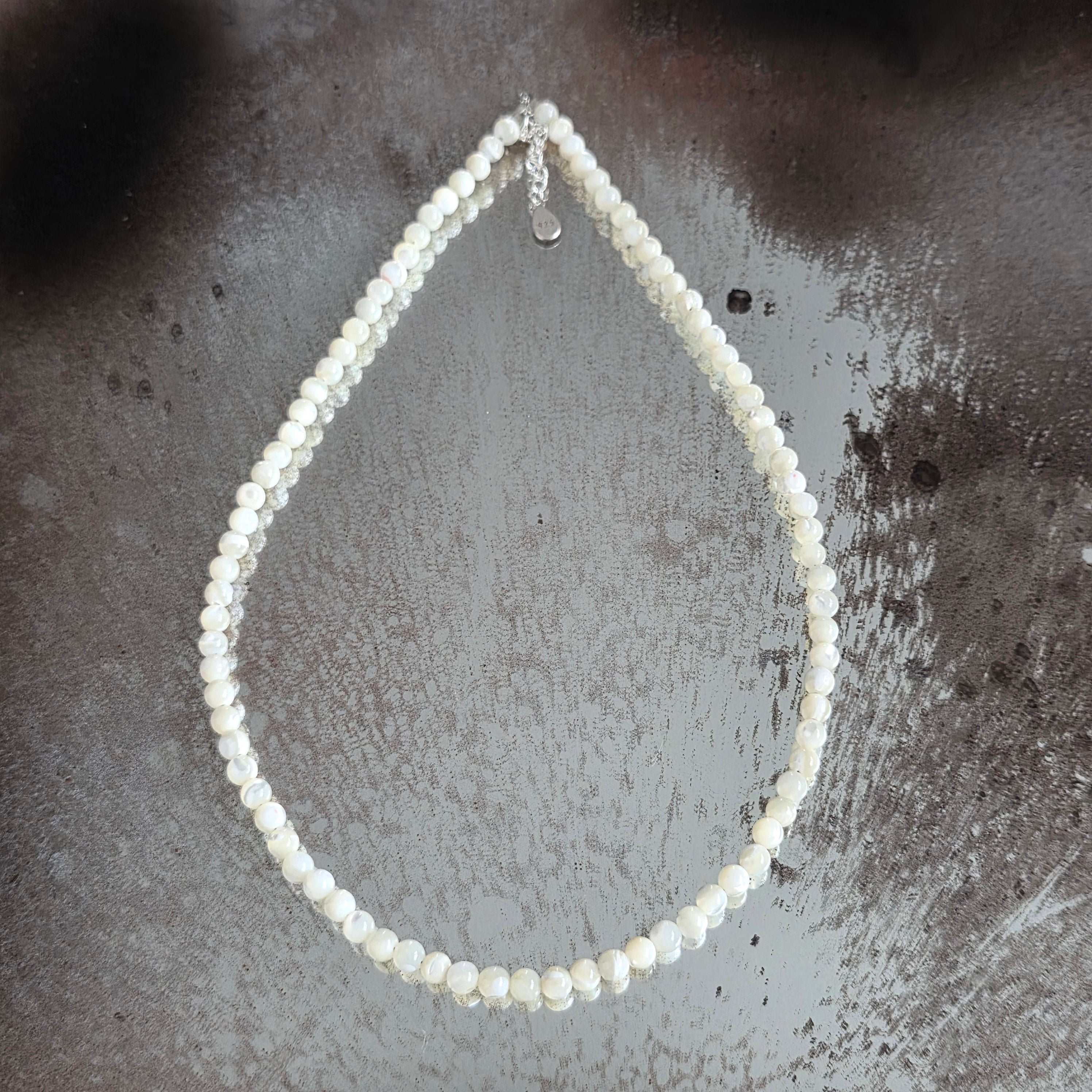 Un collar hecho a mano, con nácar cuidadosamente seleccionado, que conserva el suave brillo del mar en cada reflejo. Pieza con acentos naturales y tonos perlados, el nácar aporta una elegancia atemporal y un aire tranquilo, perfecto para quienes aman la belleza discreta. Fácil de llevar a diario o en ocasiones especiales, el collar se convierte en un detalle sutil que ilumina el conjunto y aporta armonía al estilo personal.