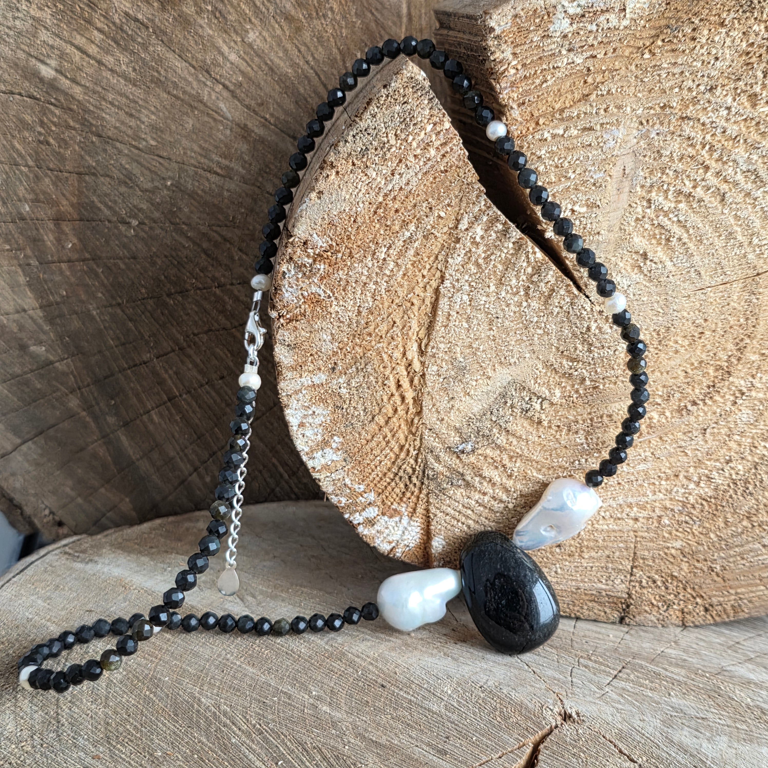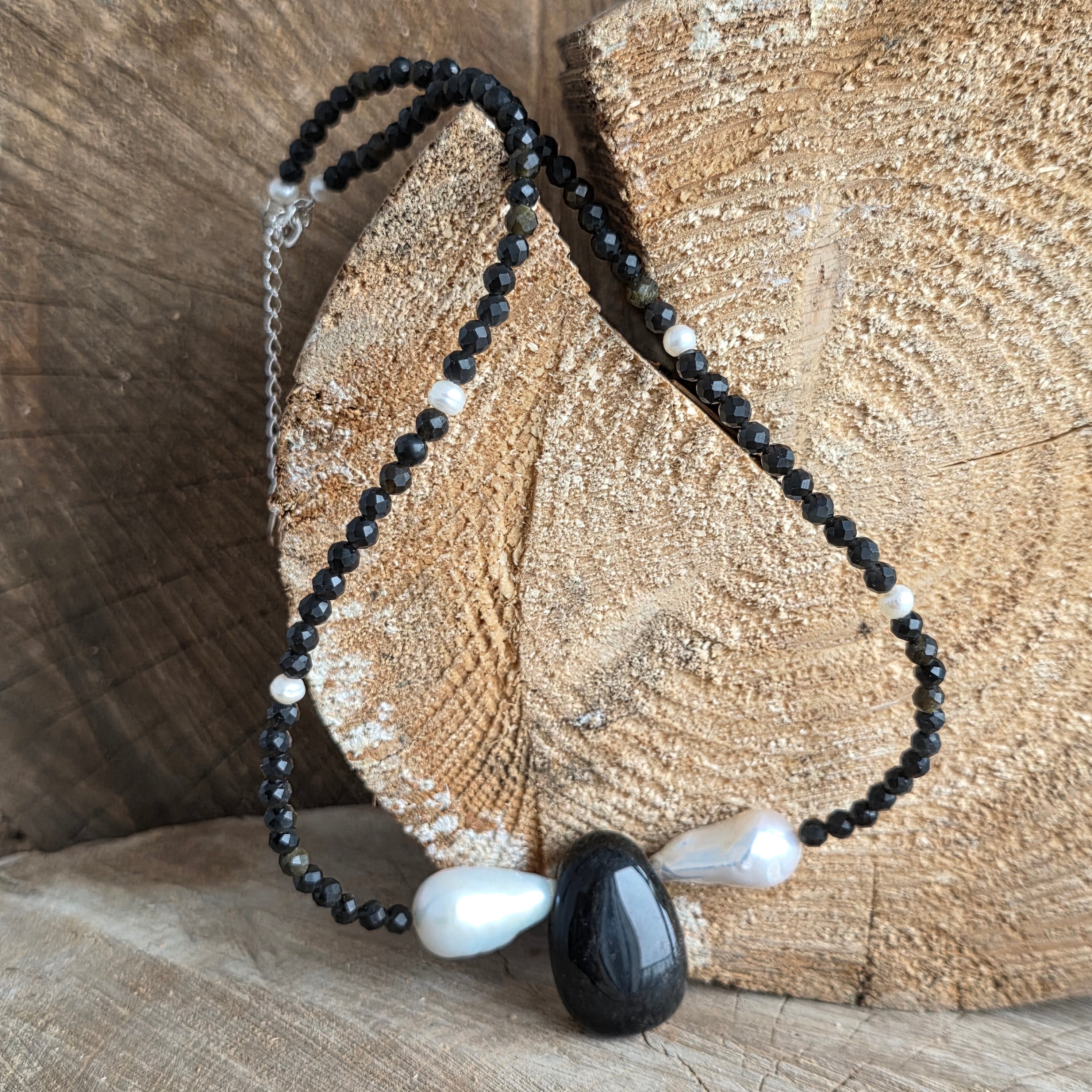 En el centro del collar, un colgante drop de 3 cm de obsidiana plateada cae como un sello protector, profundo y brillante, guardando el corazón con una presencia calmada y decidida. Dos perlas naturales completan la composición con notas de gracia y equilibrio, una unión entre la fuerza de la tierra y la suavidad de las aguas.