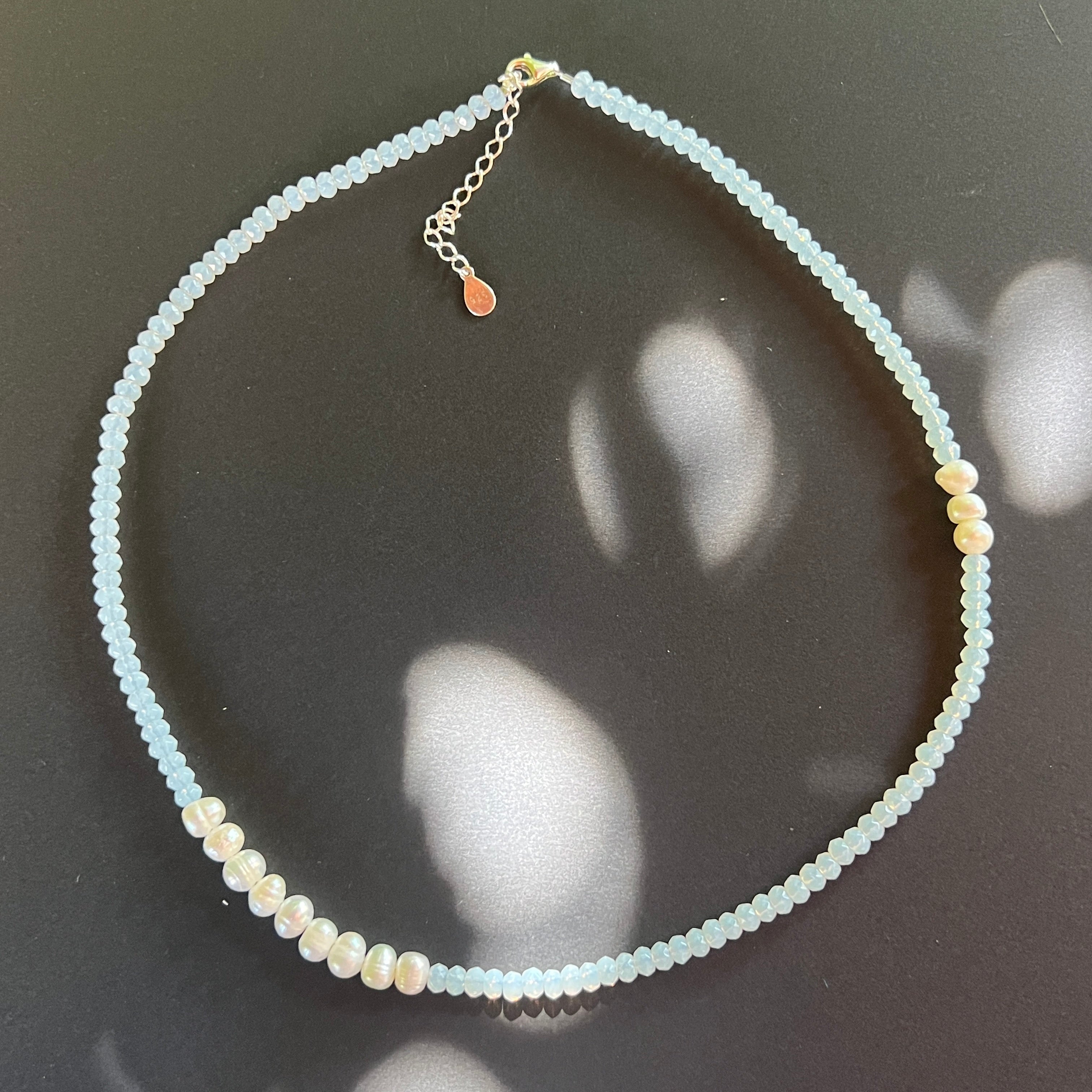 Un collar como una vibración de sueño: translúcido, etéreo, con reflejos que parecen venir de otro mundo. Las cuentas facetadas de opalita de 3 mm juegan con la luz en un baile sutil de blanco lechoso, azul iridiscente y destellos amarillos, semejante a una mañana envuelta en niebla y esperanza.