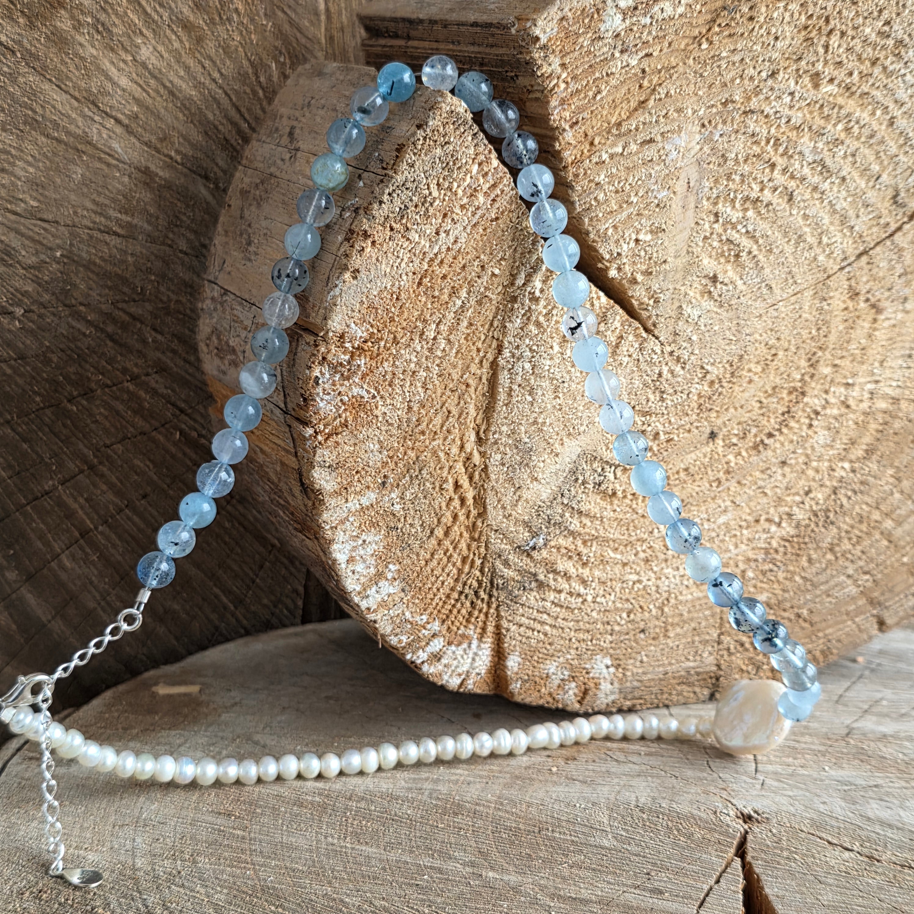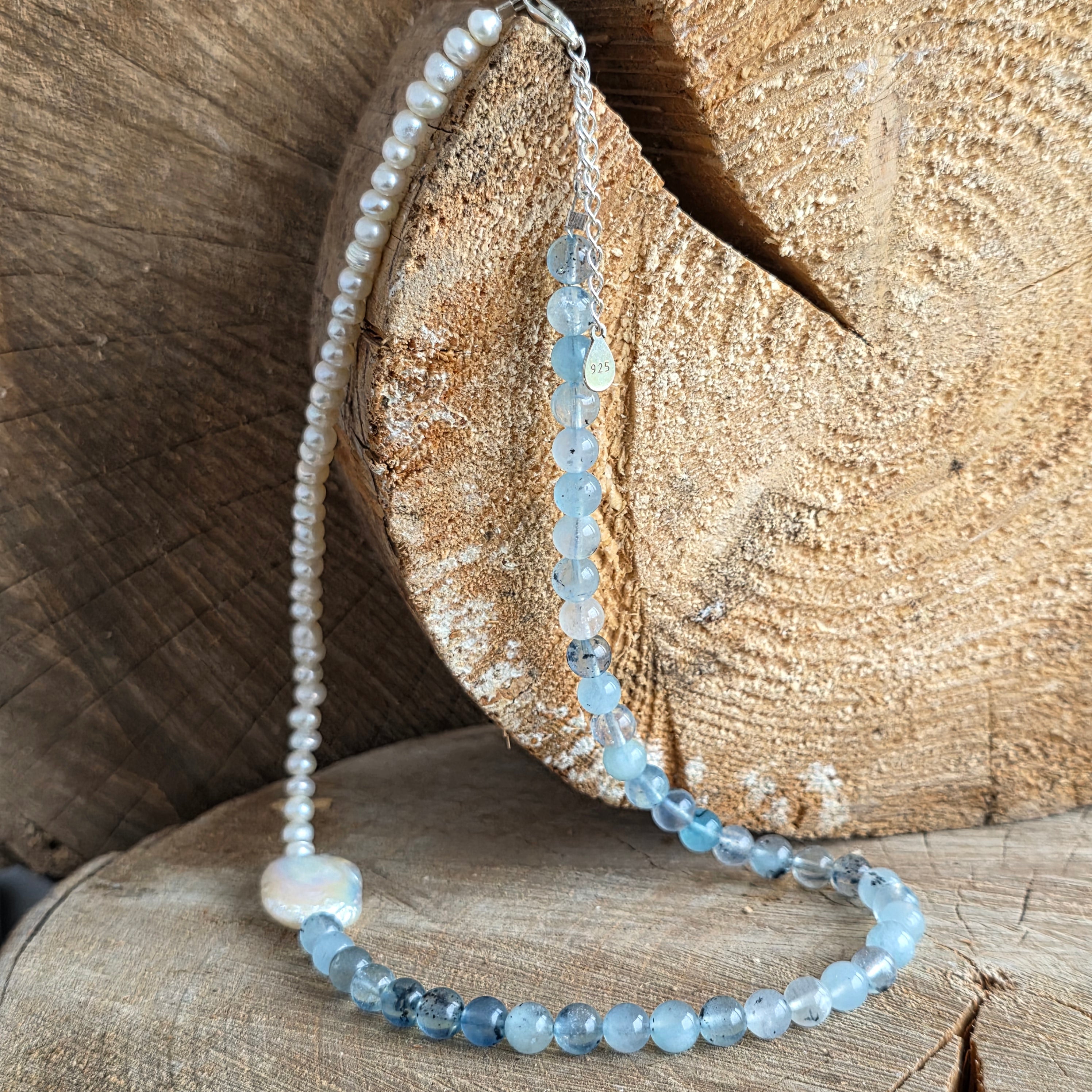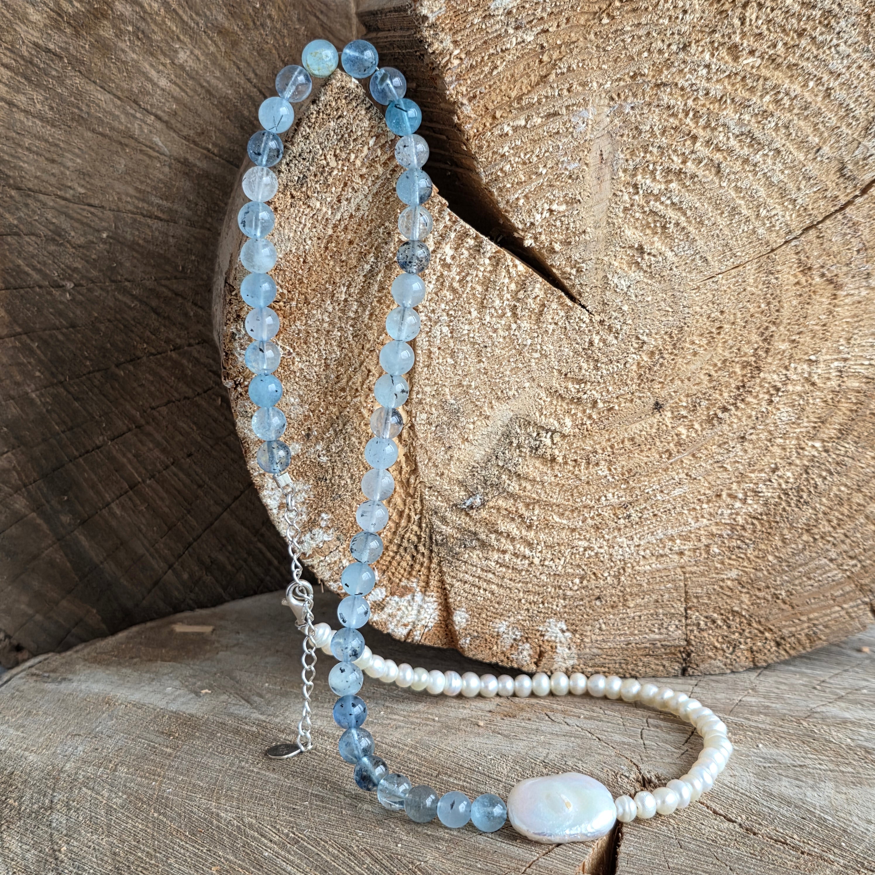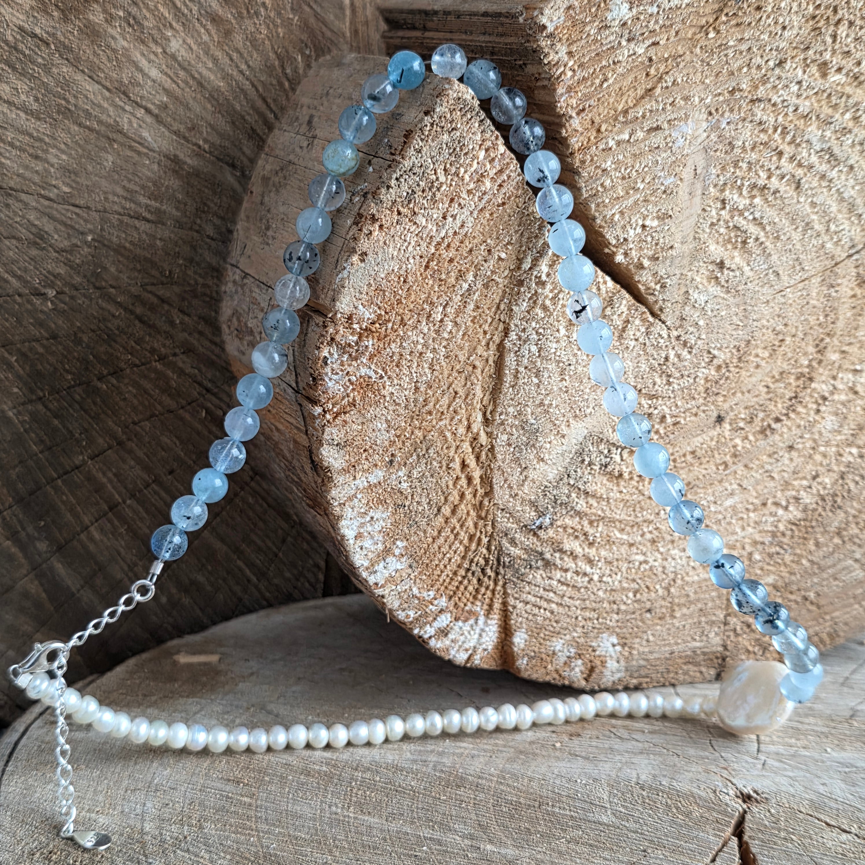 Realizado con aguamarina natural de 6 mm, con tonalidades suaves de azul pálido y transparencias finas que recuerdan las profundidades cristalinas del océano, el collar se complementa con perlas naturales, seleccionadas por su brillo sutil y su refinamiento atemporal.