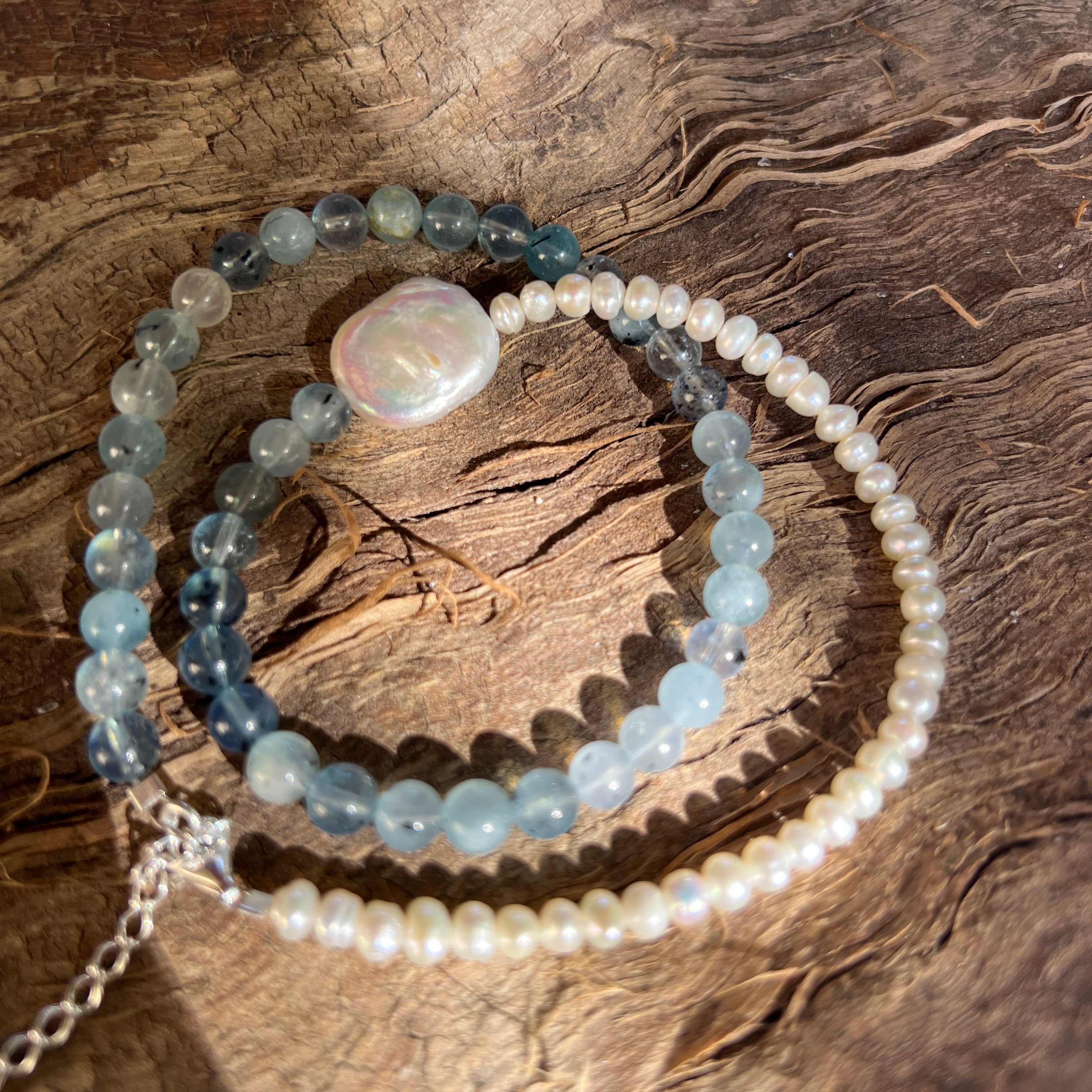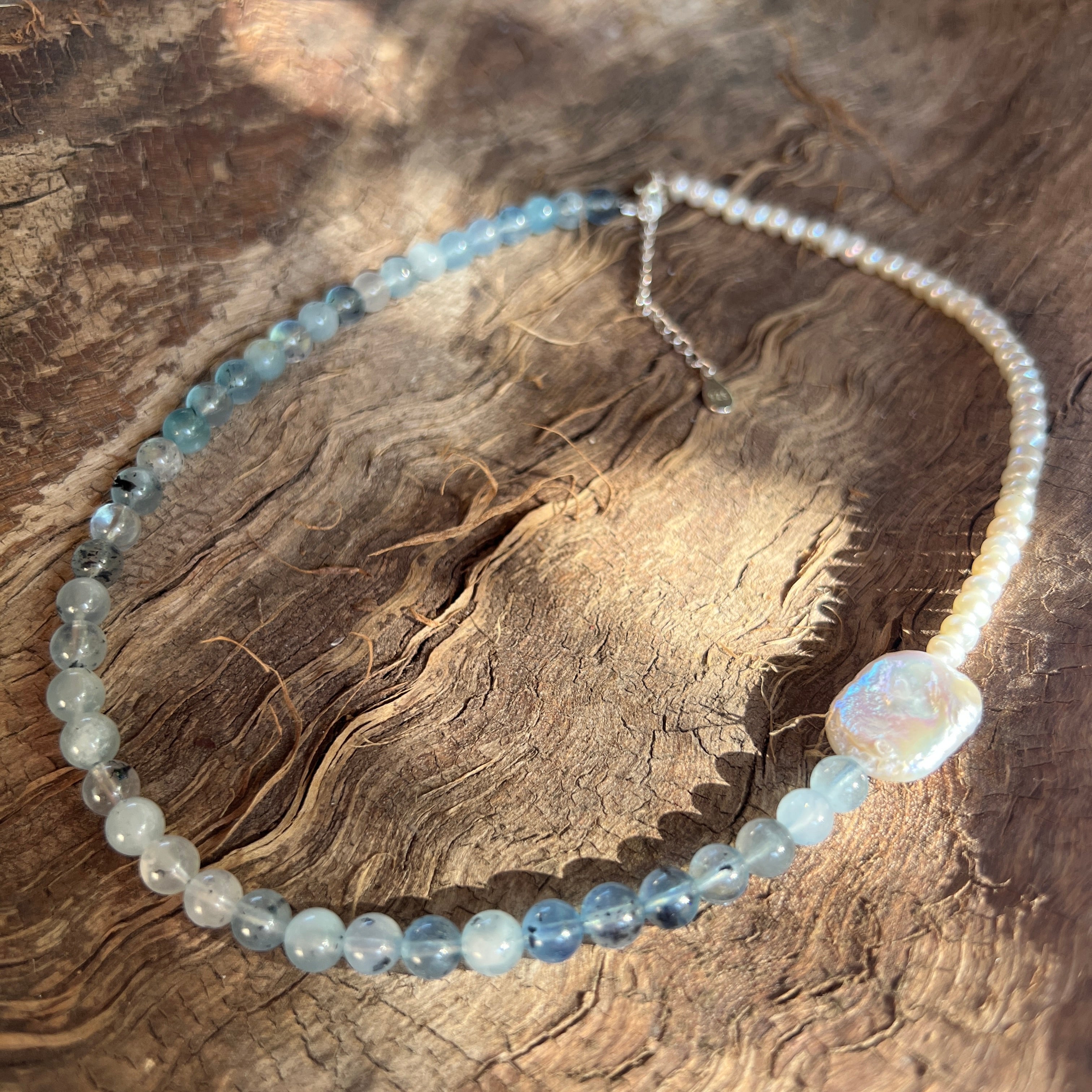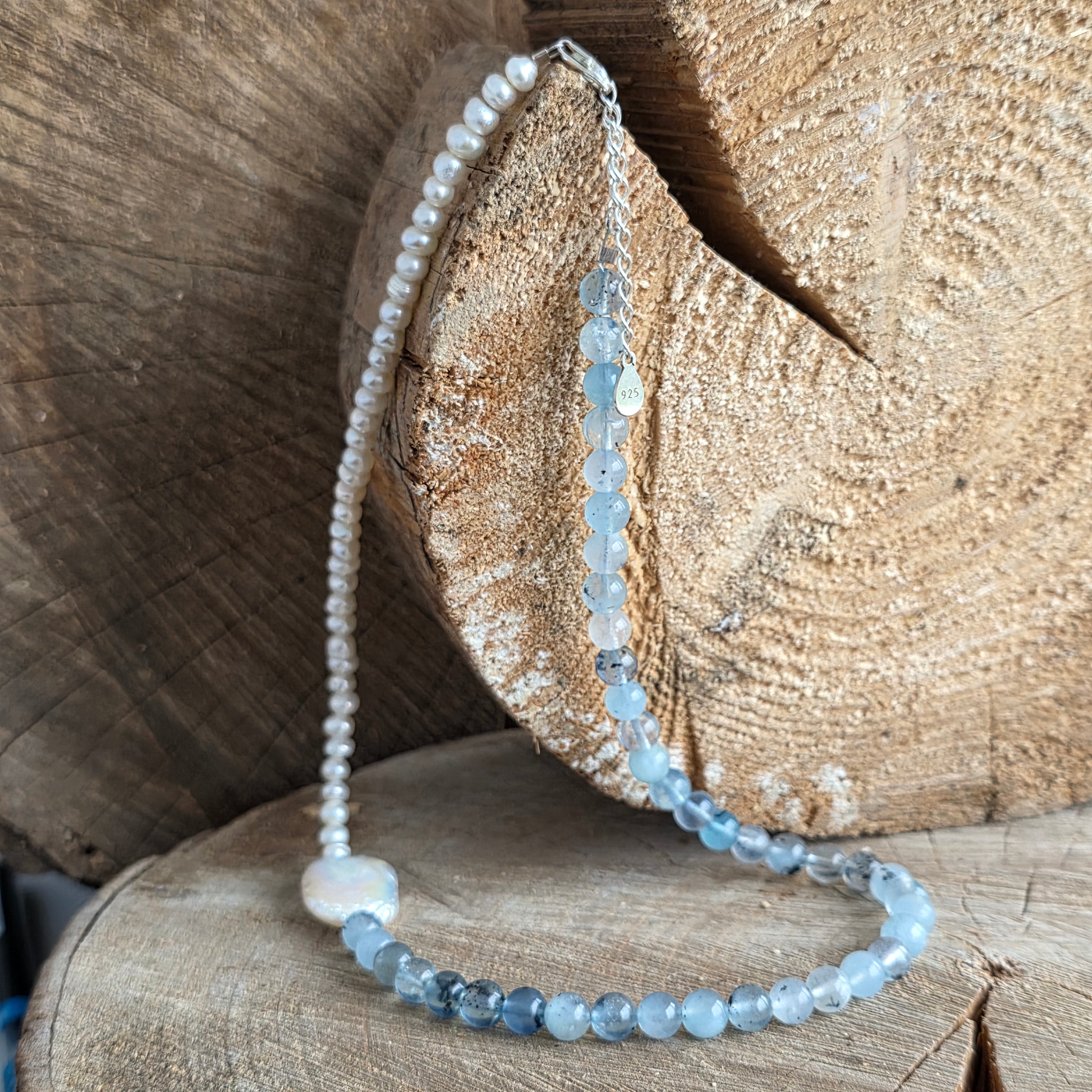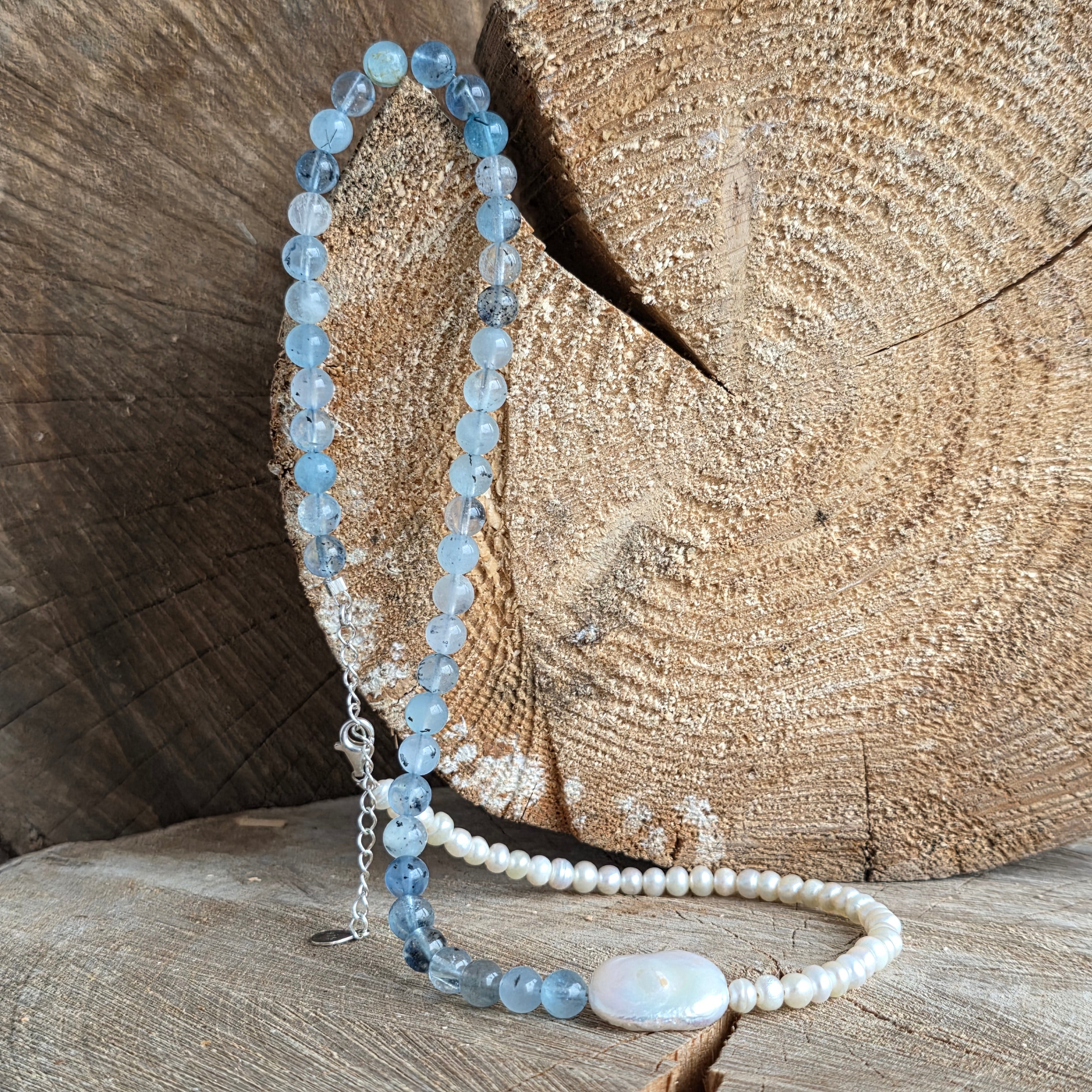 Realizado con aguamarina natural de 6 mm, con tonalidades suaves de azul pálido y transparencias finas que recuerdan las profundidades cristalinas del océano, el collar se complementa con perlas naturales, seleccionadas por su brillo sutil y su refinamiento atemporal.