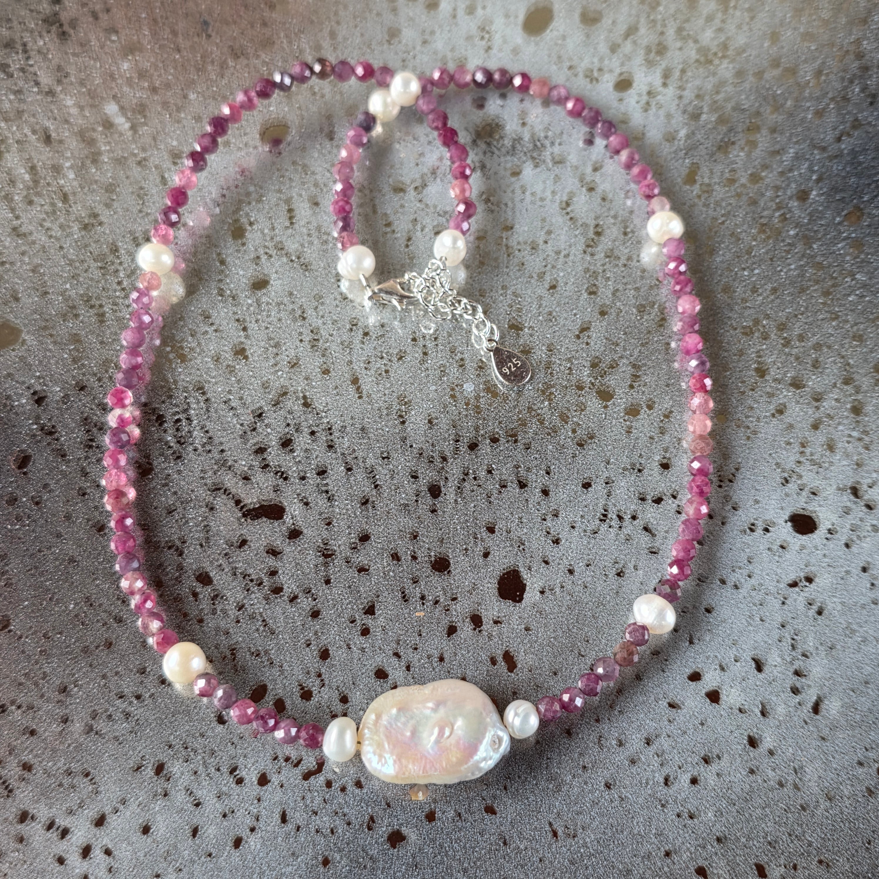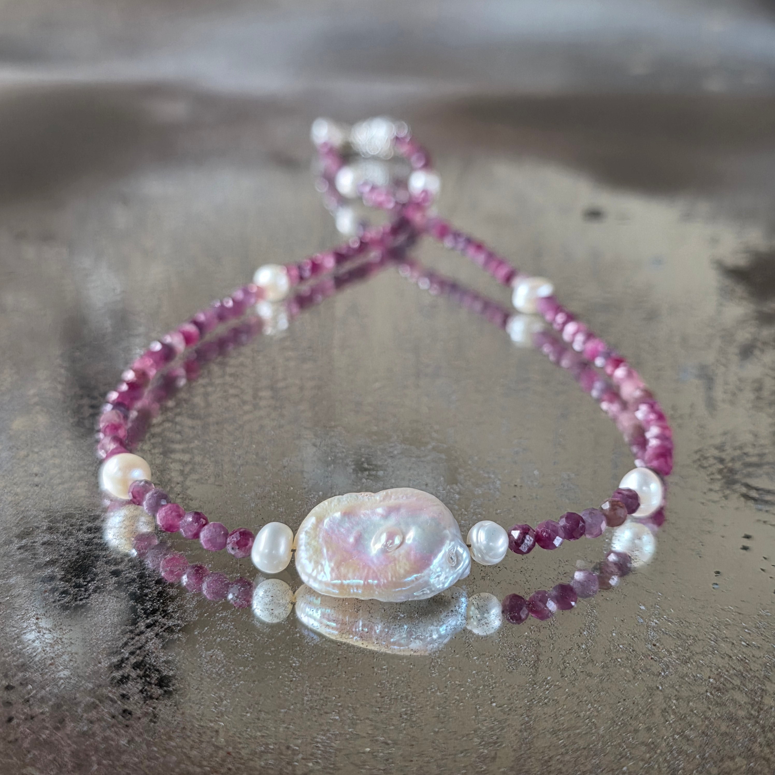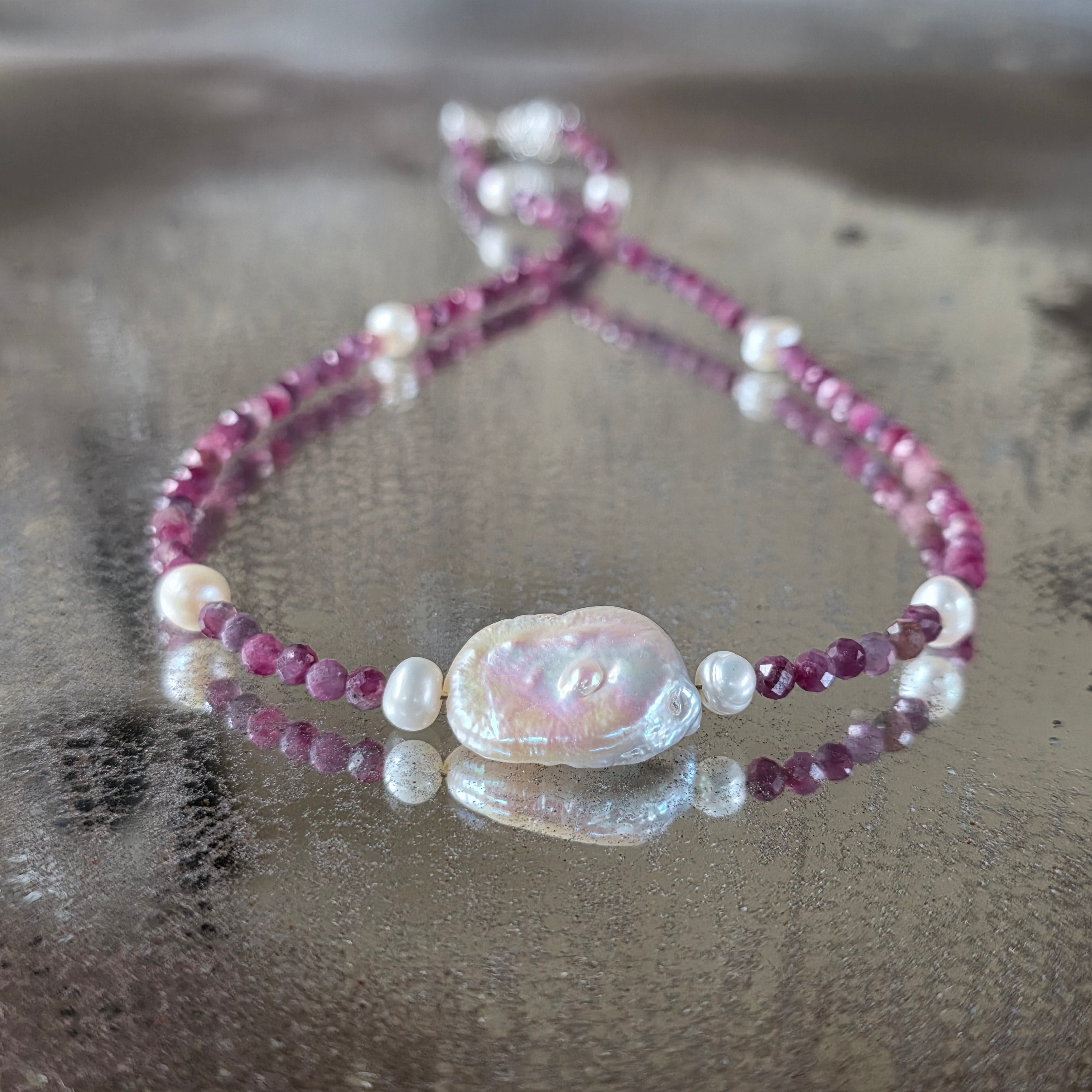 Materiales: rubí facetado de 3 mm, perla natural plana ovalada (central), perlas redondas de 4 mm, plata 925