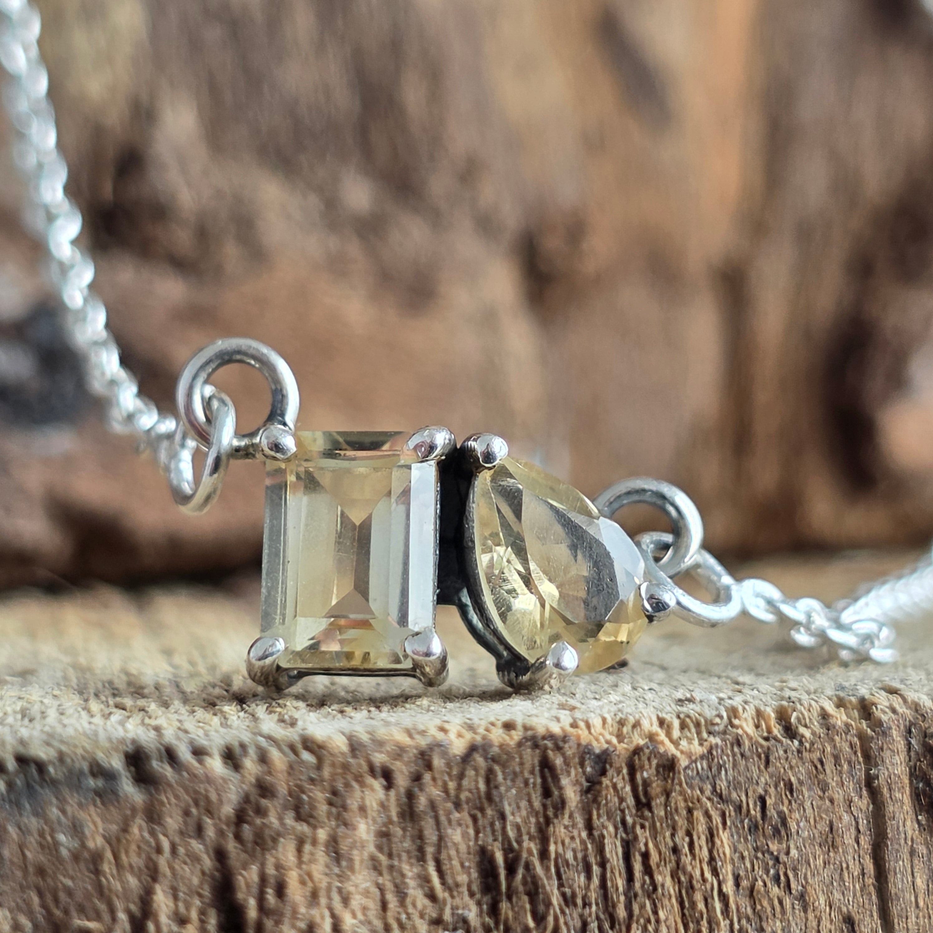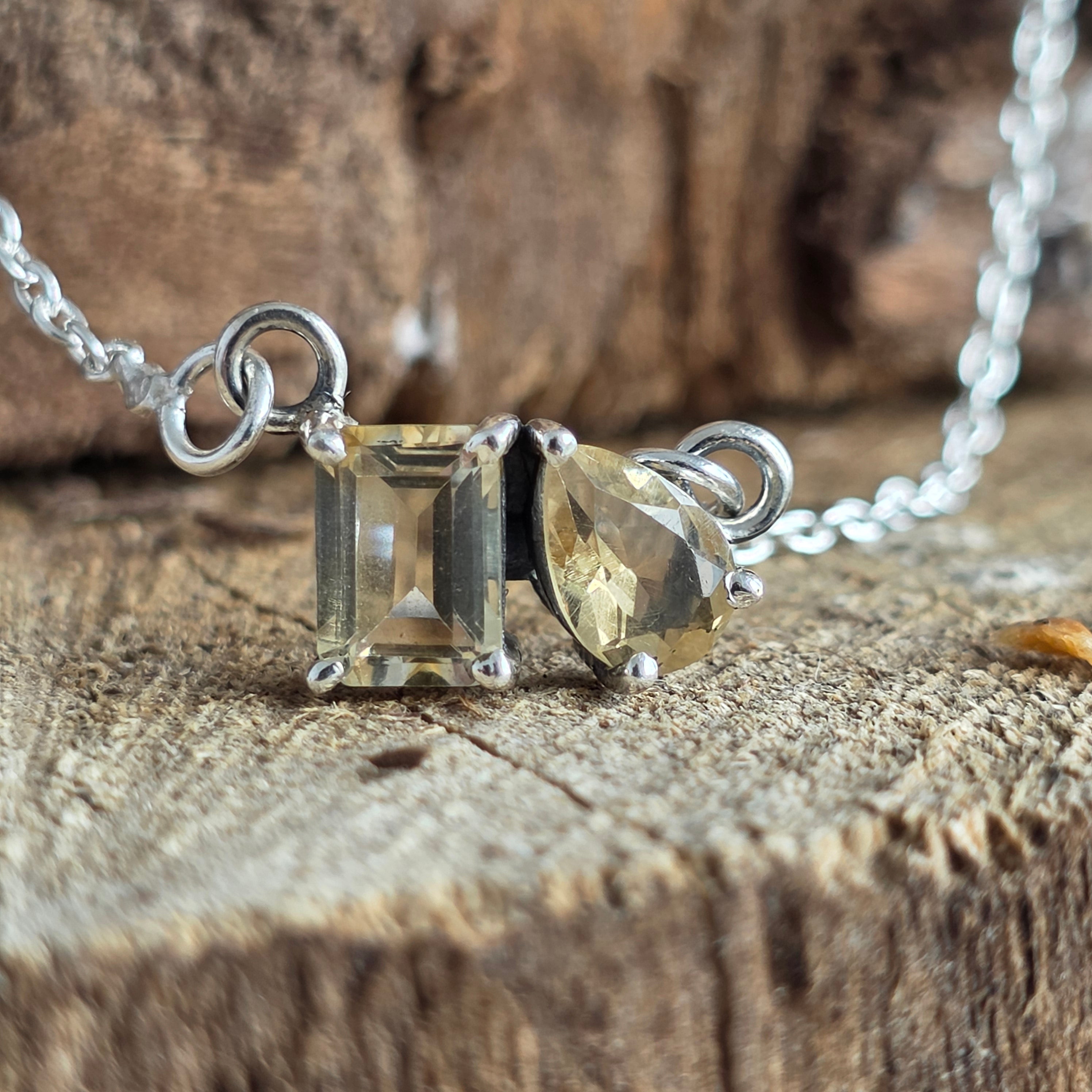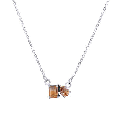 Un delicado collar de plata 925, decorado con dos piedras de citrino natural, una de forma rectangular y la otra en forma de pera, que juntas crean una composición luminosa y equilibrada.