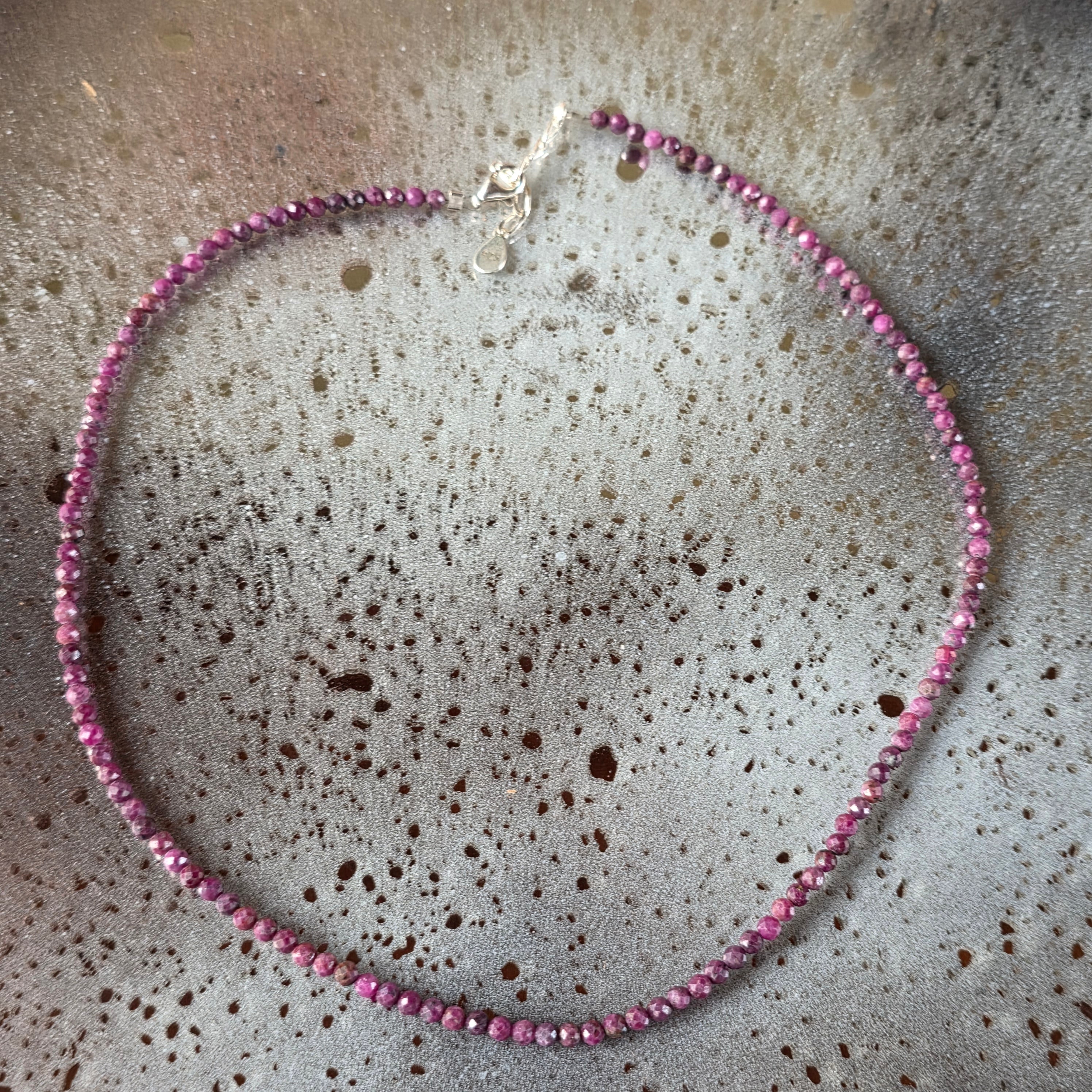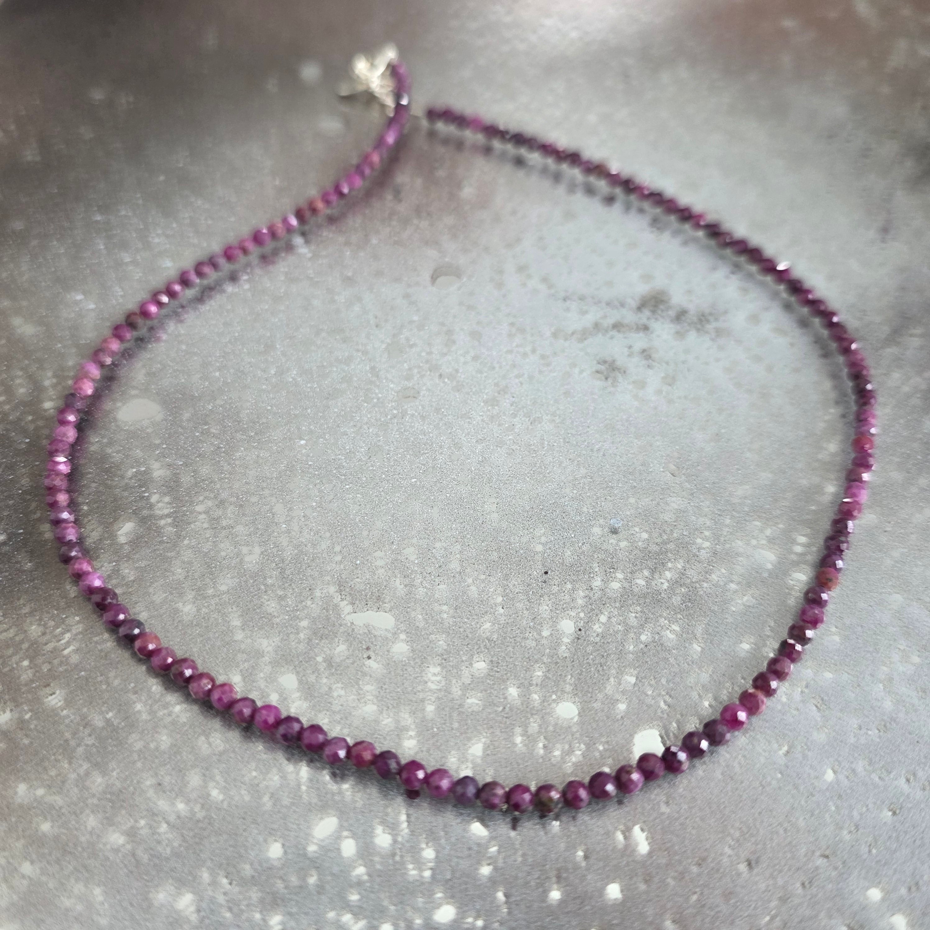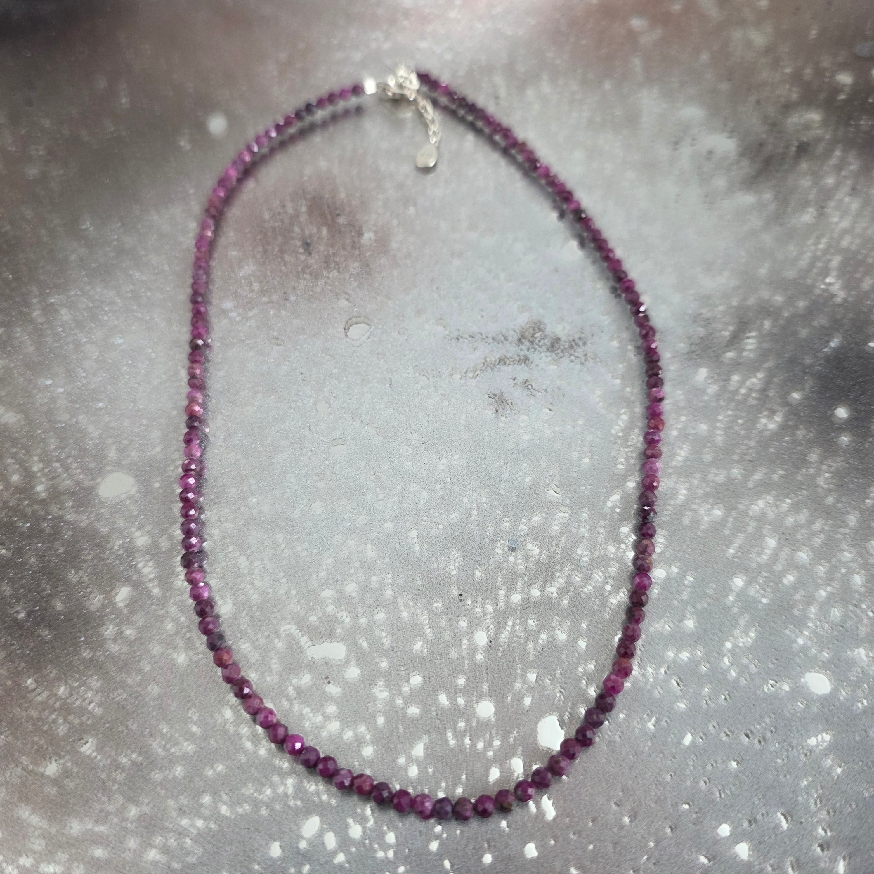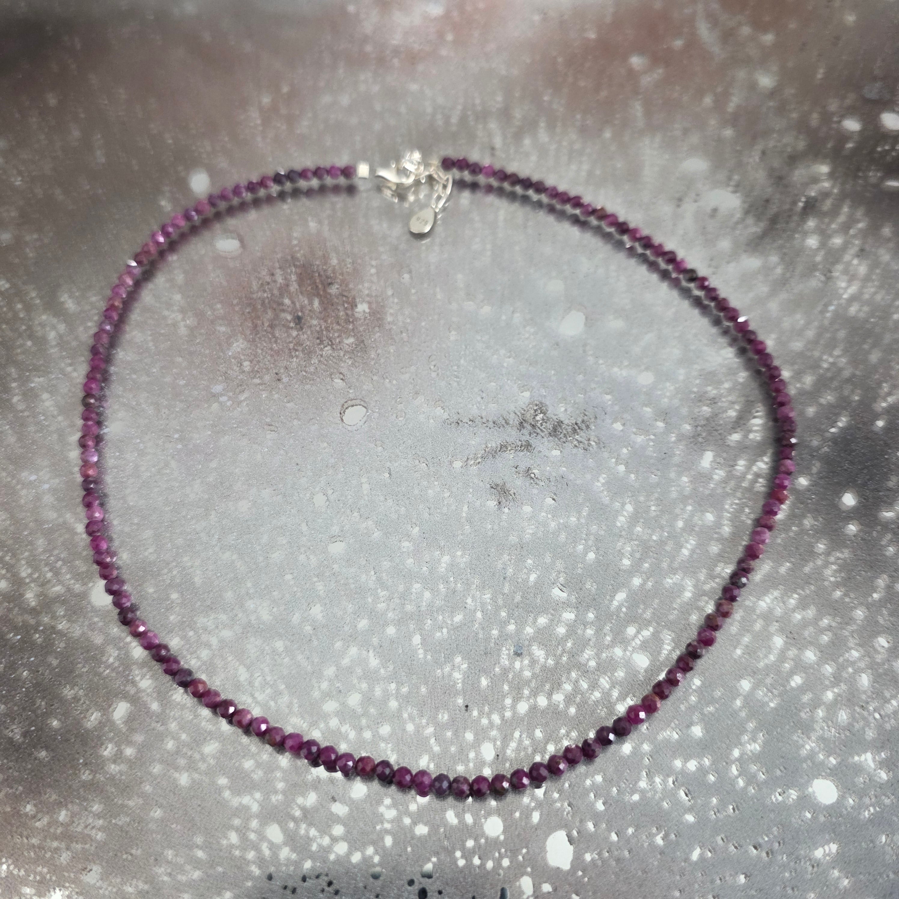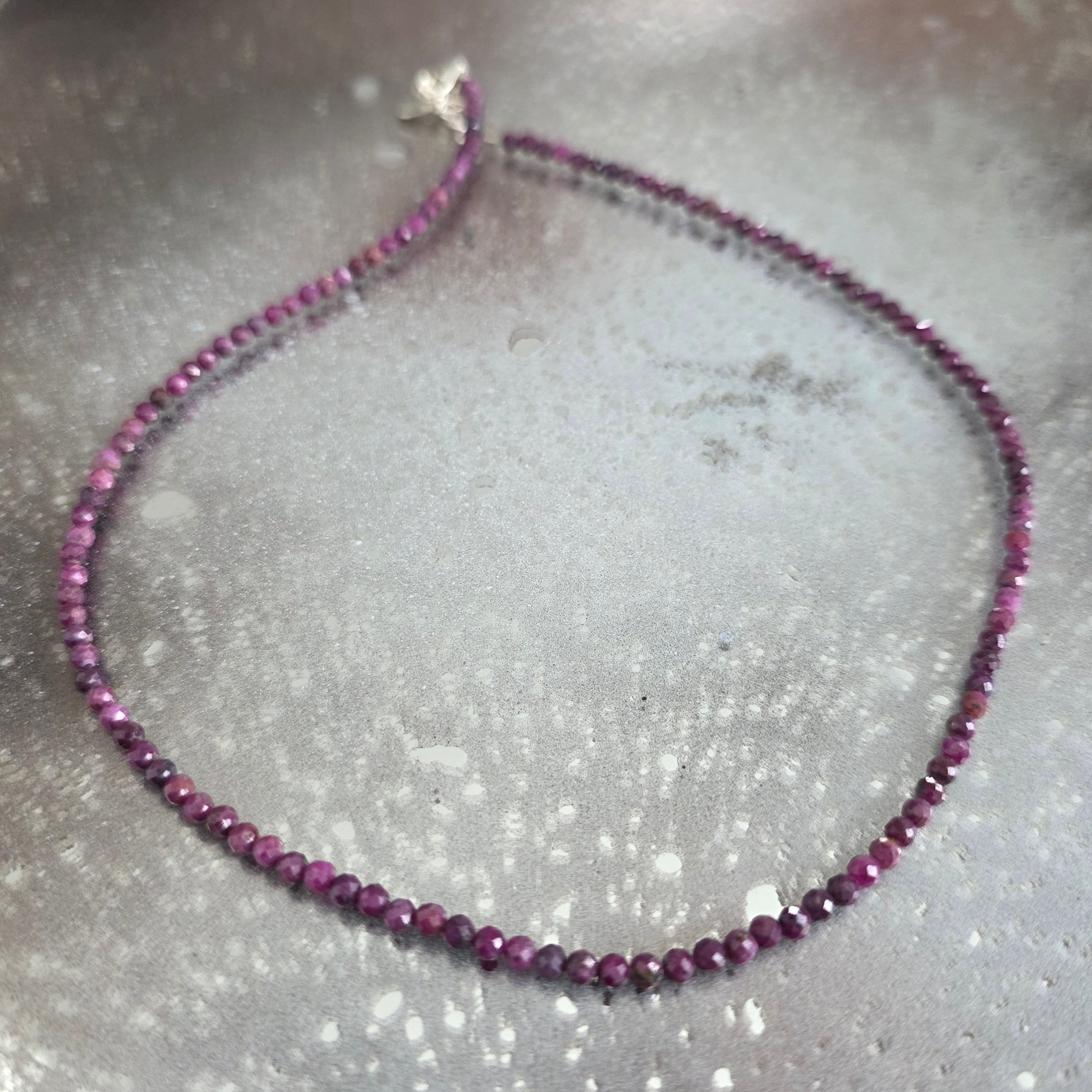 Un collar fino, pero con presencia, realizado con esferas facetadas de rubí natural de 3 mmen un tono profundo de cereza intensocon reflejos cálidos y casi reales. Cada pequeña perla silenciosa refleja la luz discretamente, como un susurro de pasión, de intención y de nobleza interior.