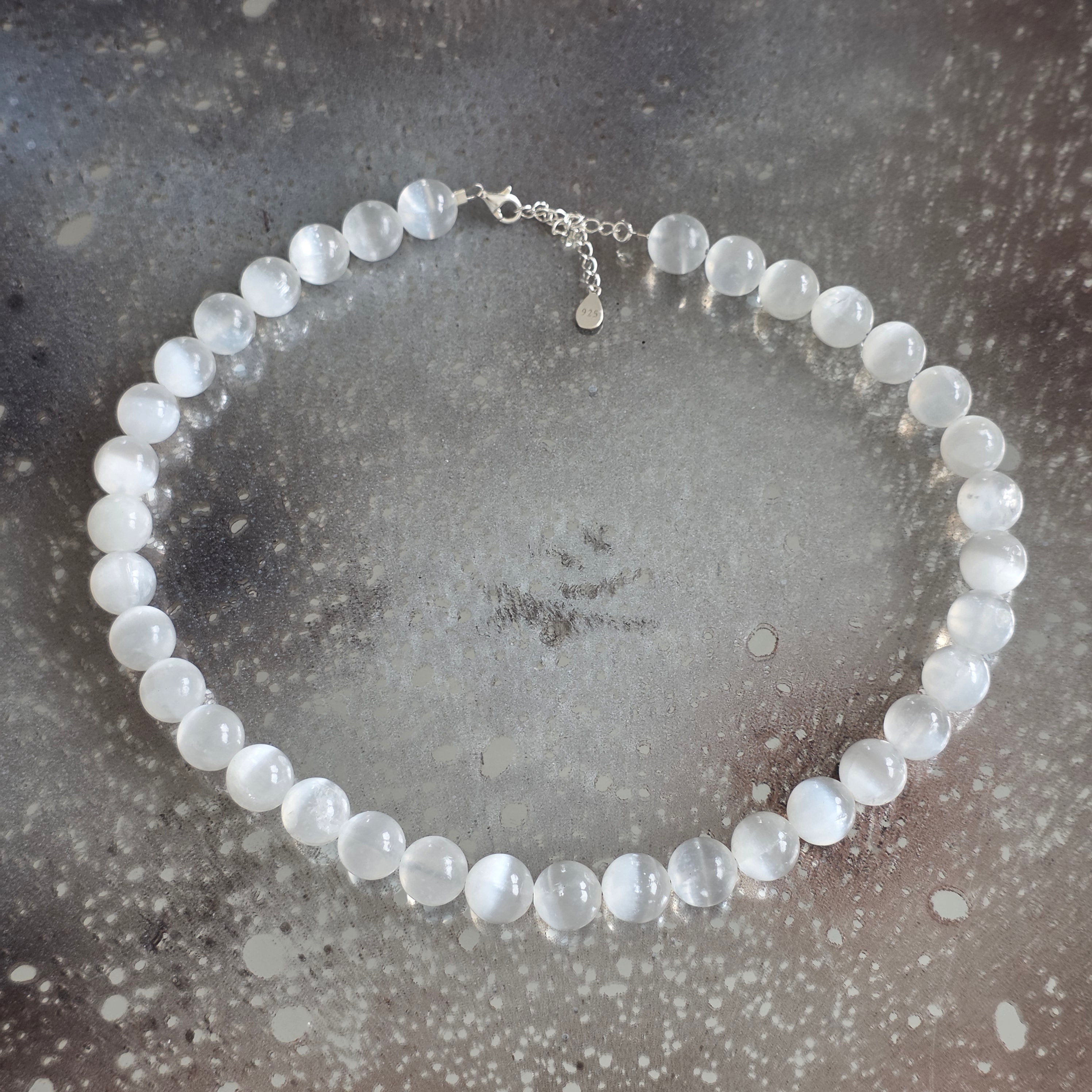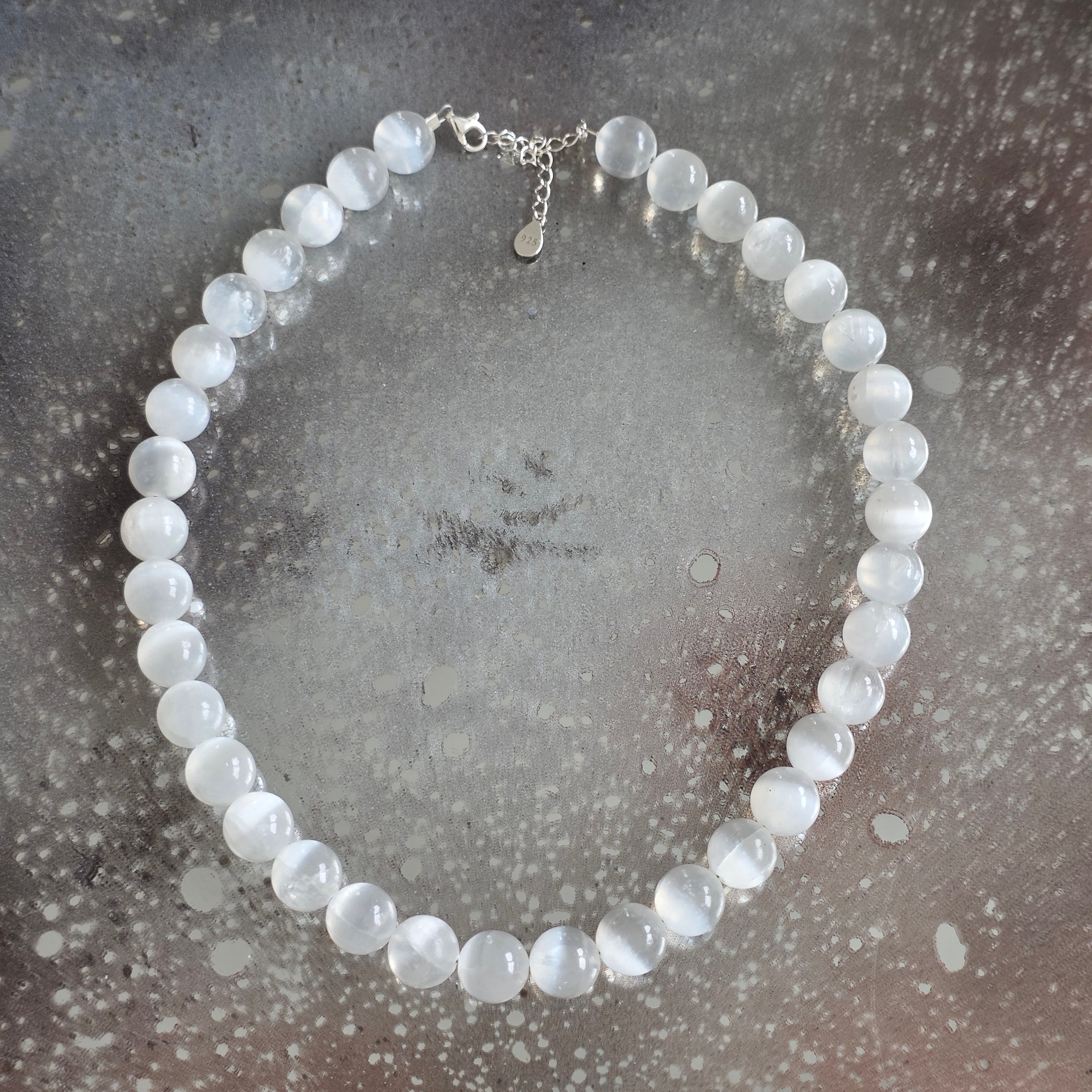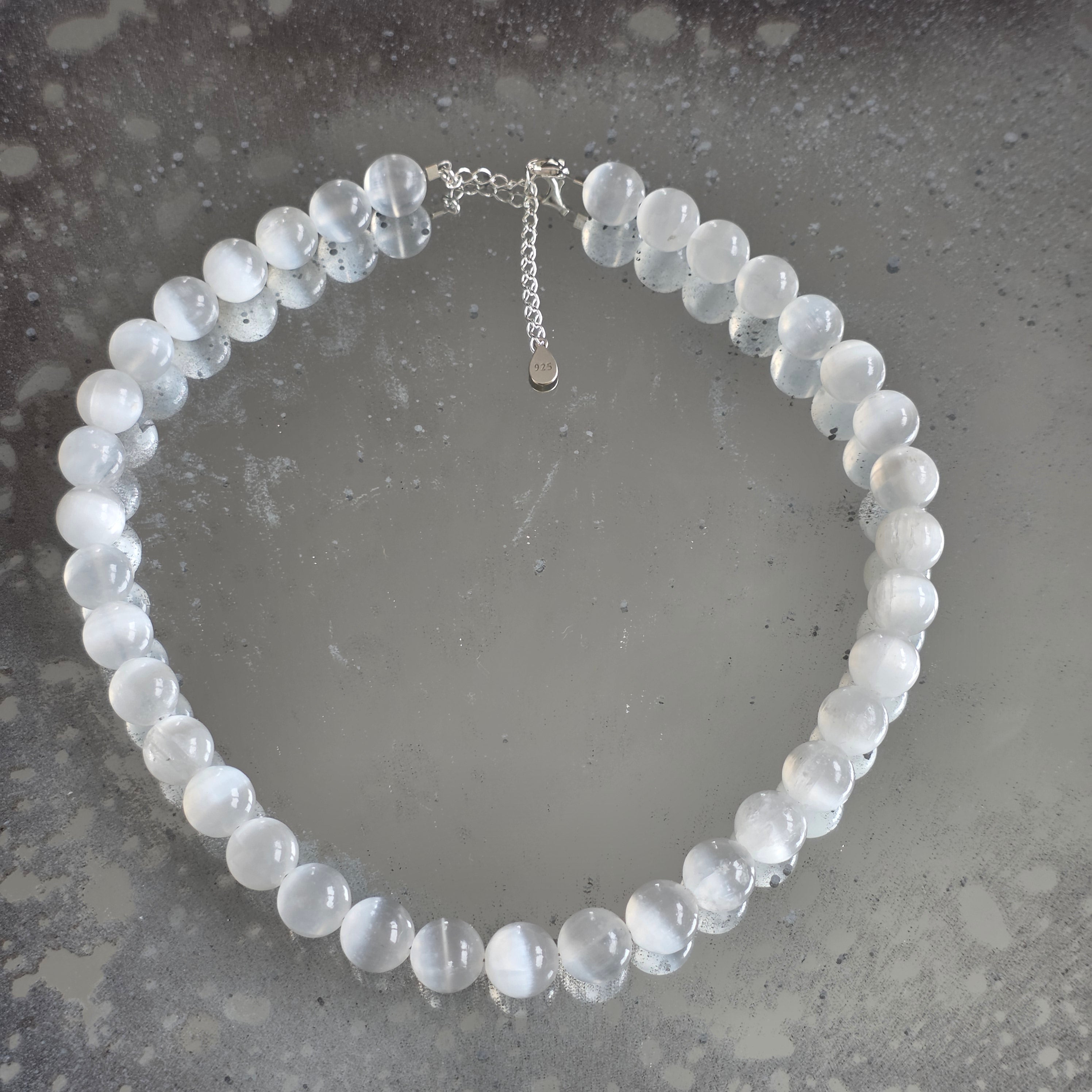 Un collar como un rayo descendido sobre la materia – compuesto por esferas perfectamente esféricas de selenita natural de 10 mm, cada una llevando en sí la claridad de una mañana blanca y silenciosa. La superficie aterciopelada y translúcida refleja la luz con una suavidad casi irreal, como si respirara calma.
