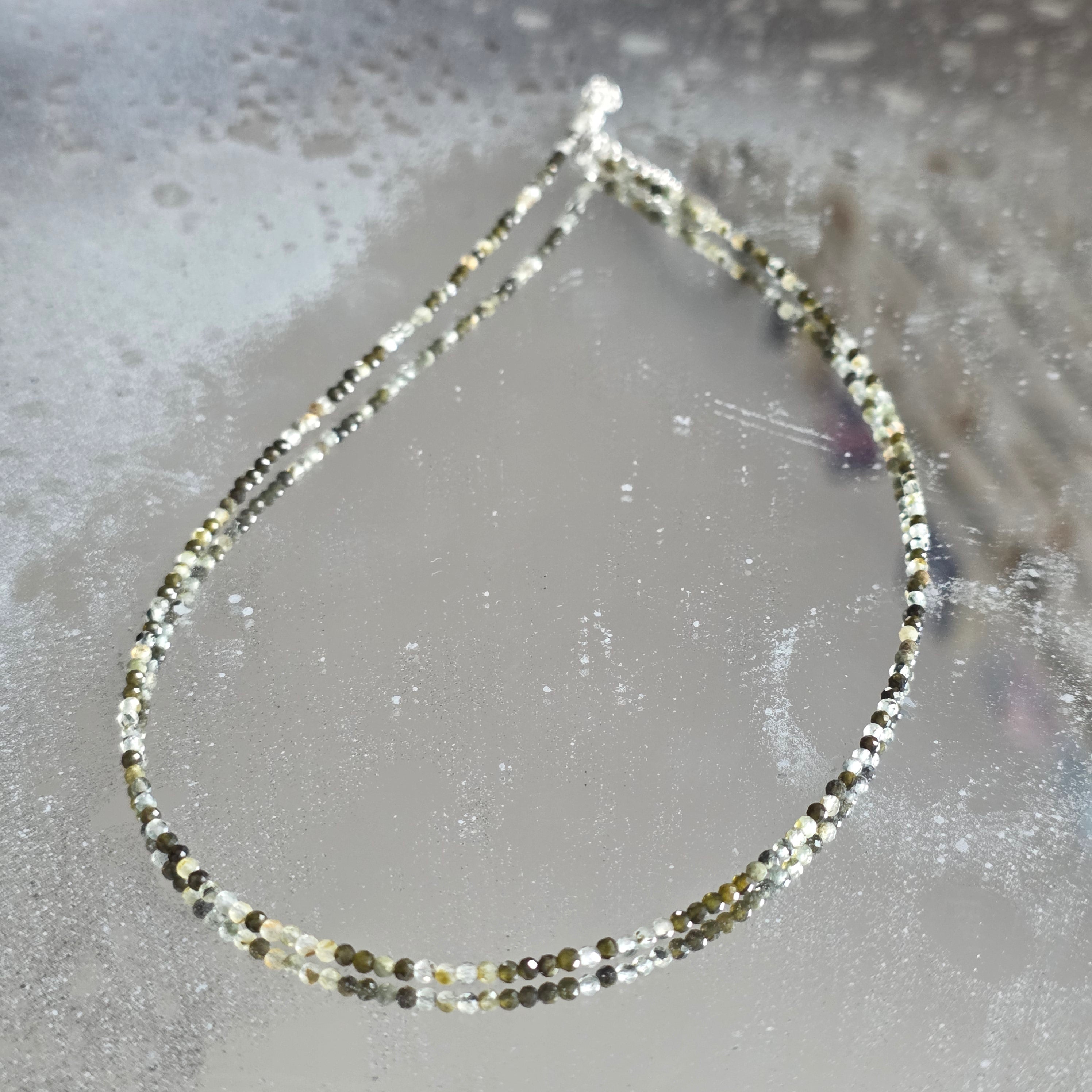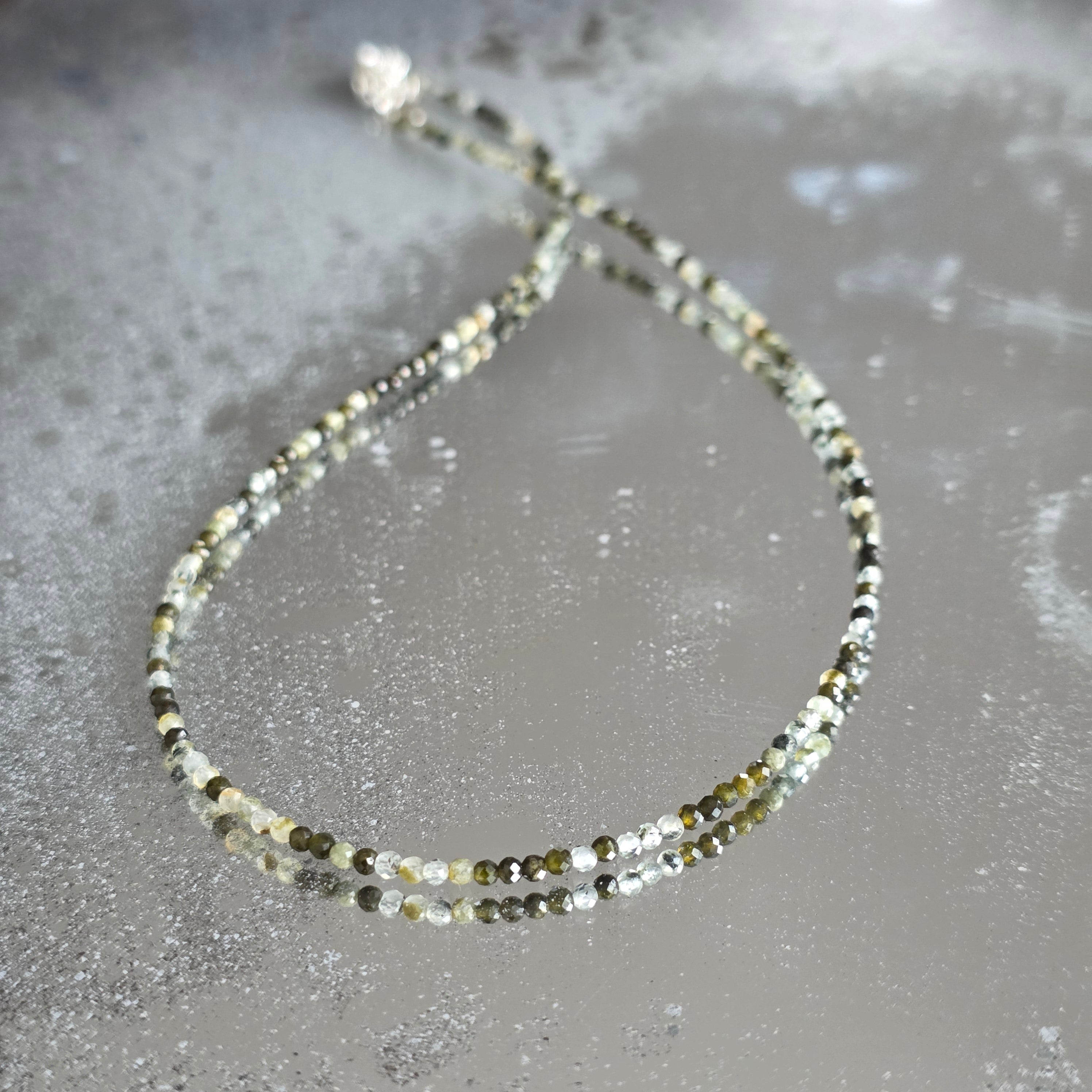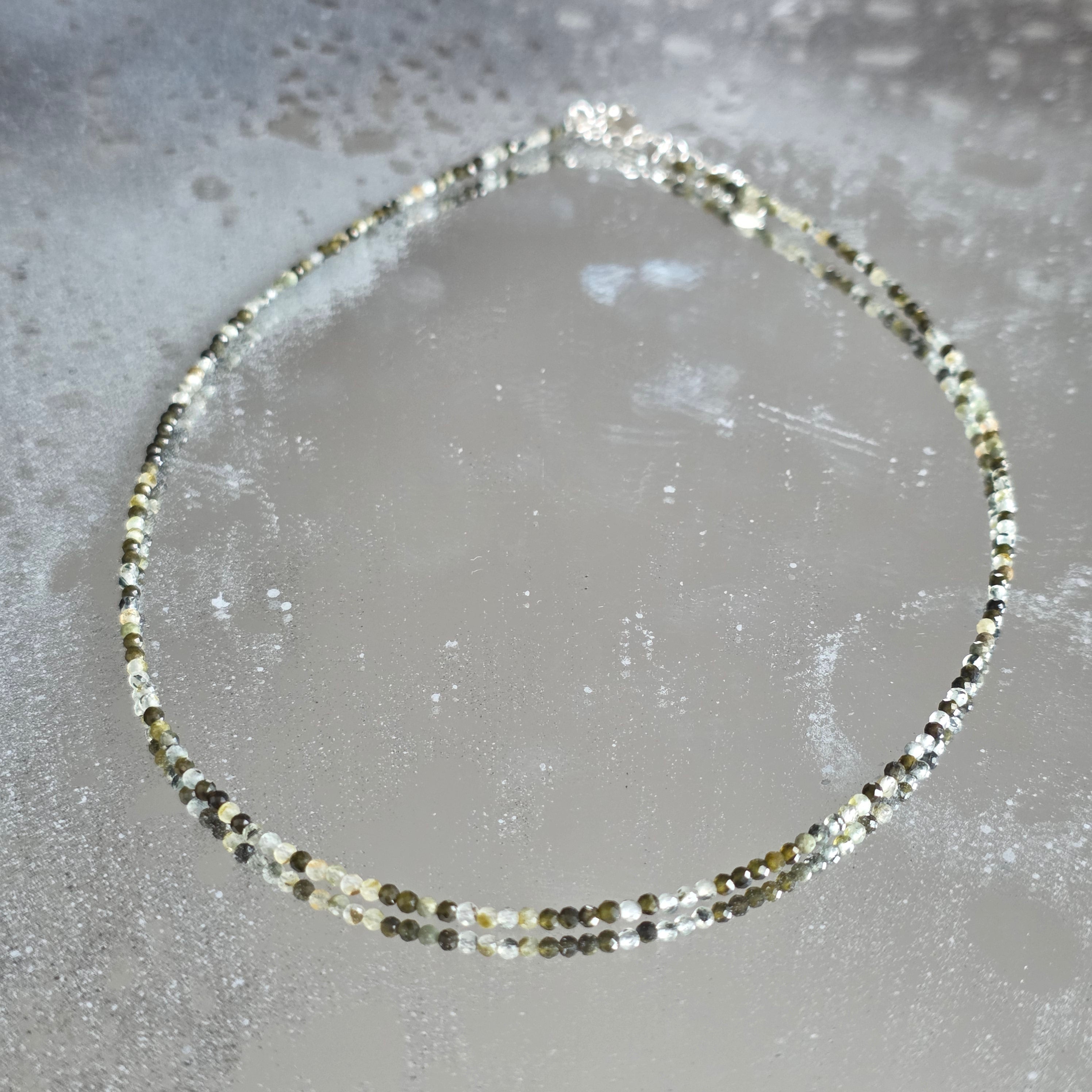 Un collar que combina la fuerza con la belleza de la diversidad. Turmalina natural facetada de 2mm revela una sinfonía de colores terrosos y pasteles, como un jardín otoñal atrapado por la luz. Sus finas facetas reflejan sutilmente cada tono, dando al collar un aire de sofisticación y vitalidad.