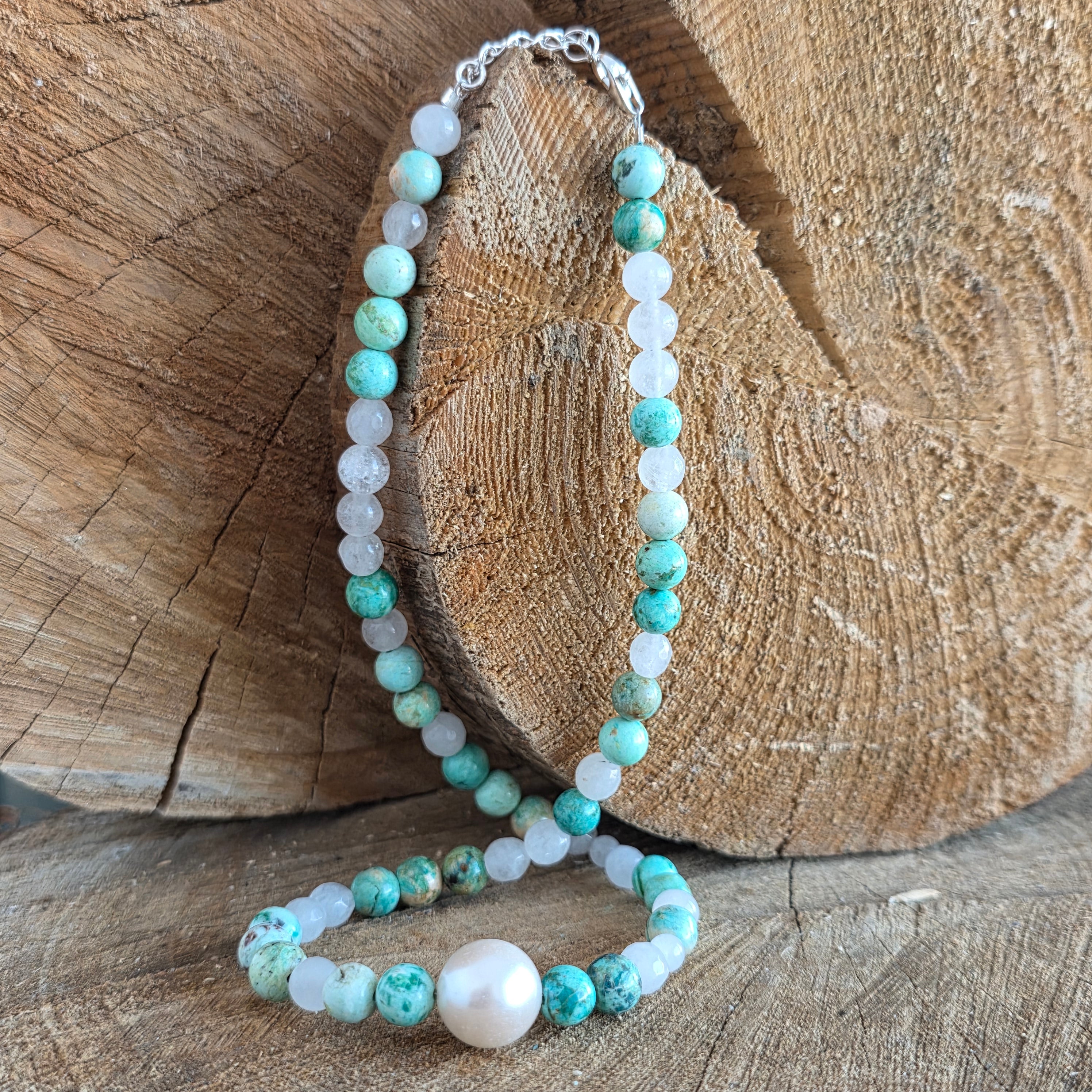 El elemento central es una perla natural con un diámetro de aproximadamente 1 cm, que le da al collar un acento delicado y refinado. El contraste entre la textura suave de la perla y los colores de las piedras semipreciosas crea una joya con un aire equilibrado, adecuada tanto para el uso diario como para ocasiones especiales.