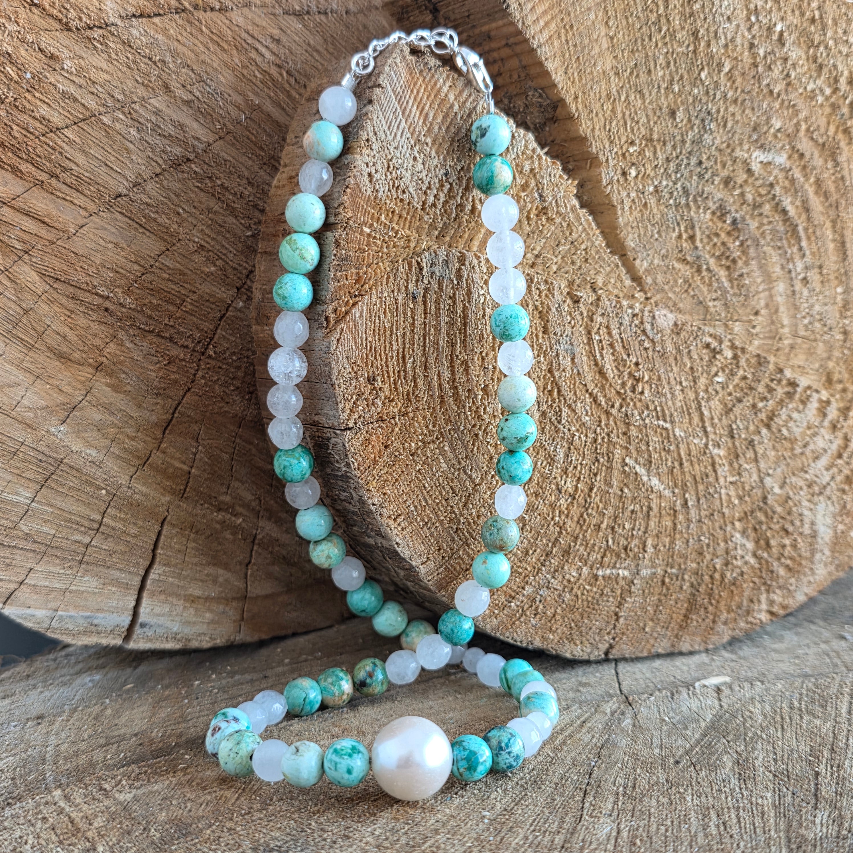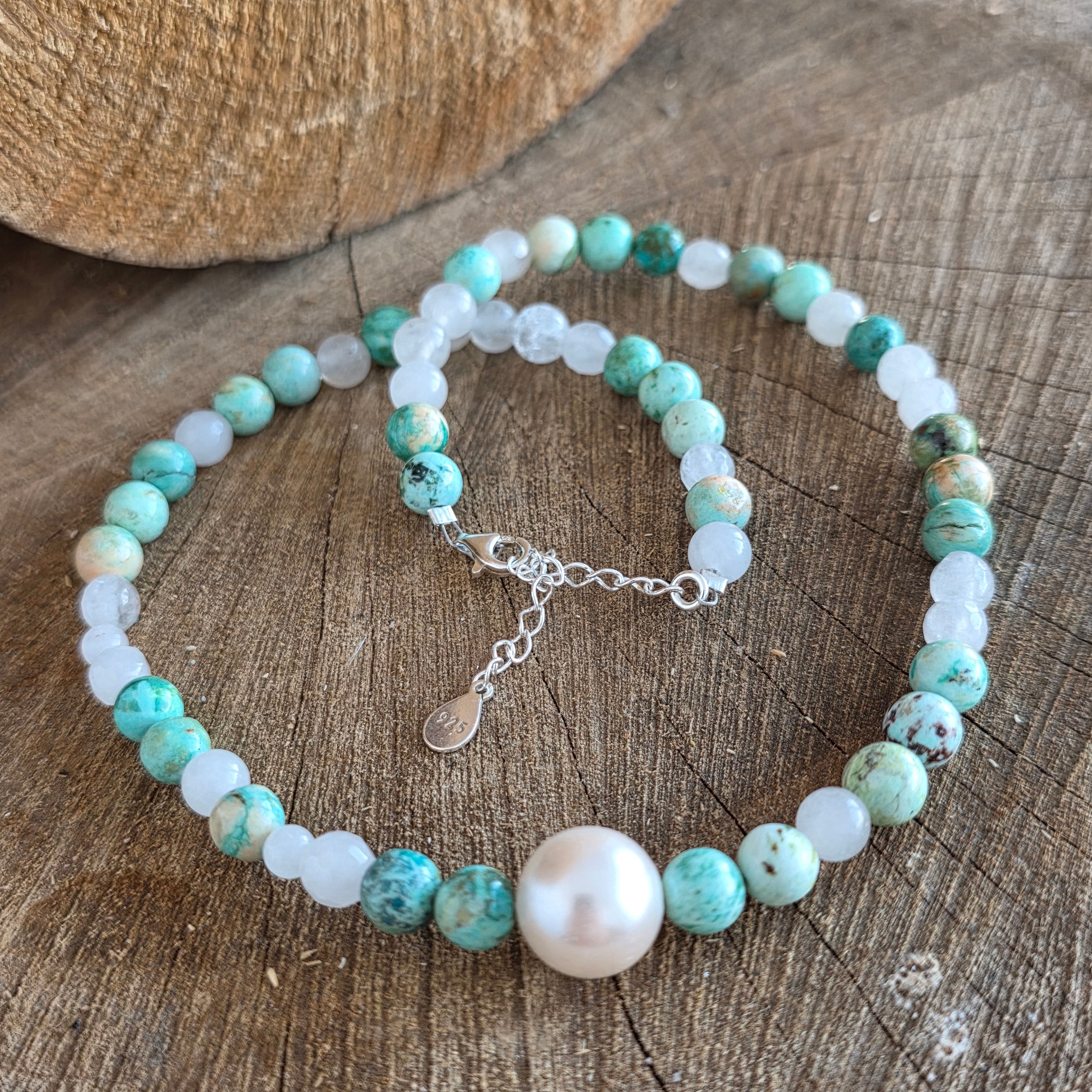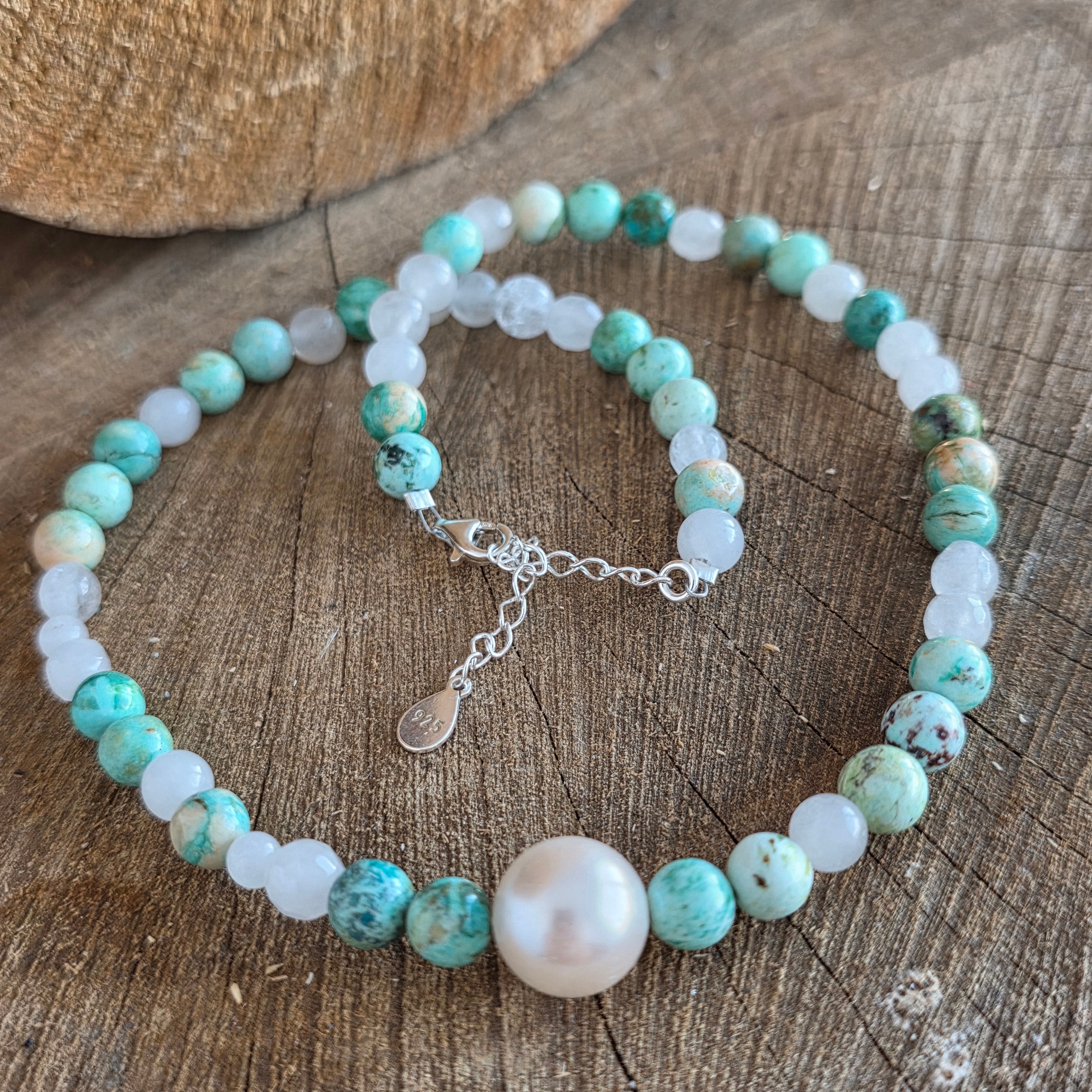 Materiales: turquesa natural 6 mm, jade natural 5 mm, plata 925, una perla 1 cm