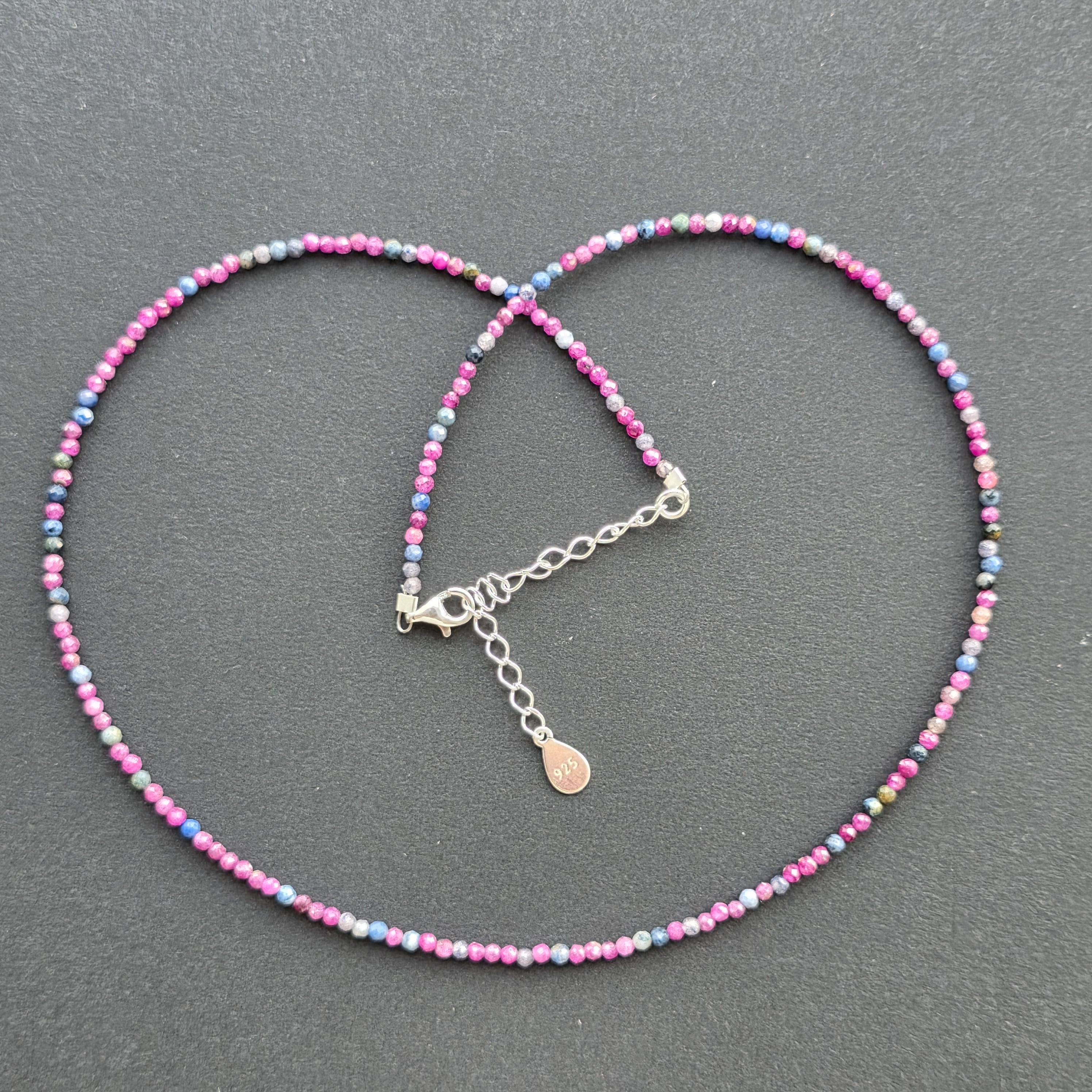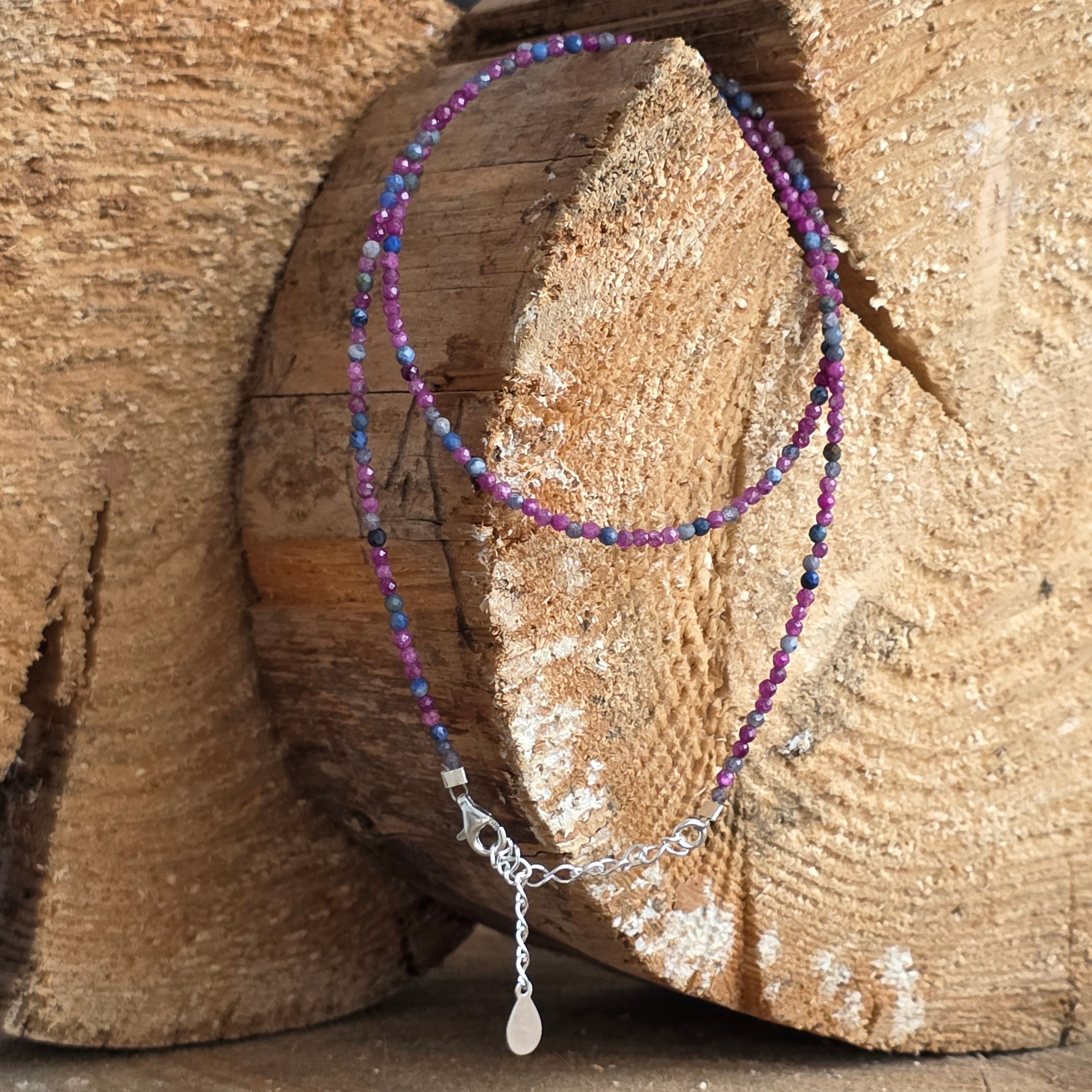 Un collar delicado, pero con una fuerza sutil, hecho de esferas facetadas de zafiro y rubí de 2,5 mm, entrelazadas en un juego armonioso de contrastes: el azul sabio del zafiro y el rojo pasional del rubí. Las dos piedras preciosas se alternan discretamente, en una composición que habla de equilibrio, refinamiento y profundidad.