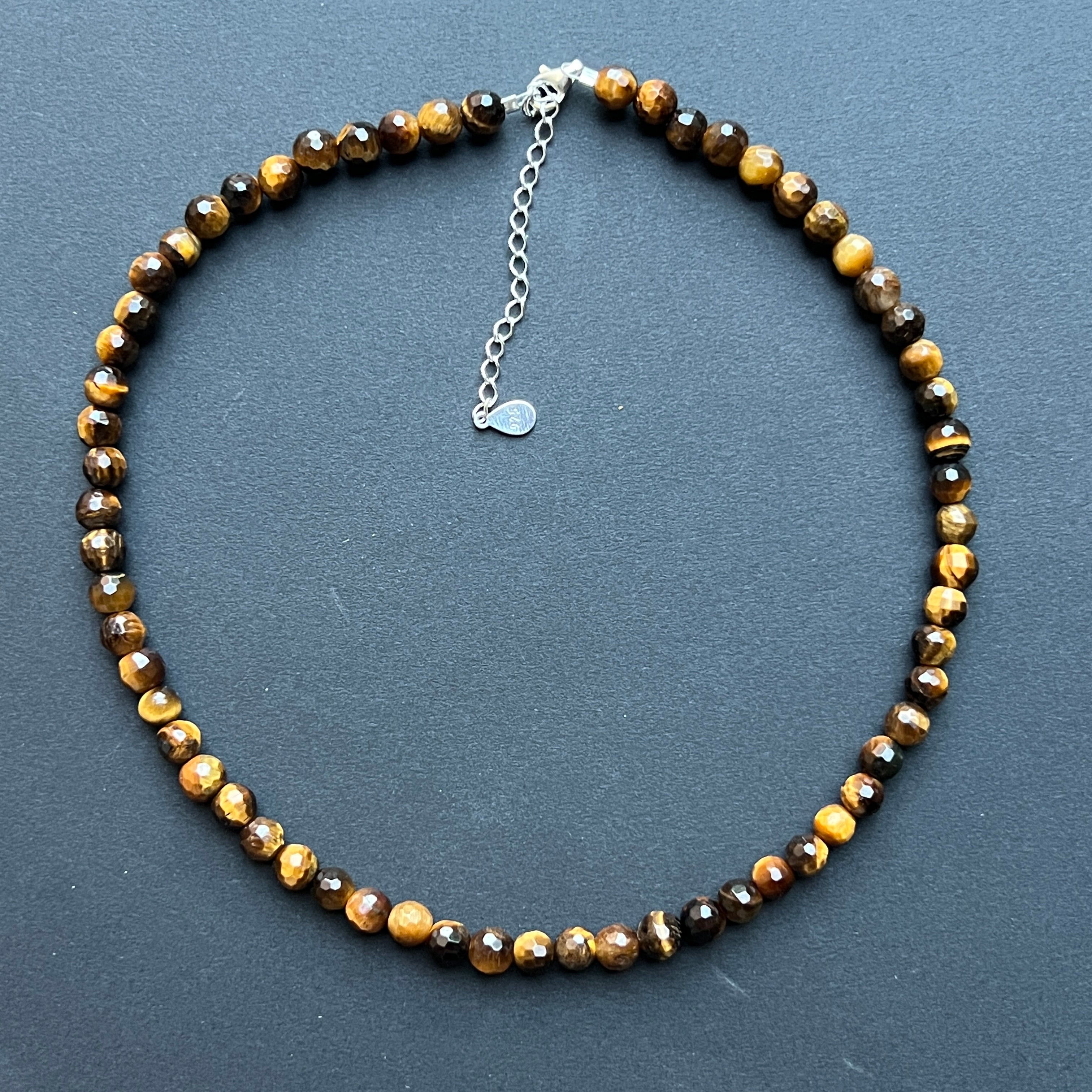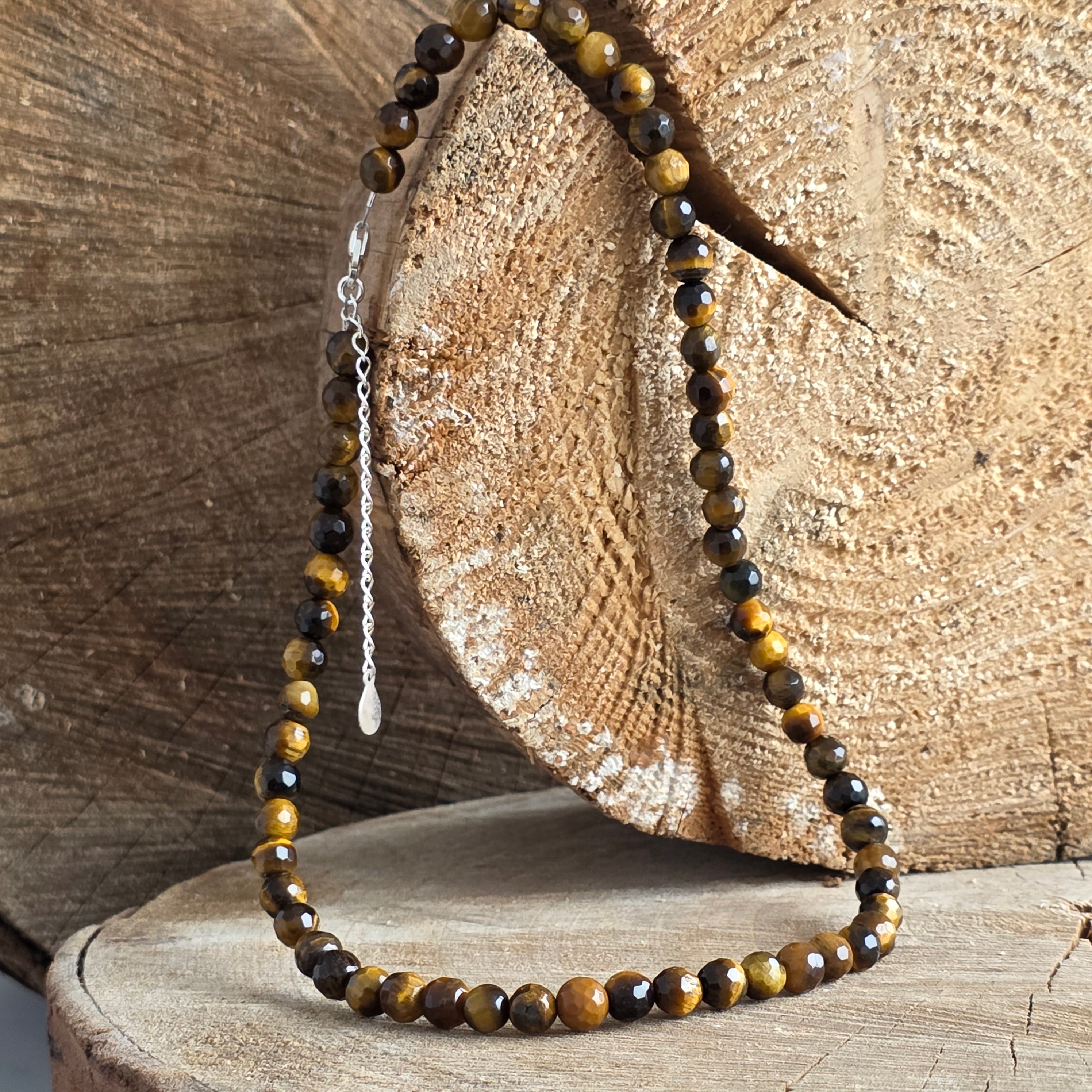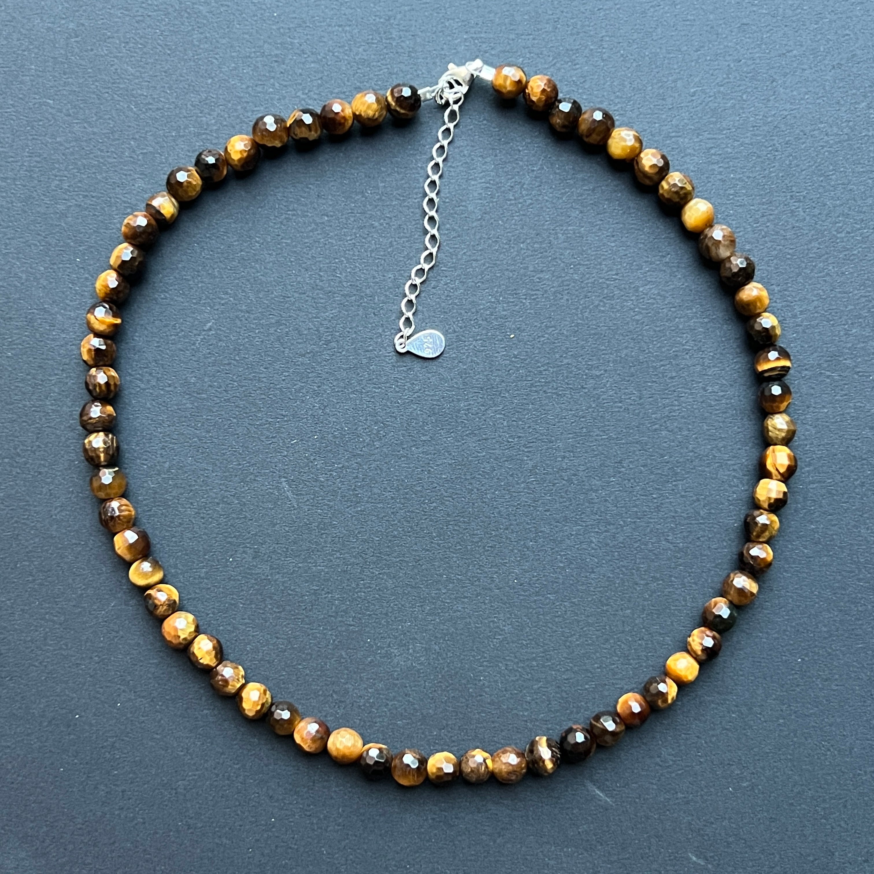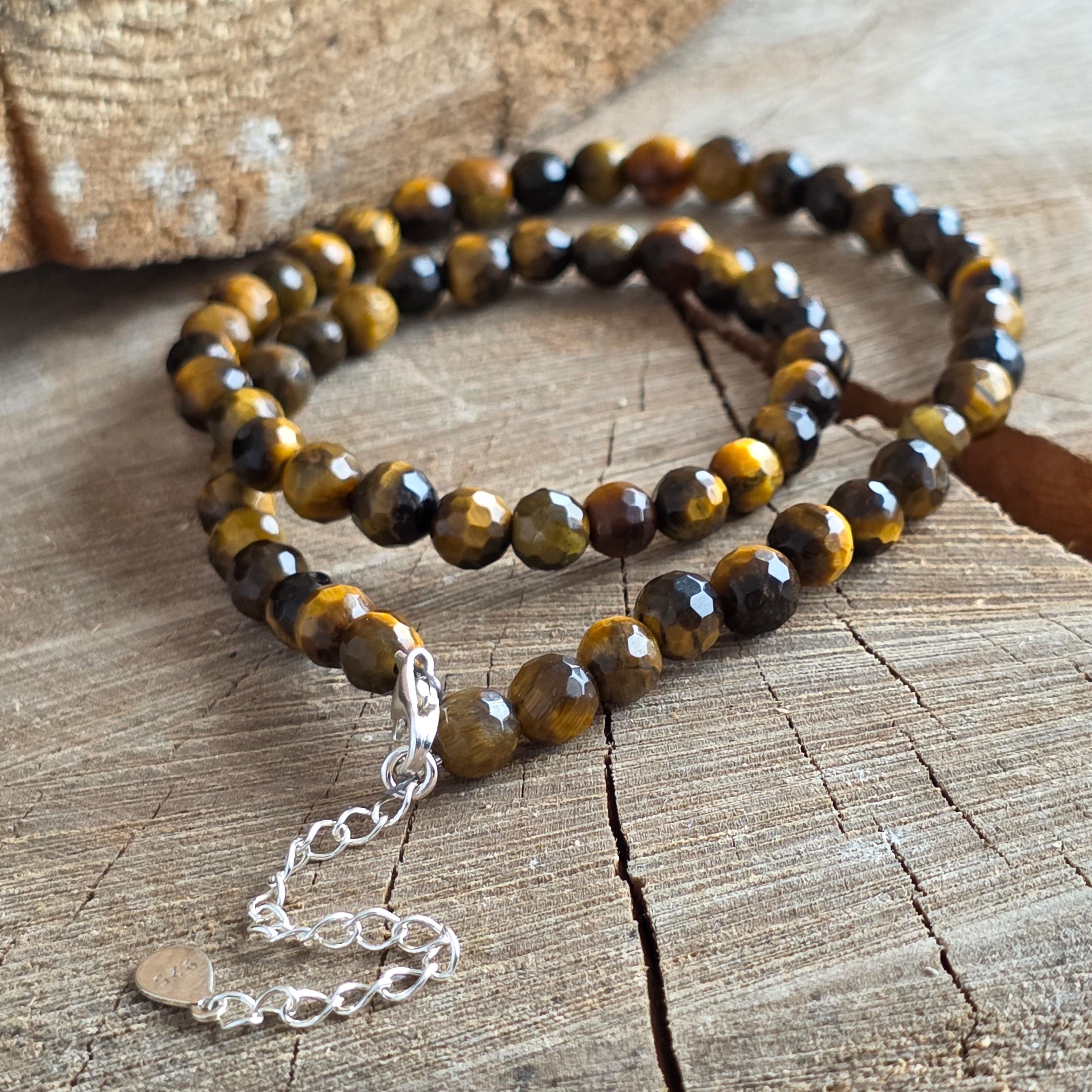 Una joya que vibra en tonos dorados y reflejos cobrizos, como rayos filtrados a través del espeso follaje de un bosque sagrado. Este collar de Ojo de Tigre facetado, con cuentas de 6 mm, revela un brillo sutil, como una promesa susurrada por la propia tierra.