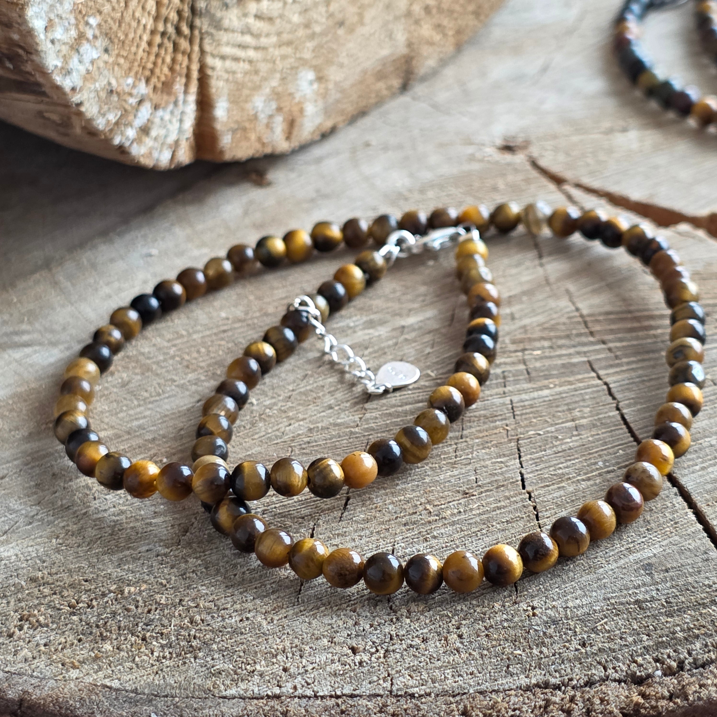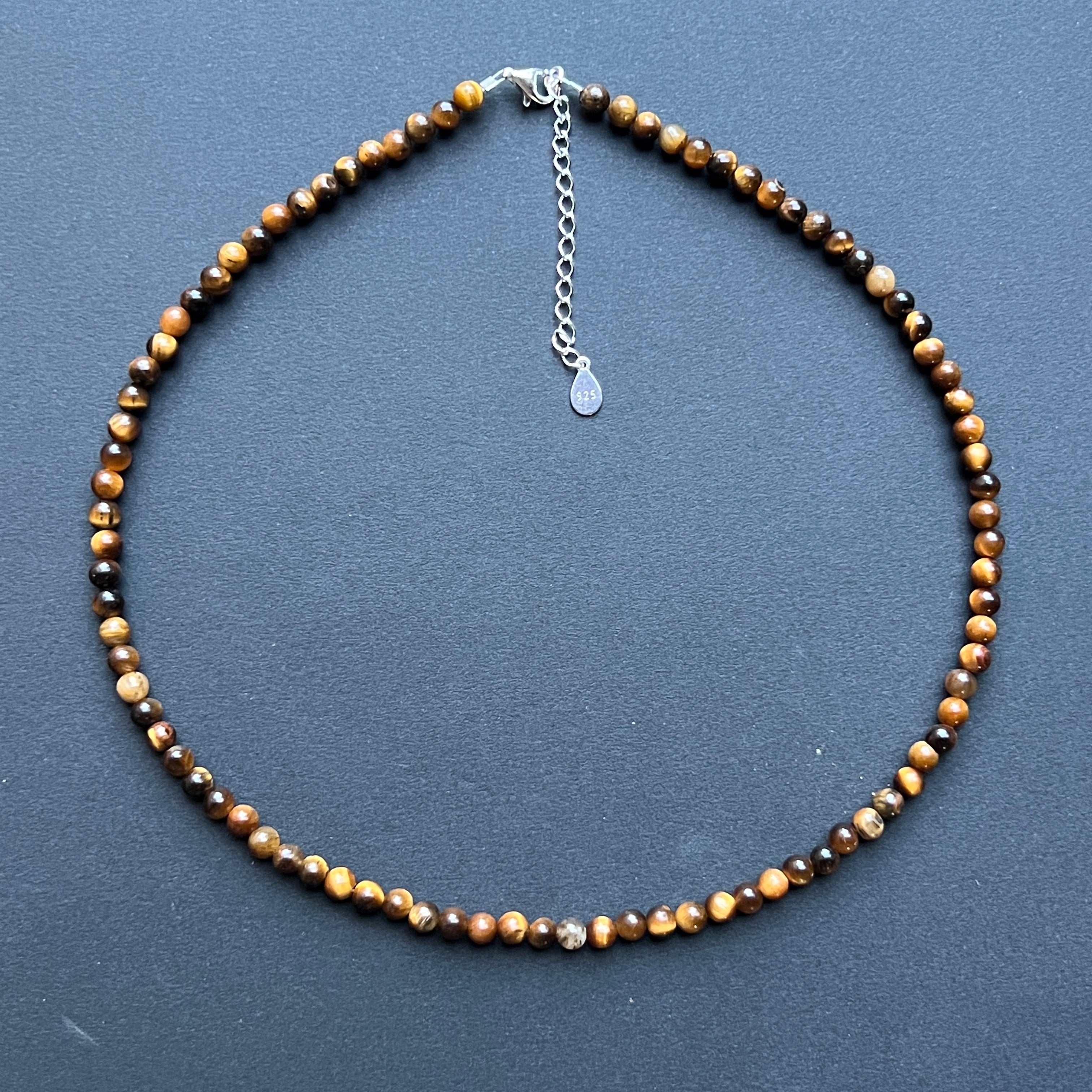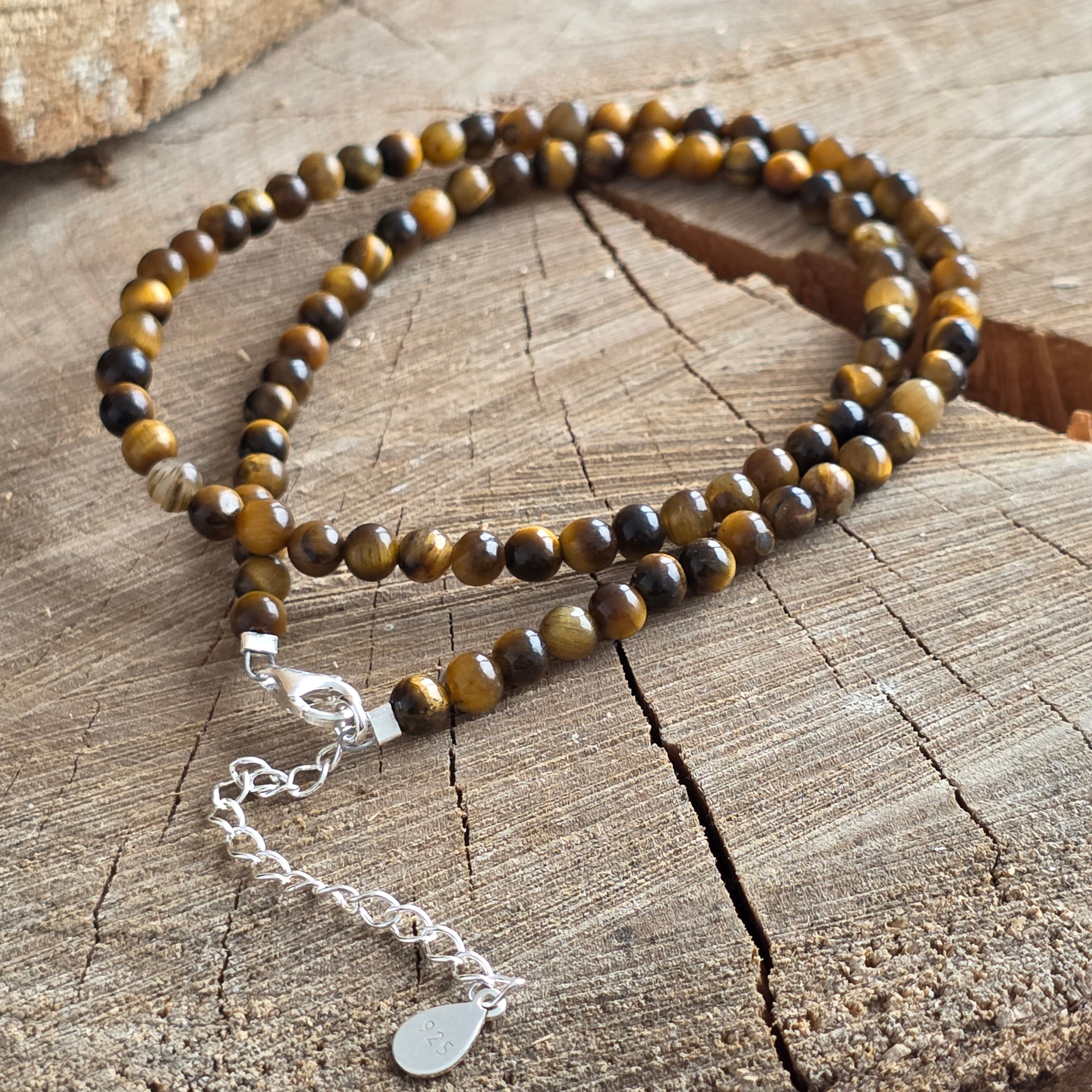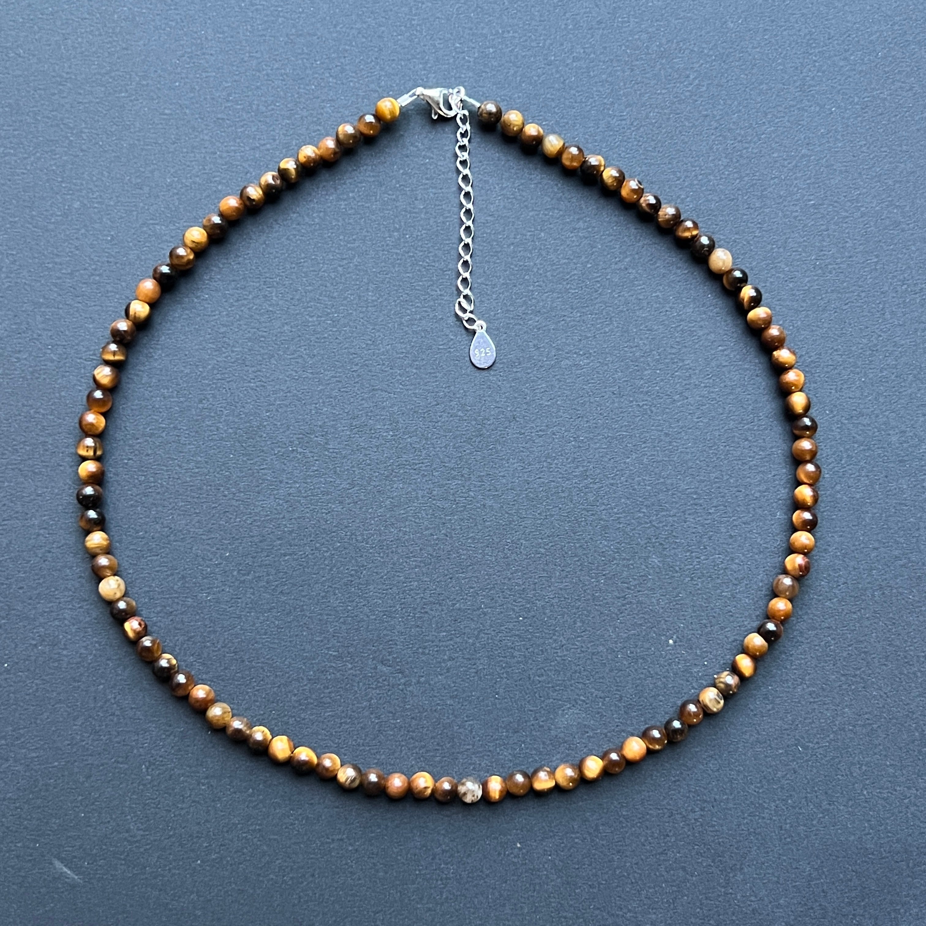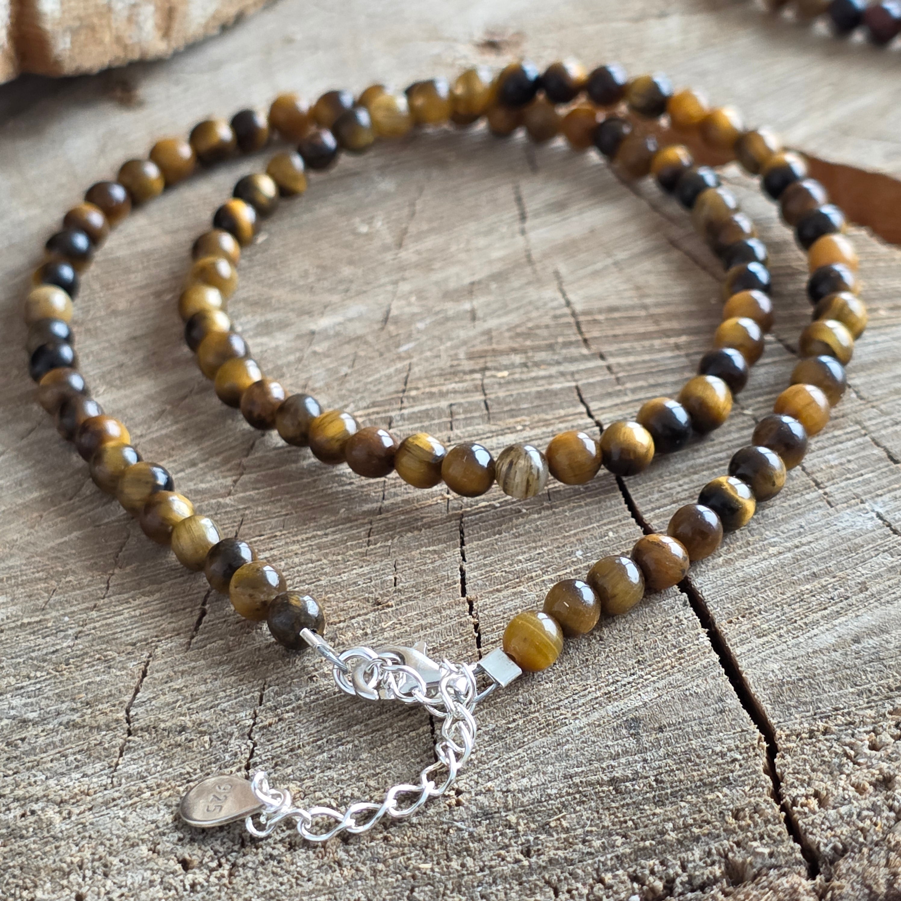 Una joya que vibra en tonos dorados y sombras cobrizas, como los rayos filtrados a través del follaje denso de un bosque sagrado. Este collar de Ojo de Tigre, con cuentas de 4 mm, revela un brillo sutil, como una promesa susurrada por la tierra misma.