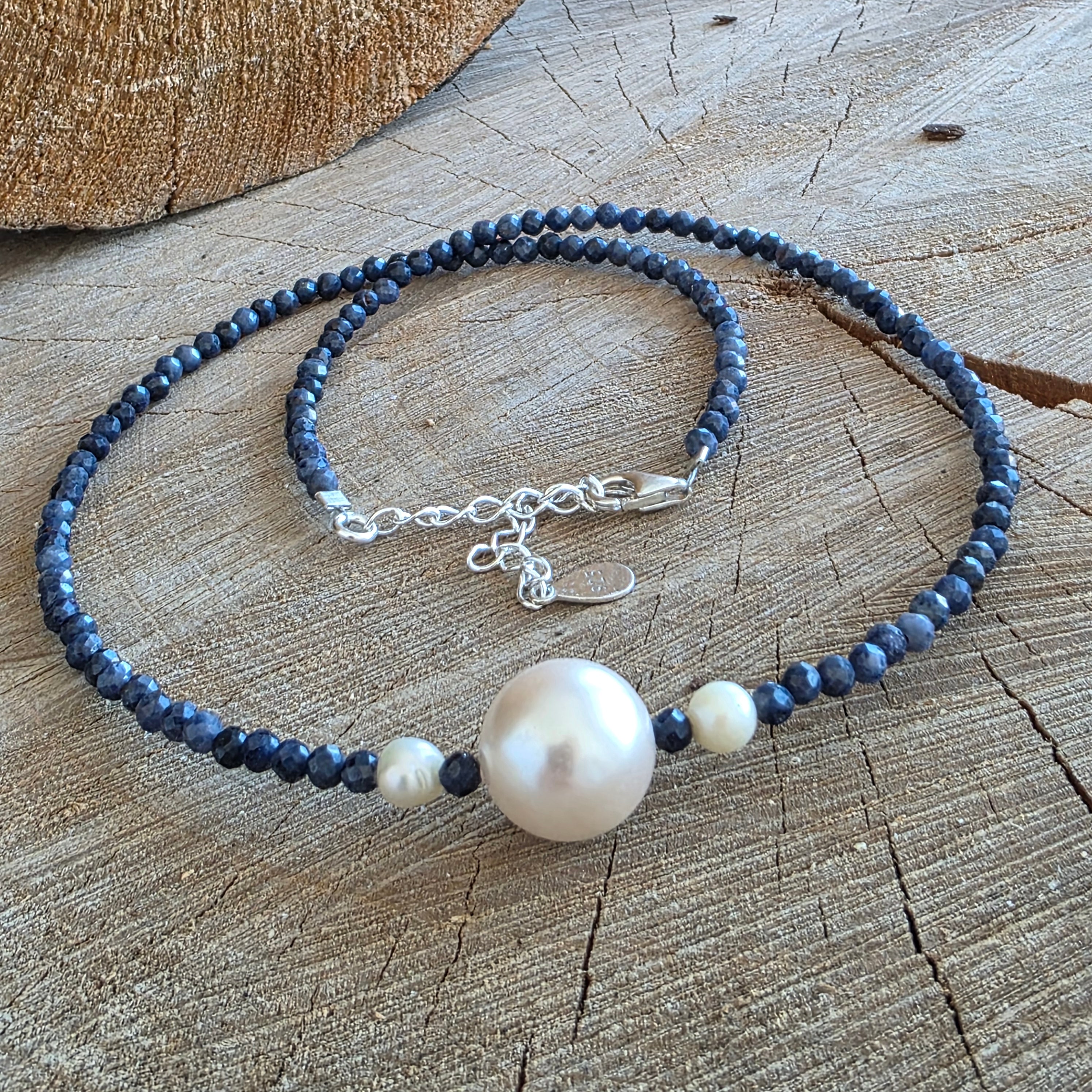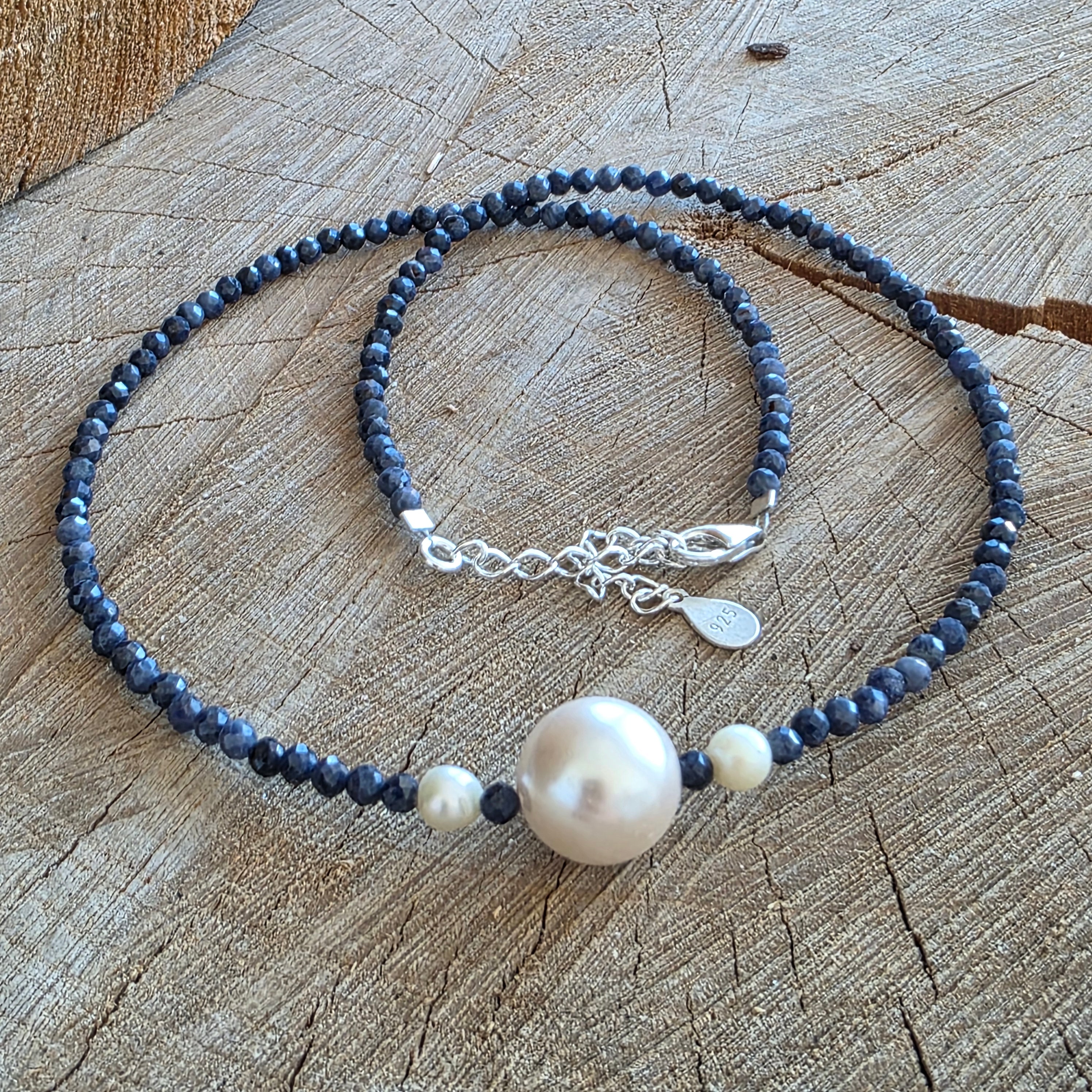 Un collar con elegancia noble y refinamiento discreto, elaborado con cuentas facetadas de zafiro de 3 mm, selección de calidad AAA. El azul profundo y saturado del zafiro se realza con el facetado fino, que captura la luz en reflejos delicados, ofreciendo a la joya un brillo controlado y sofisticado. El tamaño de las cuentas mantiene la línea del collar fina y equilibrada, adecuada tanto para uso diario como para ocasiones especiales.