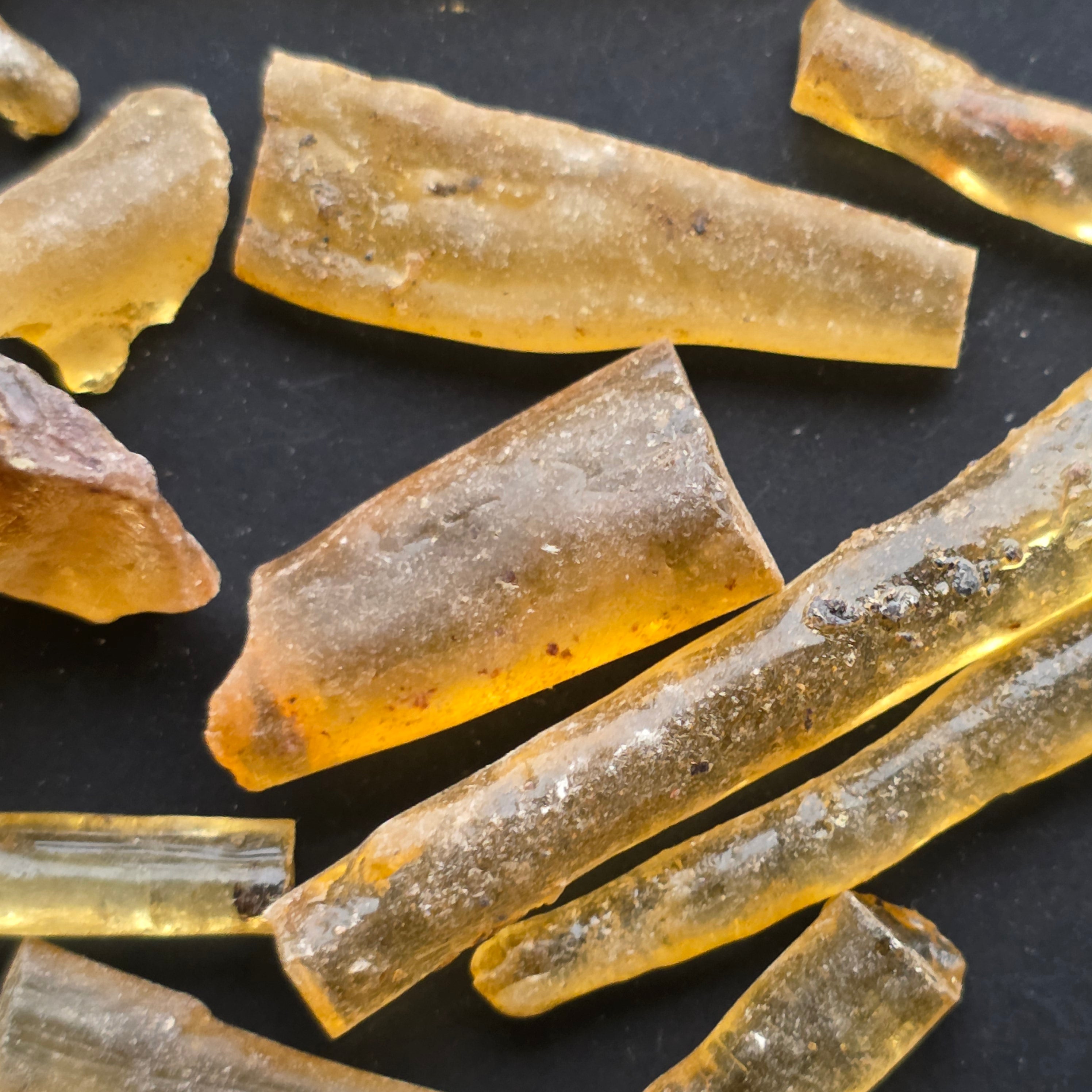 El copal, a menudo llamado también resina subfosilizada, es la forma temprana del ámbar: una resina natural que ha conservado la luz solar y la transparencia antes de entrar en la verdadera fosilización geológica. Proveniente de árboles tropicales, este delicado material guarda en sí mismo la memoria de algunos siglos o milenios, capturando fragmentos de la vida del bosque tal como existían en aquel tiempo. Es más ligero, más cálido al tacto y más luminoso que el ámbar maduro, y su aspecto suave lo hace ideal para coleccionistas, creadores de joyas y amantes de piezas naturales con historia. En el copal, el tiempo aún no es piedra: todavía es luz, todavía es movimiento, todavía es promesa.
