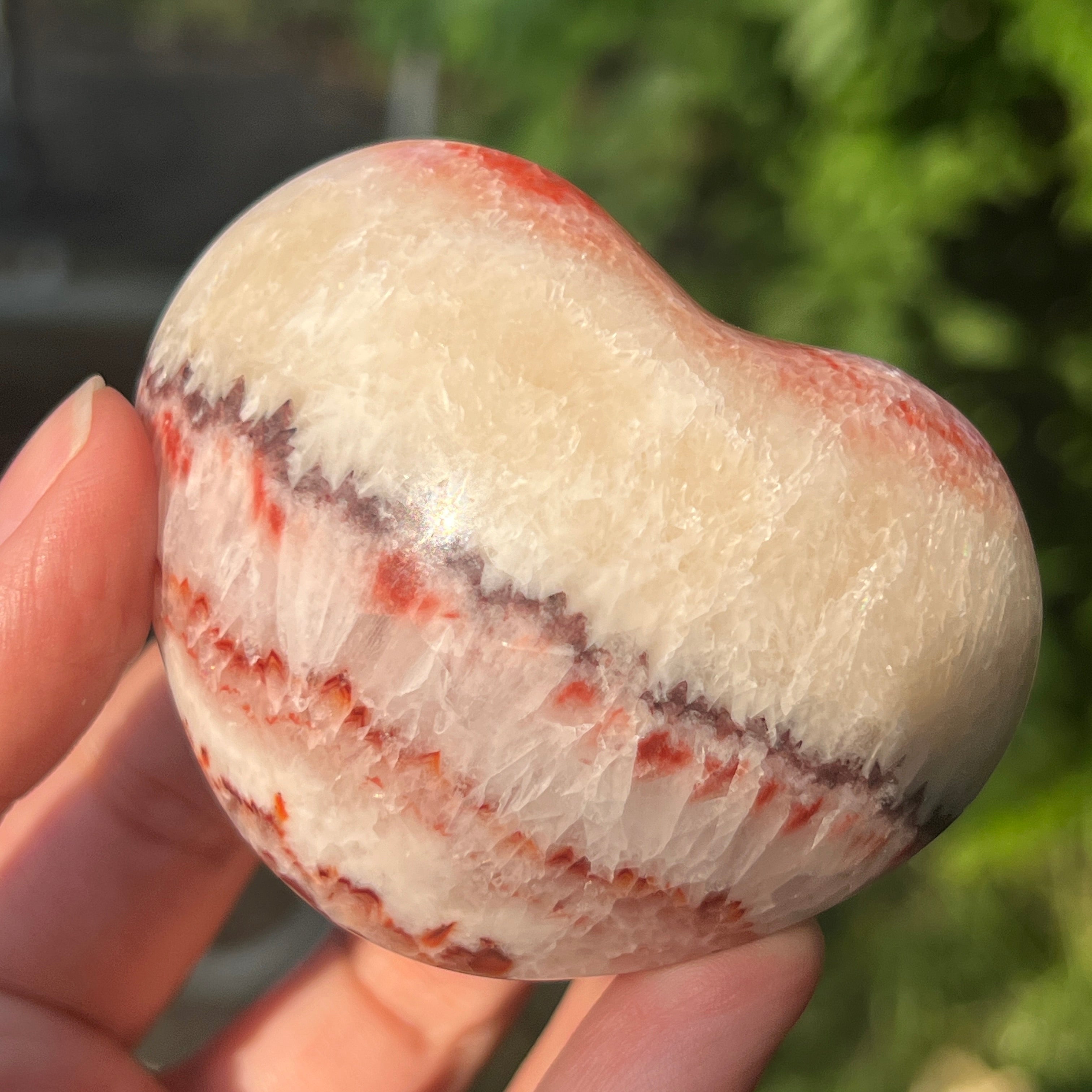 Este corazón pulido a mano de calcita rosa con rayas aporta una nota cálida y reconfortante a cualquier espacio. Las suaves tonalidades de rosa, combinadas con franjas blancas o cremosas, evocan delicadeza, equilibrio interior y protección del alma.