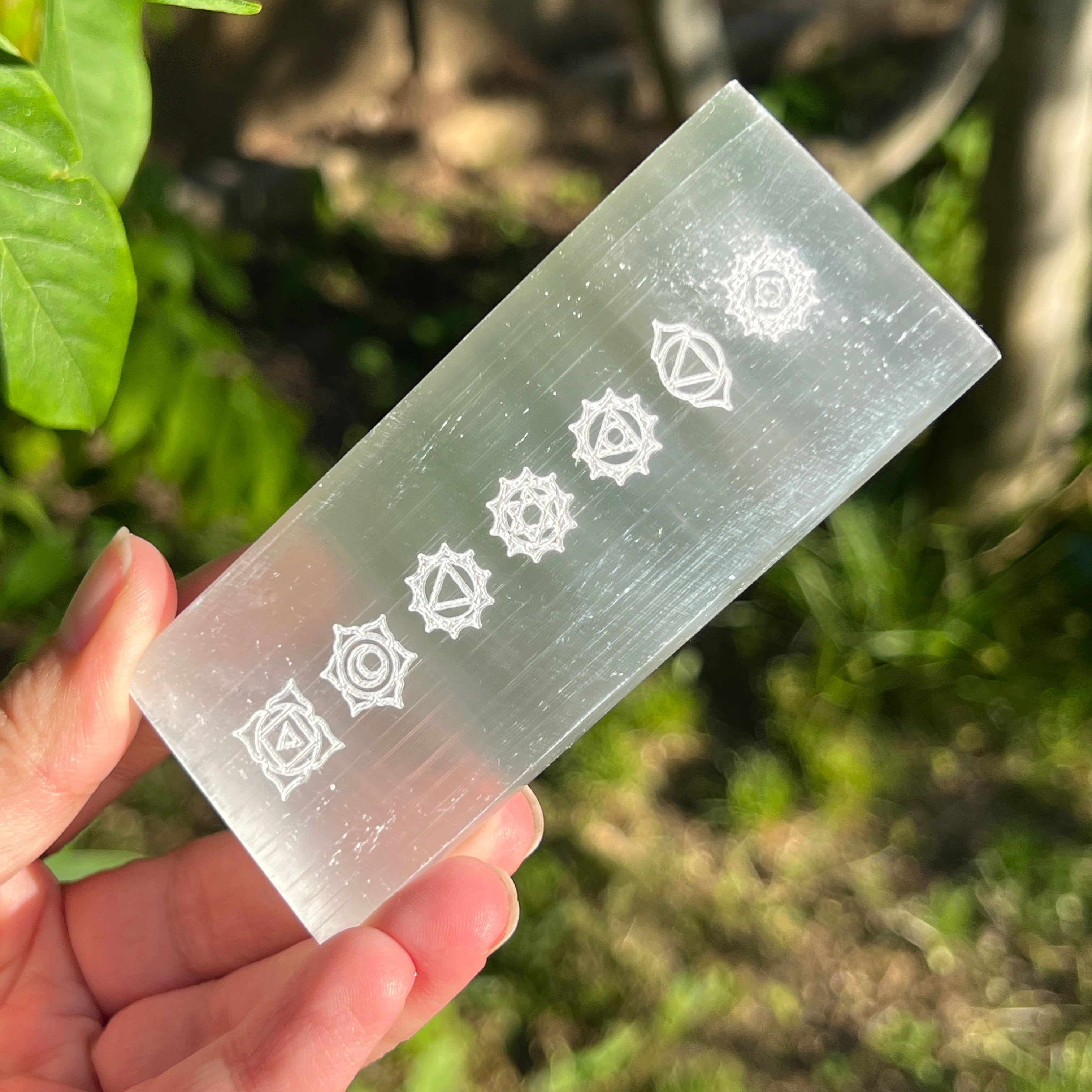 La selenita se utiliza a menudo como cristal de apoyo en prácticas espirituales, ayudando a abrir y activar los chakras 6 y 7, que están asociados con la intuición, la clarividencia y la conexión espiritual.