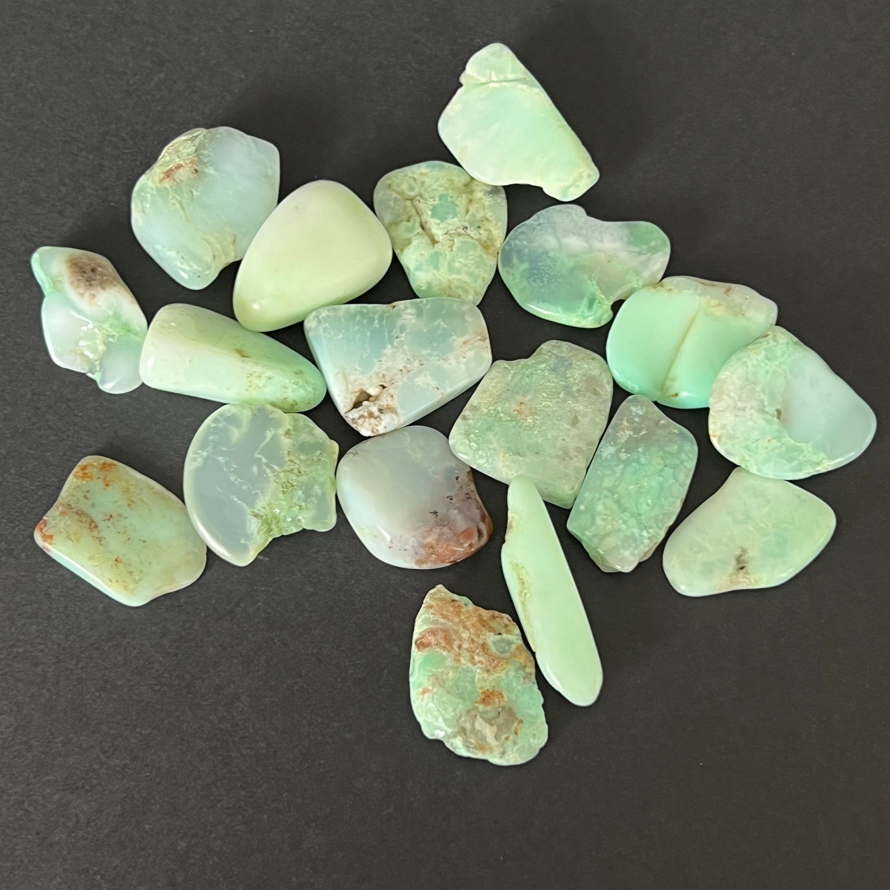 Crisoprasia Australia piedra rodada, tamaños entre 1,5 y 3,5 cm. El precio varía según el tamaño de la piedra, por favor seleccione el tamaño deseado. El precio se refiere a una pieza.