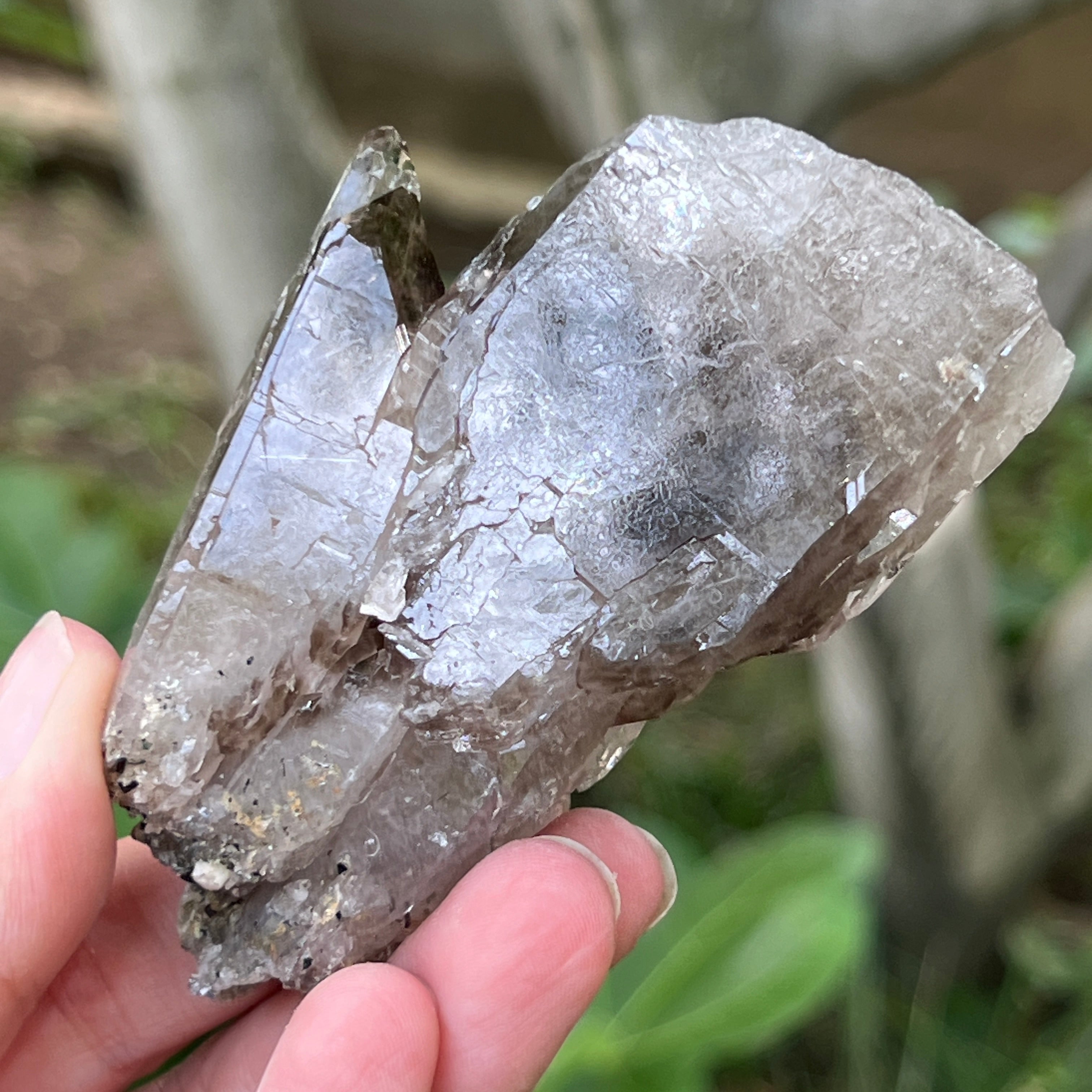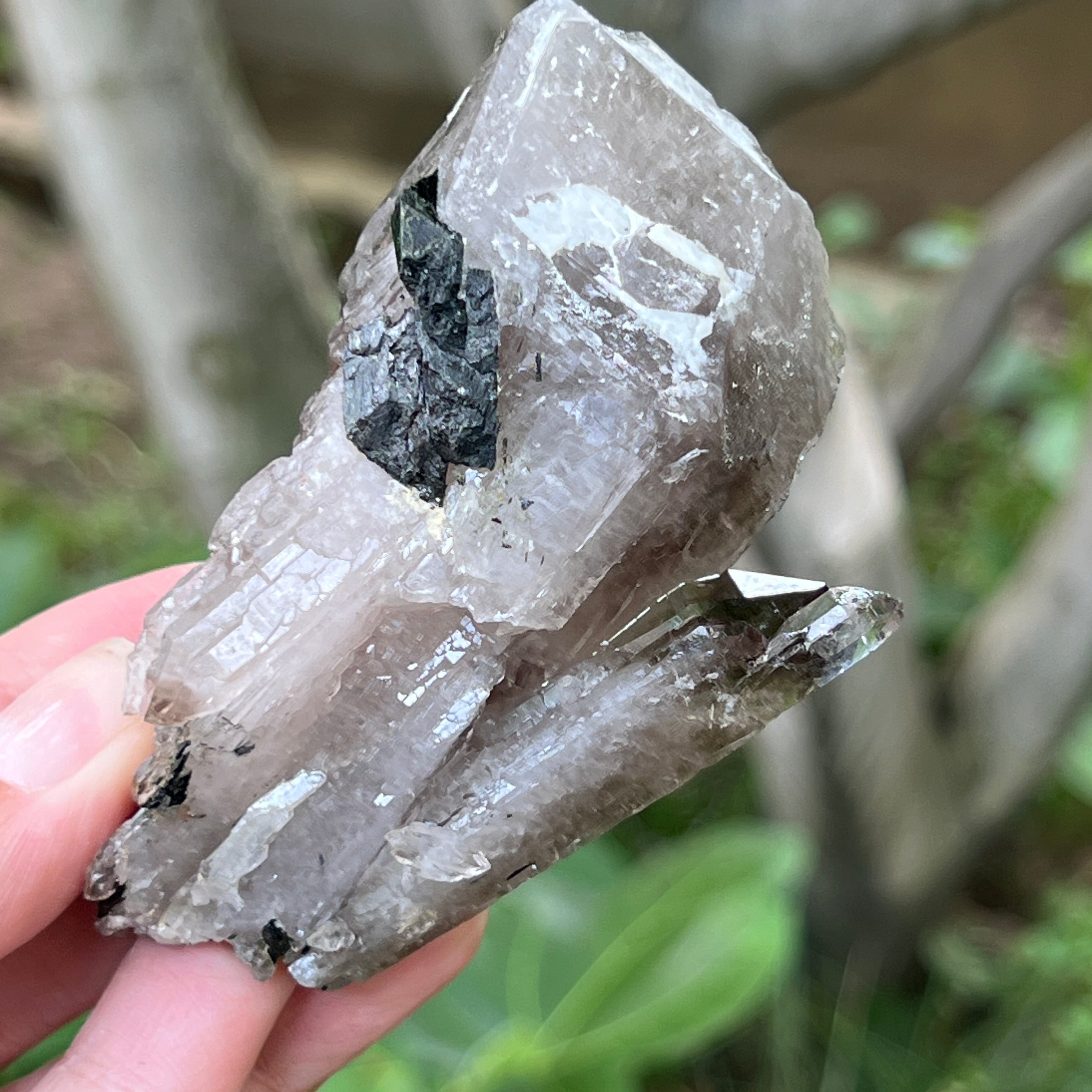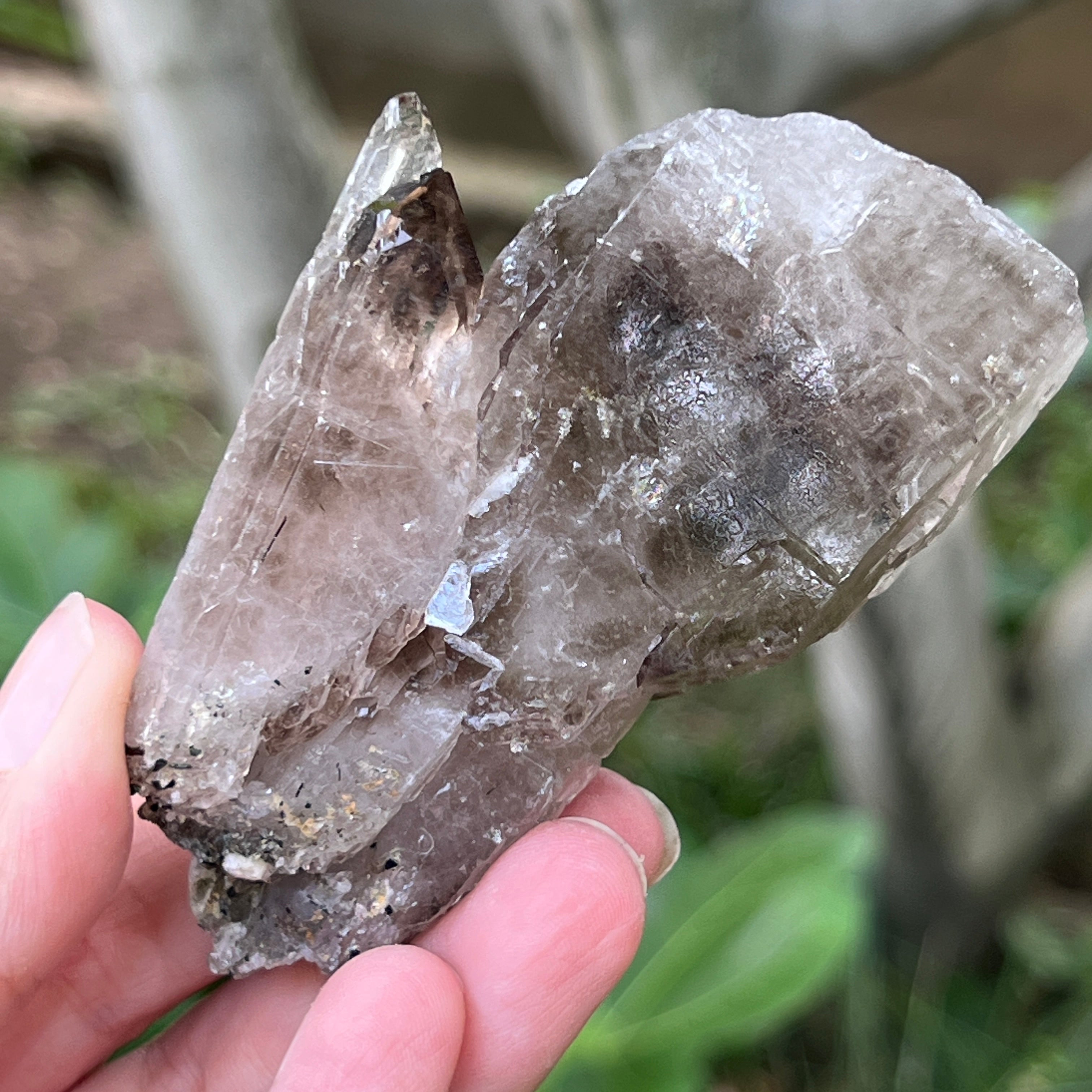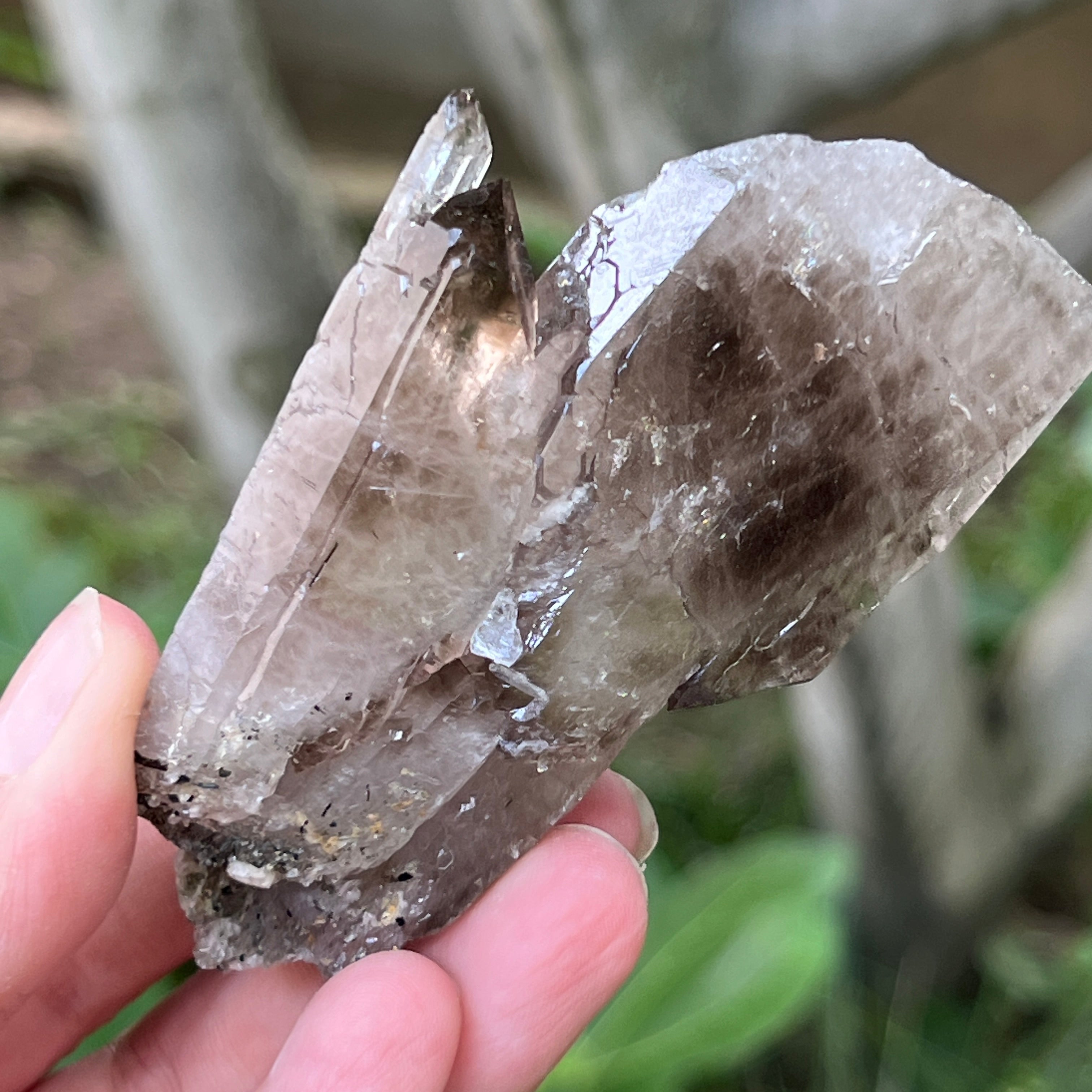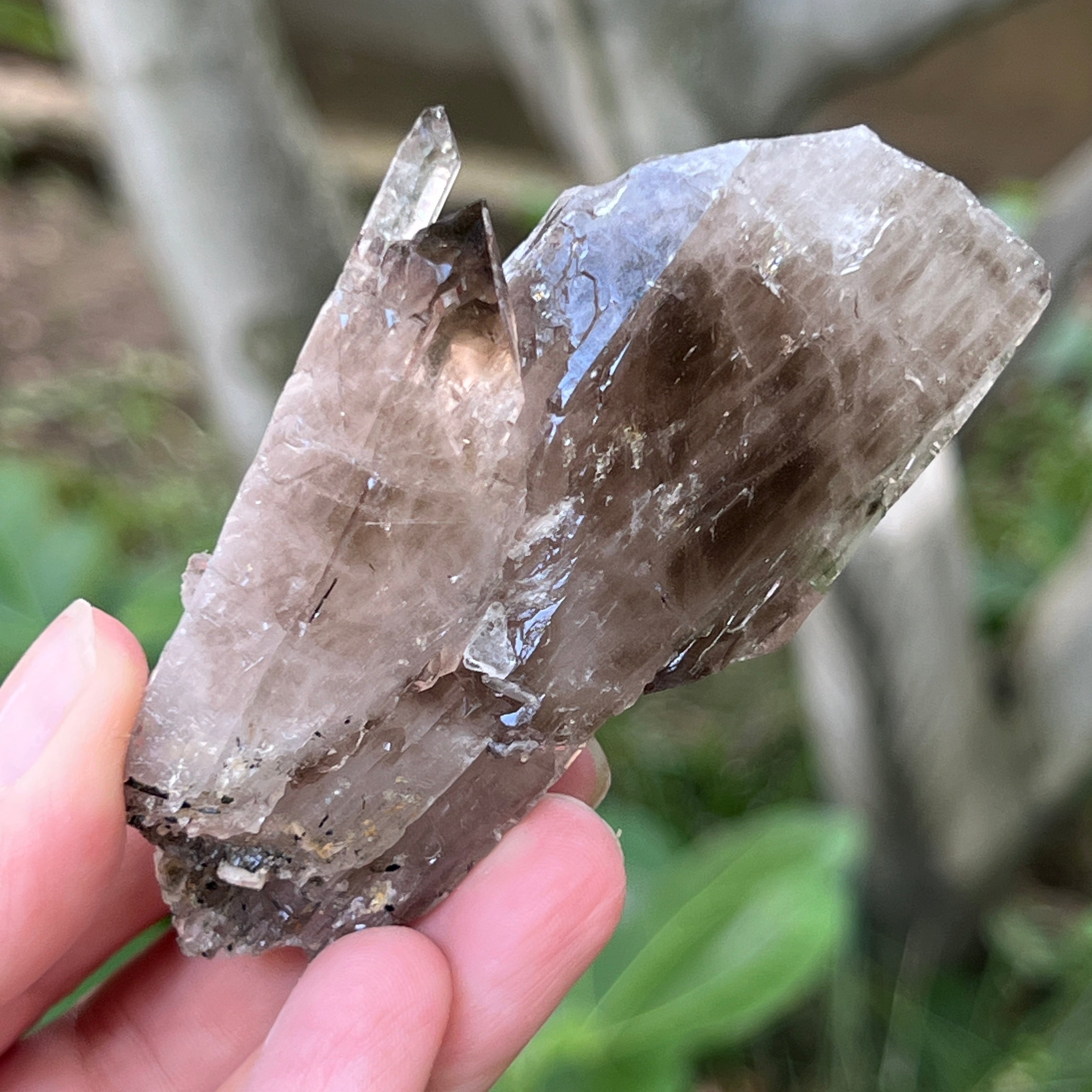 El cuarzo ahumado de esta zona es especialmente apreciado por su claridad natural, los tonos cálidos de marrón translúcido hasta marrón intenso, y las formas perfectamente desarrolladas en el sistema trigonal. Algunos cristales presentan terminaciones dobles, formas de cetro o inclusiones fascinantes, desde vapores hidrotermales y burbujas móviles, hasta rastros de hematita o rutilo. La presencia natural de radiaciones de las rocas circundantes durante la formación del cristal confiere este tono ahumado auténtico, sin tratamientos térmicos ni intervenciones humanas.