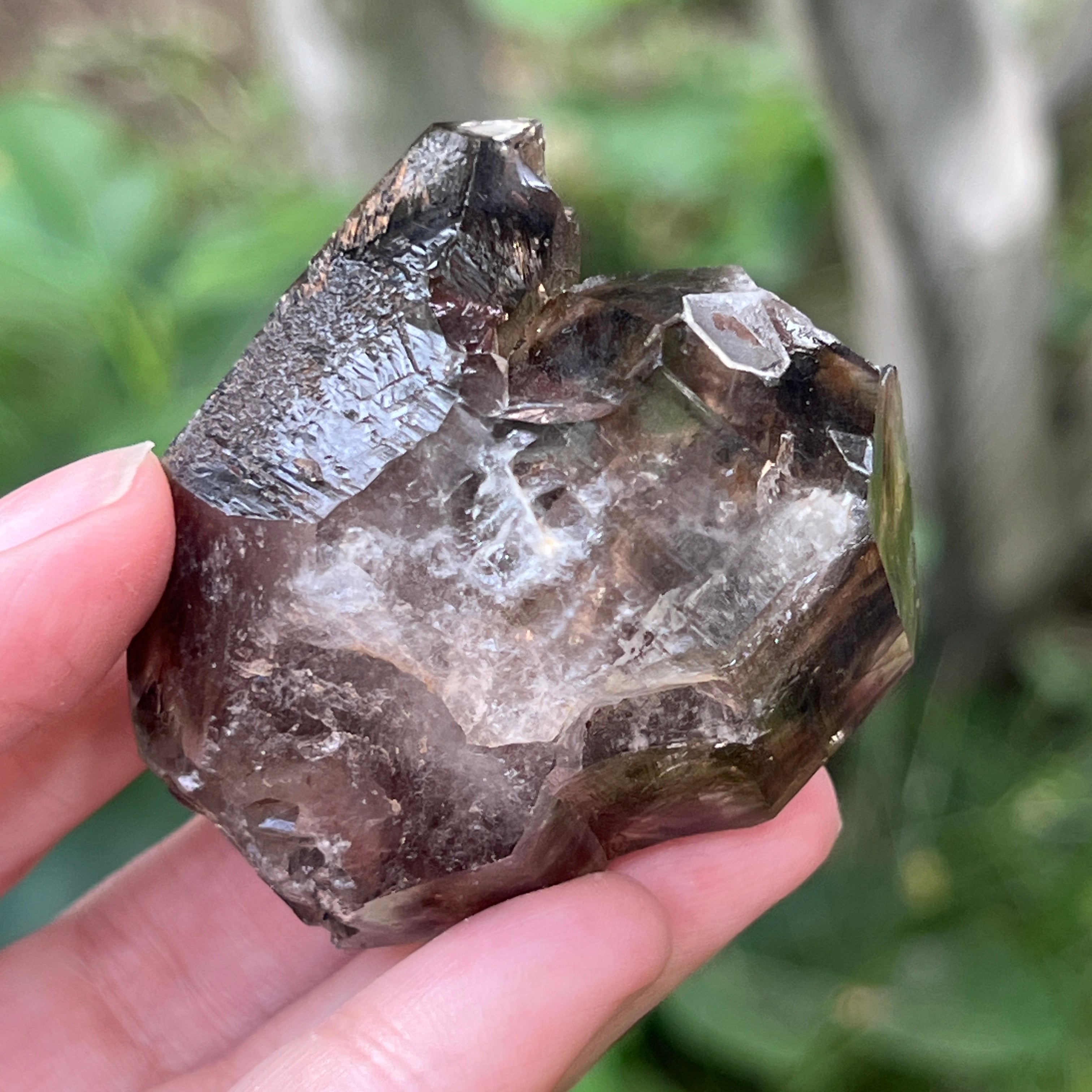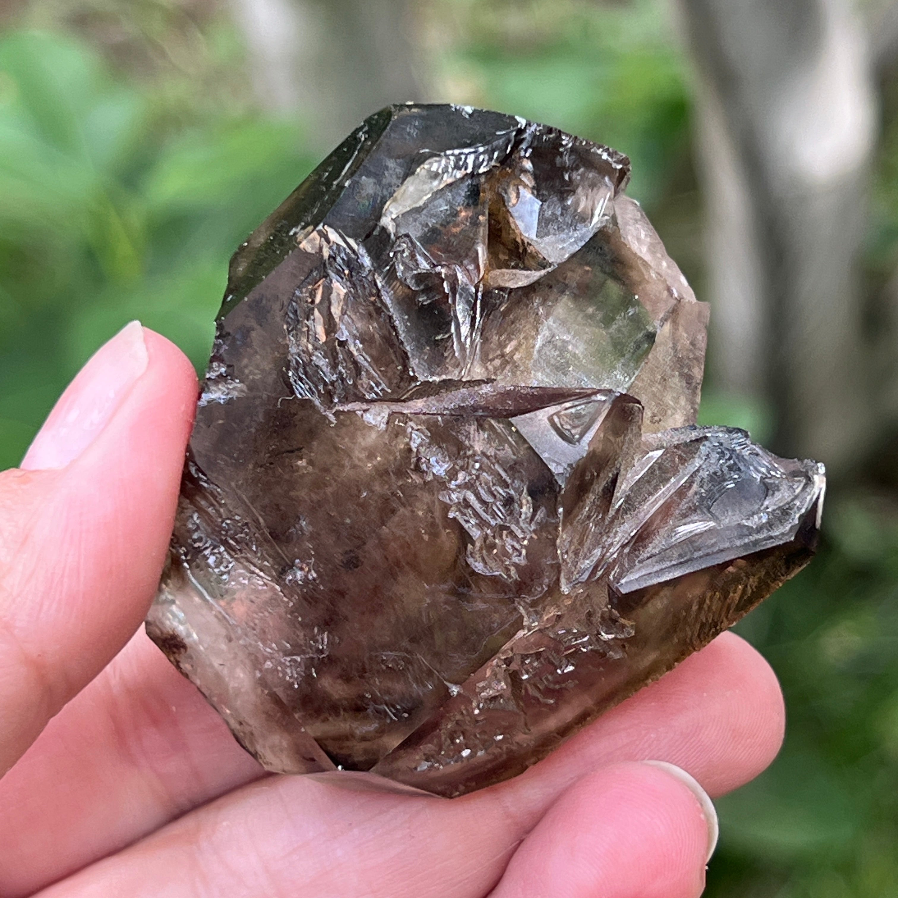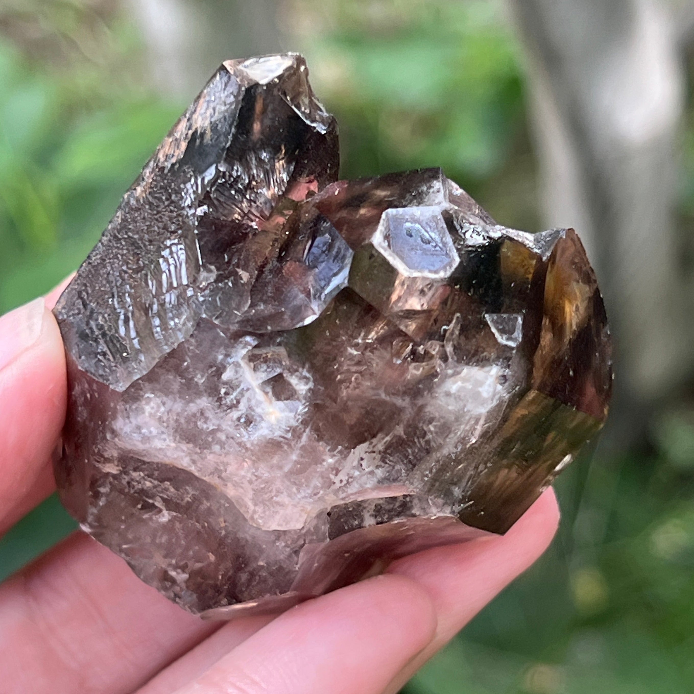 El cuarzo ahumado de esta zona es especialmente apreciado por su claridad natural, los tonos cálidos de marrón translúcido hasta intenso, y las formas perfectamente desarrolladas en sistema trigonal. Algunos cristales presentan terminaciones dobles, formas de cetro o inclusiones fascinantes, desde vapores hidrotermales y burbujas móviles hasta restos de hematita o rutilo. La presencia natural de radiaciones provenientes de las rocas circundantes durante la formación del cristal le otorga ese tono ahumado auténtico, sin tratamientos térmicos ni intervenciones humanas.
