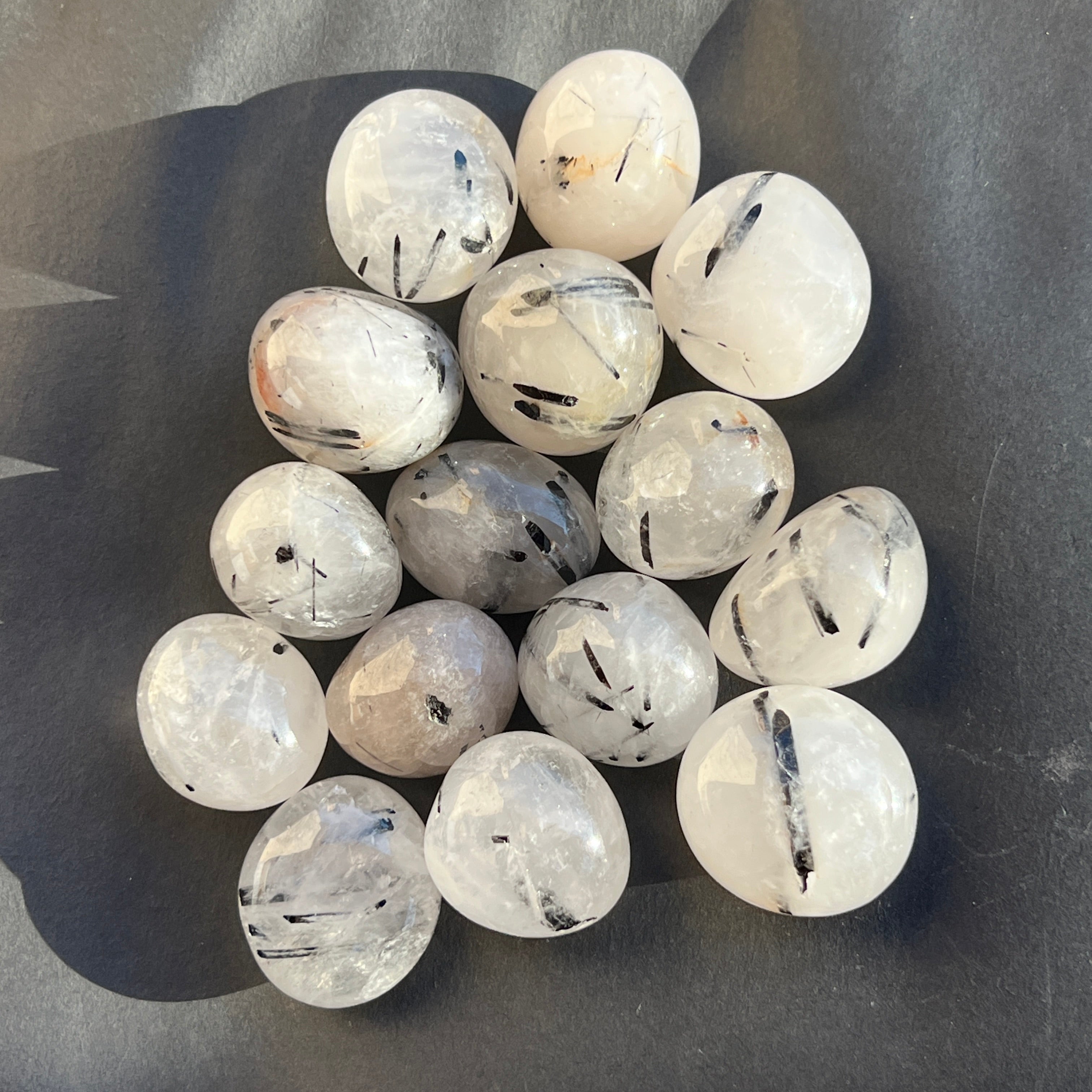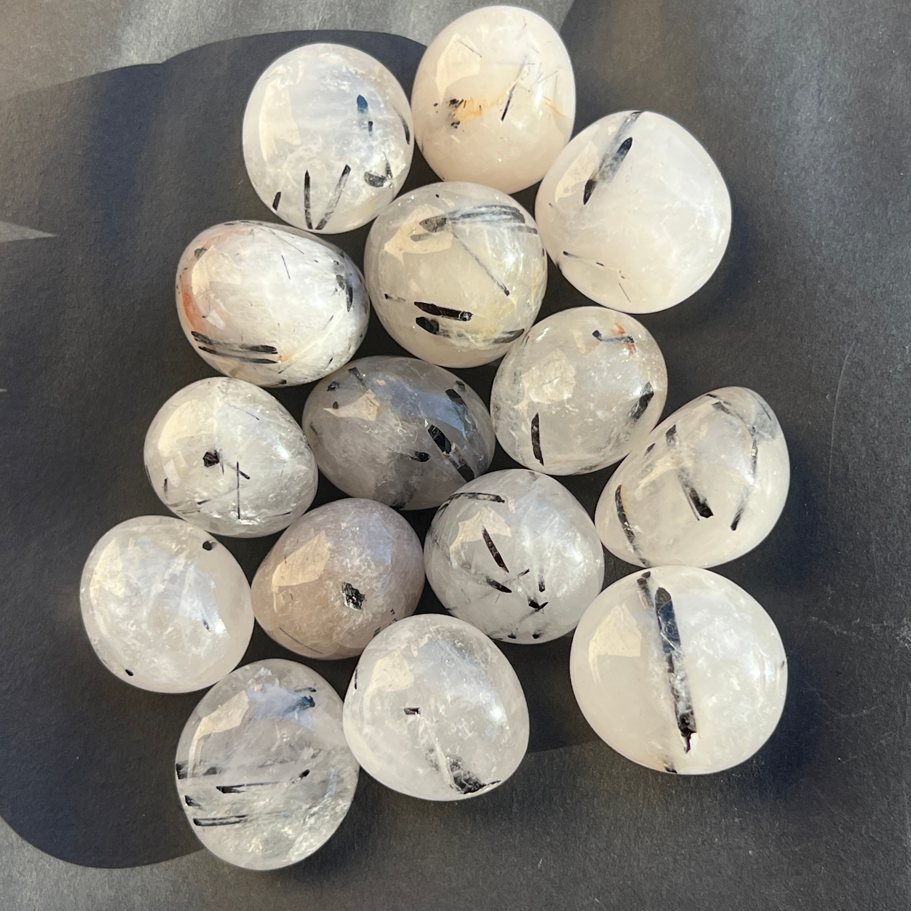 Cuarzo con turmalina piedra rodante, dimensiones entre 1,5 y 3,5 cm. El precio varía según el tamaño de la piedra, por favor selecciona el tamaño deseado.