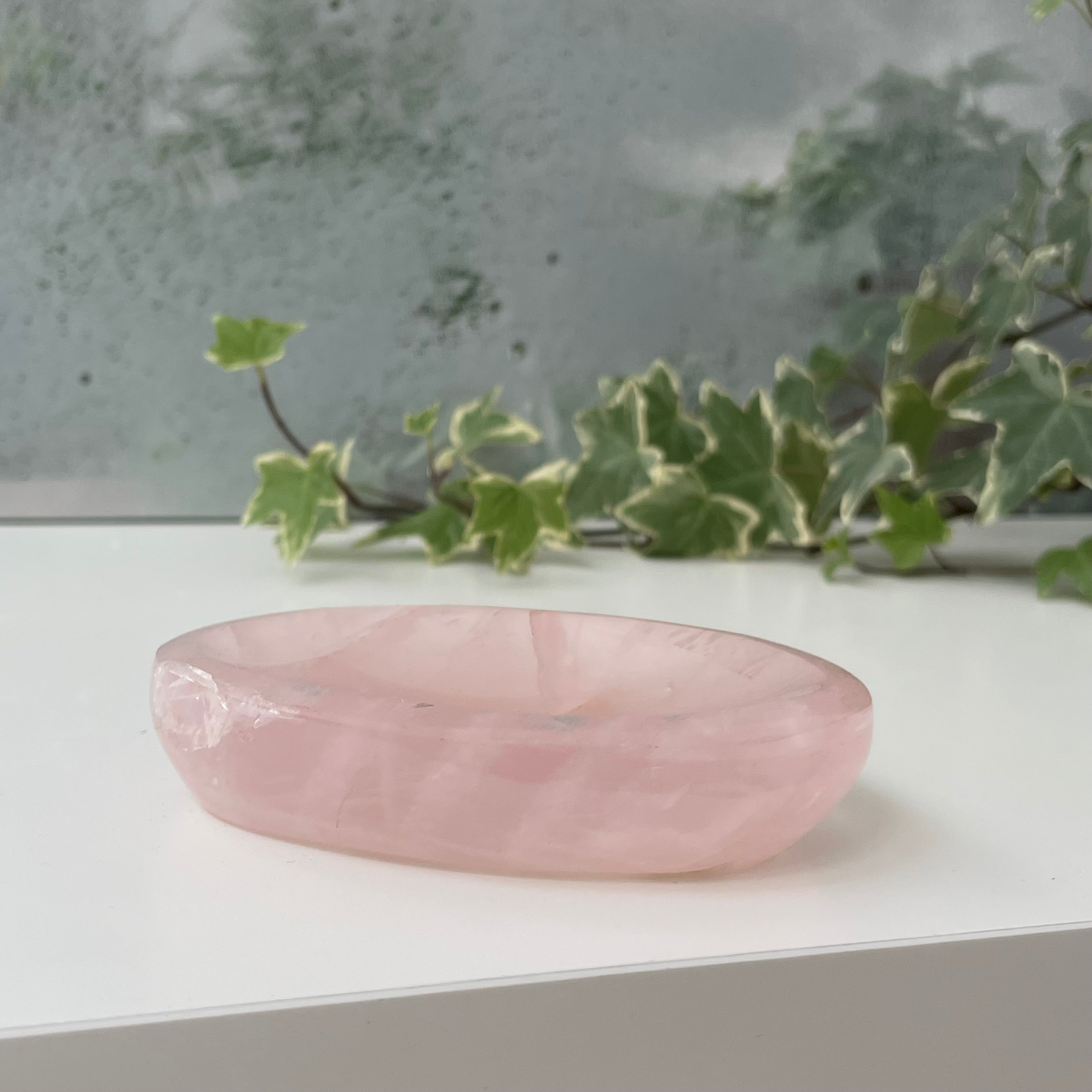 El cuenco de cuarzo rosa es una pieza decorativa hecha de una variedad de cuarzo con estructura cristalina bien definida, apreciada por su transparencia ligeramente lechosa y por los matices naturales de rosa, generados por inclusiones finas de titanio o manganeso. Este mineral es reconocido por su solidez, lo que permite trabajarlo en formas escultóricas equilibradas y acabados de alta calidad.