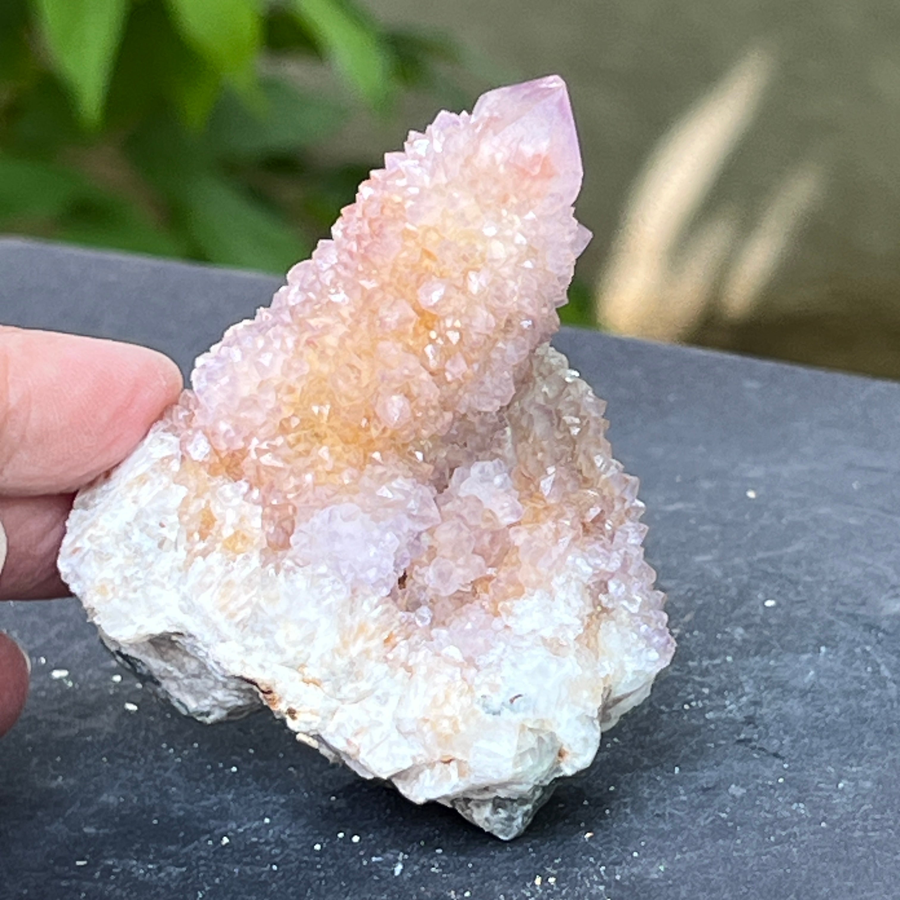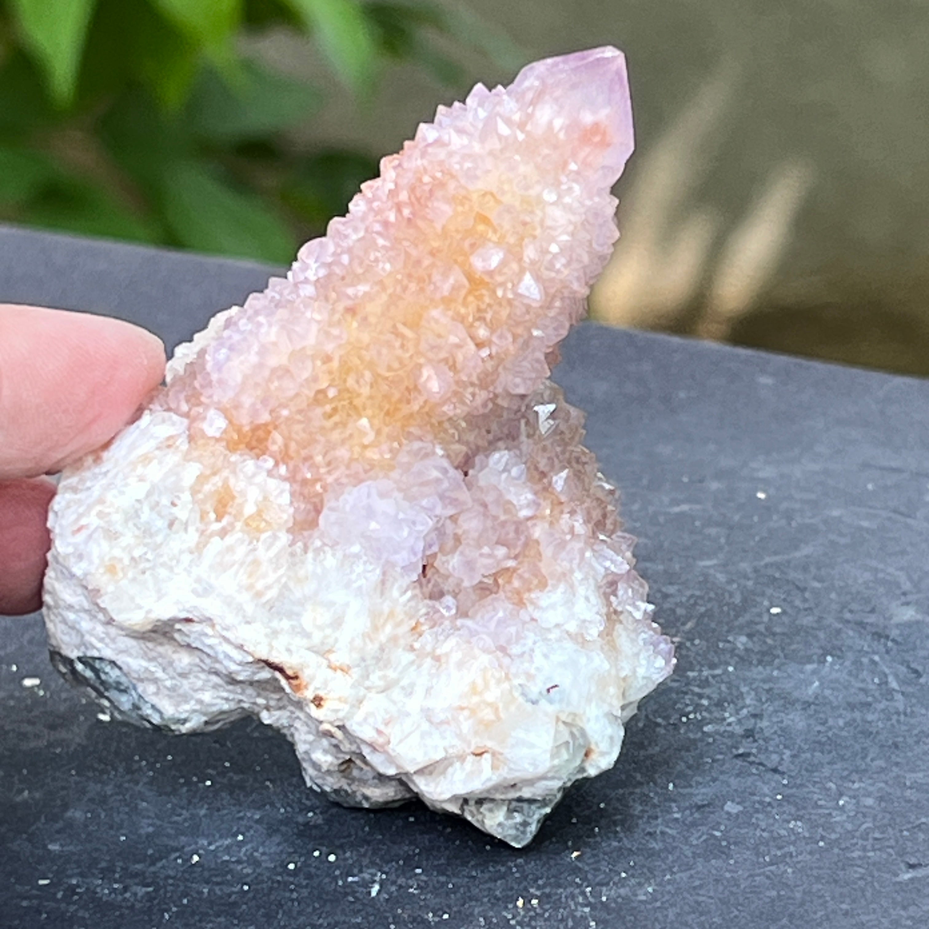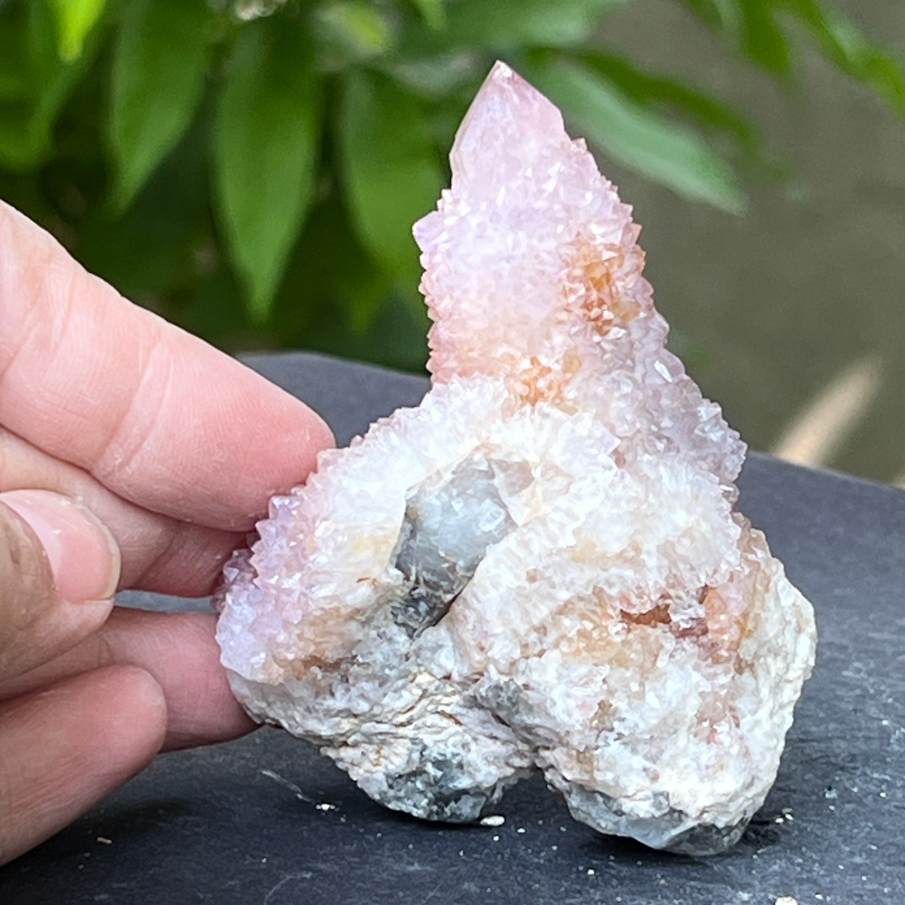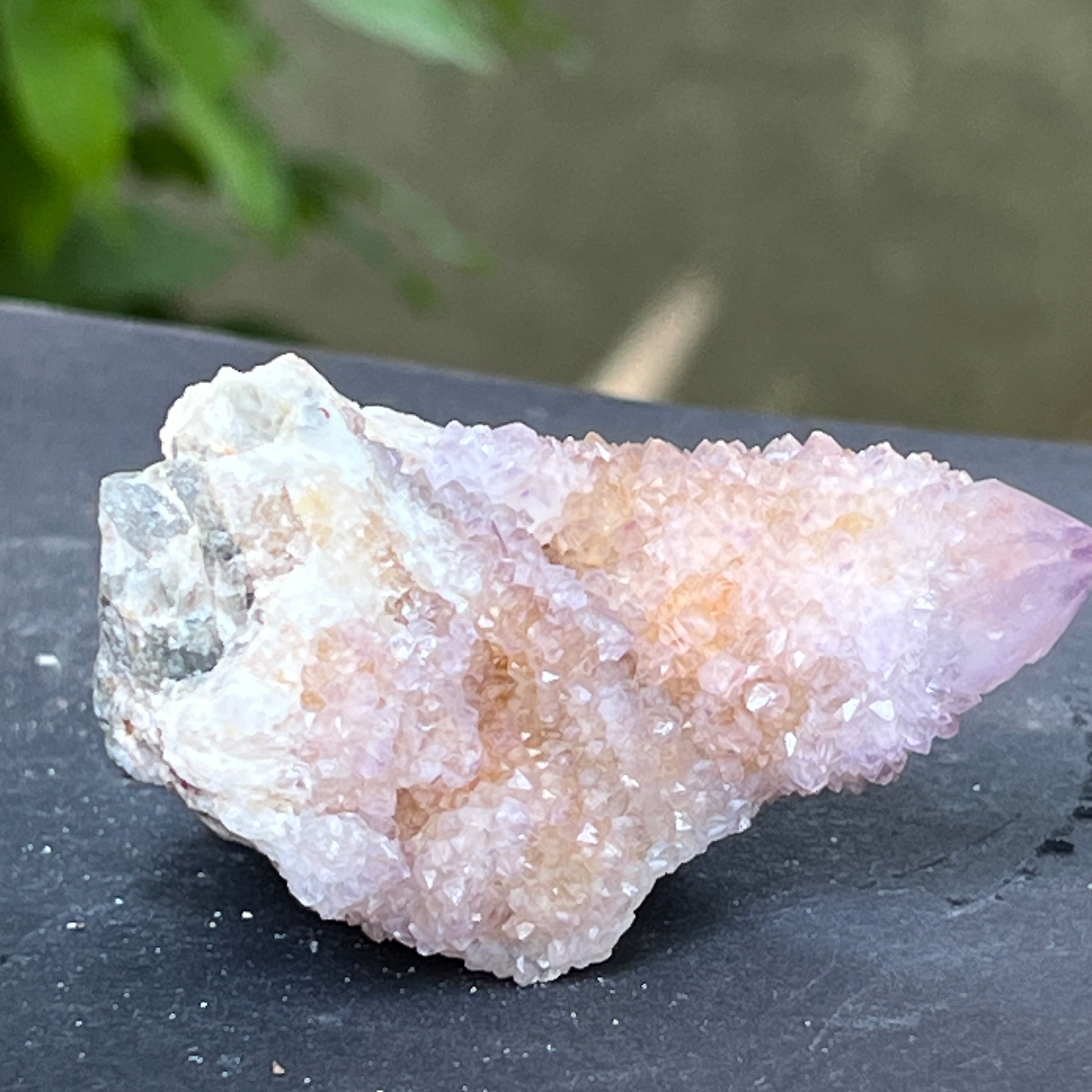 En las profundidades de la tierra africana, donde el silencio de las montañas esconde historias no contadas, nace un cristal de belleza inusual: el Cuarzo Espíritu Amatista, también conocido como "Cuarzo Cactus". Esta maravilla mineralógica parece envuelta en un aura mística: una sola base sólida, cubierta con miles de puntas delicadas, como una comunidad de cristales unidos en un baile de luz.