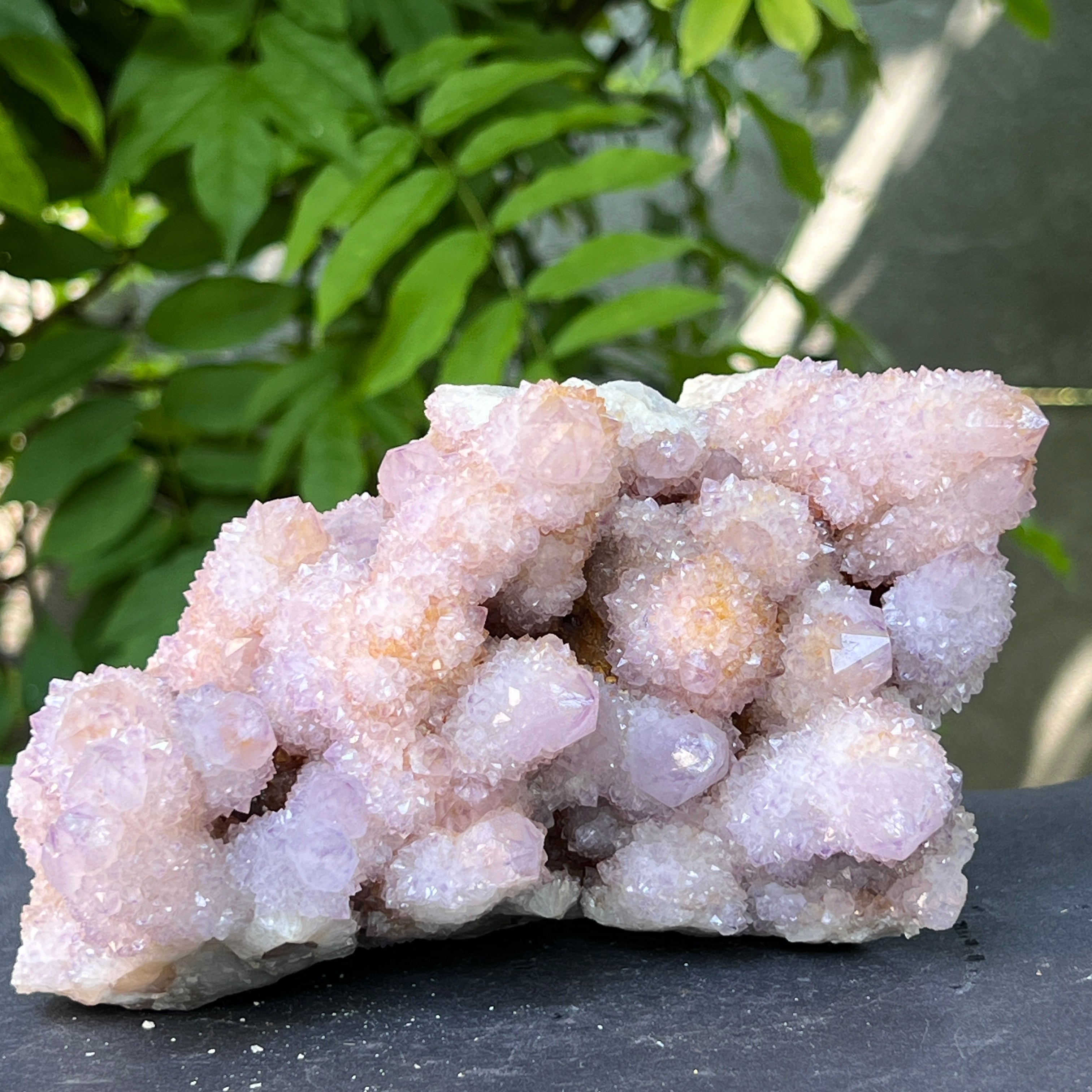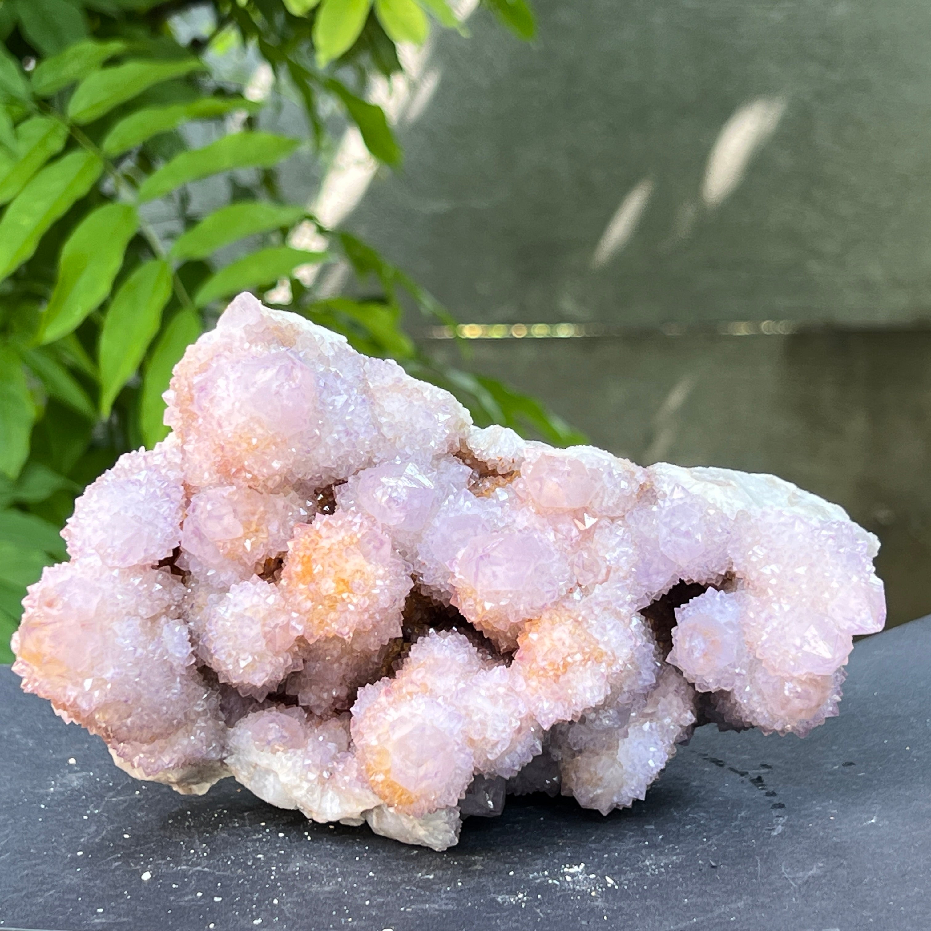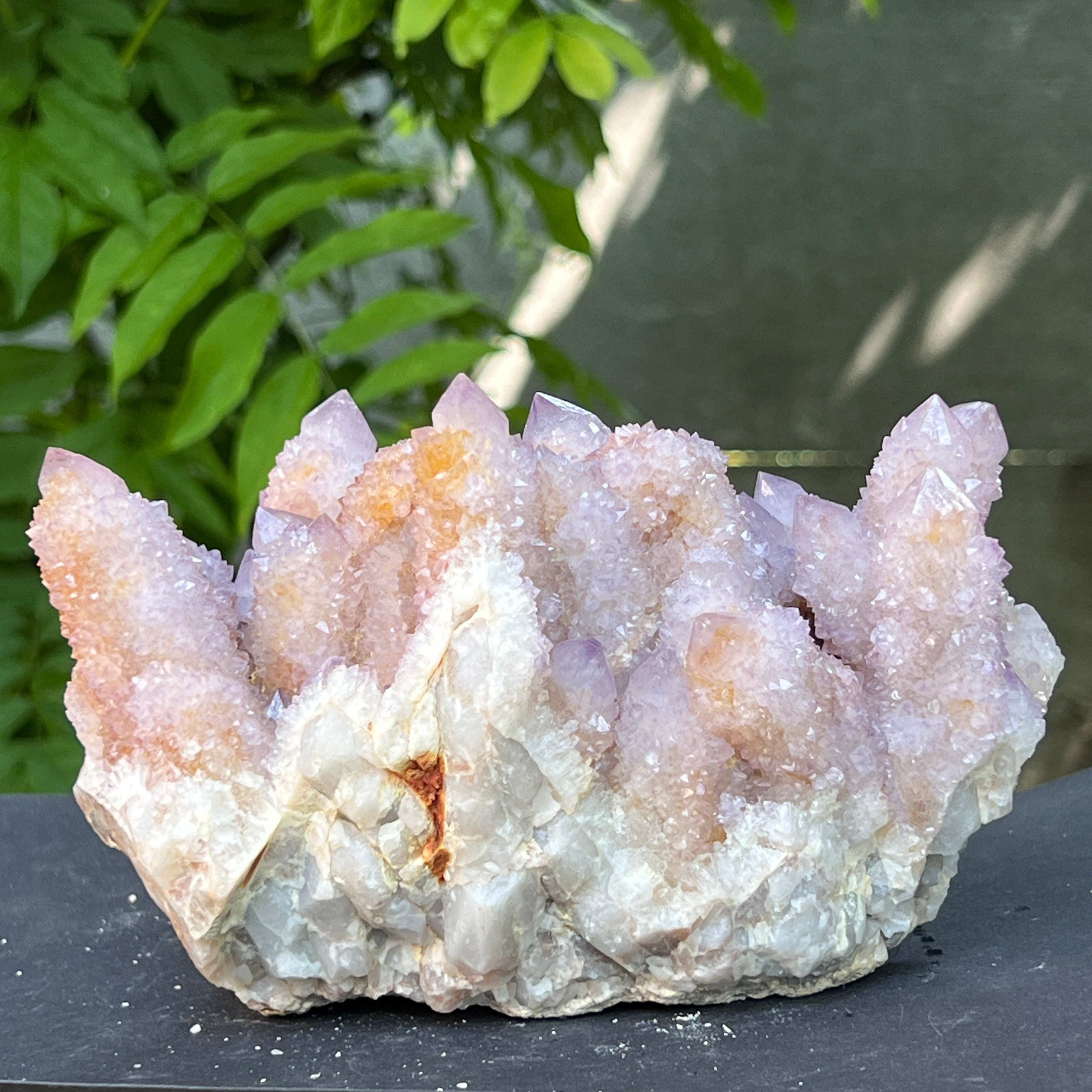 En las profundidades de la tierra africana, donde el silencio de las montañas esconde historias no contadas, nace un cristal de belleza inusual: el Cuarzo Espíritu Amatista, también conocido como "Cactus Quartz". Esta maravilla mineralógica parece envuelta en un aura mística: una sola base sólida, cubierta con miles de puntas delicadas, como una comunidad de cristales unidos en un baile de luz.