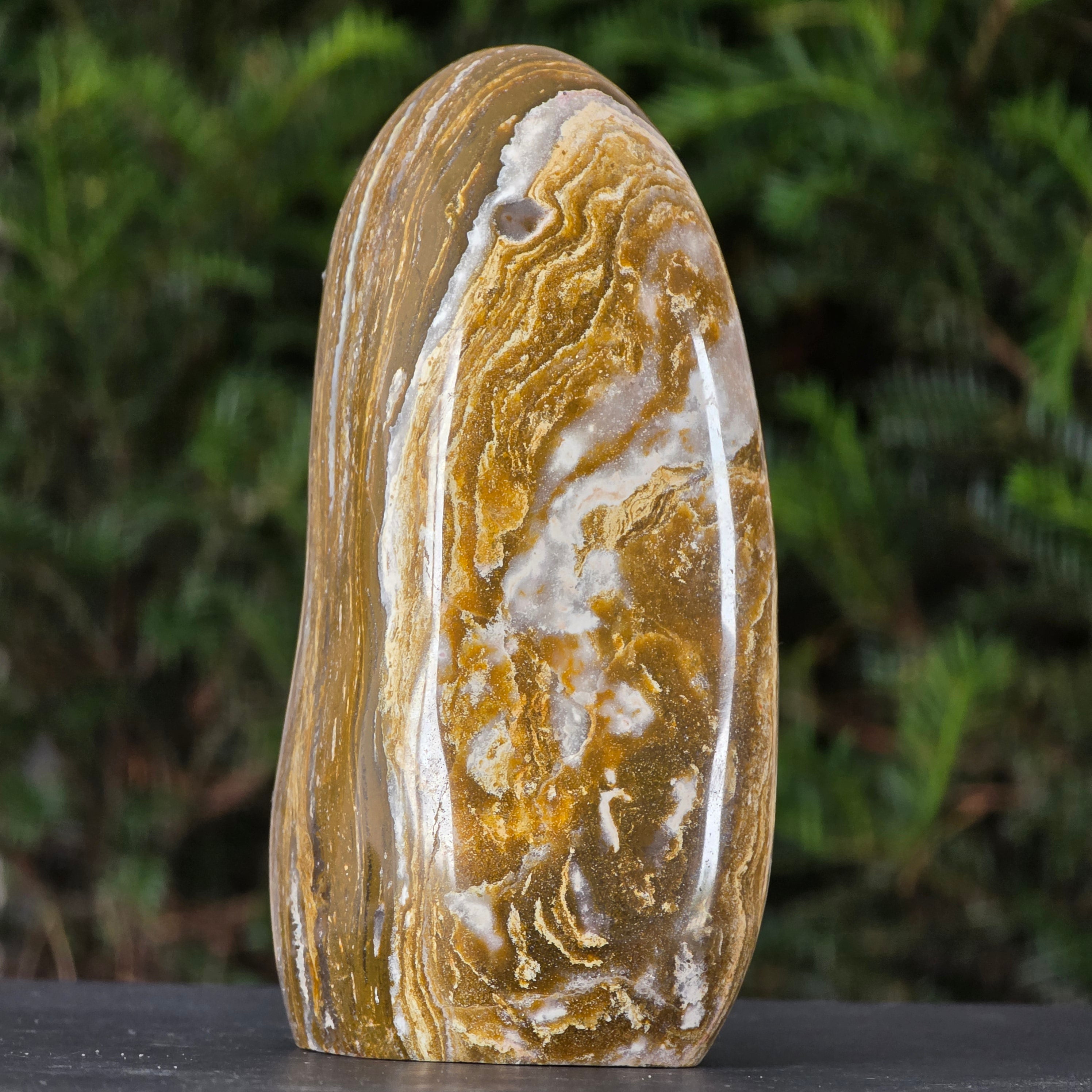 Una pieza que parece desprendida del corazón de la Tierra y del lento movimiento de los océanos ancestrales: esta escultura de jaspe oceánico reúne la esencia del agua, la tierra y el tiempo.