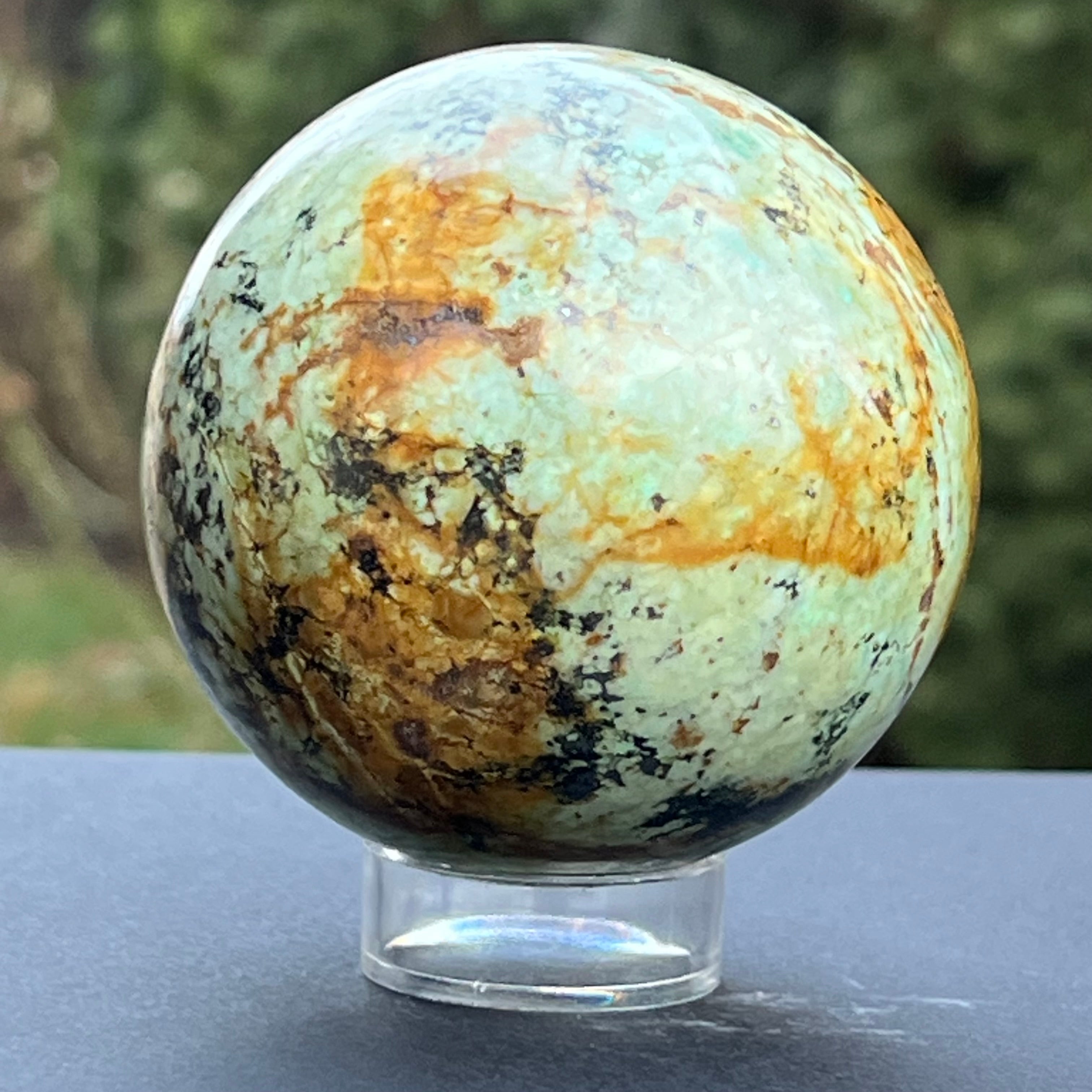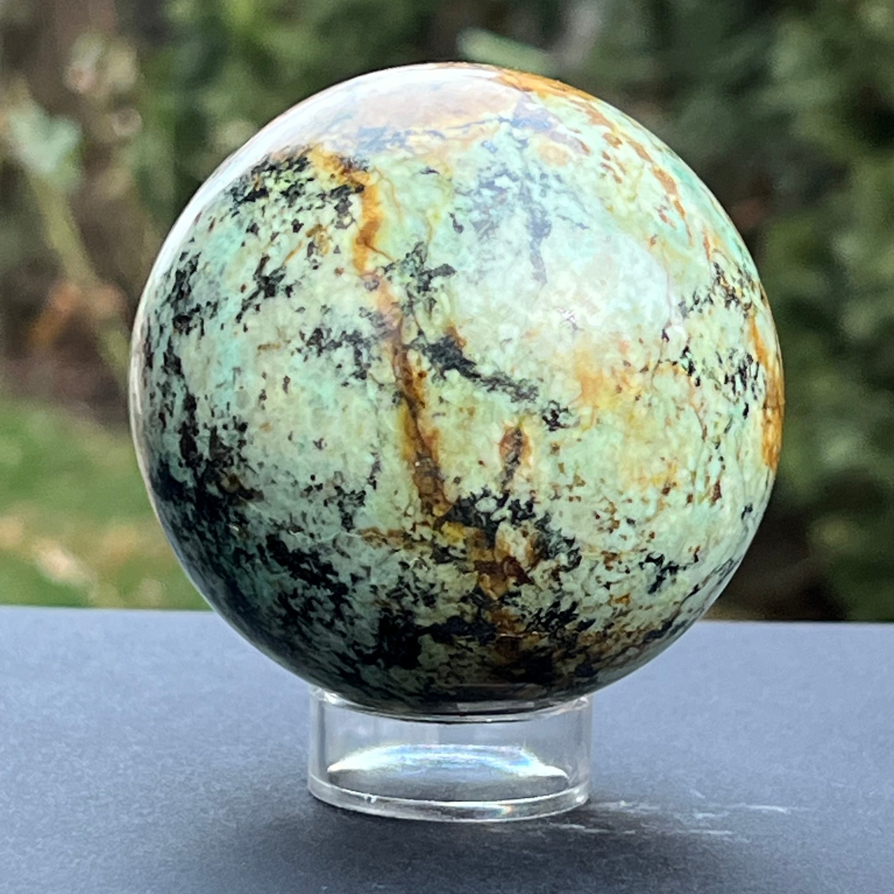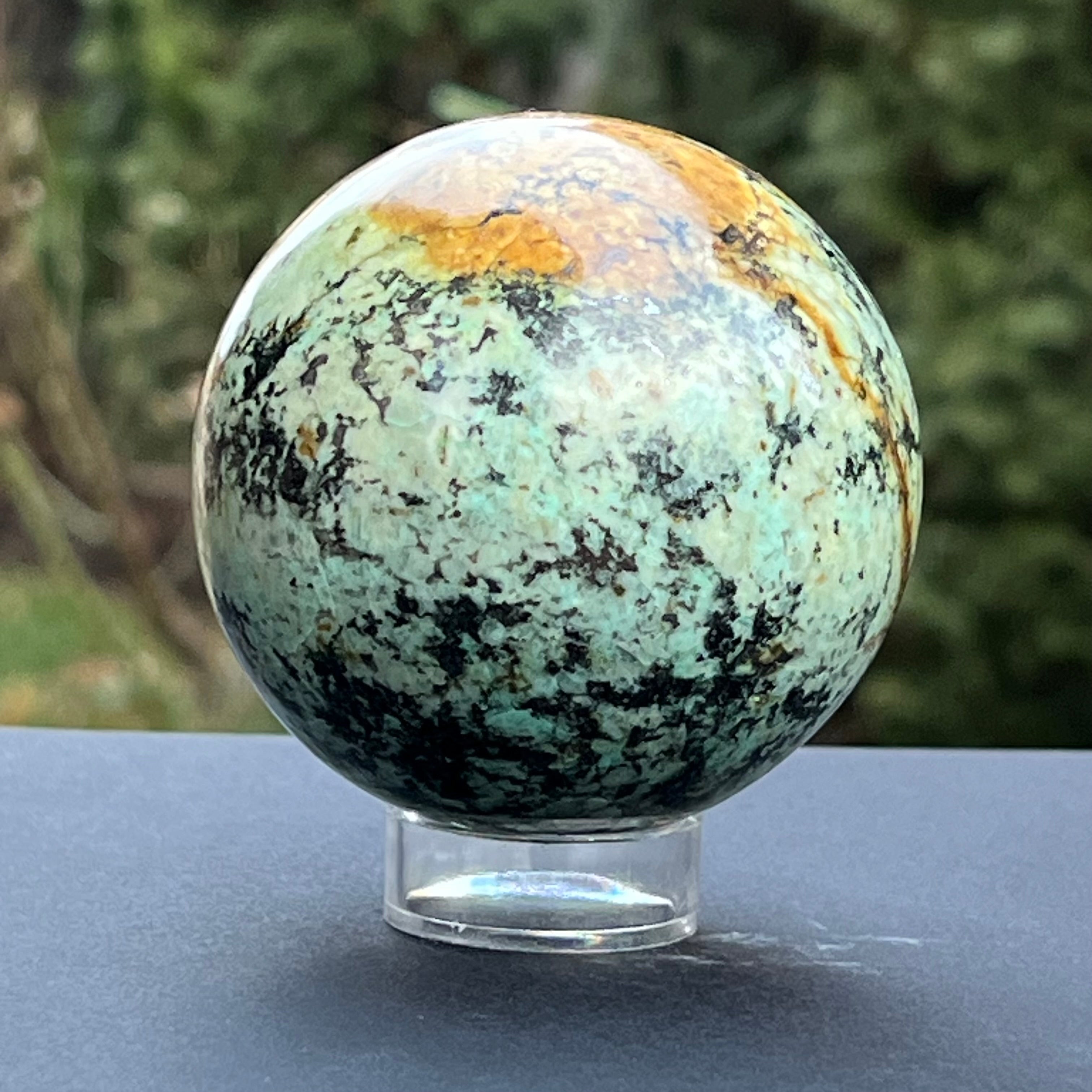 Estas esferas están creadas usando fragmentos de crisocola resultantes del proceso de minería, que luego se colocan en resina y se pulen hasta la perfección.