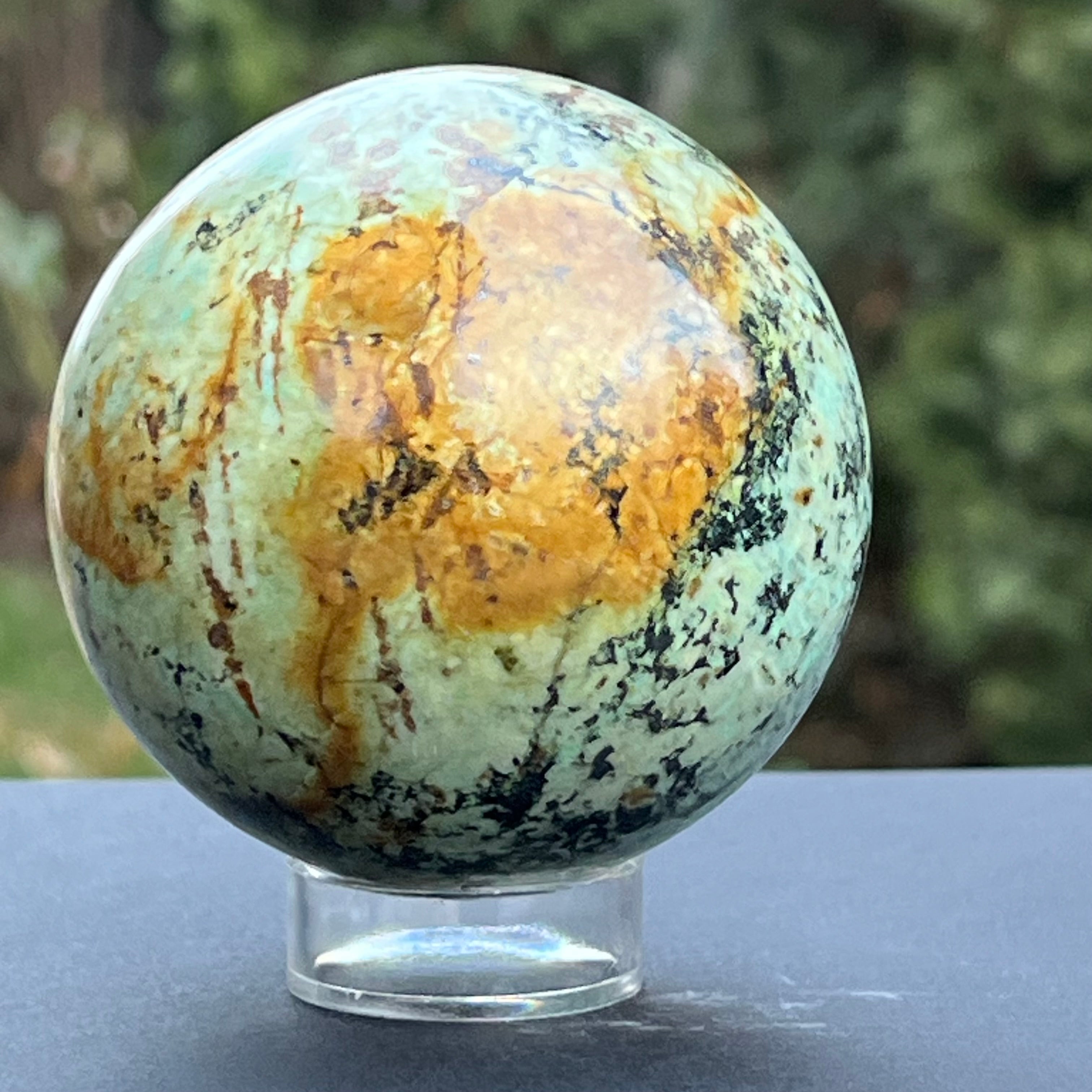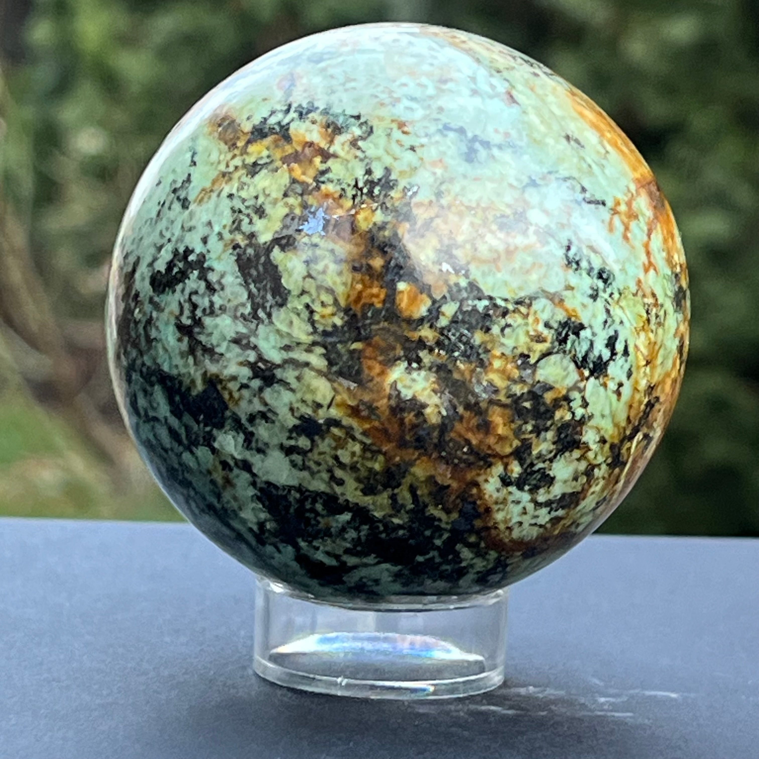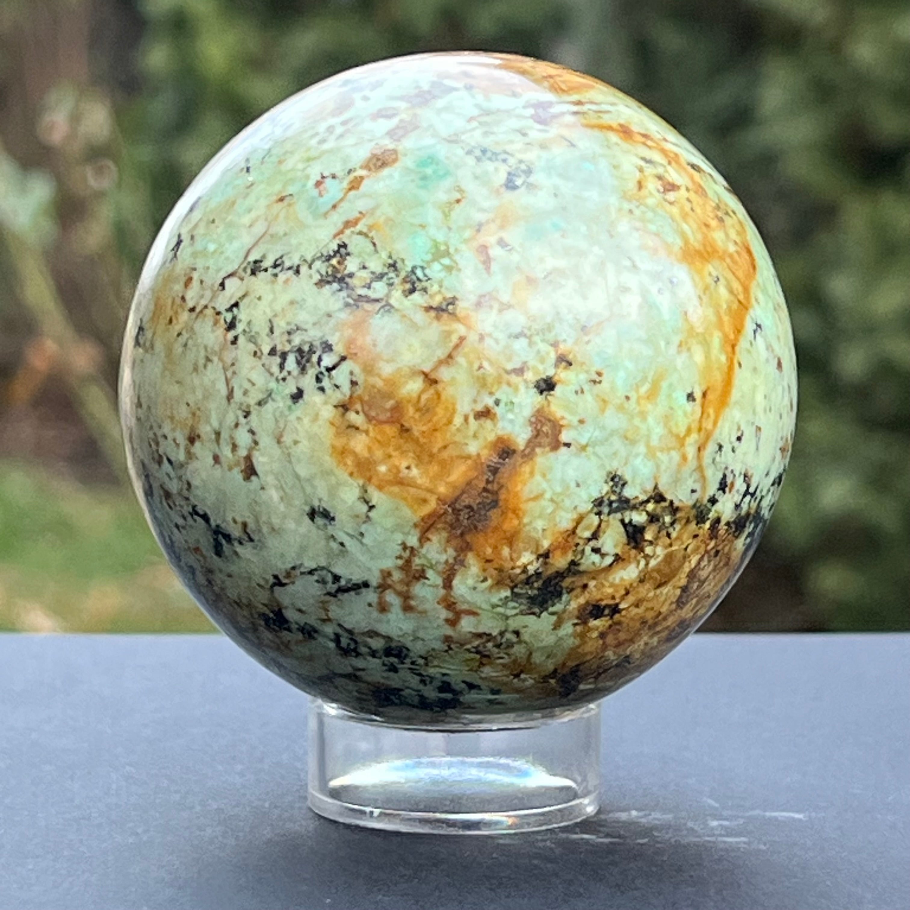 Estas esferas están creadas usando fragmentos de crisocola resultantes del proceso de minería, que luego se colocan en resina y se pulen hasta la perfección.