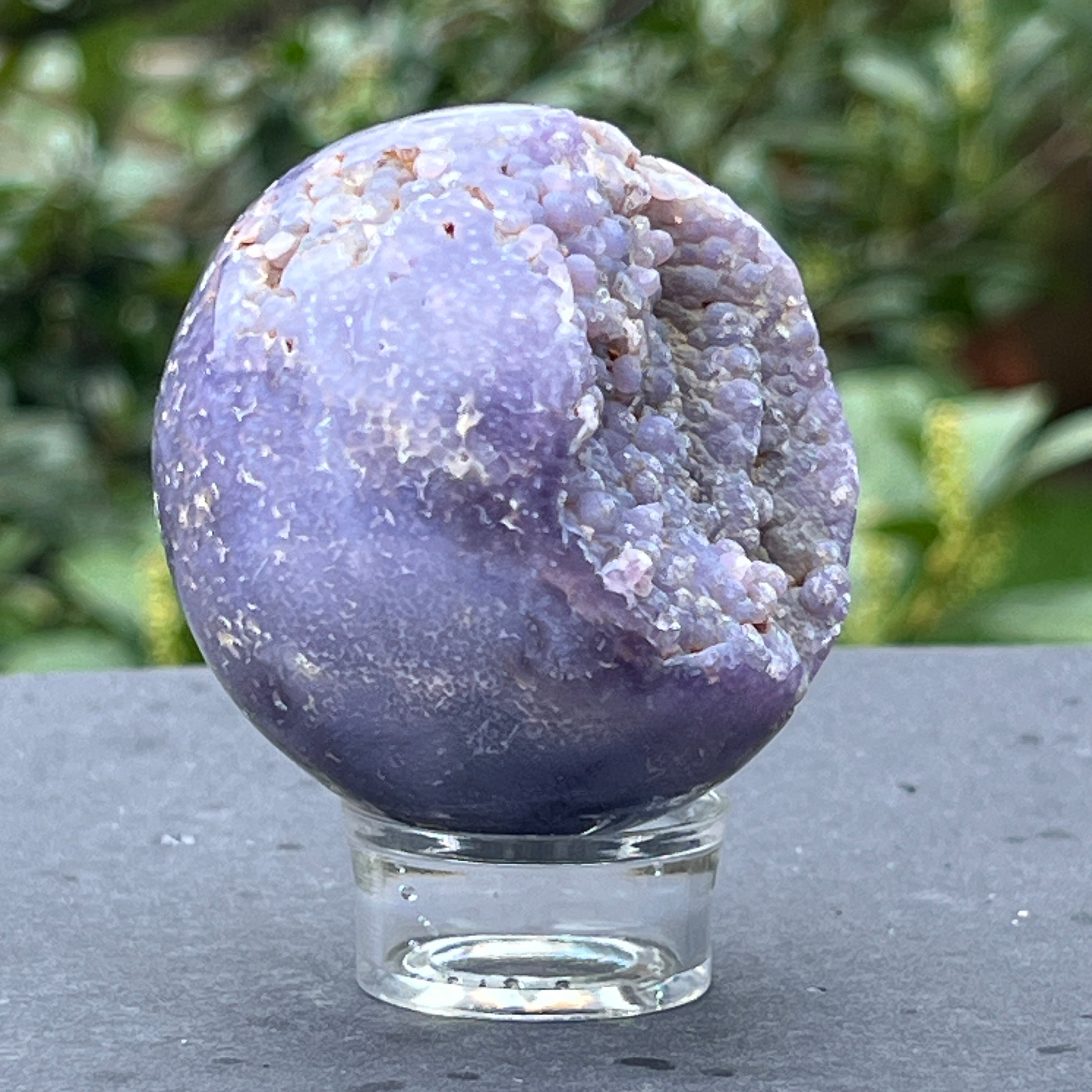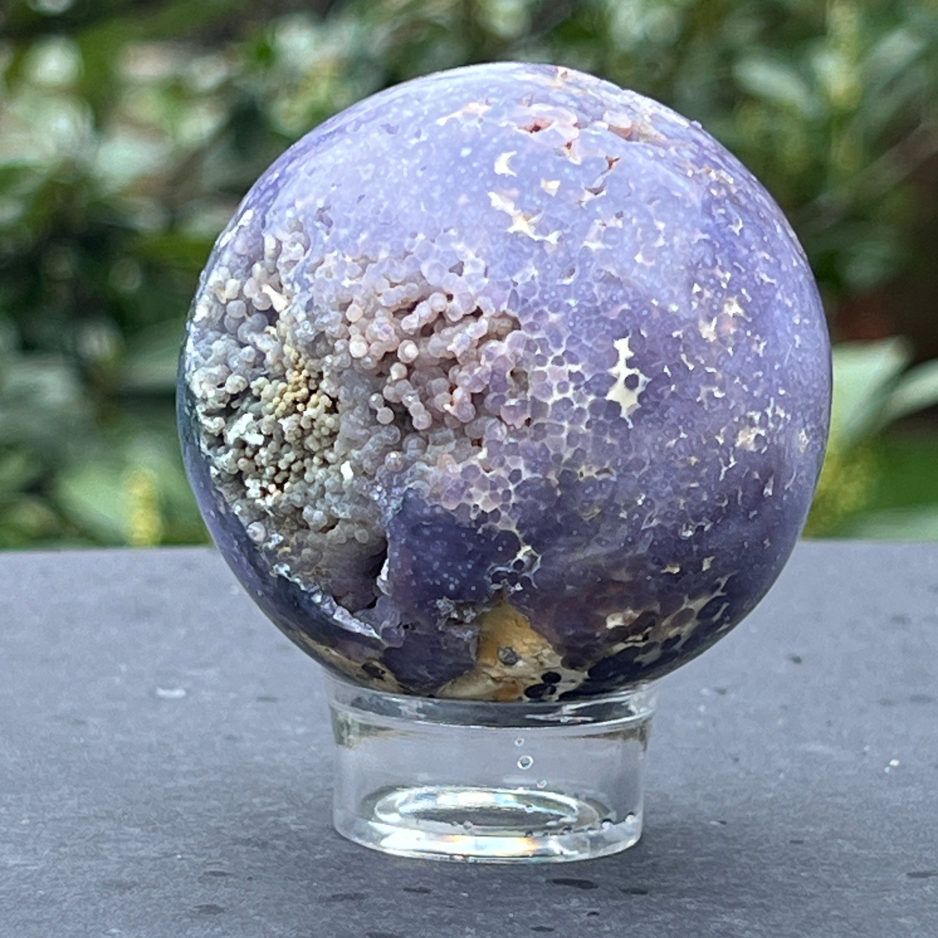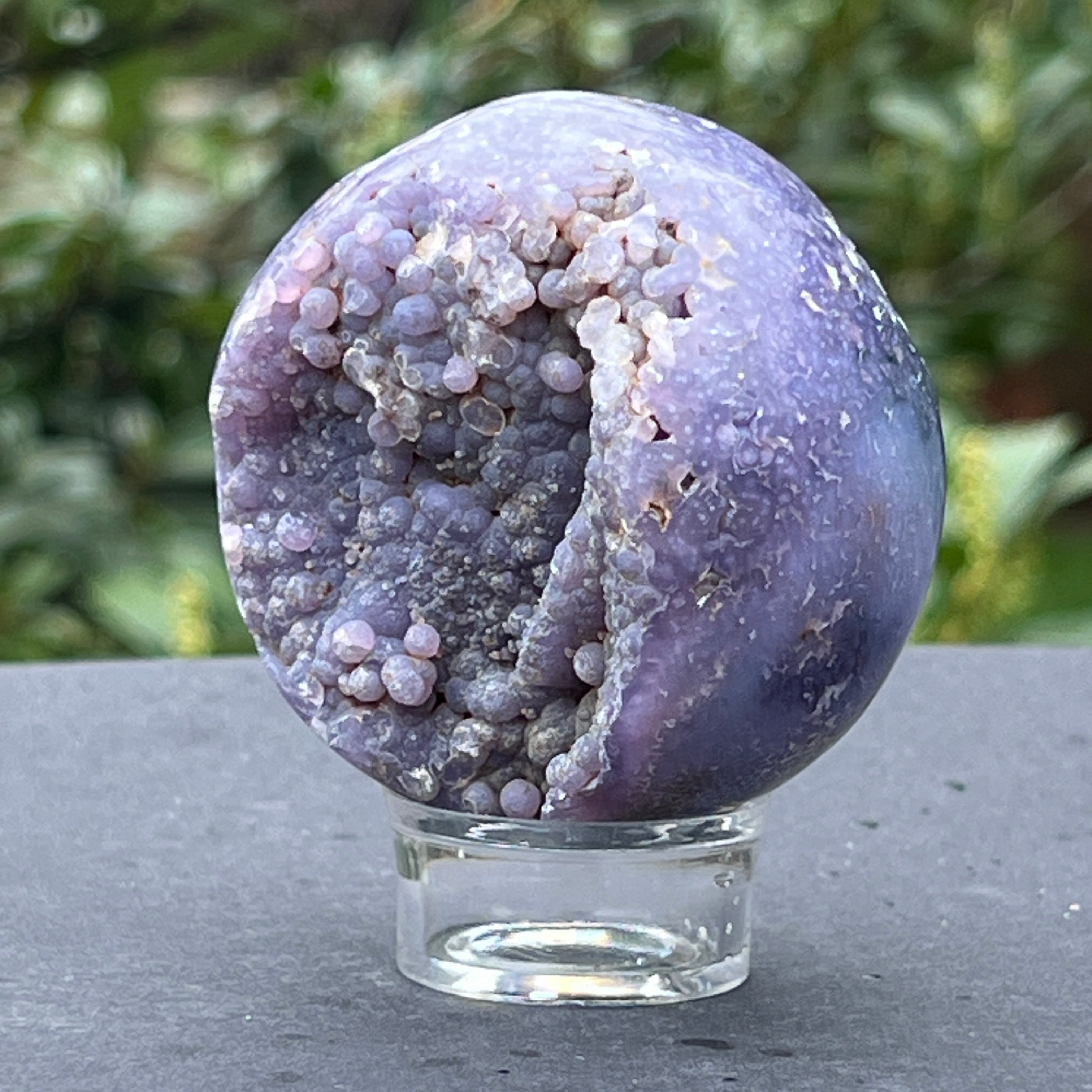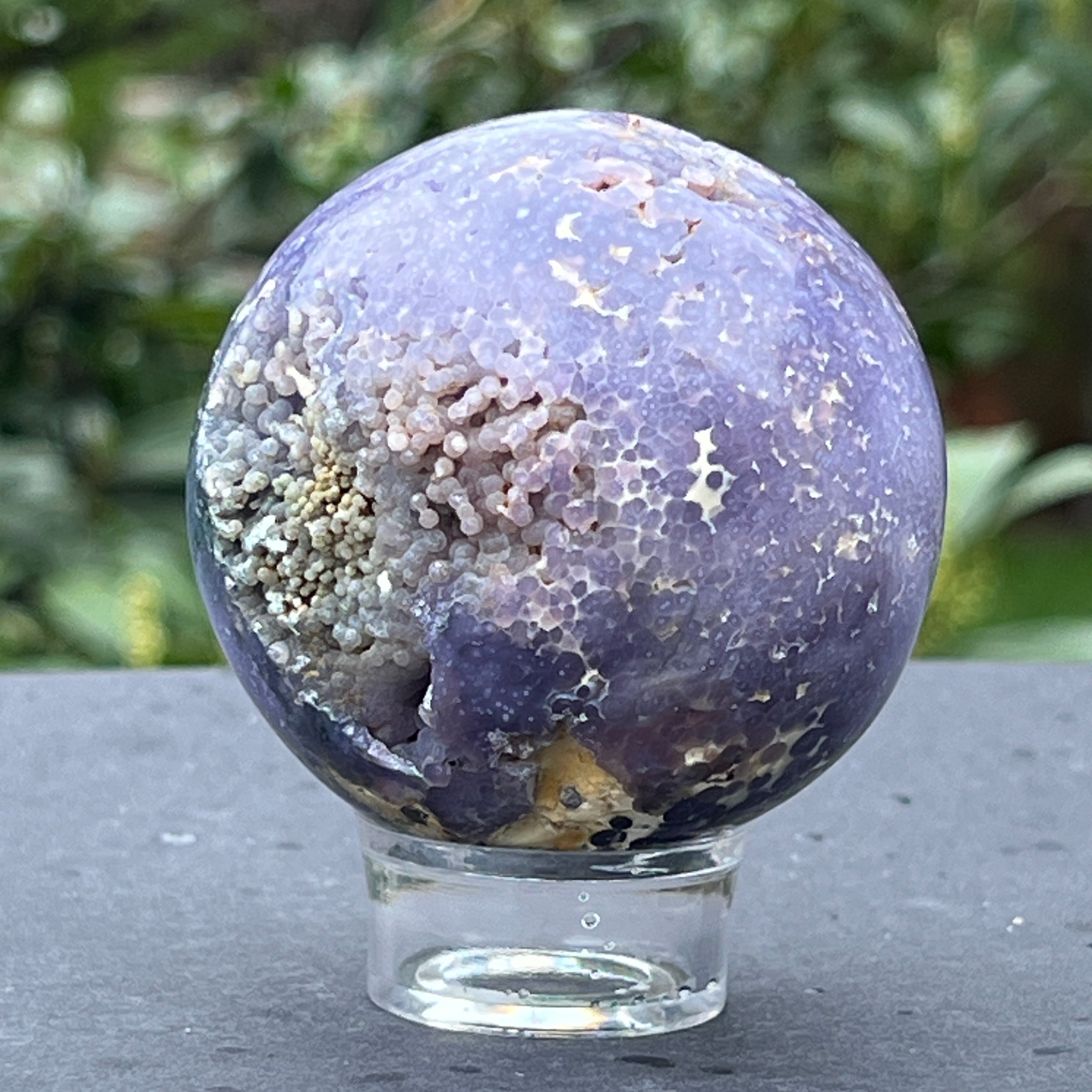 El ágata racimo se destaca por sus patrones únicos, que se asemejan a racimos de uvas. Estos patrones suelen ser de forma esférica o elíptica, dispuestos de manera regular o aleatoria sobre la superficie de la piedra. El color del ágata racimo puede variar desde tonos morados, rosas, azules, verdes y marrones hasta matices más neutros, como gris y blanco.