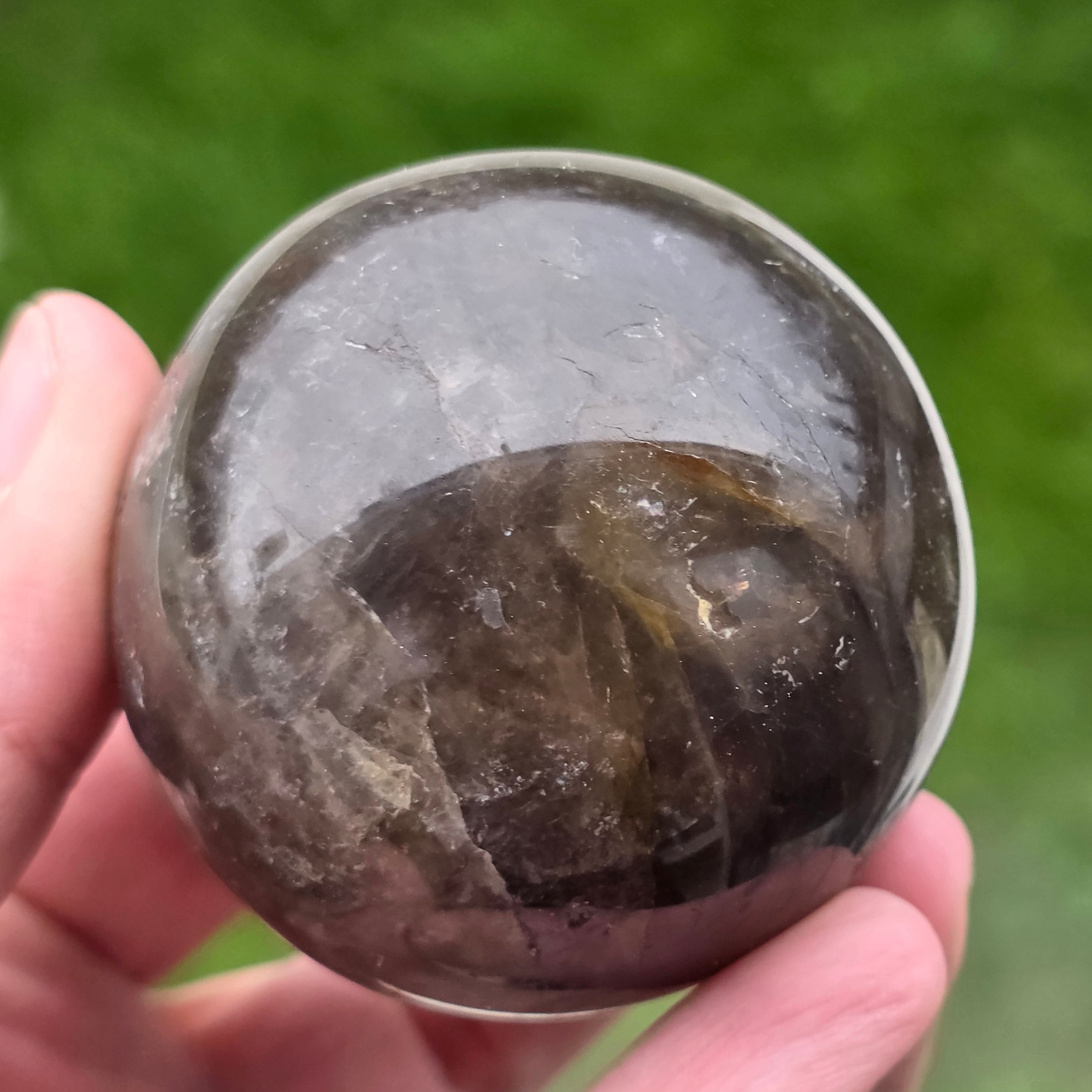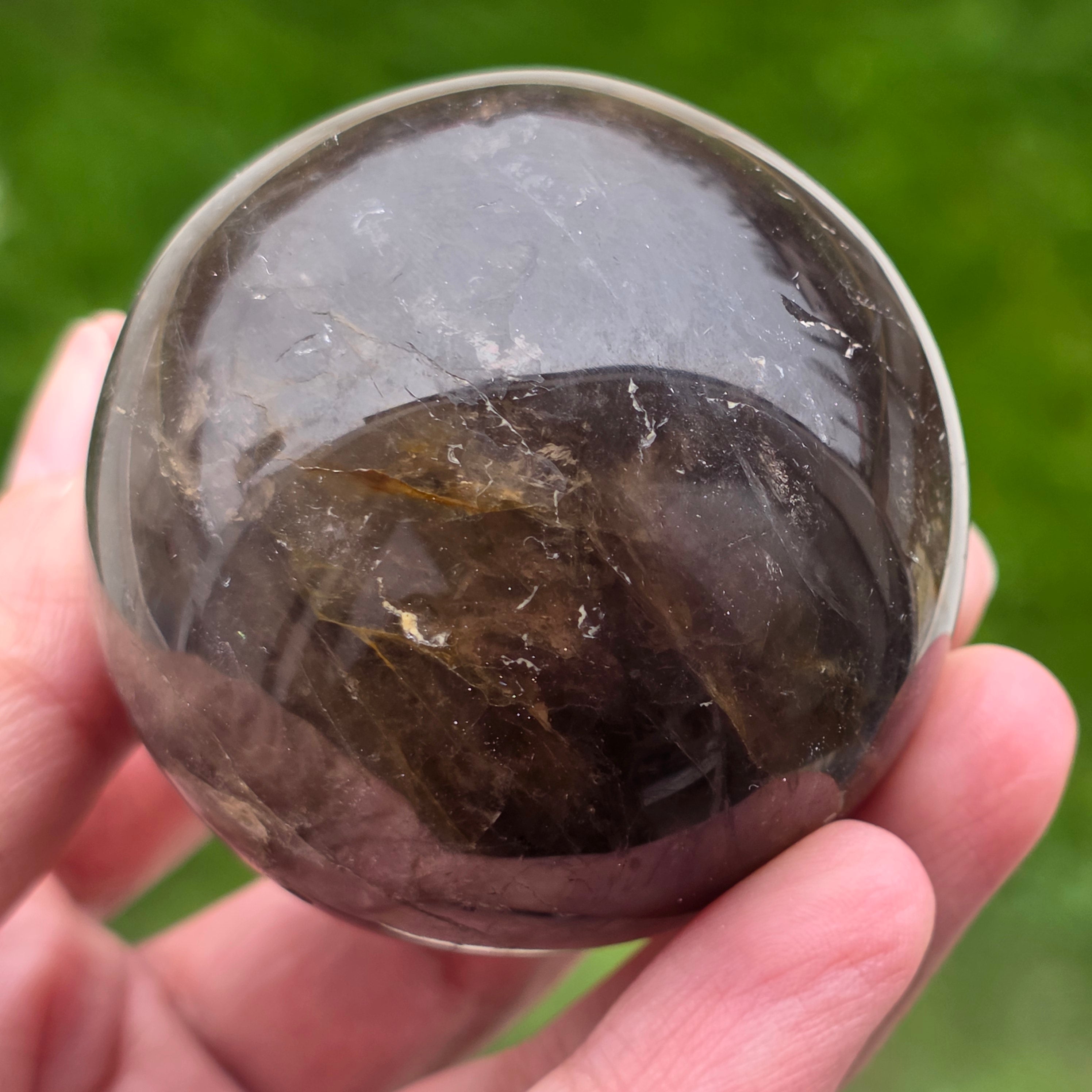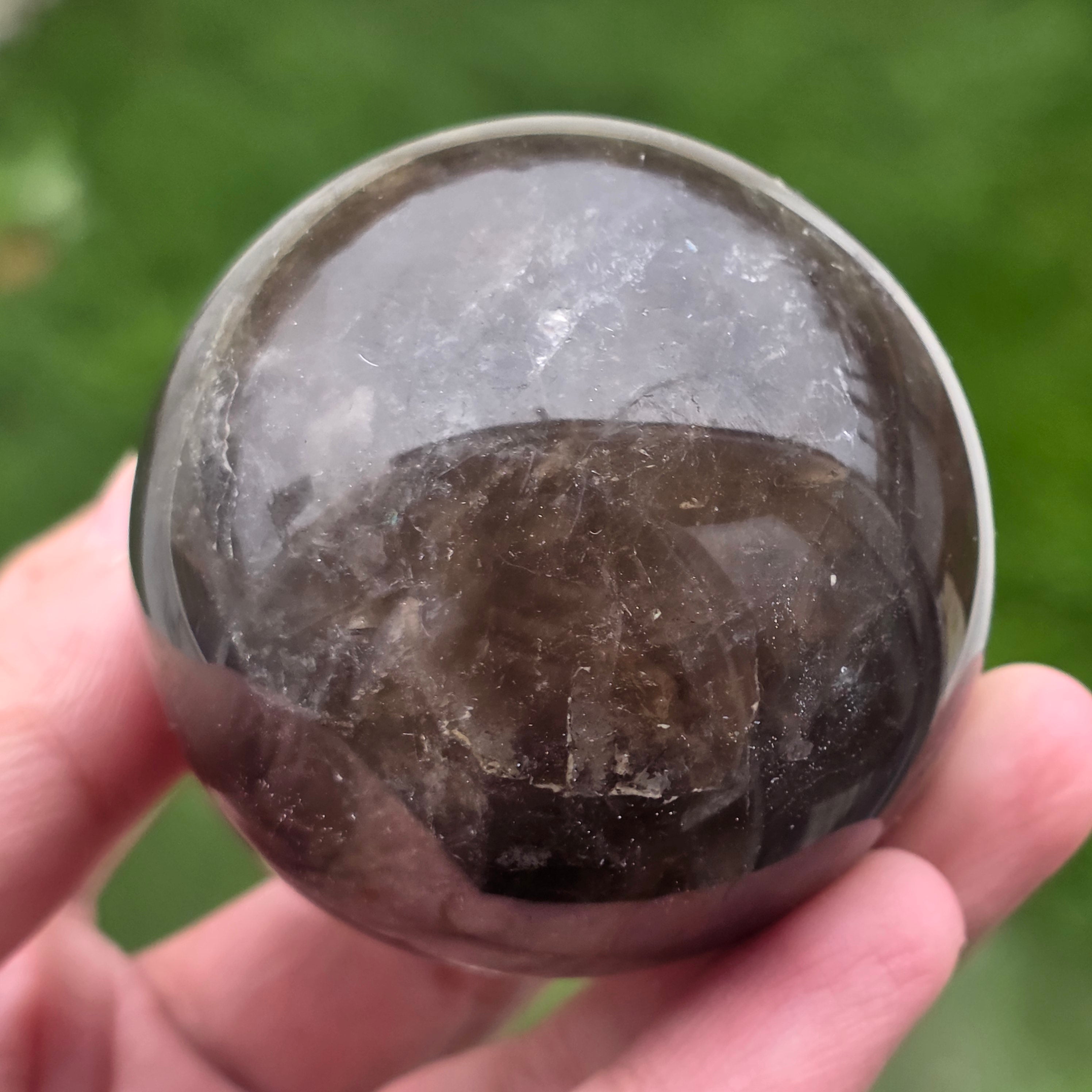 La esfera de cuarzo morión es una pieza poderosa y elegante, conocida por su tono profundo, similar al humo denso o al obsidiano transparente. El morión es la variedad más oscura de cuarzo ahumado, y en esta forma perfectamente redonda revela reflejos discretos, detalles internos finos y una presencia visual verdaderamente sofisticada.