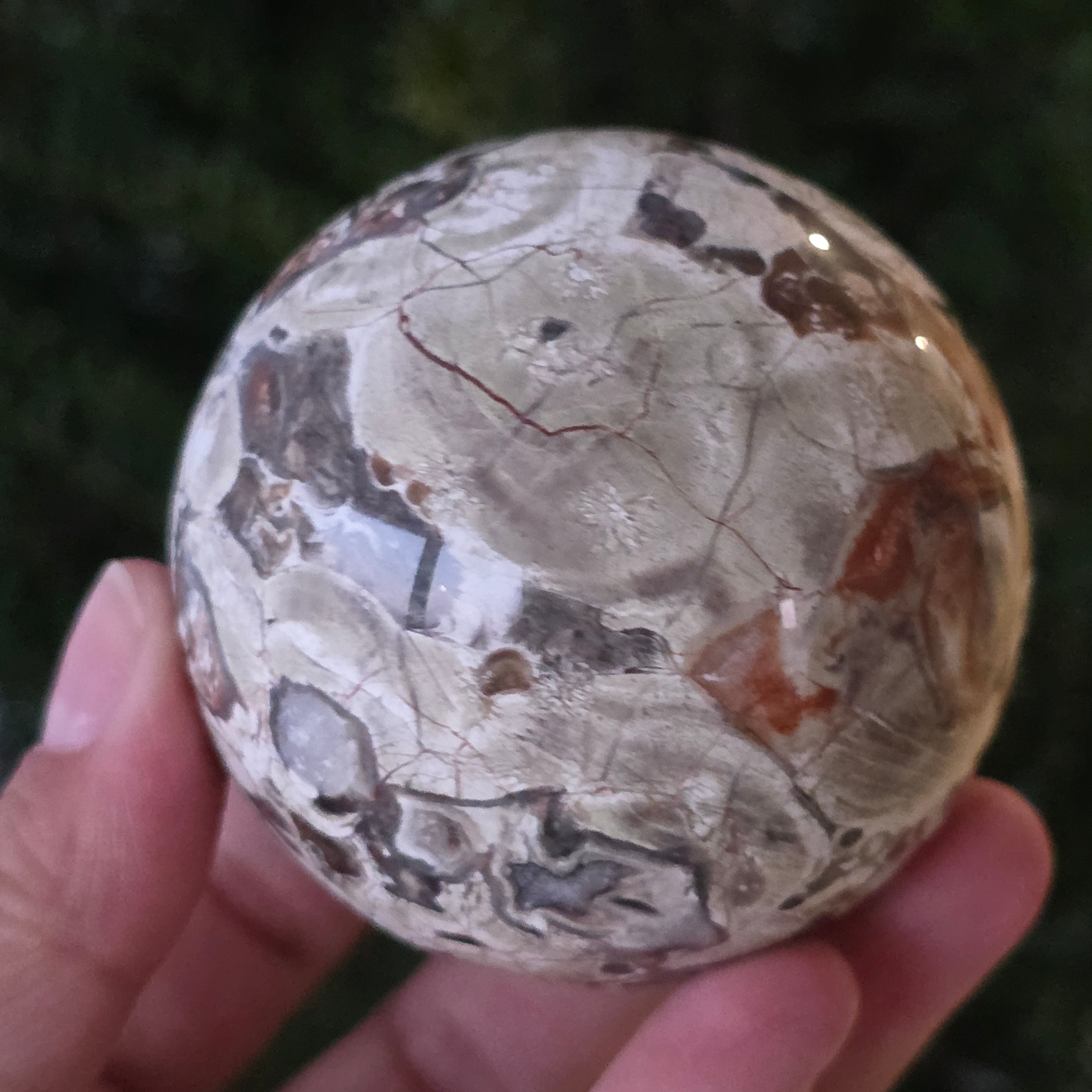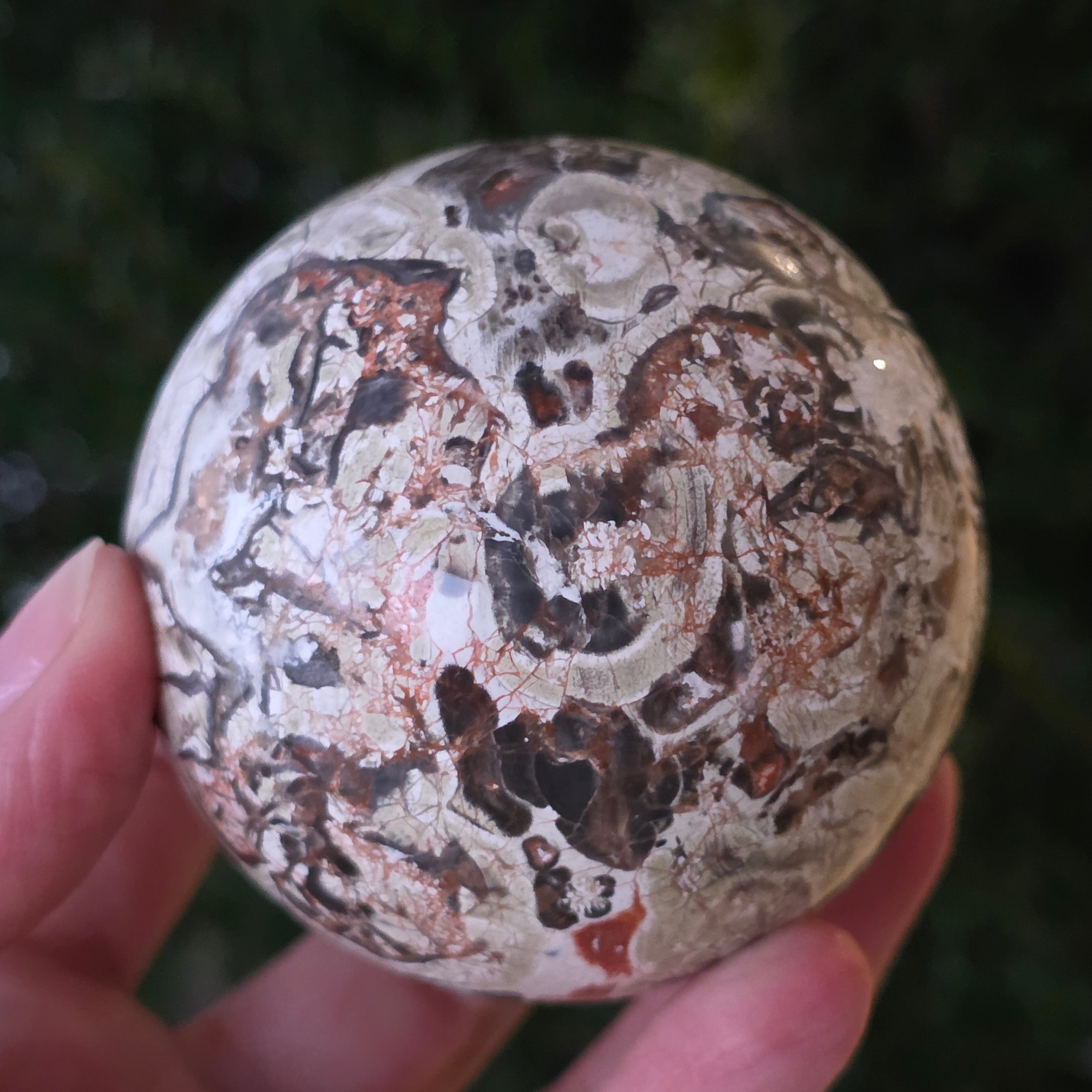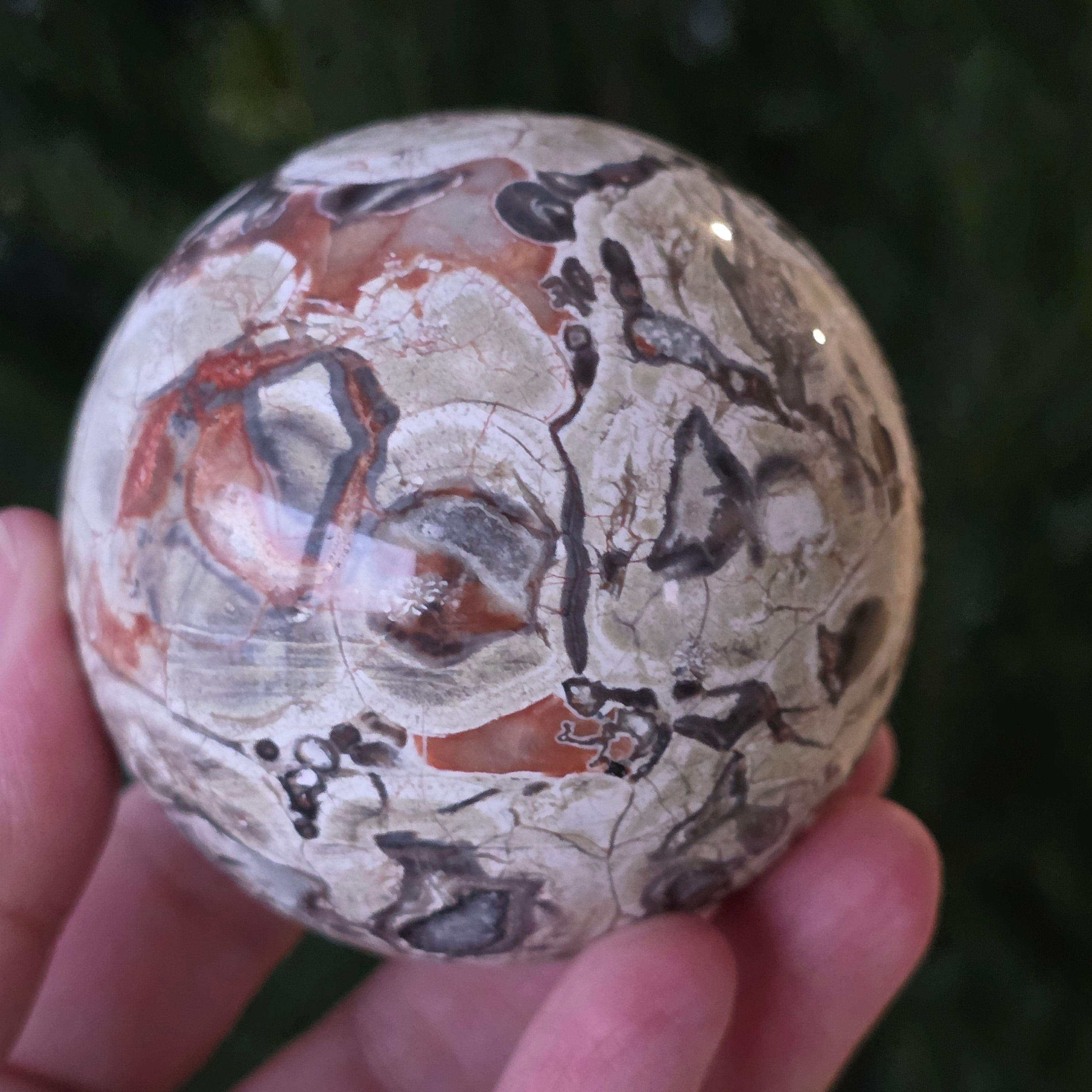 La esfera de jaspe rojo breccia está asociada con la estabilidad, la vitalidad y la conexión con el presente, combinando la energía protectora del jaspe con el dinamismo de los fragmentos unidos de manera natural. La forma esférica sugiere equilibrio y continuidad, apoyando un estado de seguridad interior y fuerza serena.