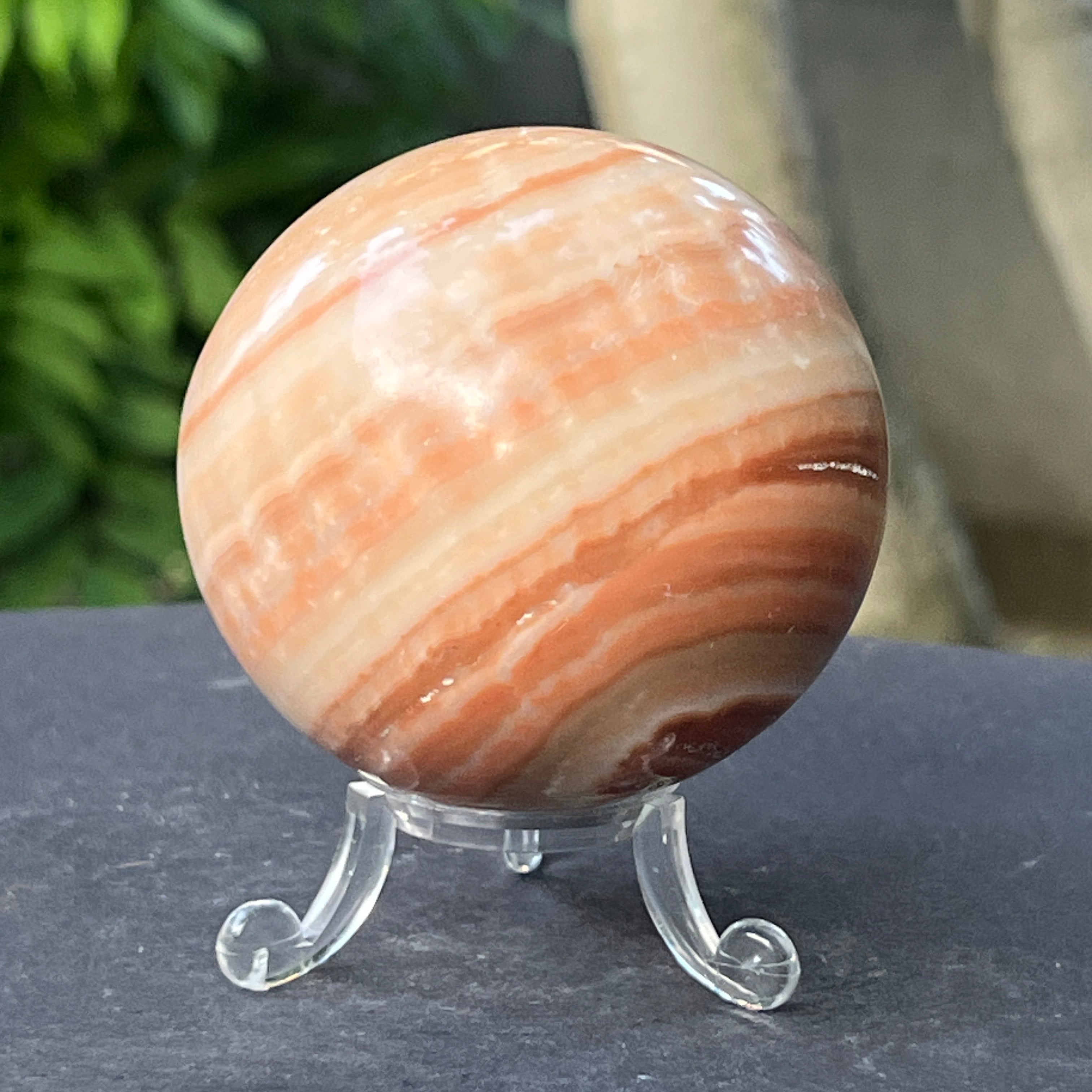 Una esfera cálida como el atardecer en un antiguo desierto, esta fascinante piedra combina el ónix naranja con delicadas vetas de calcita, en capas que parecen pintadas por el tiempo. Los matices vibrantes de naranja, miel y ámbar laten con la energía de la vida y aportan un toque de vitalidad a cualquier espacio. Es una pieza que despierta los sentidos e inspira la creatividad, pero al mismo tiempo mantiene un equilibrio profundo, anclado en la energía de la tierra.