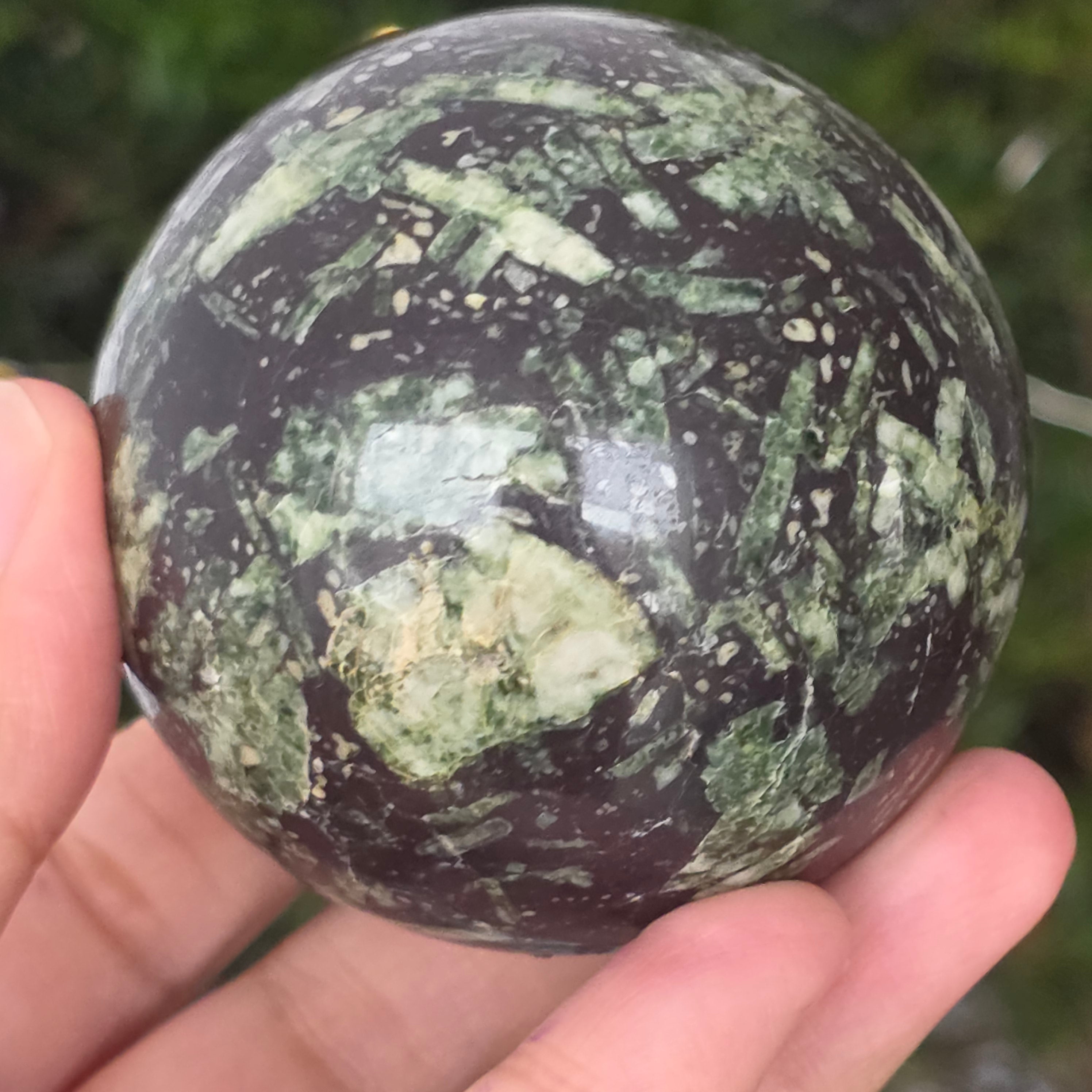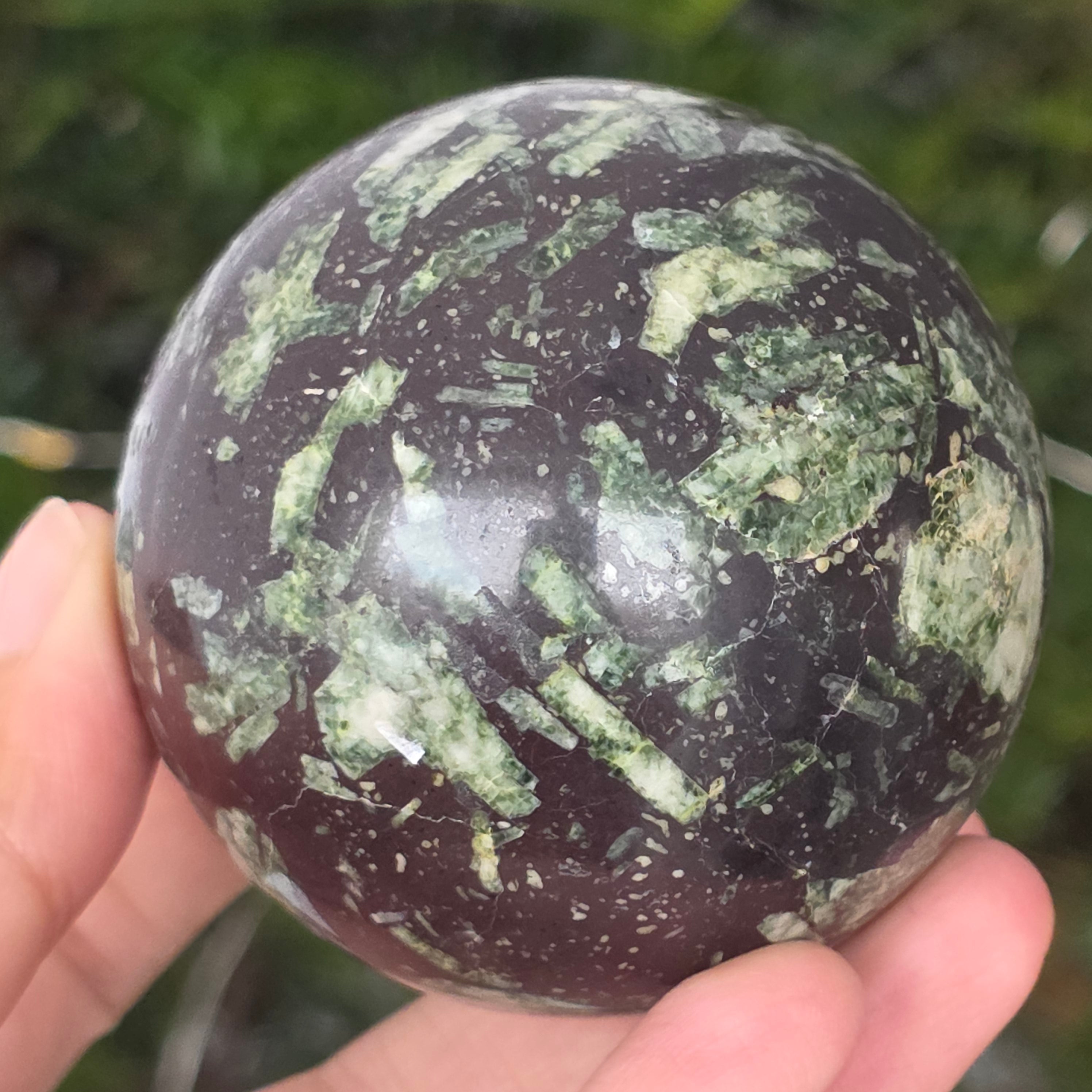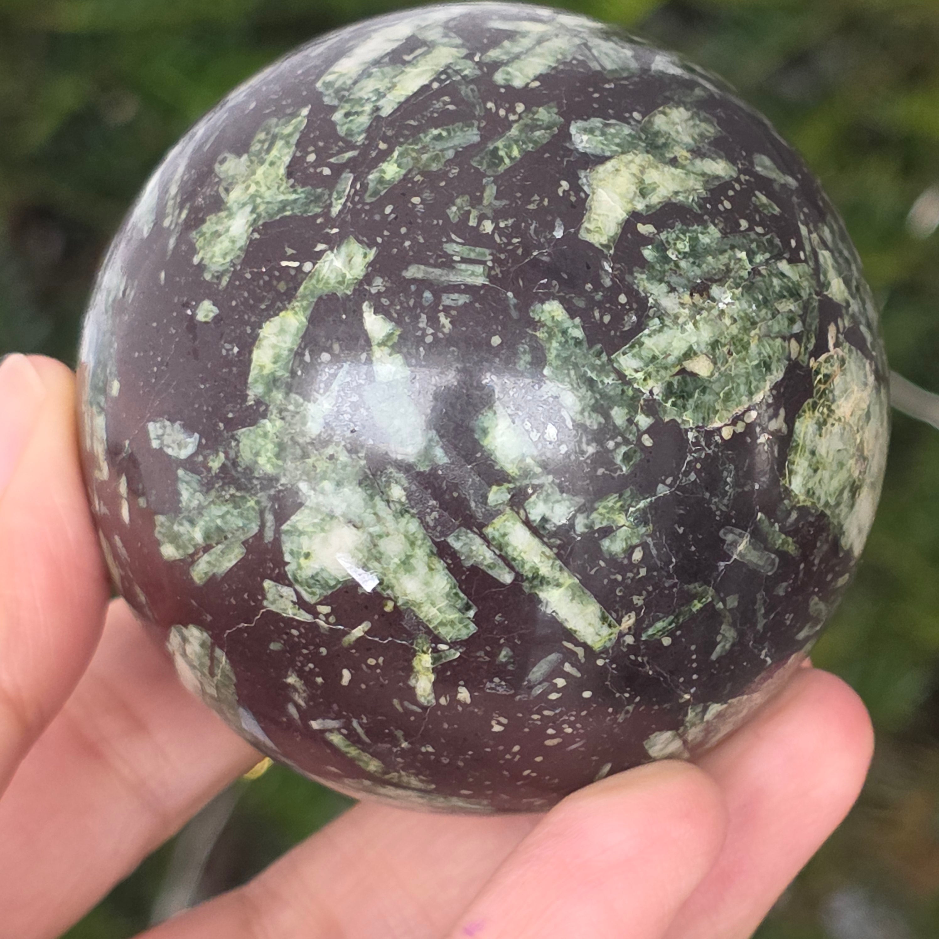 El porfirit negro con manchas verdes es una roca magmática decorativa, de color oscuro, caracterizada por una matriz negra intensa en la que se distinguen pequeños cristales verdes distribuidos de manera irregular. Su aspecto contrastante y texturizado le confiere un aire misterioso y elegante, siendo apreciado tanto en colecciones de minerales como en objetos decorativos o revestimientos.