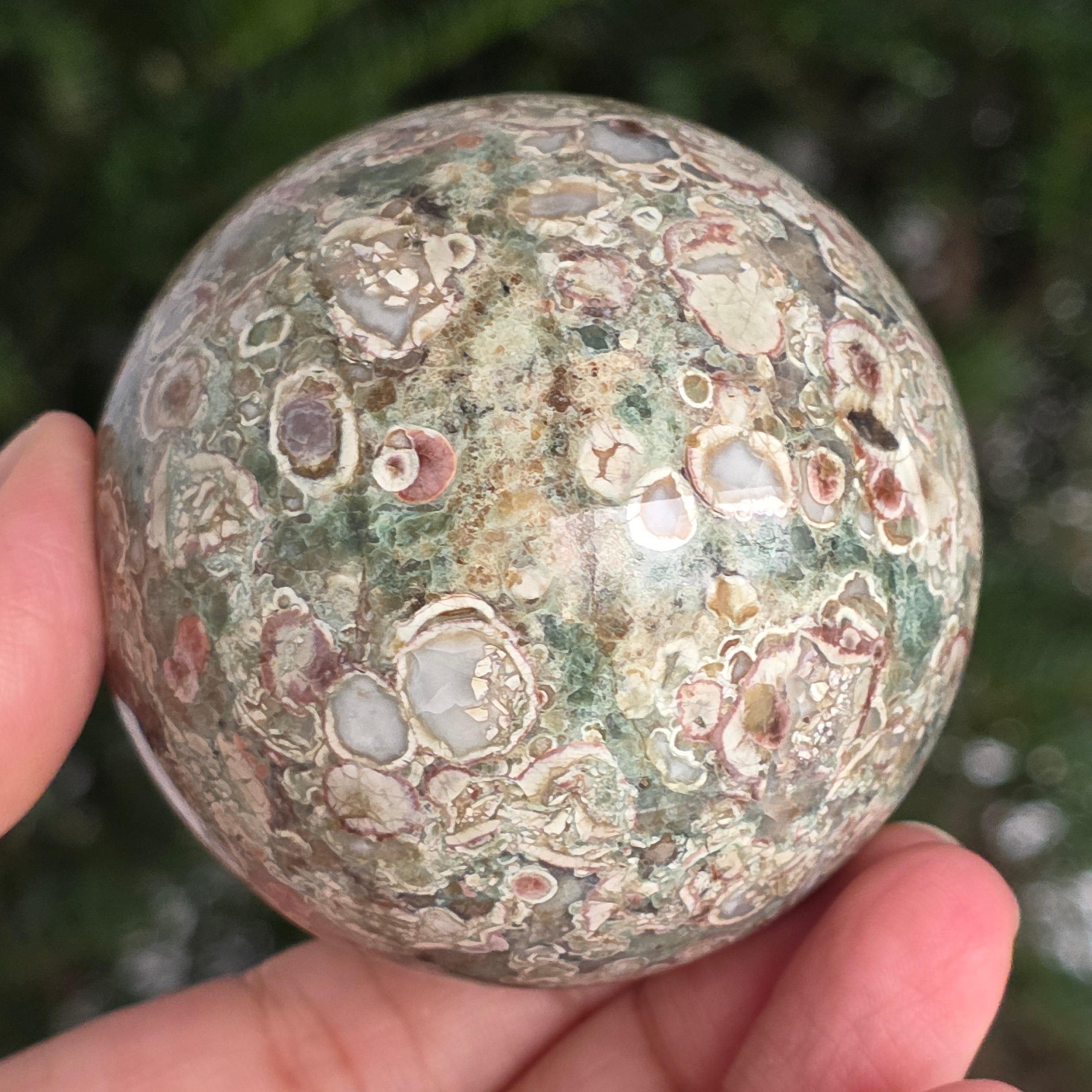 Una esfera que lleva en sí las huellas de un planeta en formación. Las texturas vivas y los colores terrosos de la riolita natural – tonalidades de verde musgo, beige, marrón y gris volcánico – se entrelazan en un baile hipnótico de formas y líneas, como un mapa mineral del mundo interior.