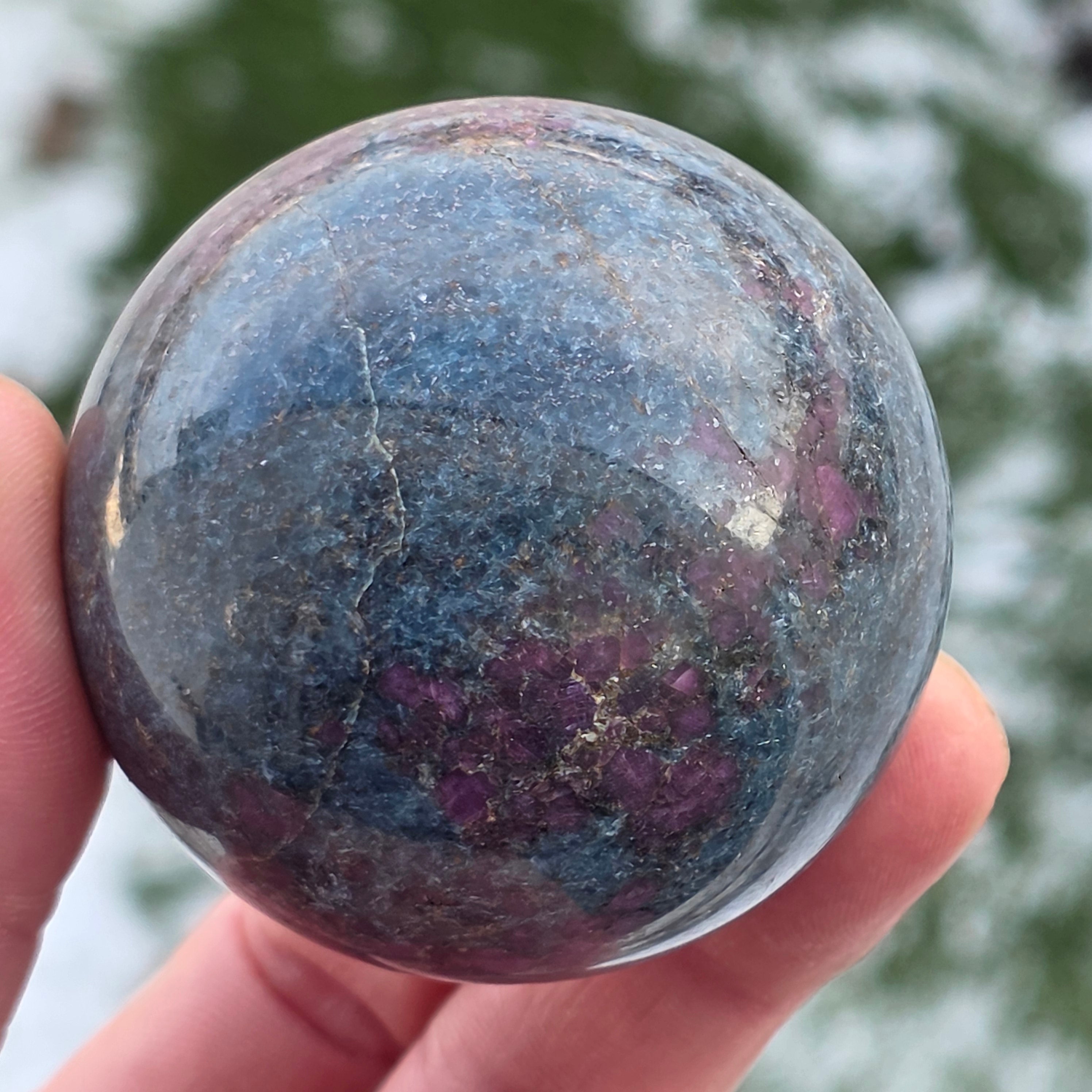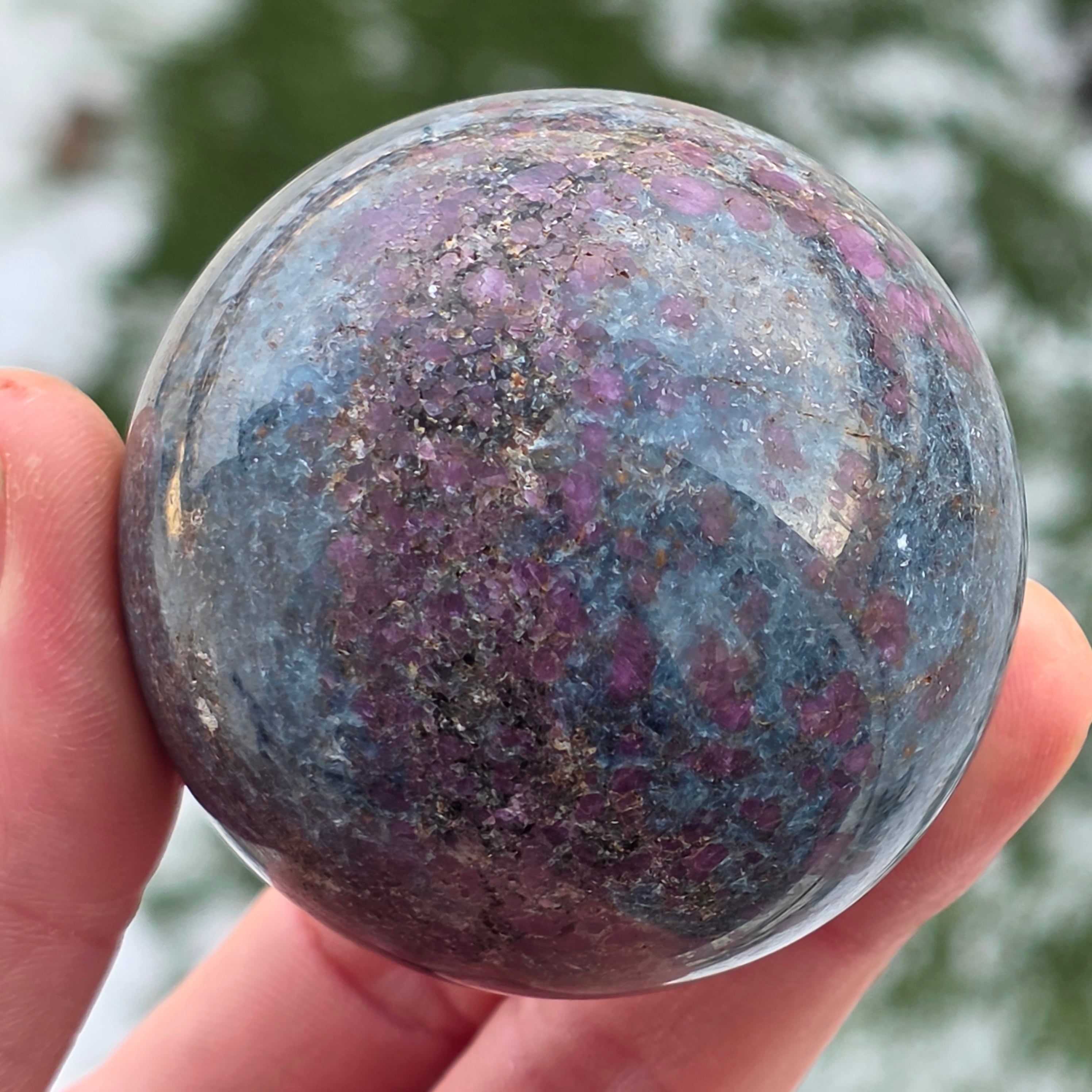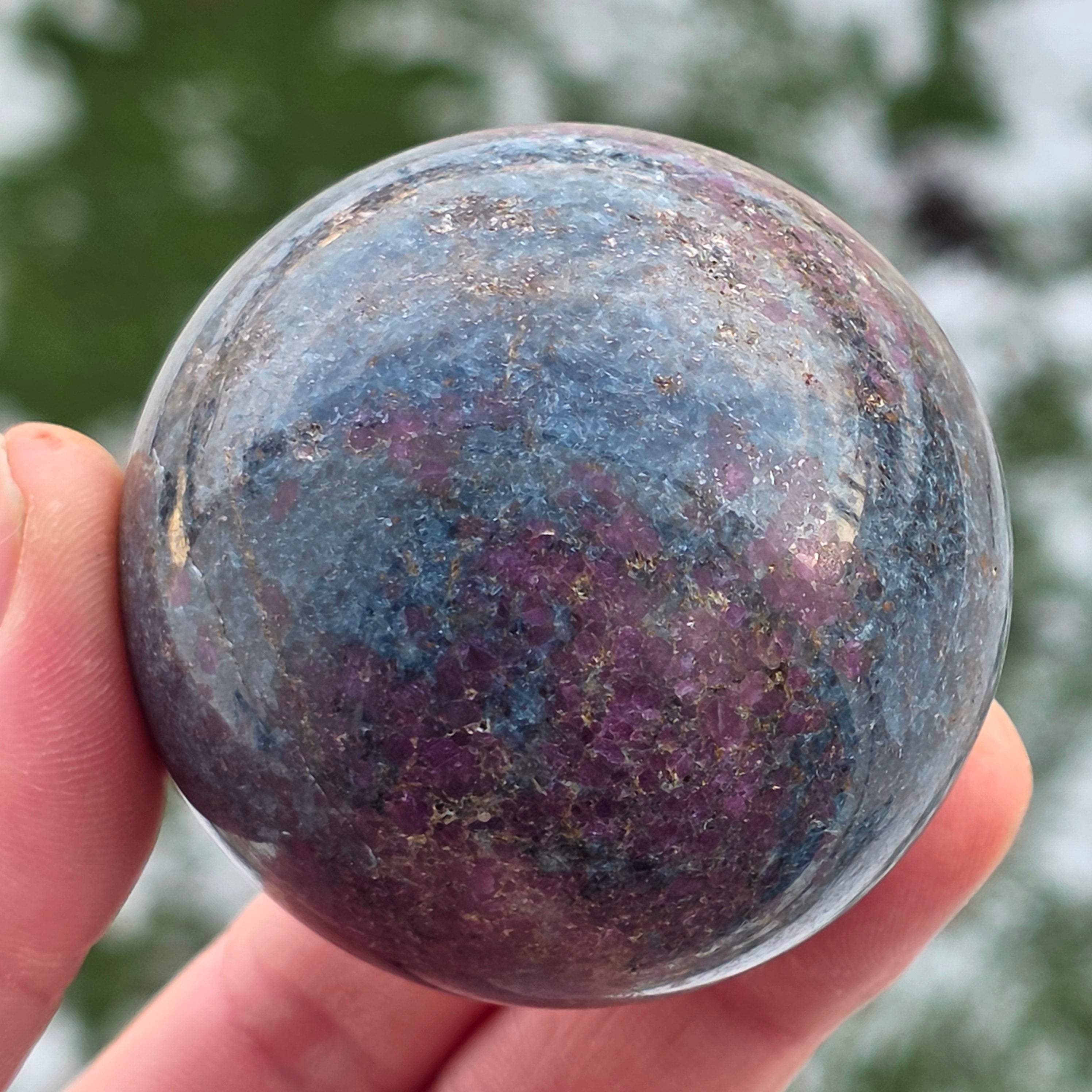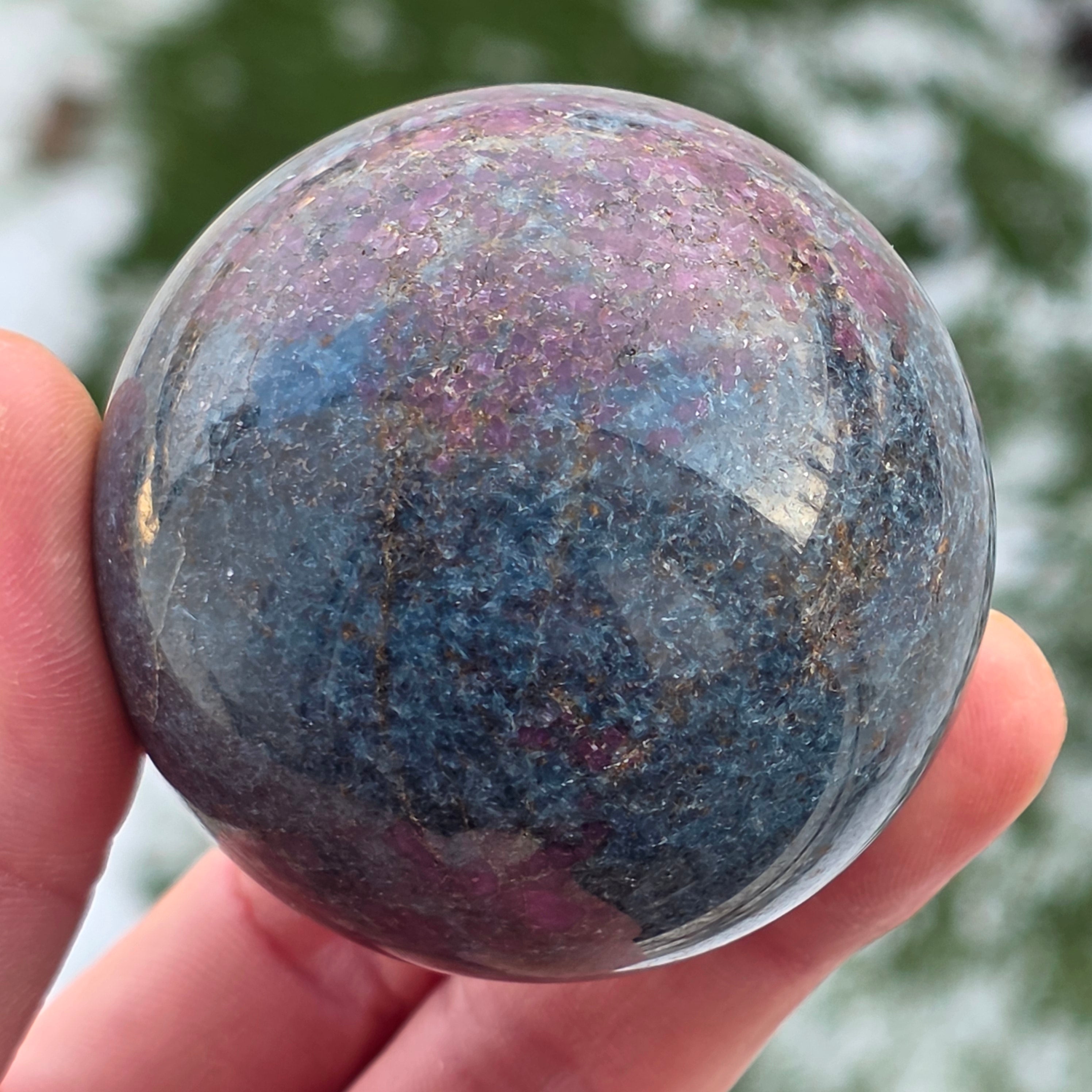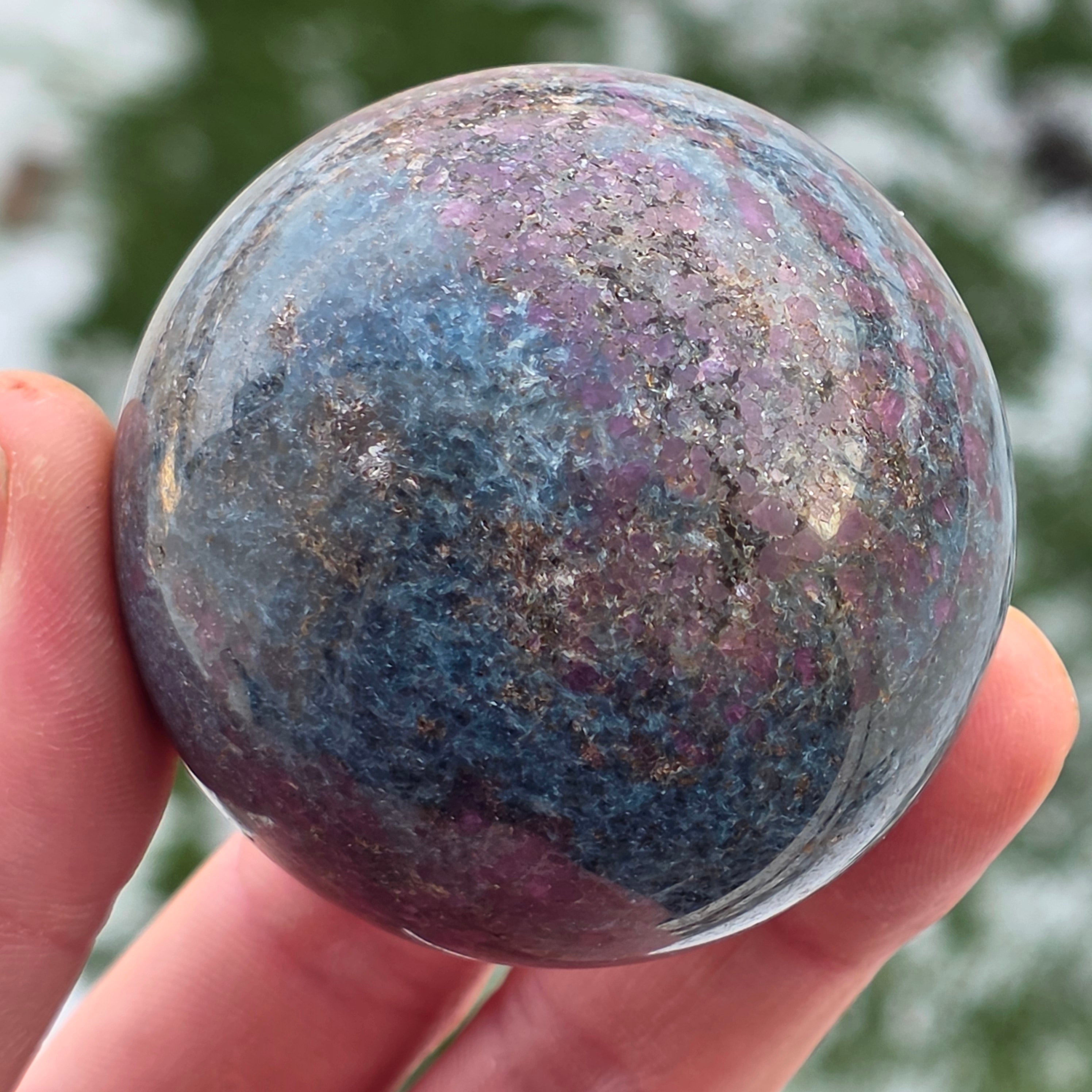 La esfera de rubí en fucsita con cianita reúne tres energías complementarias: la vitalidad del rubí, la calma regeneradora de la fucsita y la claridad de la cianita. La forma esférica sostiene el equilibrio entre pasión, tranquilidad y expresión auténtica, estando asociada con la armonización de las emociones y el fortalecimiento de la conexión entre el corazón y la mente.