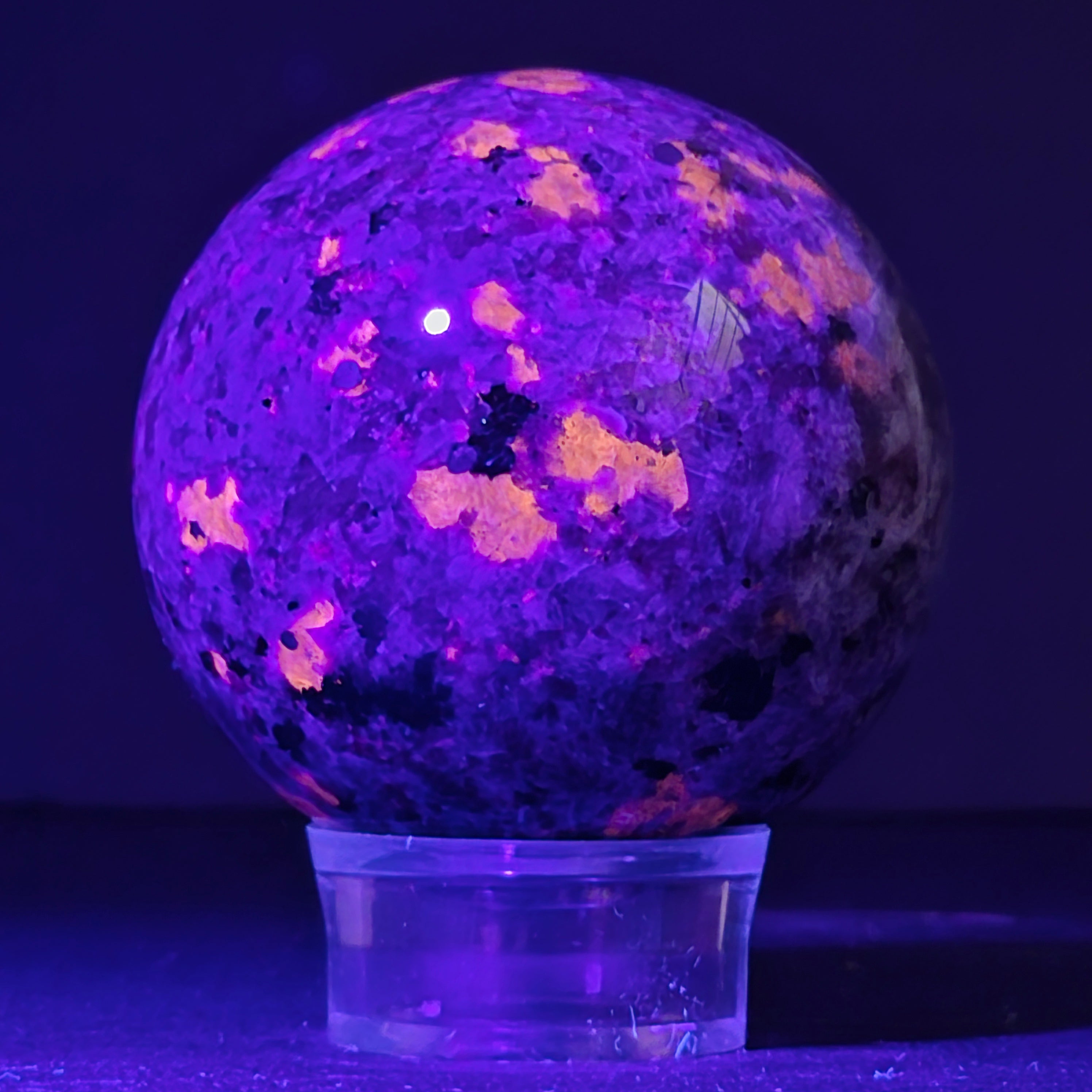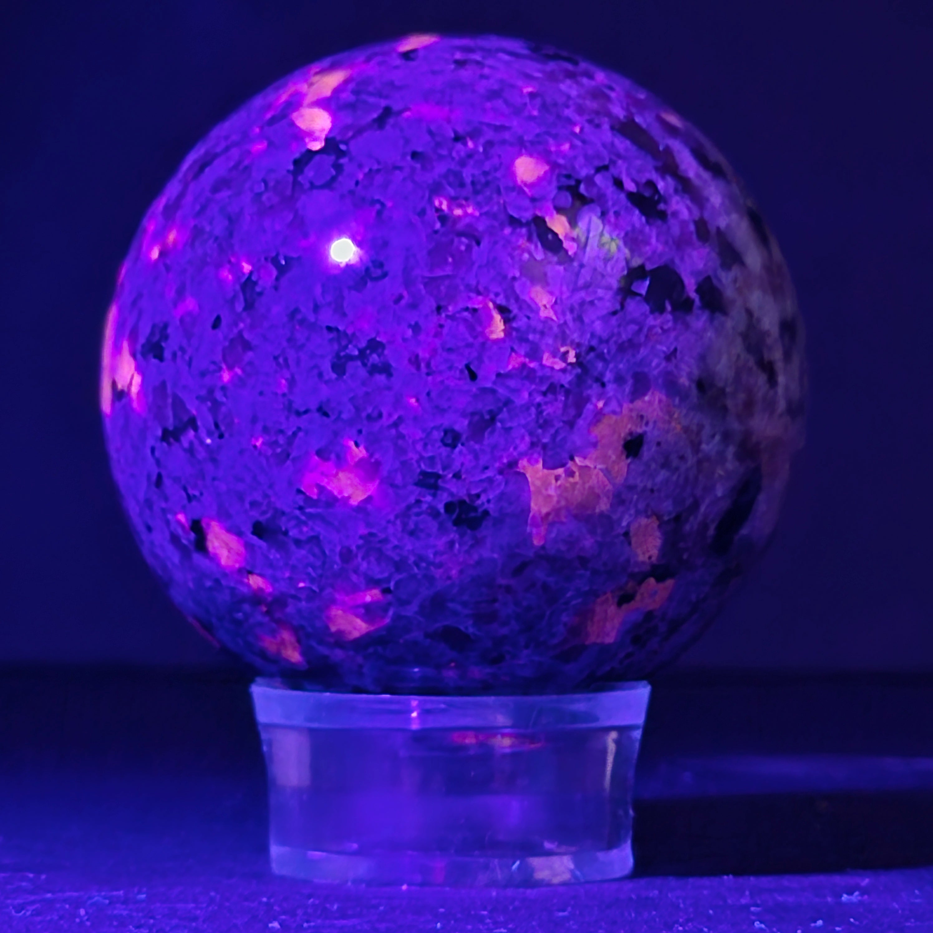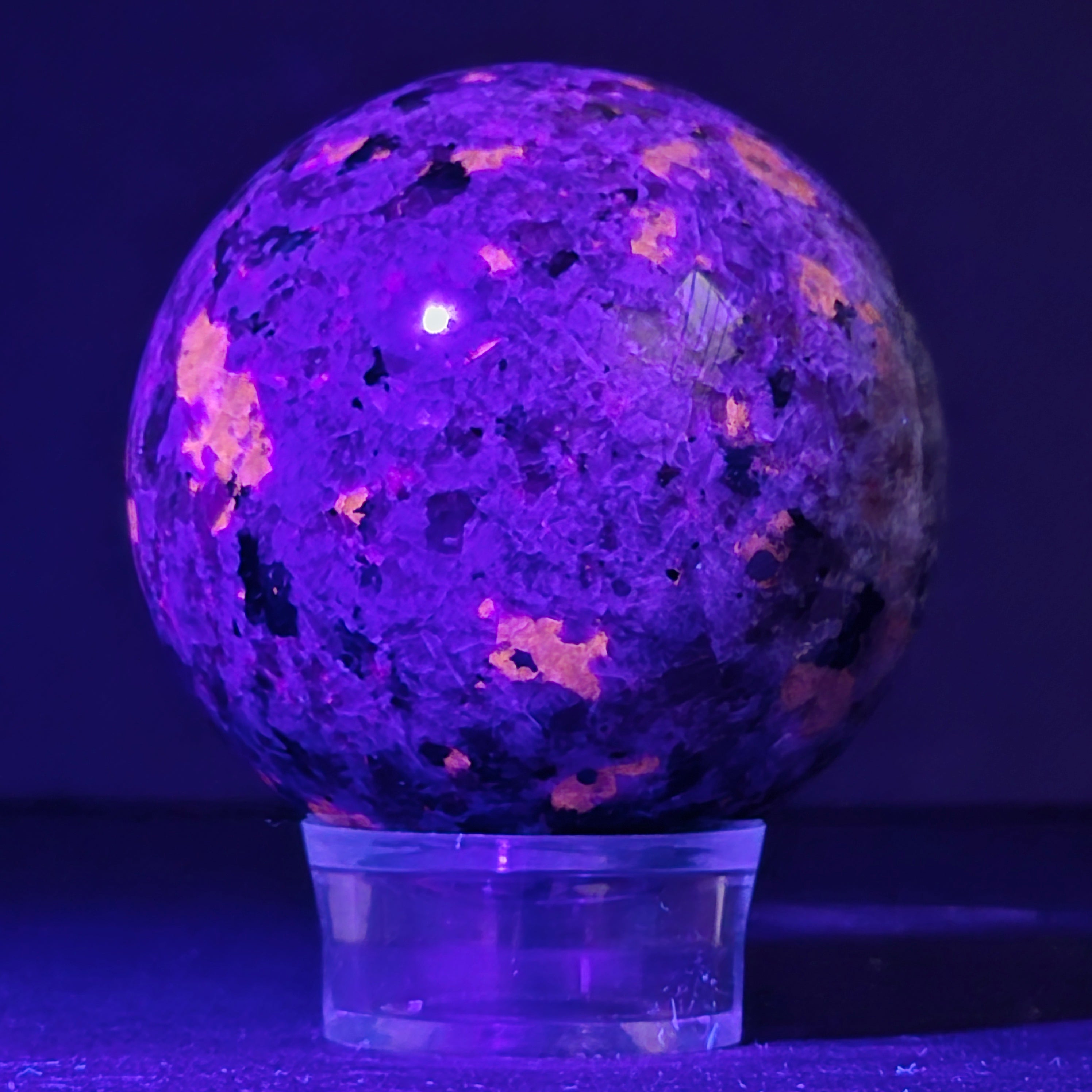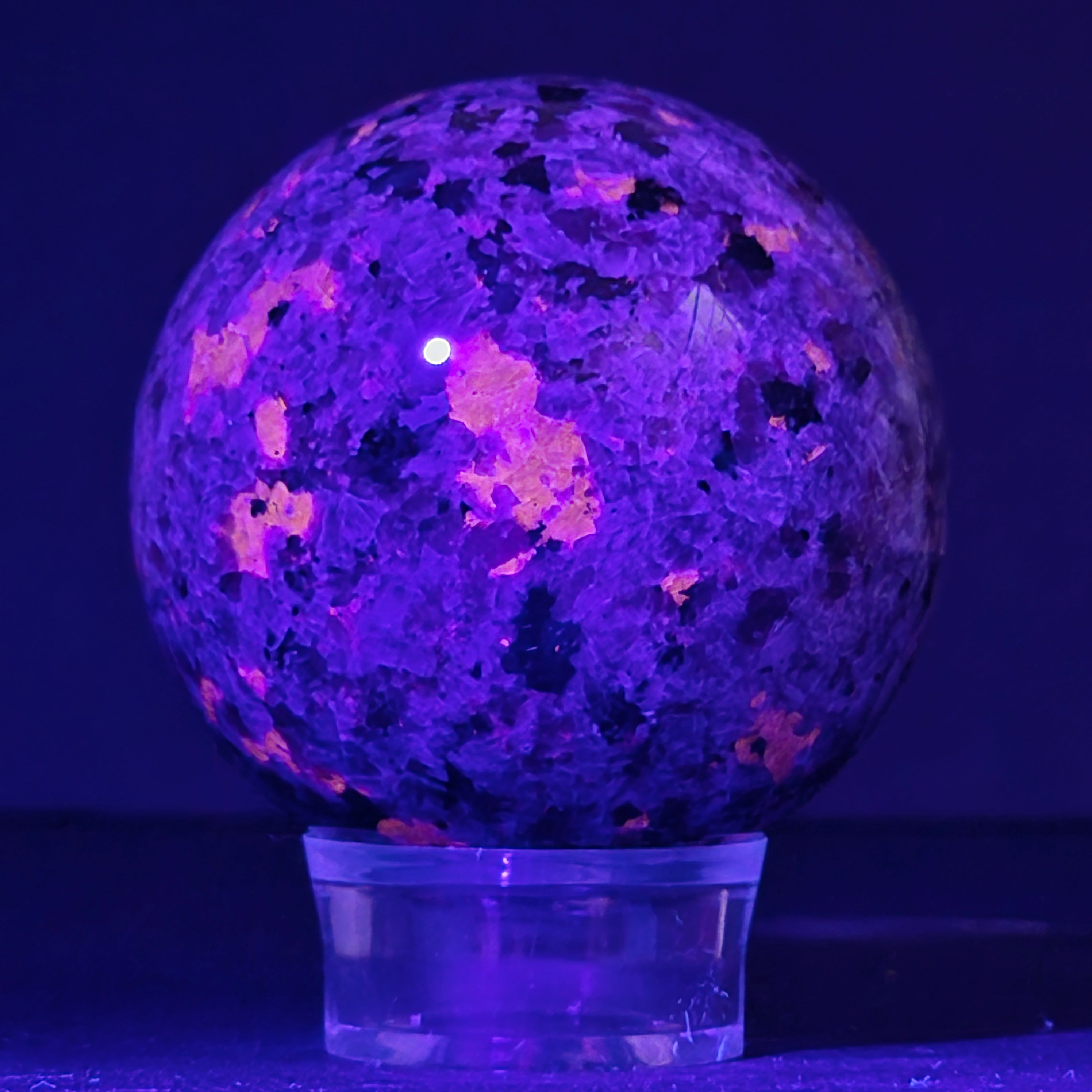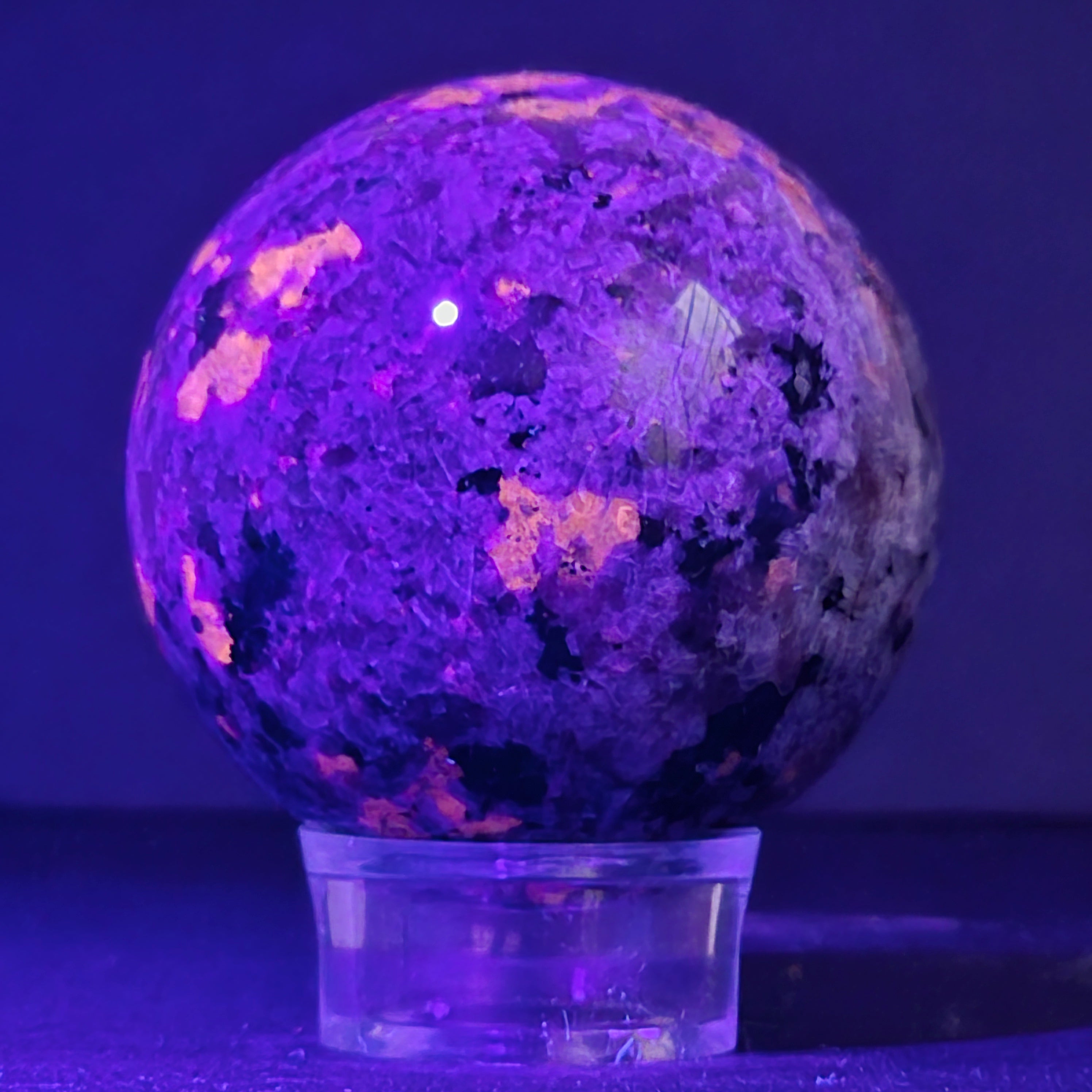 Geológicamente hablando, la yooperlita es una roca sienítica rica en sodalita – y es precisamente la sodalita la que reacciona a la UV y produce ese efecto espectacular.