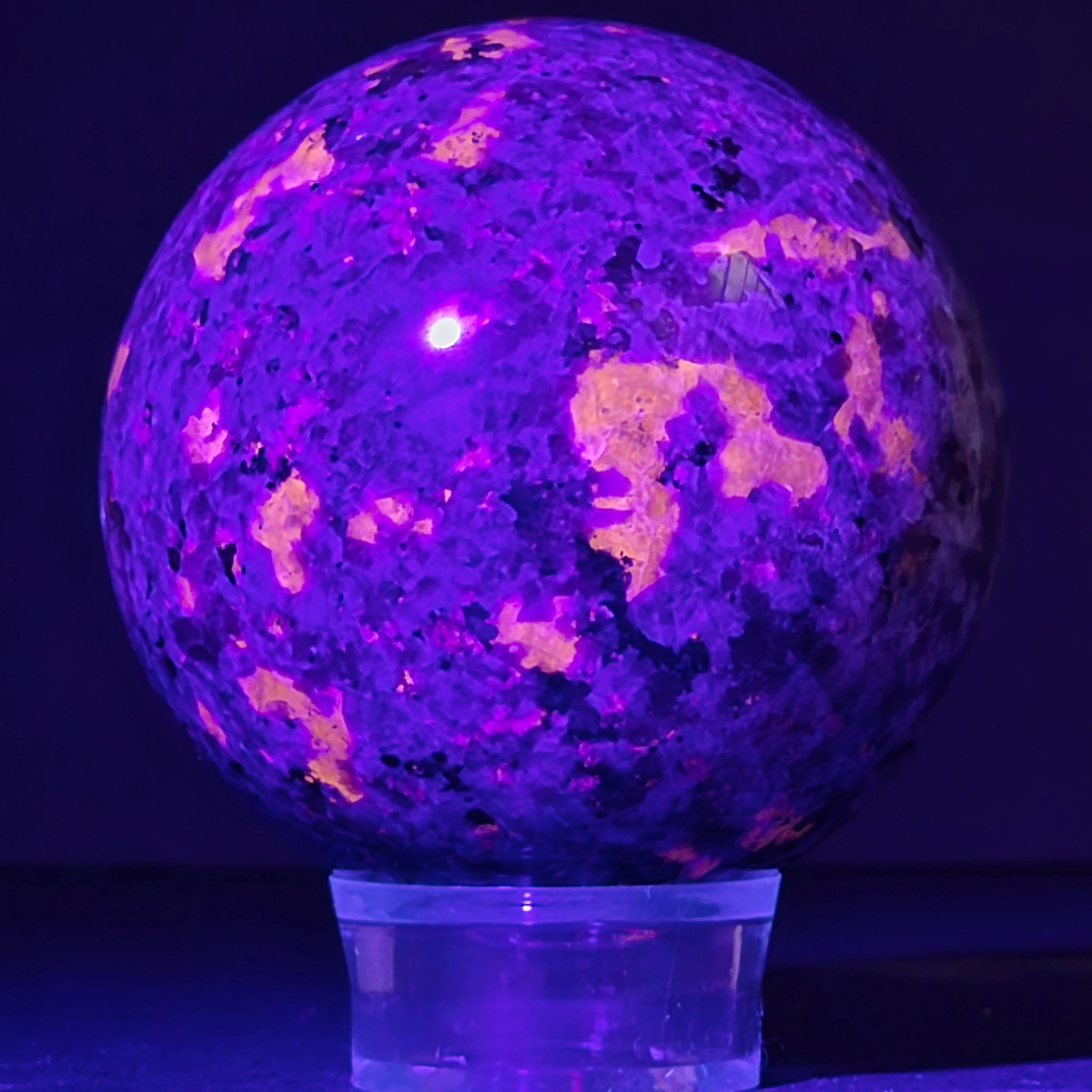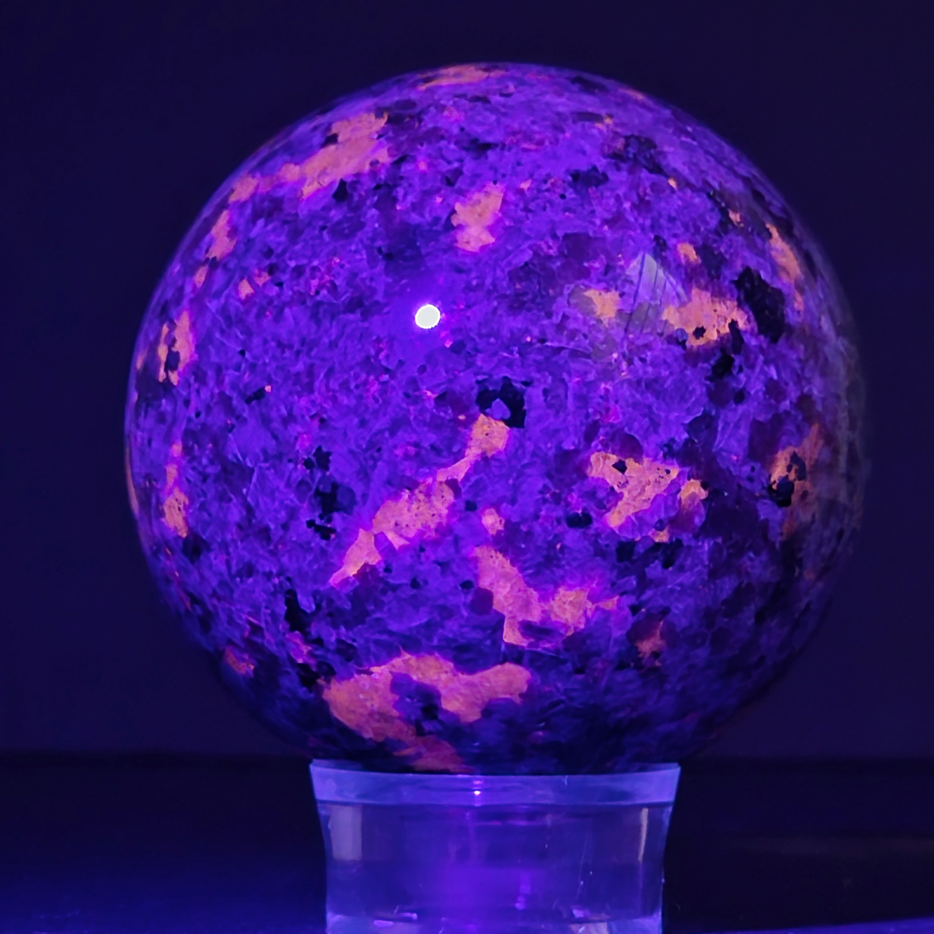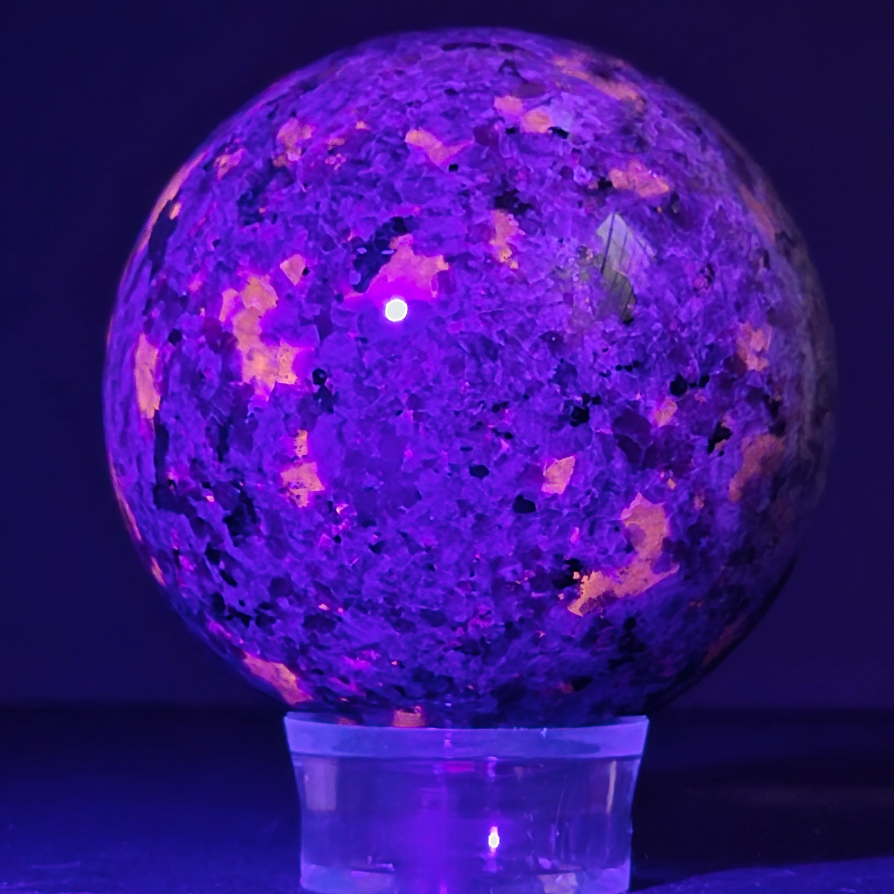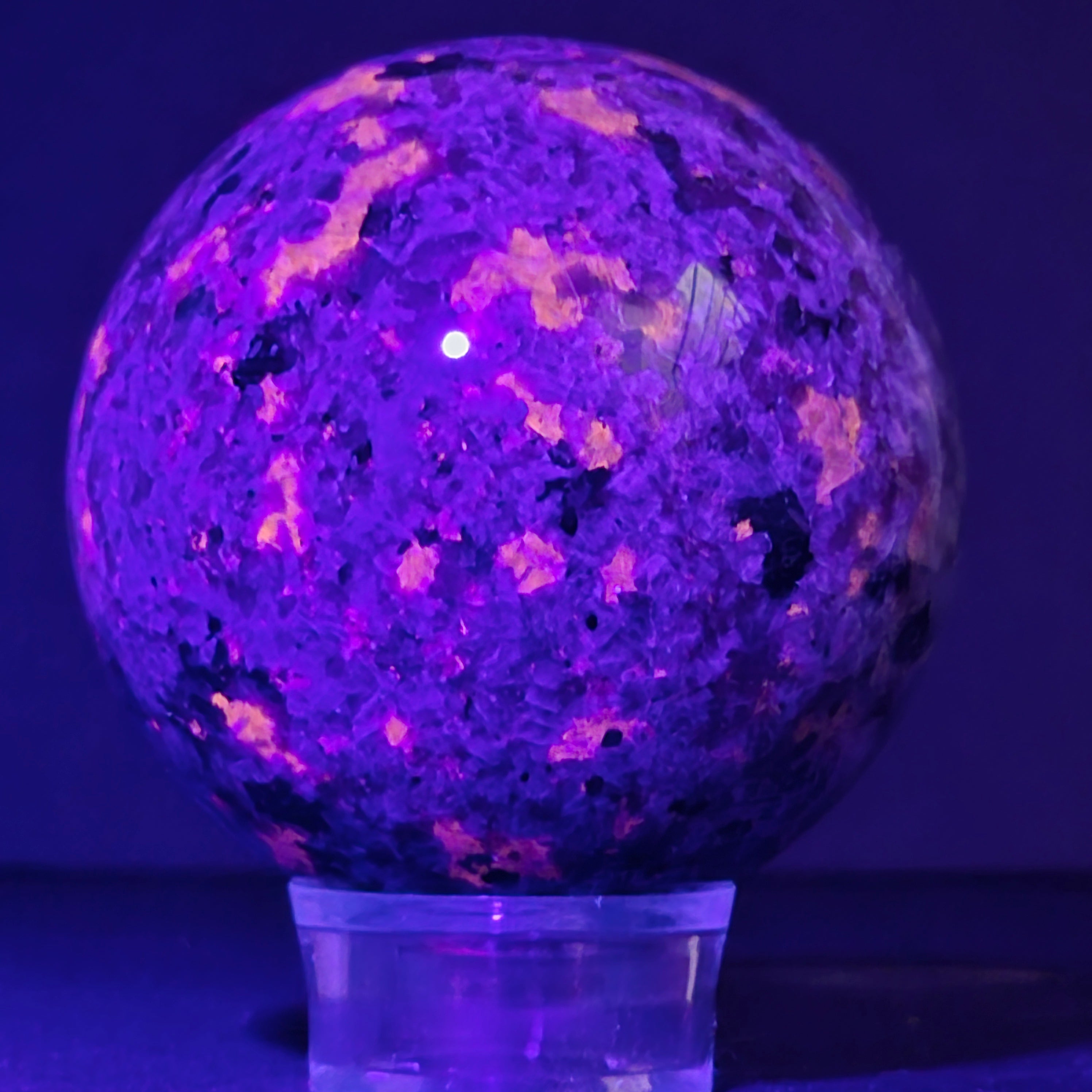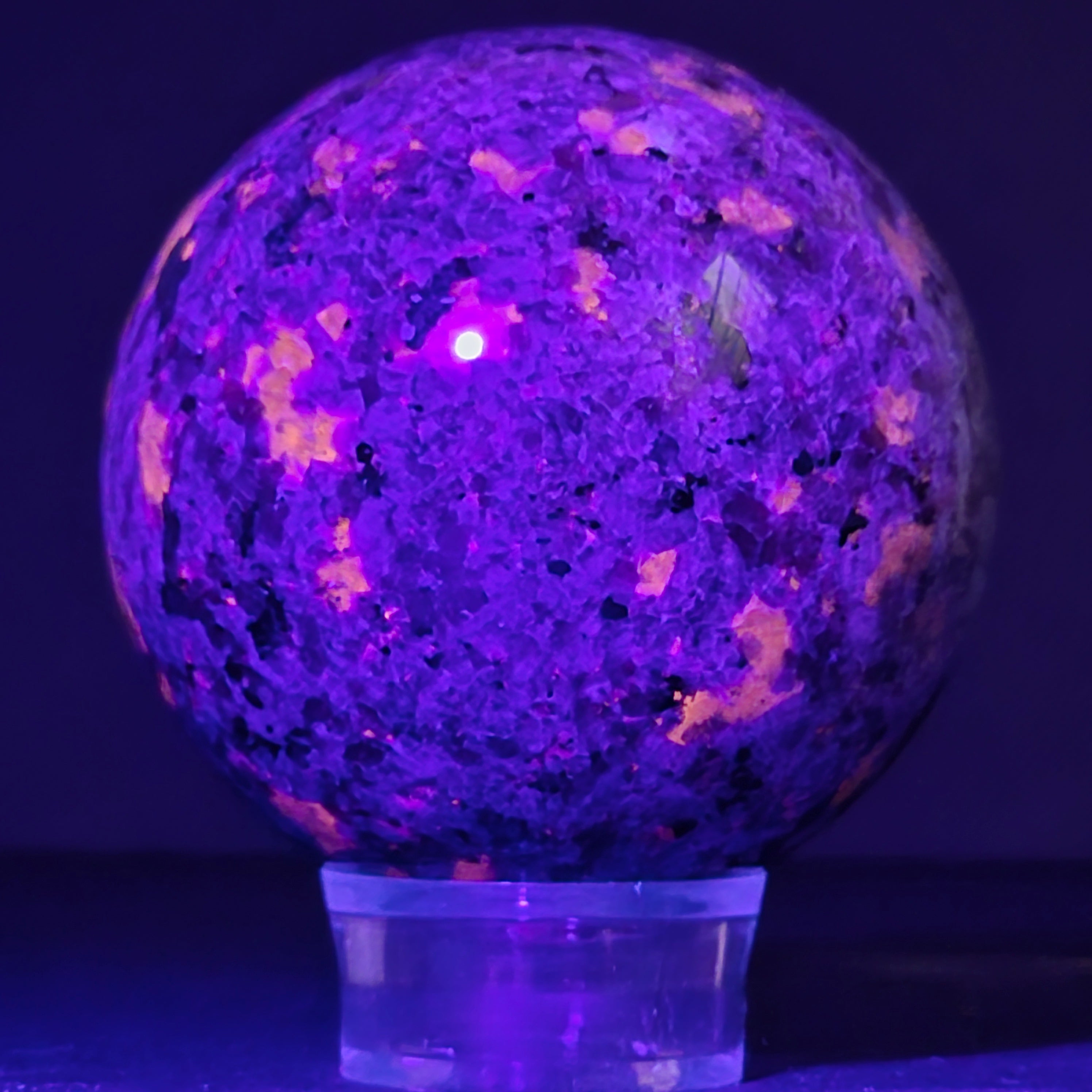 Geológicamente hablando, la yooperlita es una roca sienítica rica en sodalita – y es precisamente la sodalita la que reacciona a la UV y produce ese efecto espectacular.