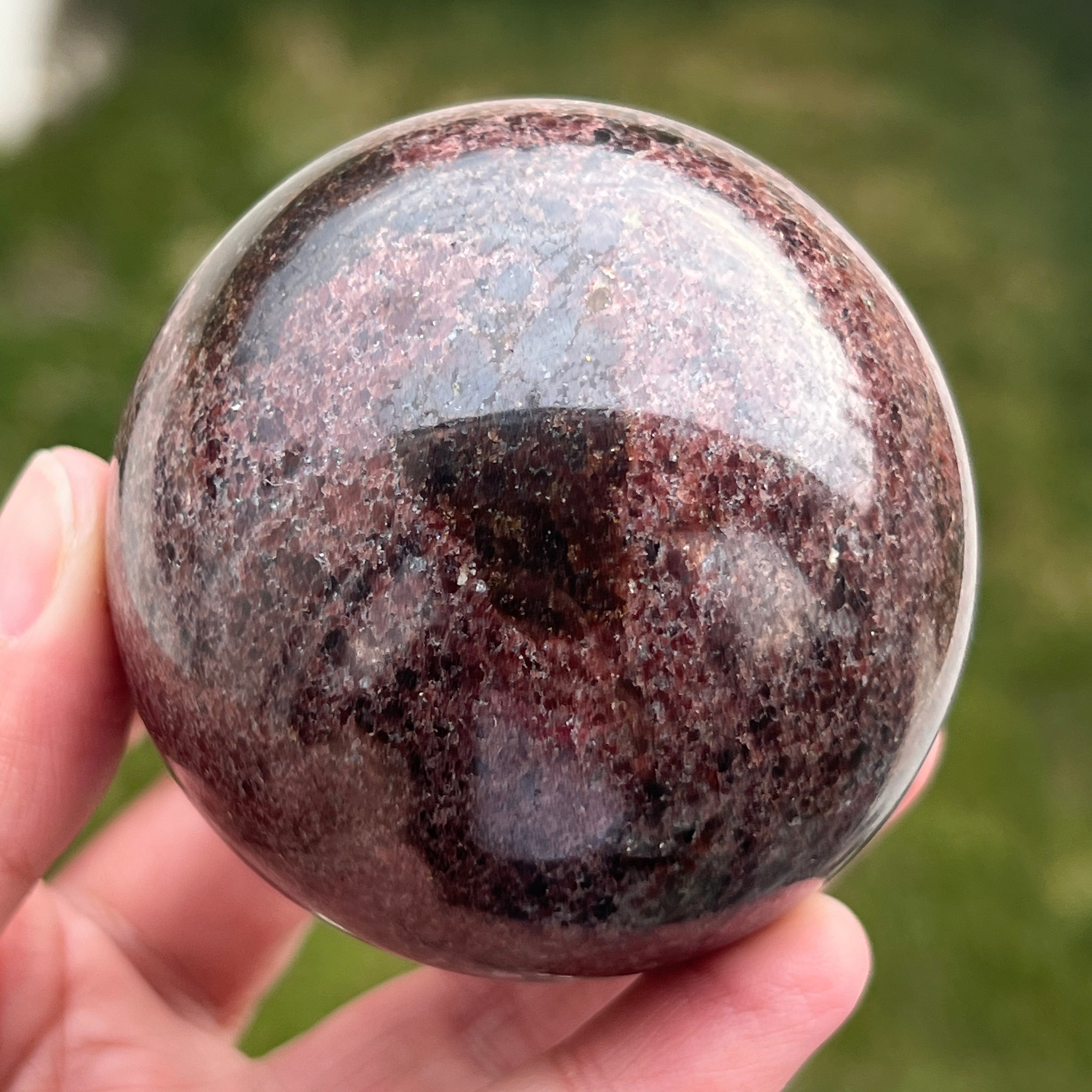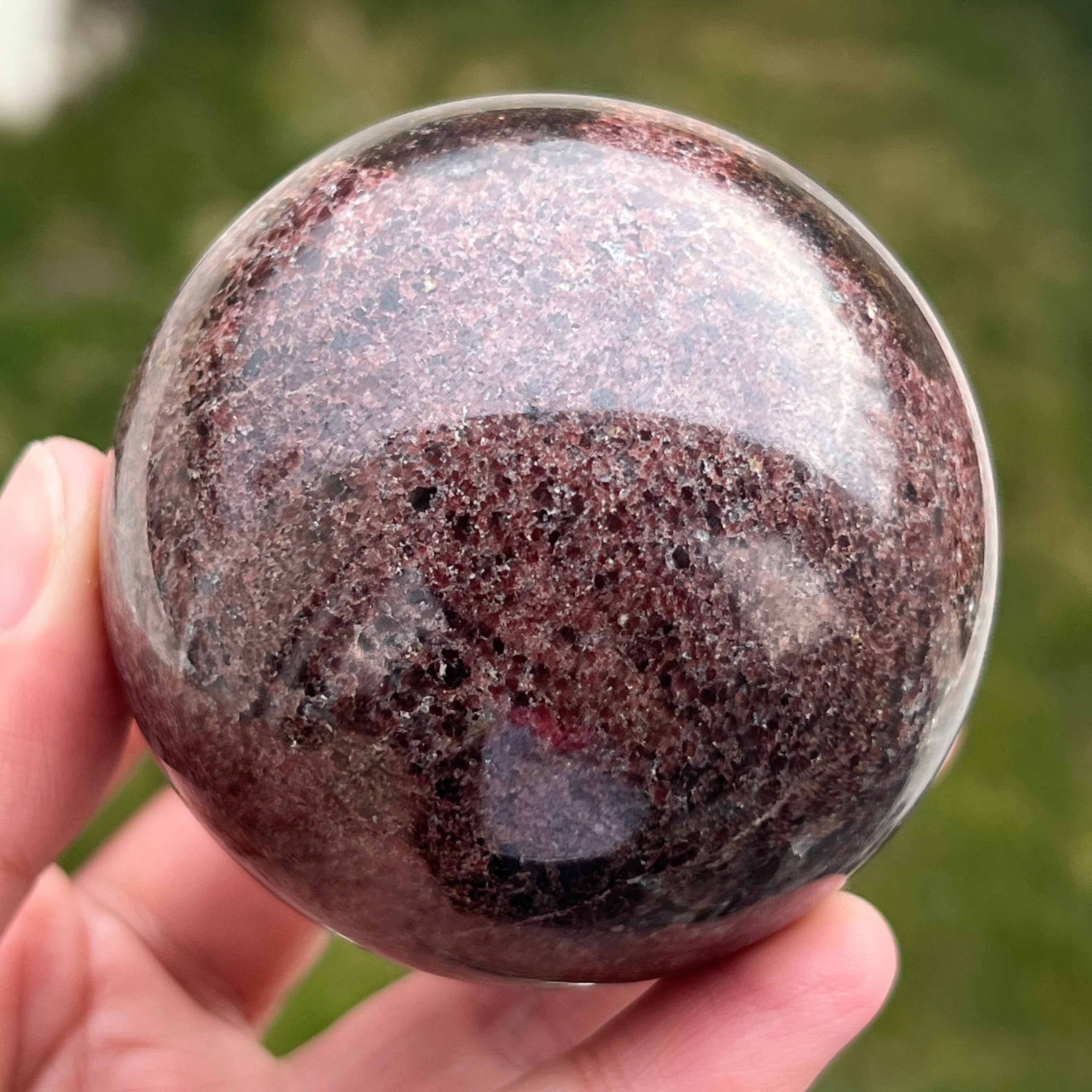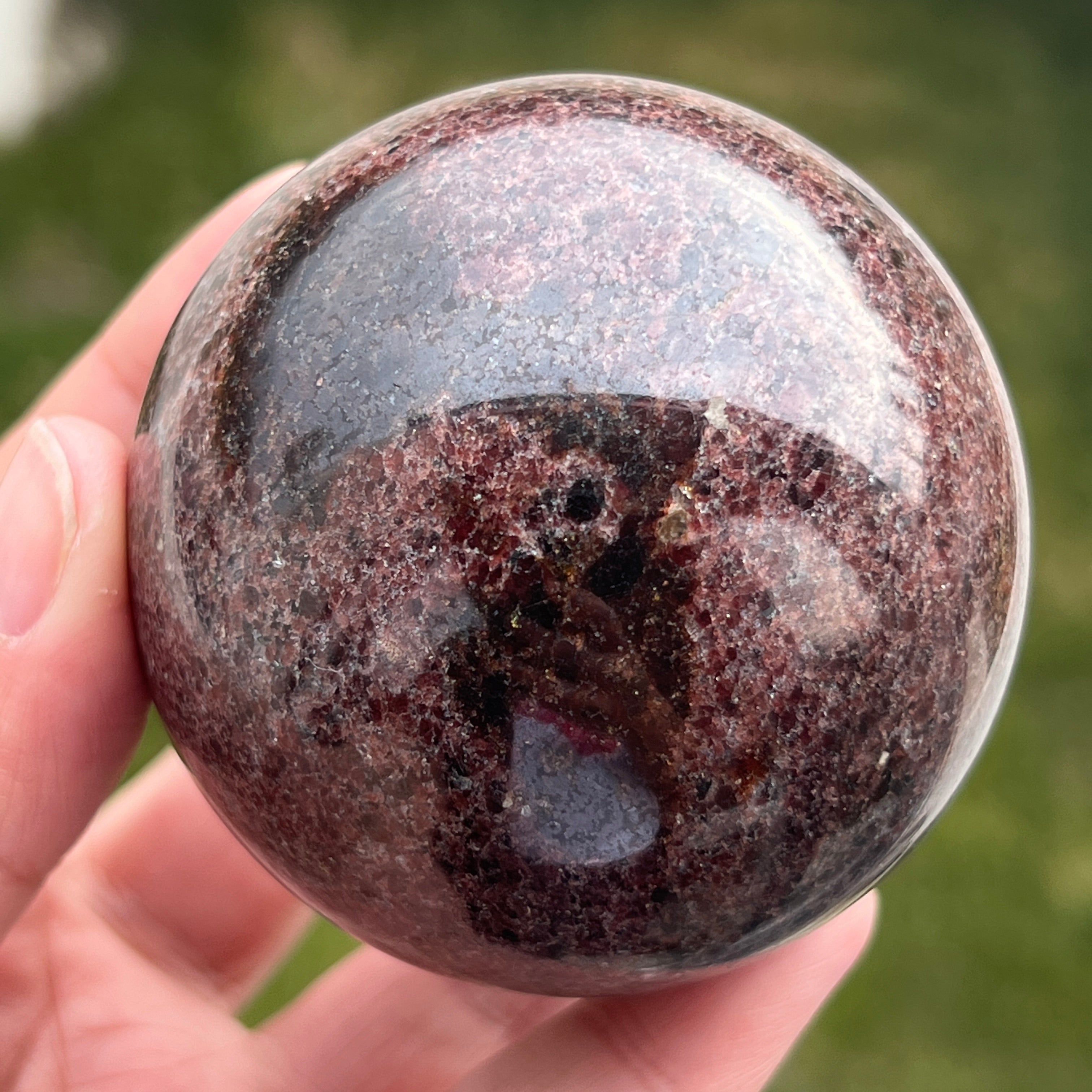 La esfera de granate está hecha de un mineral del grupo de los silicatos, conocido por su estructura cristalina compacta y por sus tonos intensos, desde el rojo oscuro hasta los tonos profundos de cereza. Debido a su composición, el granate es un material duro y estable, lo que lo hace adecuado para trabajarse en formas como la esfera, donde la textura y el color pueden observarse de manera uniforme desde todos los ángulos.