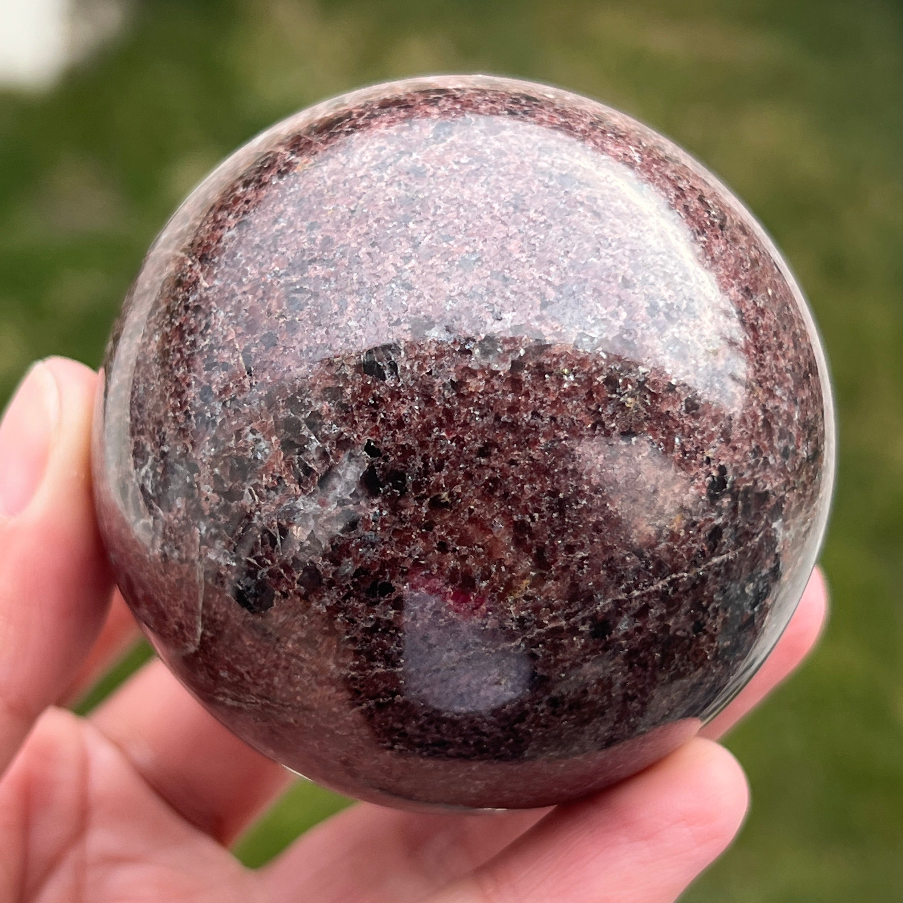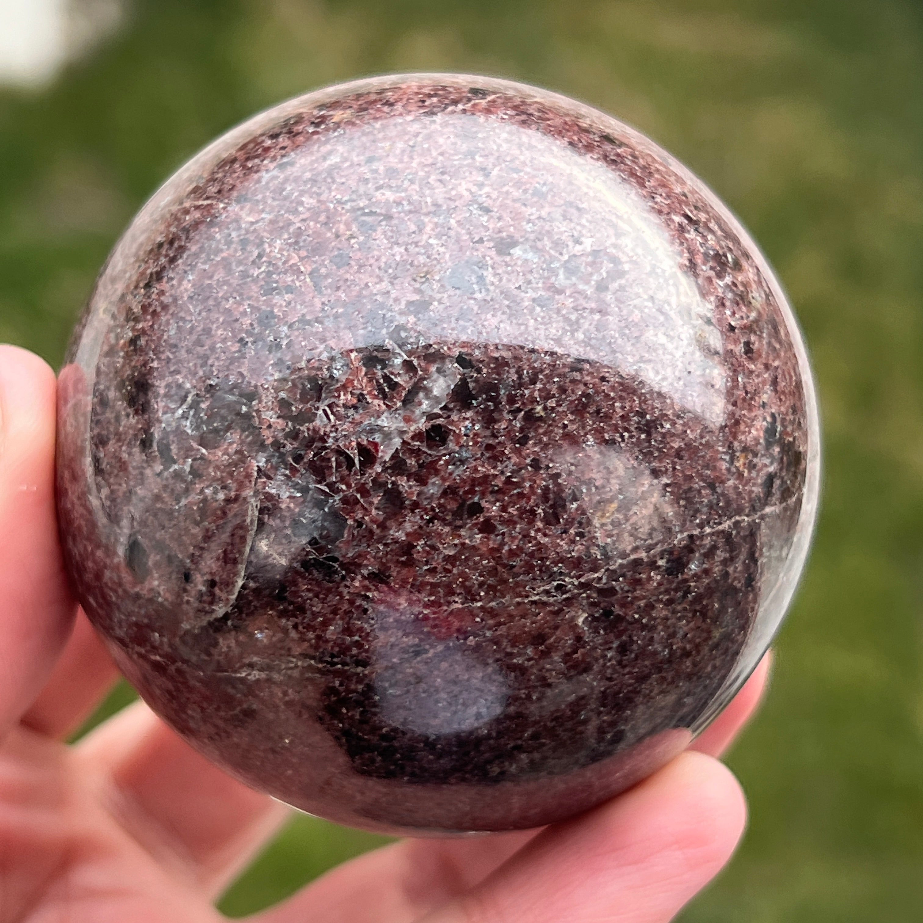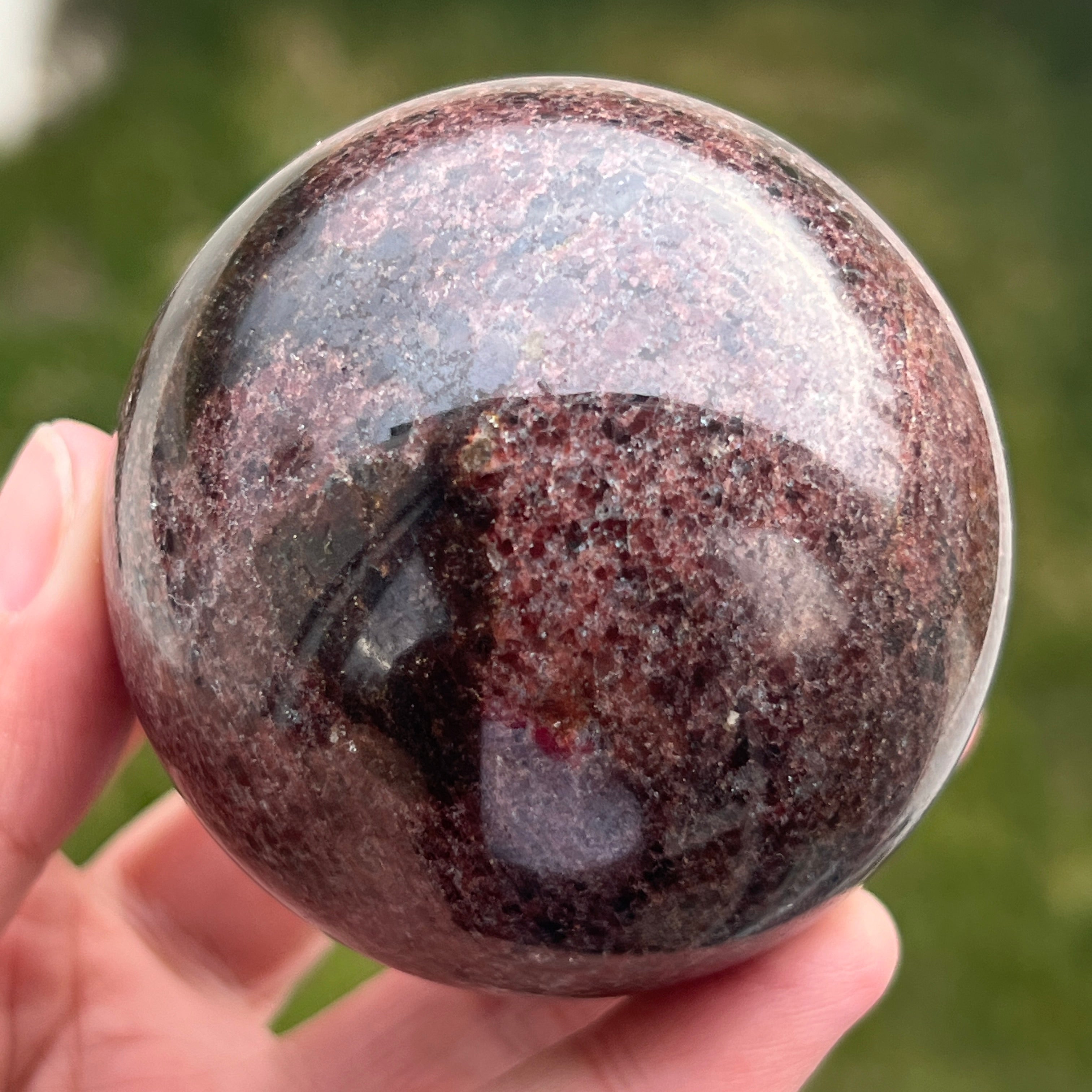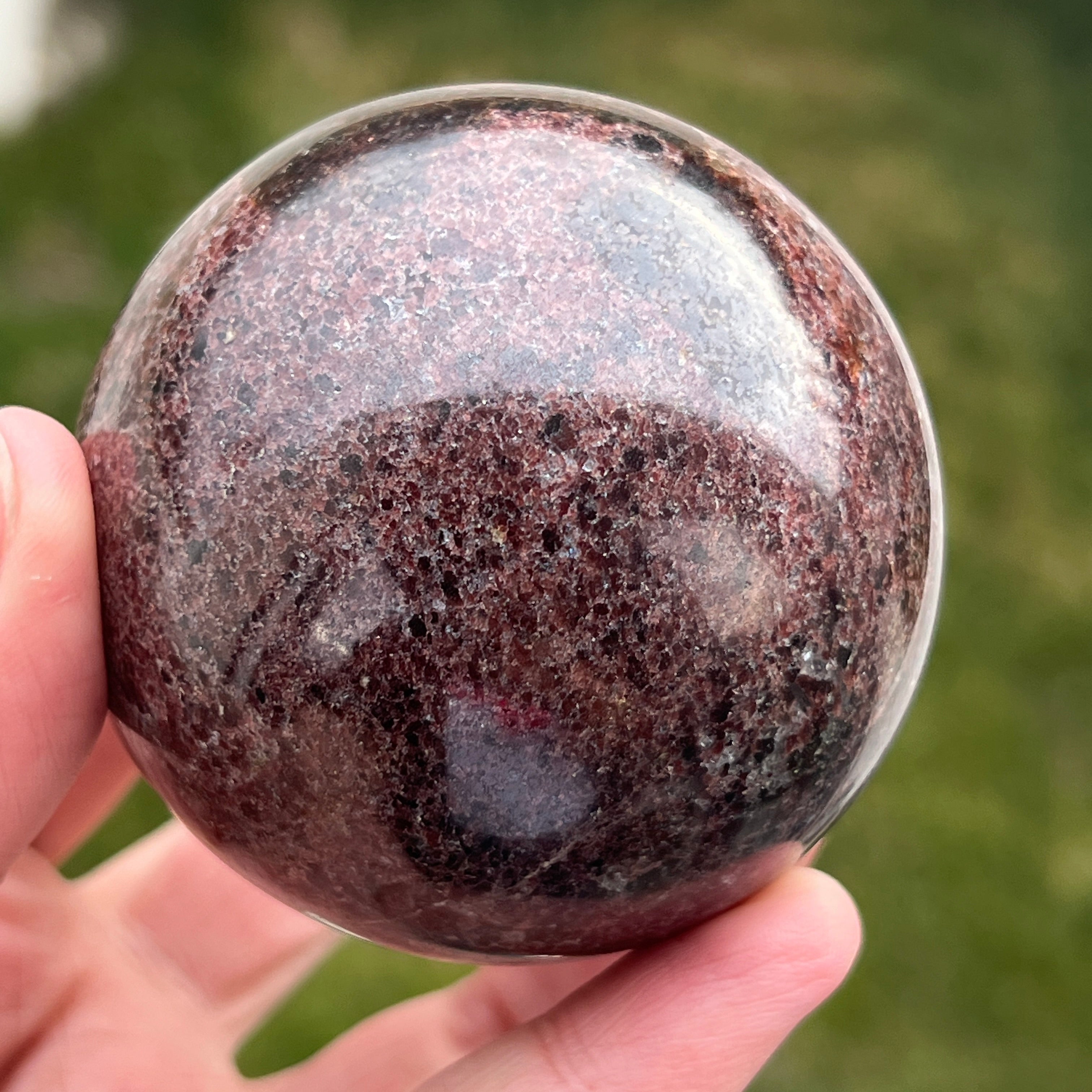 La esfera de granate está hecha de un mineral del grupo de los silicatos, conocido por su estructura cristalina compacta y por sus tonos intensos, desde el rojo oscuro hasta los tonos profundos de cereza. Debido a su composición, el granate es un material duro y estable, lo que lo hace adecuado para trabajarse en formas como la esfera, donde la textura y el color pueden observarse de manera uniforme desde todos los ángulos.